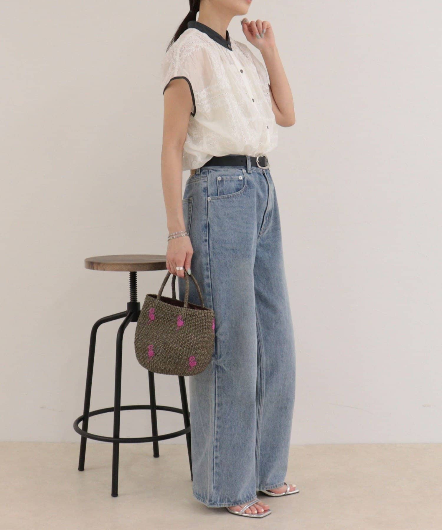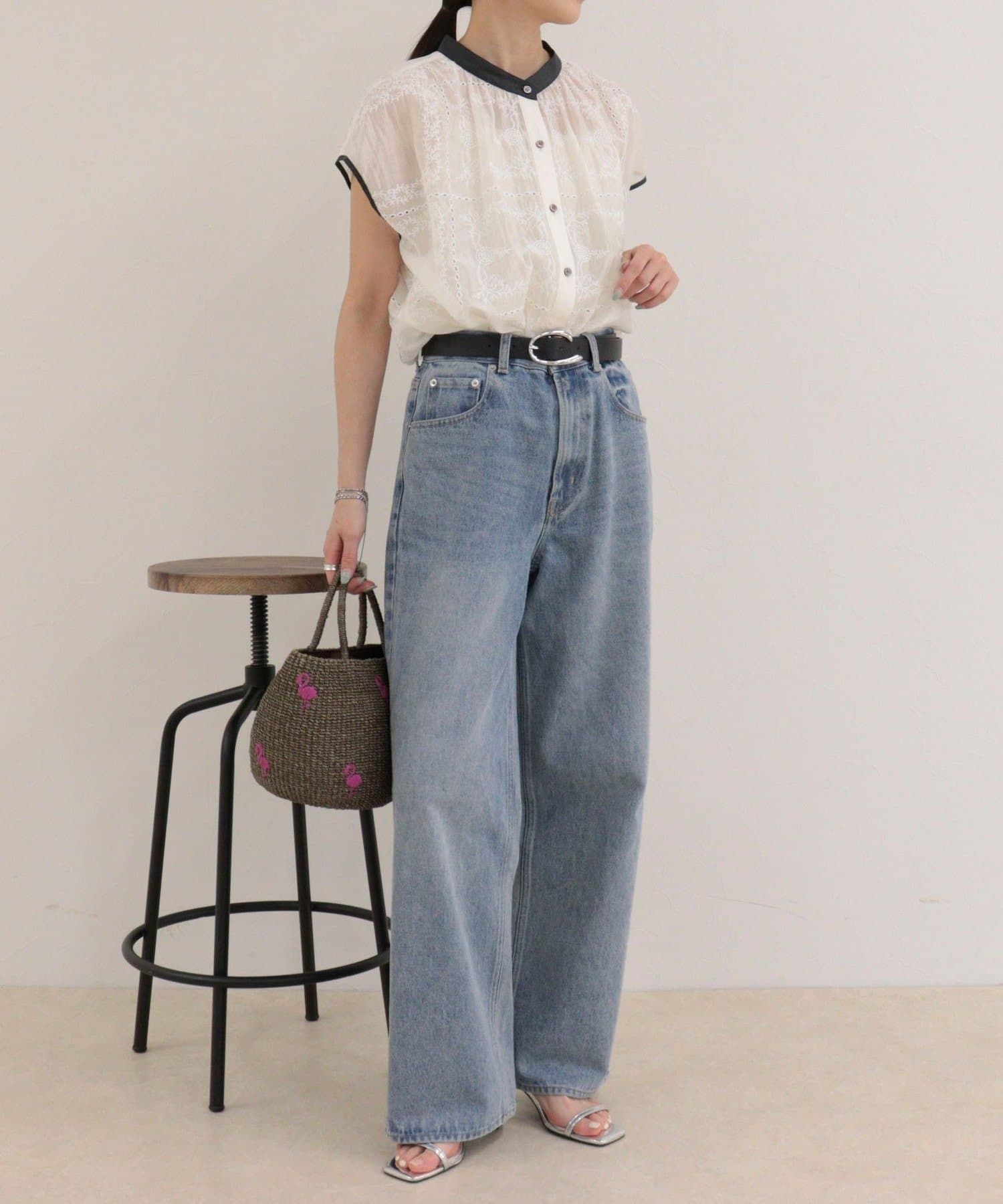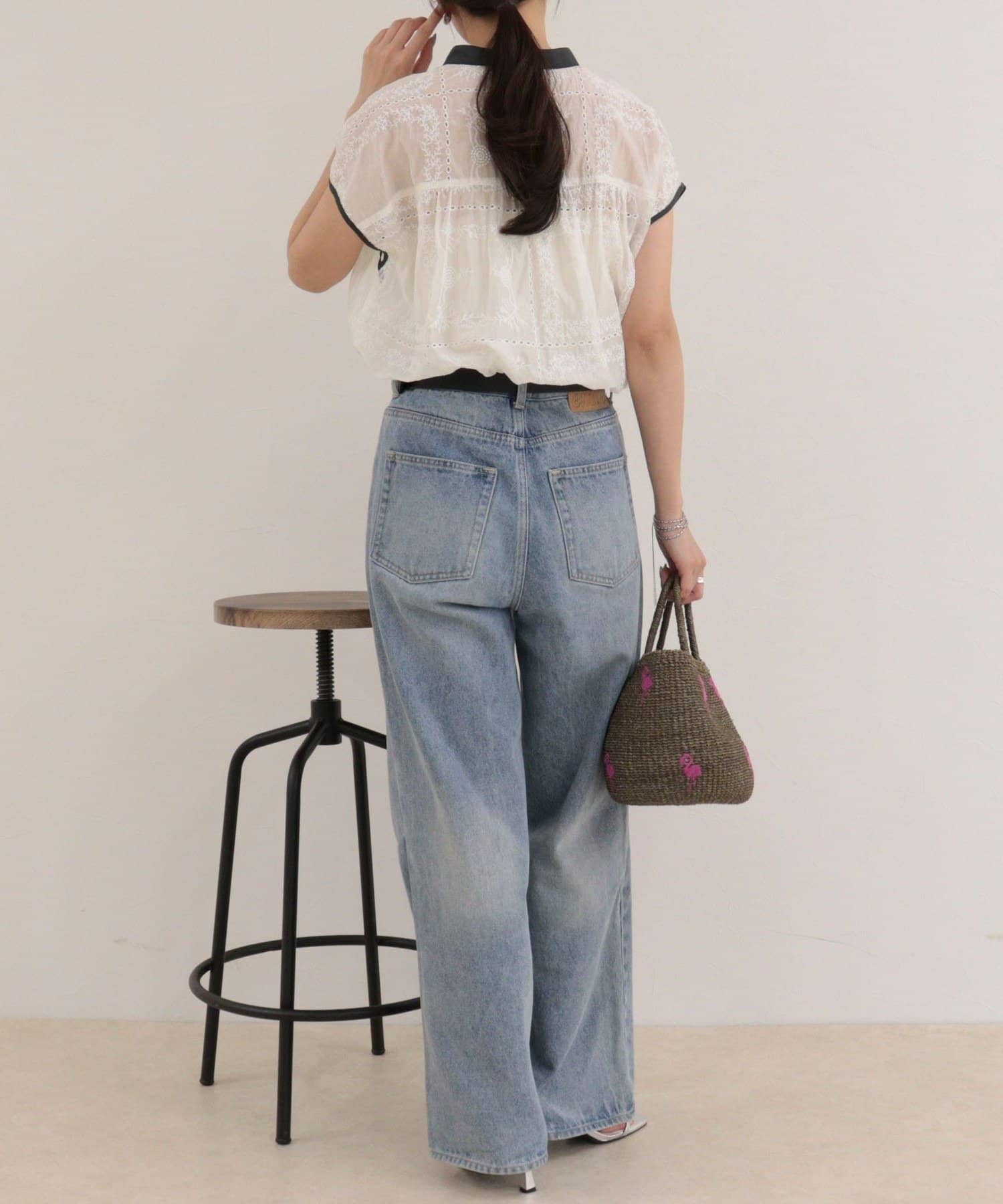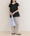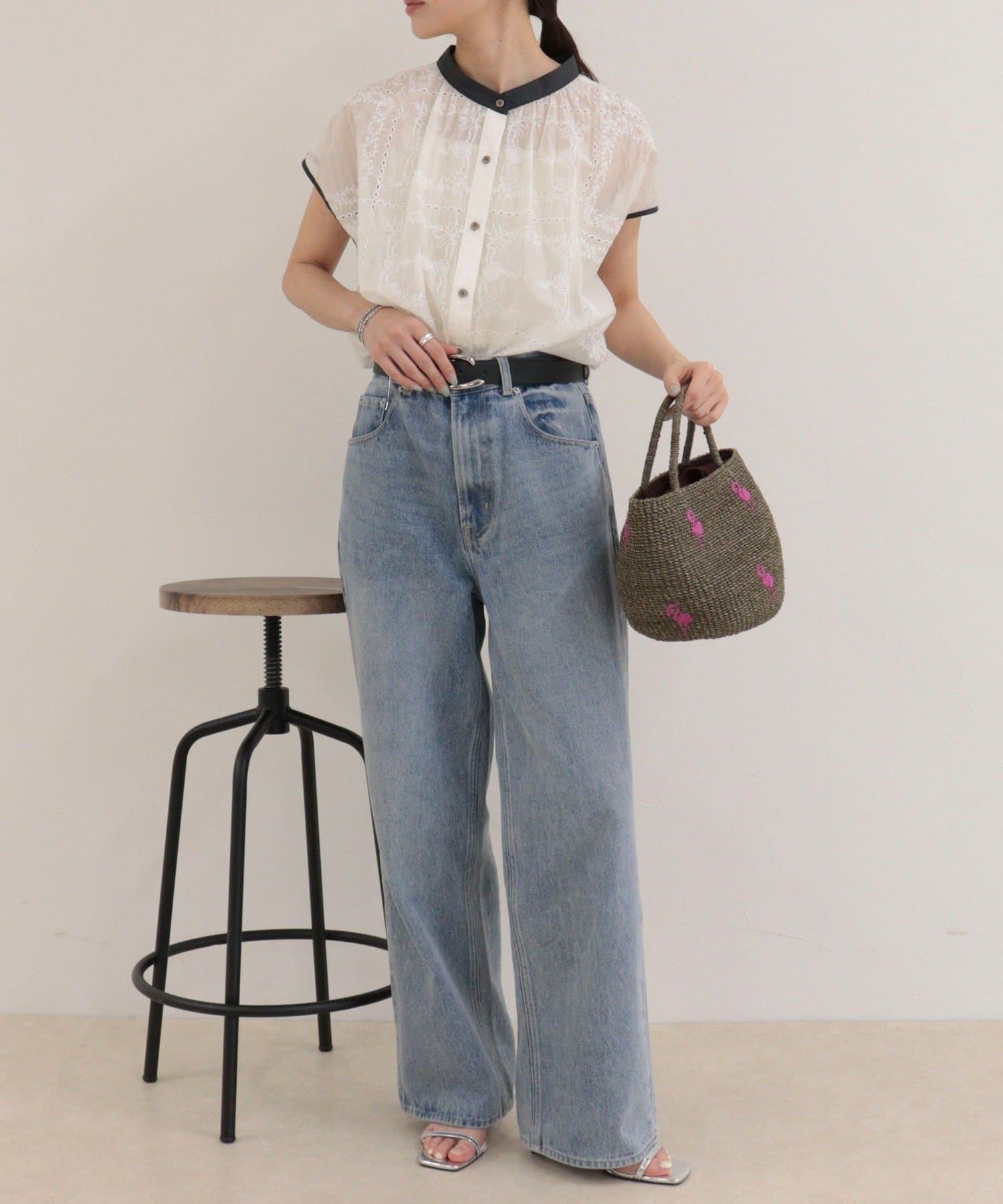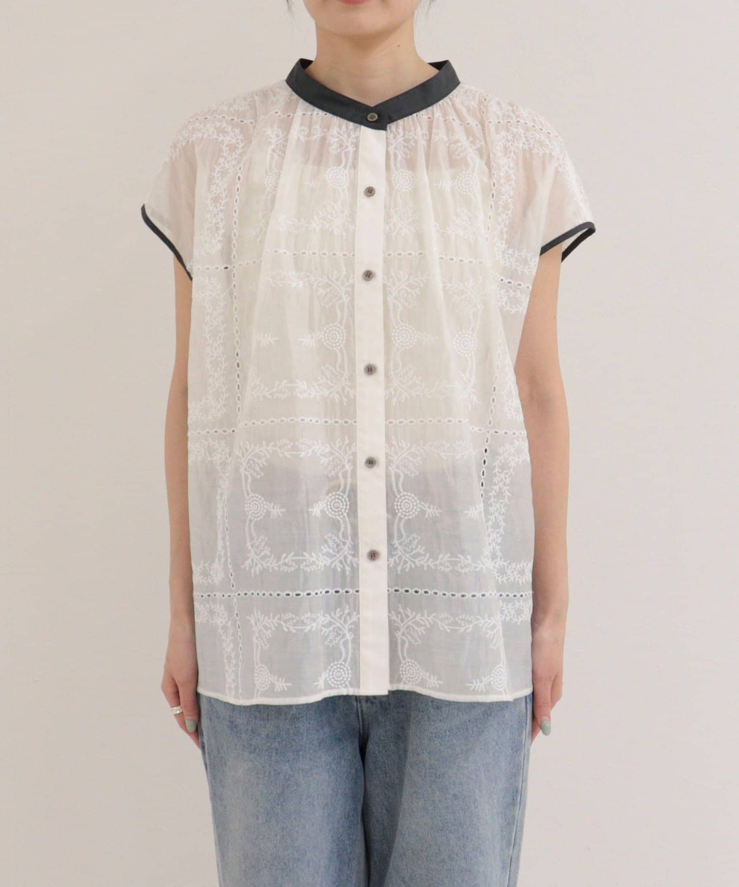 ・繊細な刺しゅうレースに、配色パイピングを効かせたフレンチスリーブブラウス