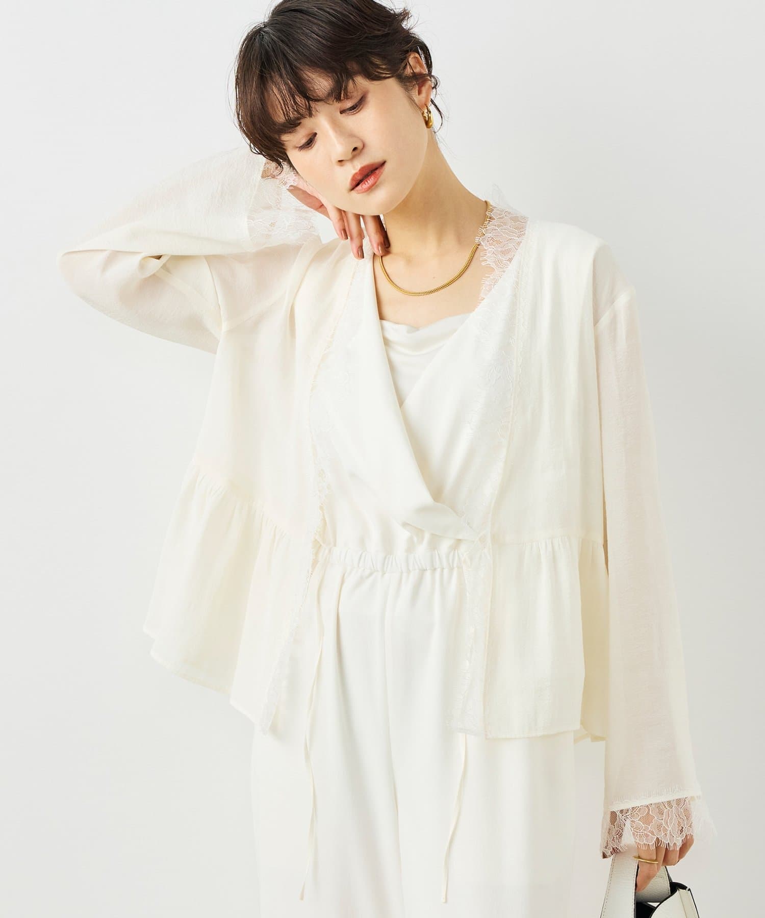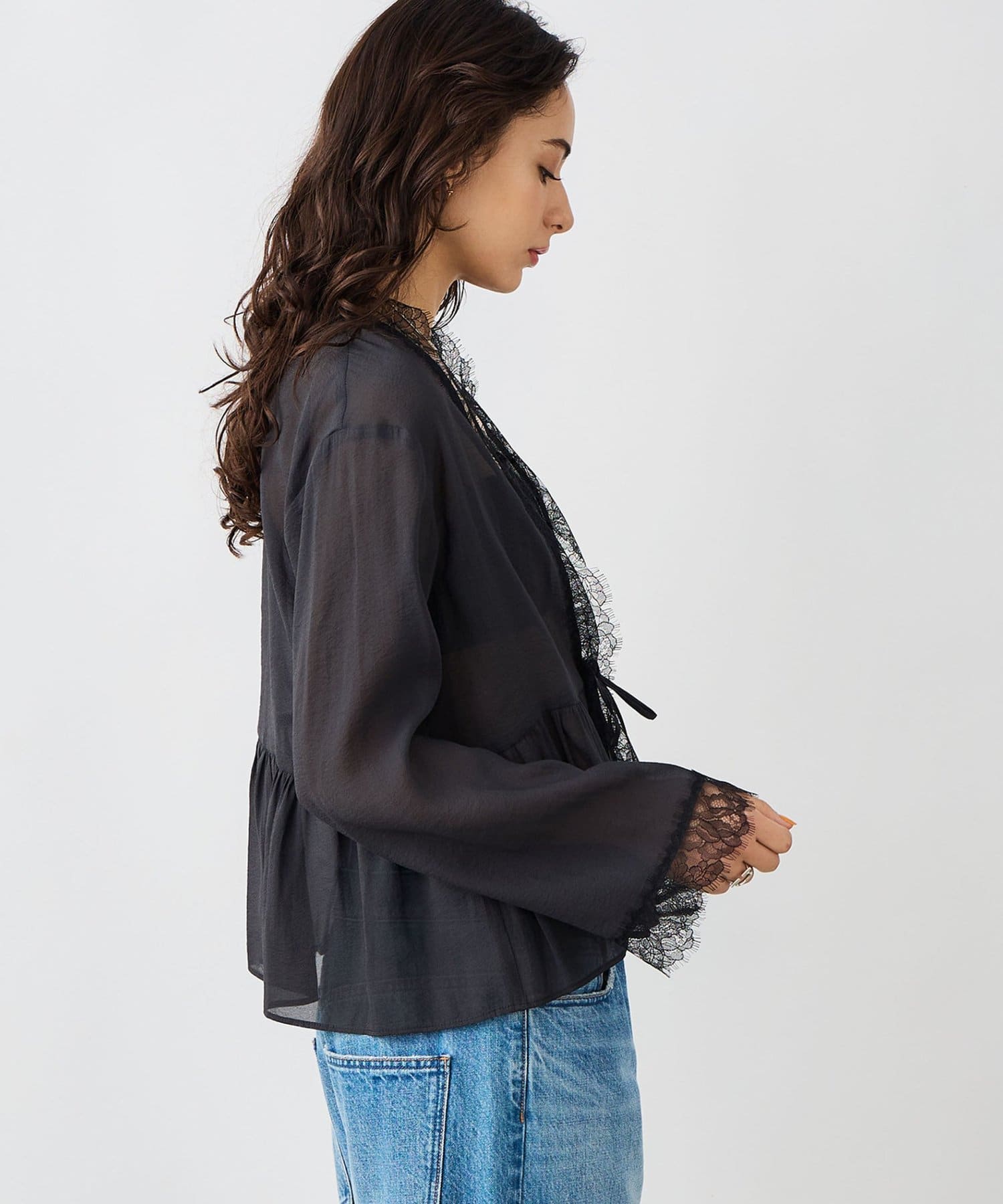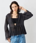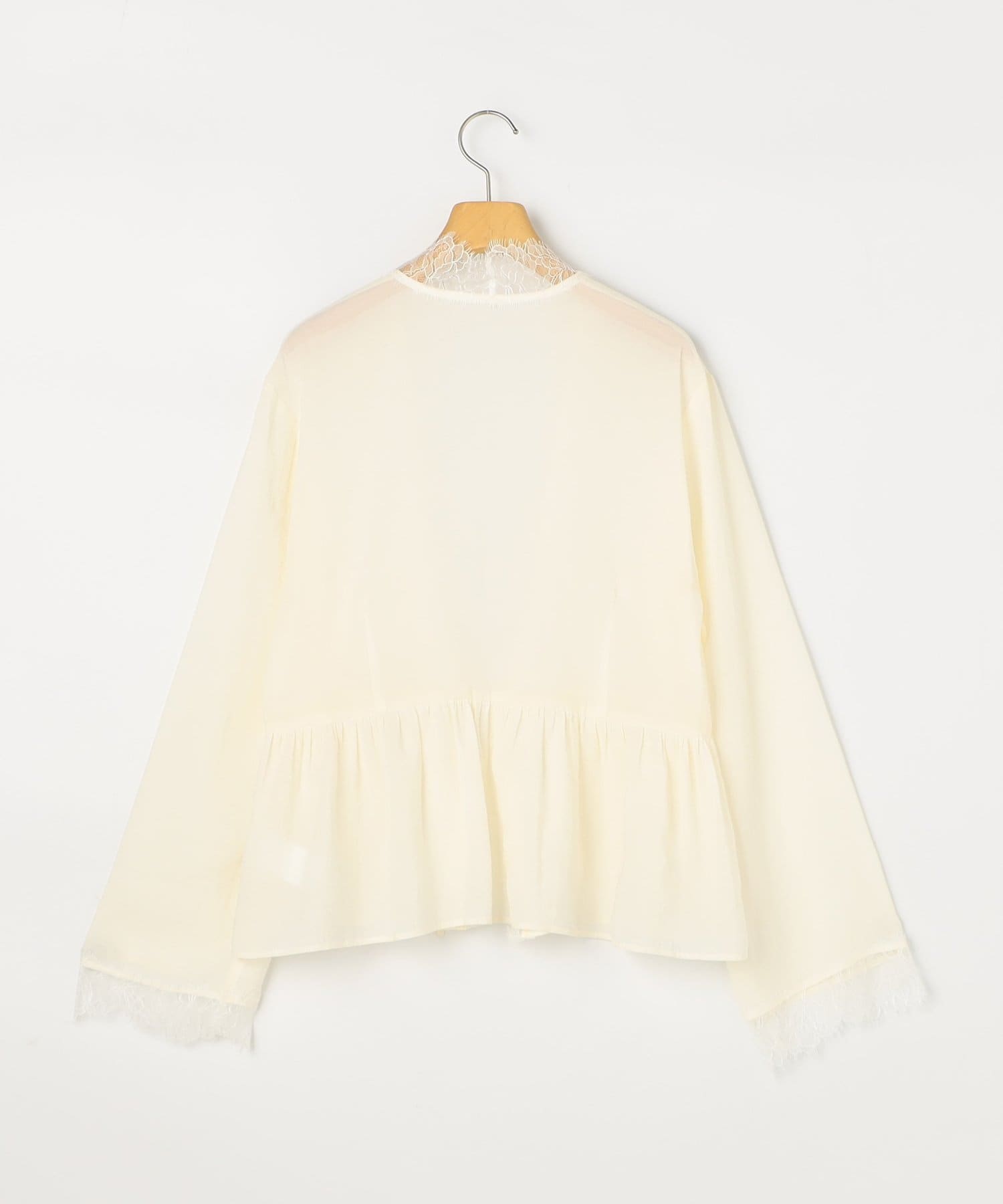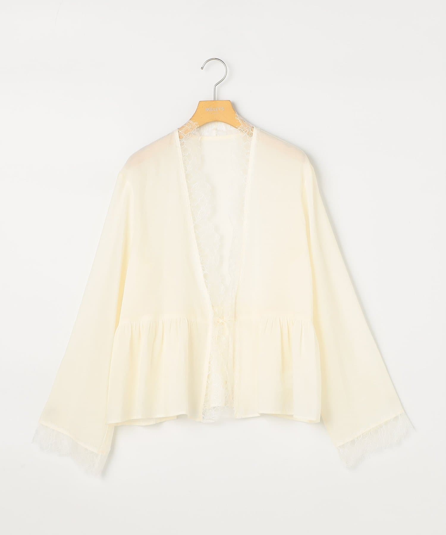 ・トリミングのレースがポイントの羽織りにも使えるブラウス