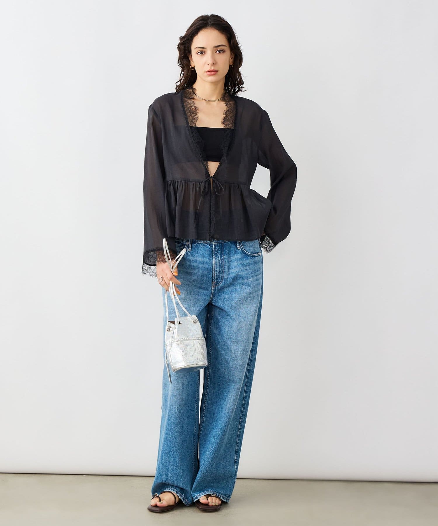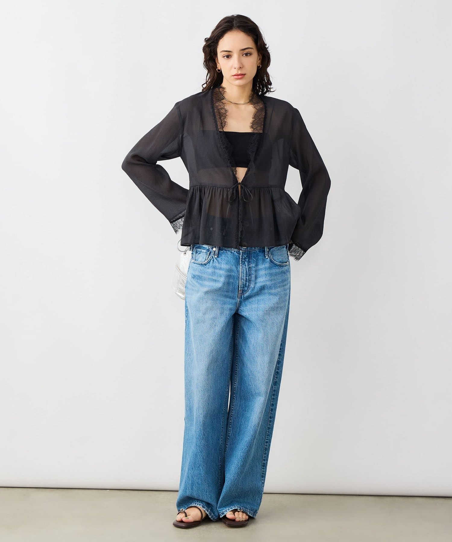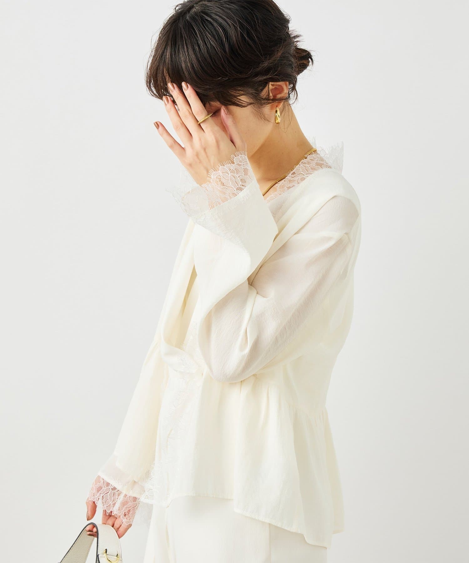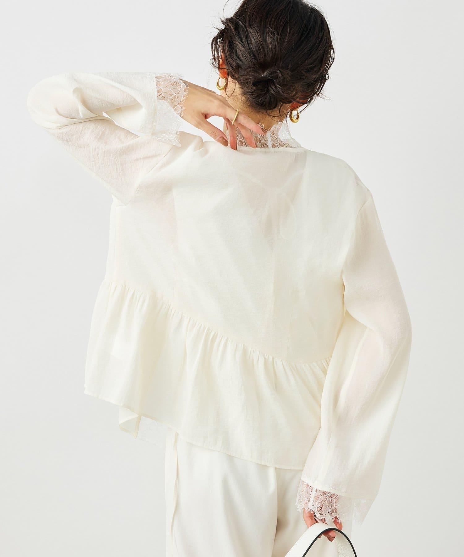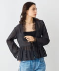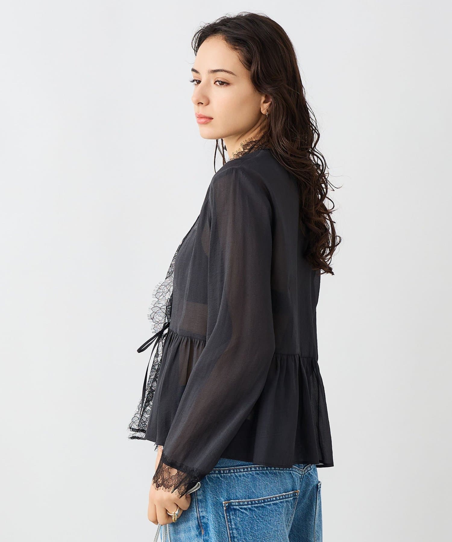 ・トリミングのレースがポイントの羽織りにも使えるブラウス