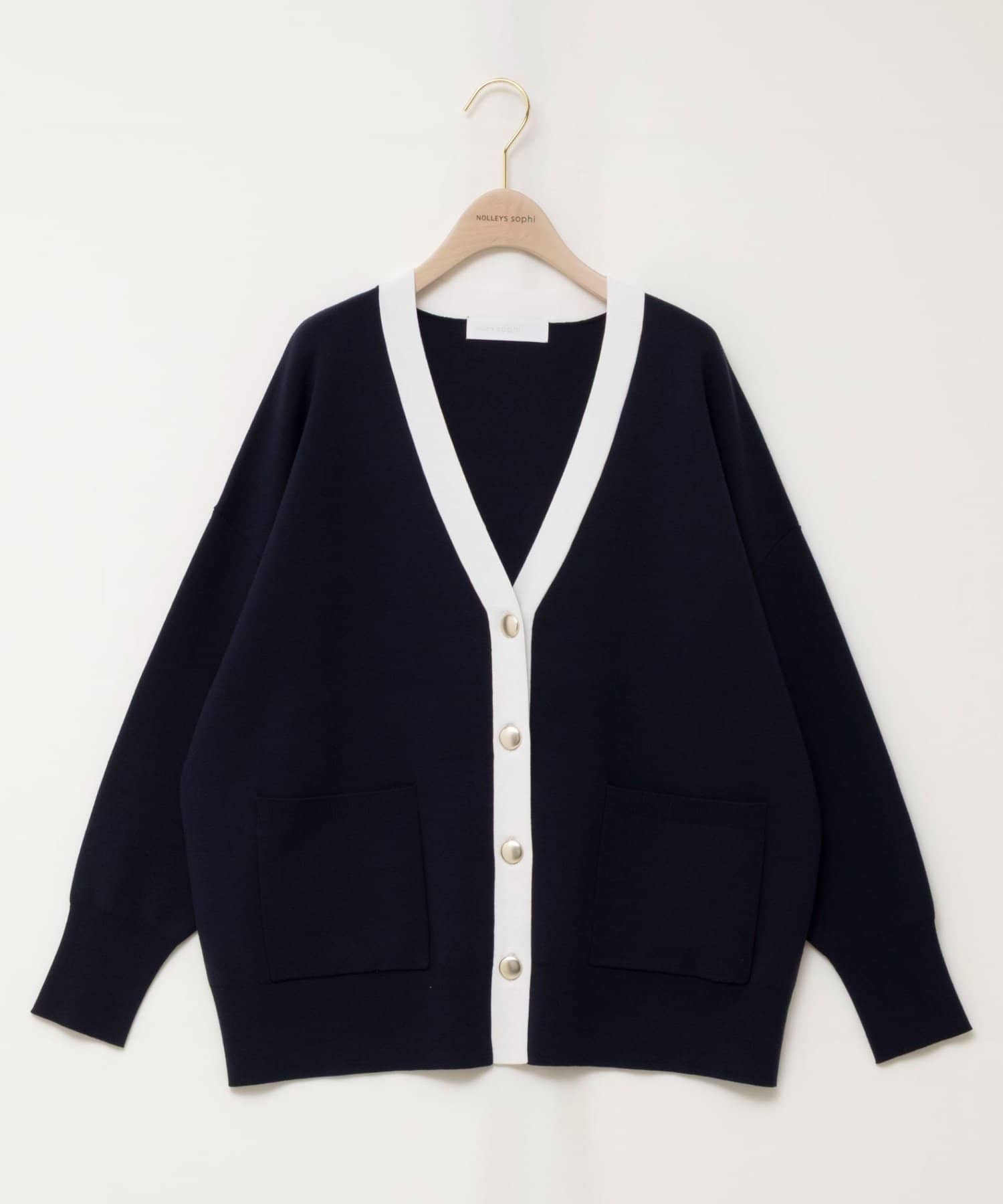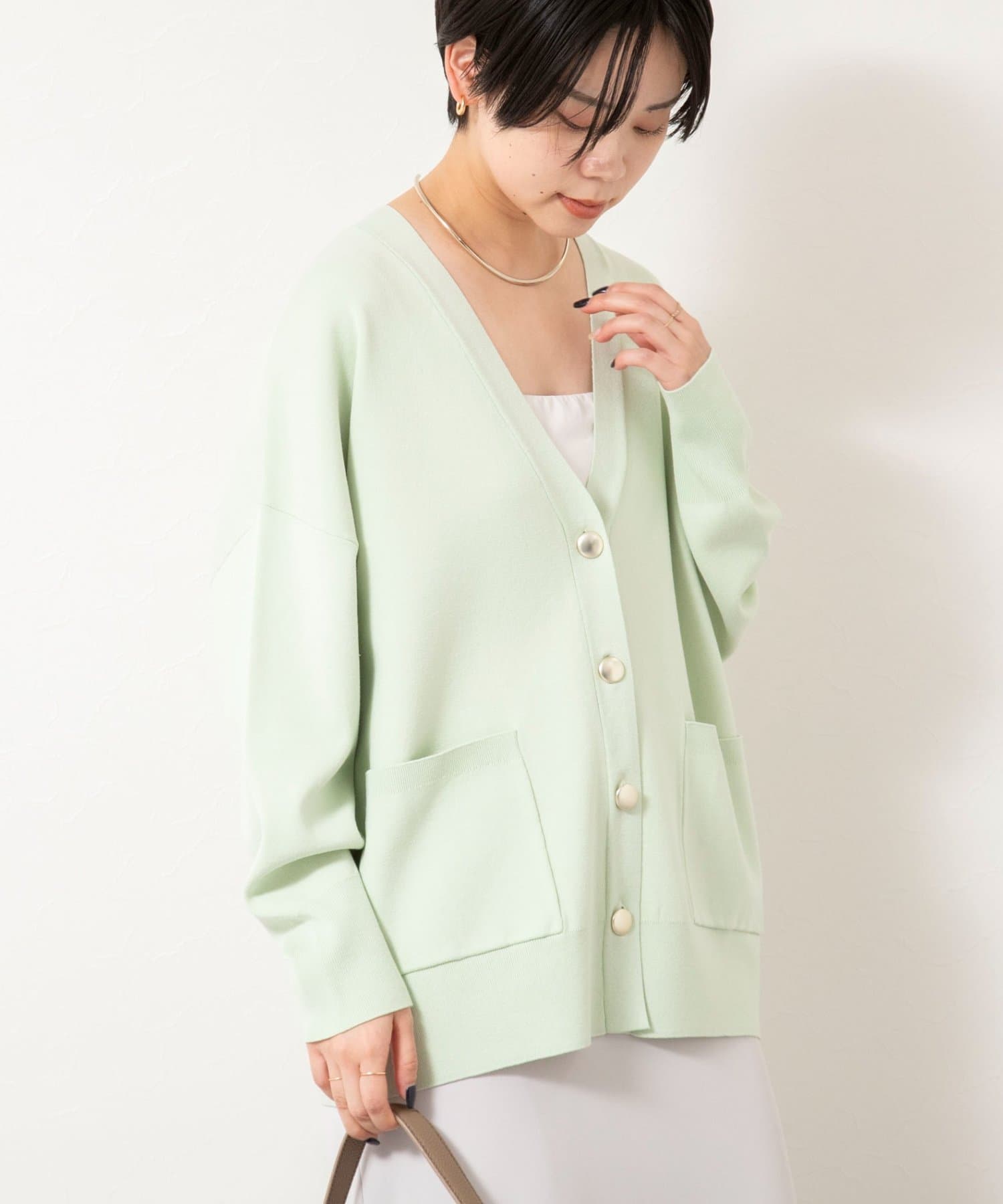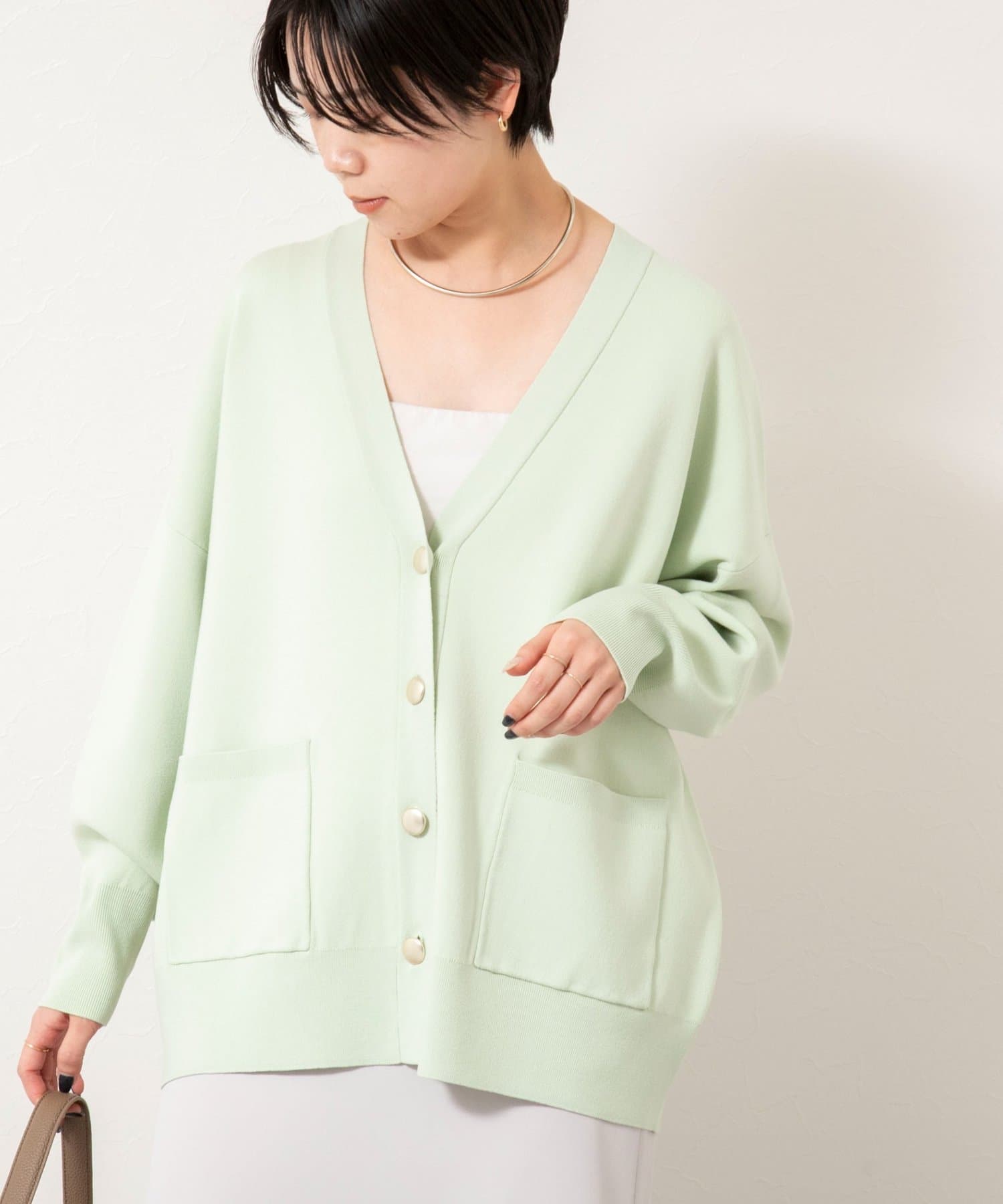・スムース編みでしっかり編まれたゆったりサイズのVネックカーディガン