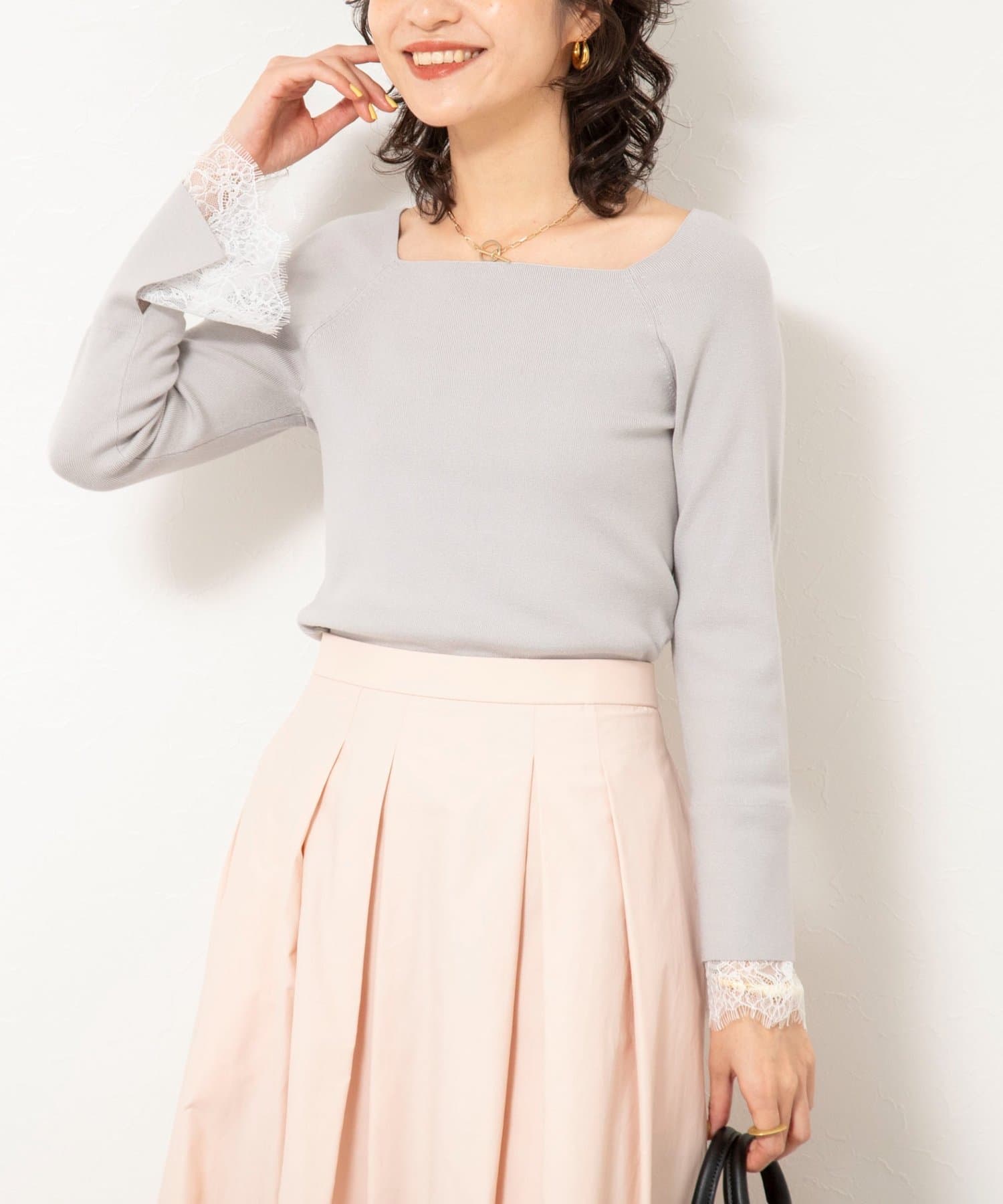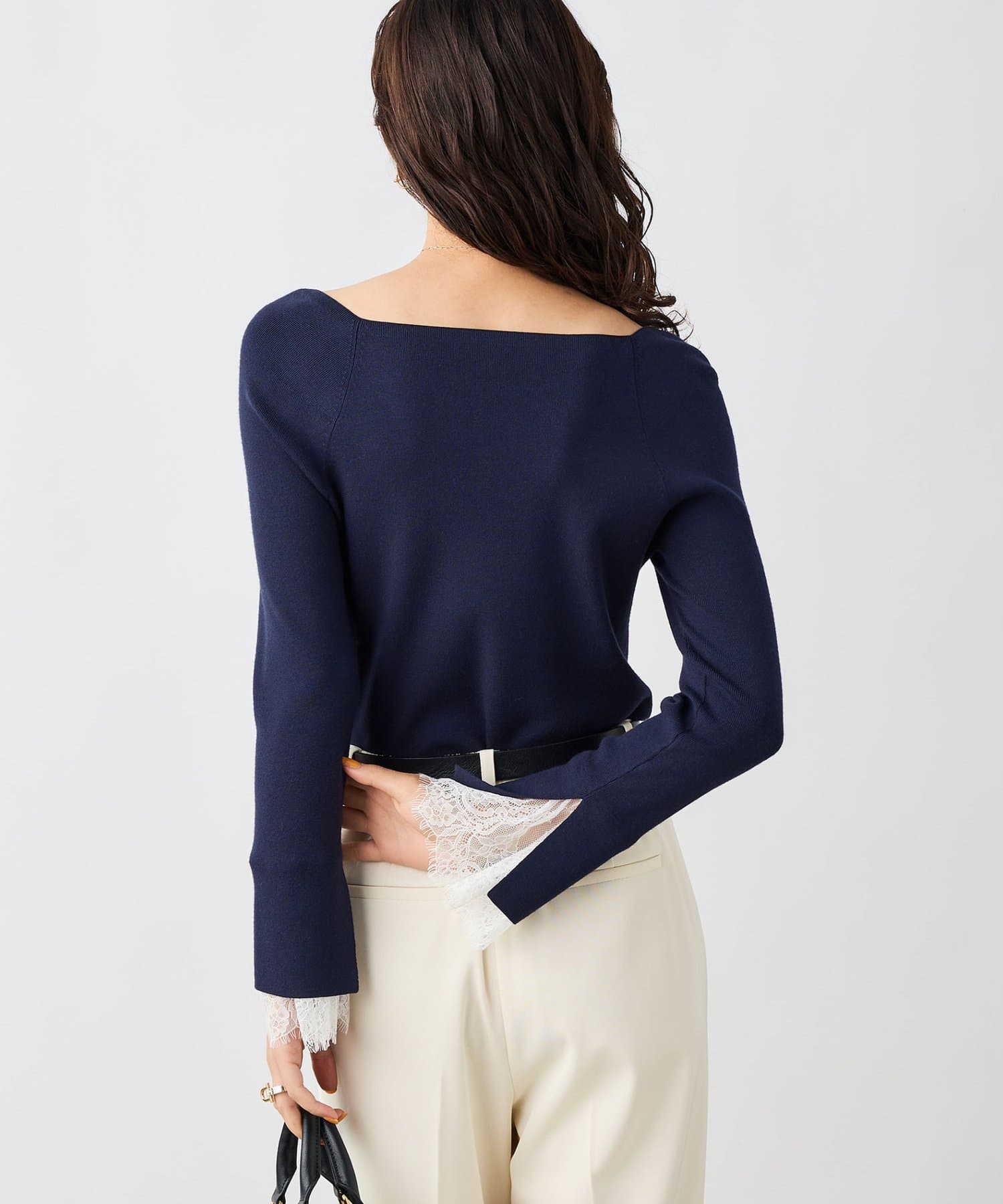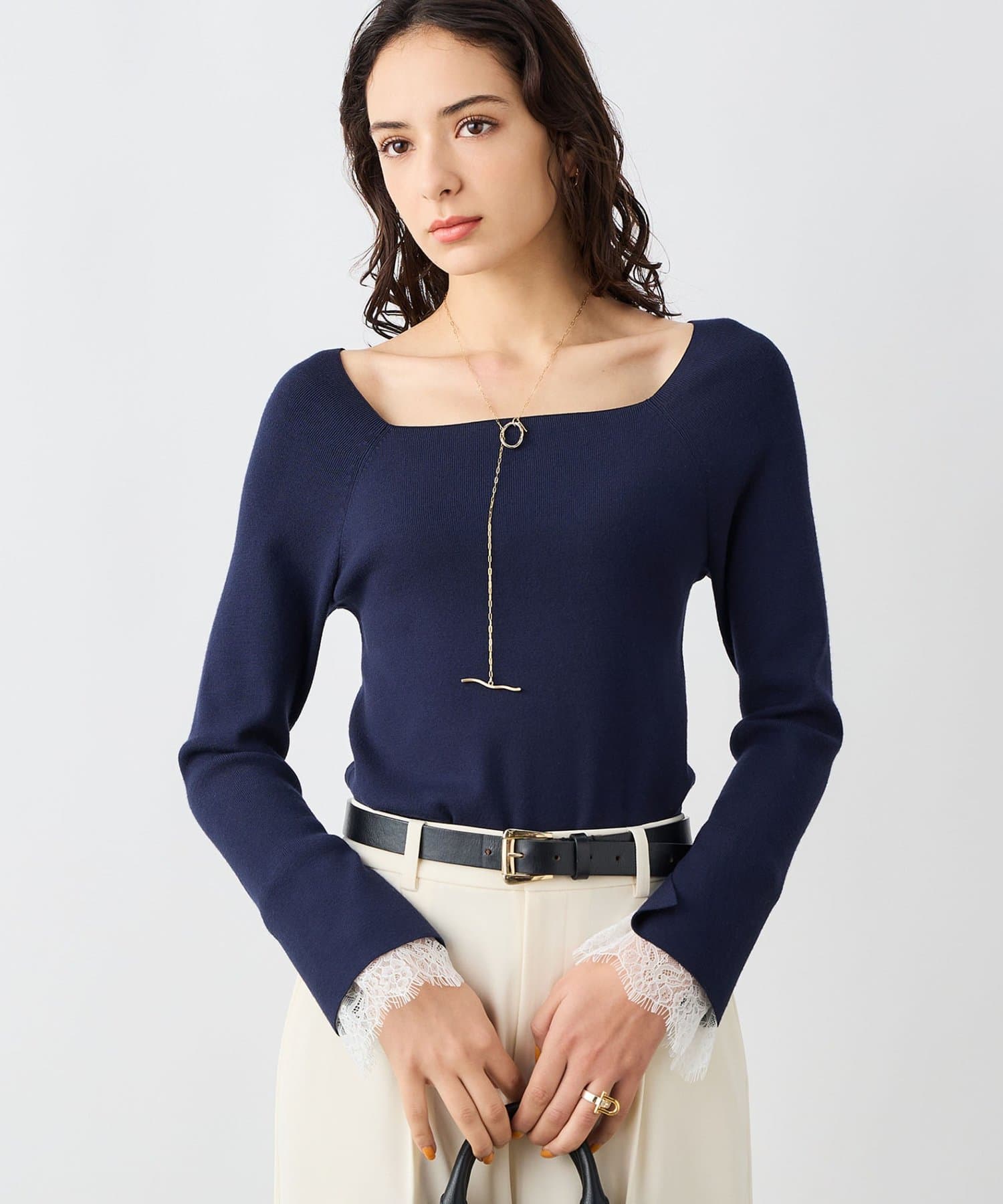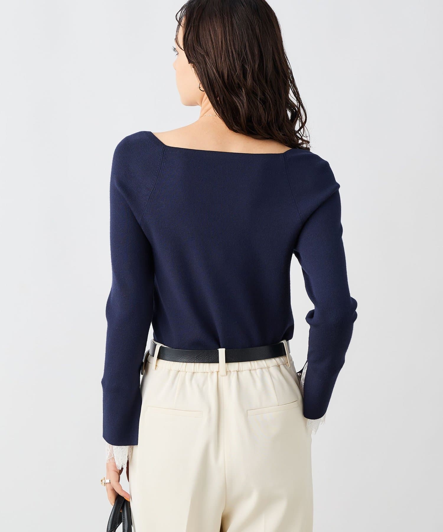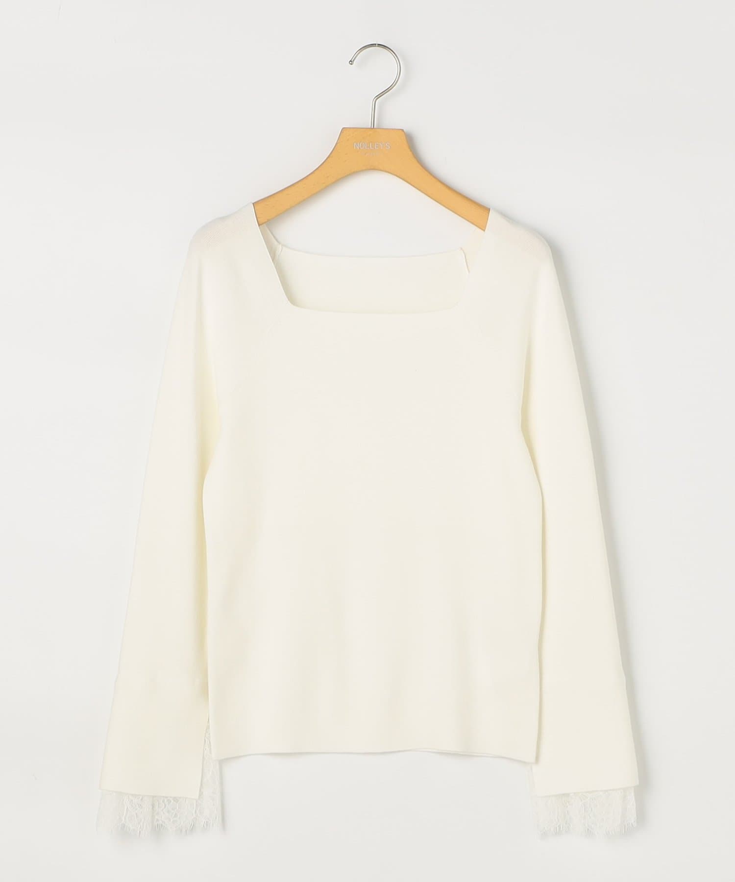 《手洗い可能》袖口レース取り外し可総針スクエアネックプルオーバー
