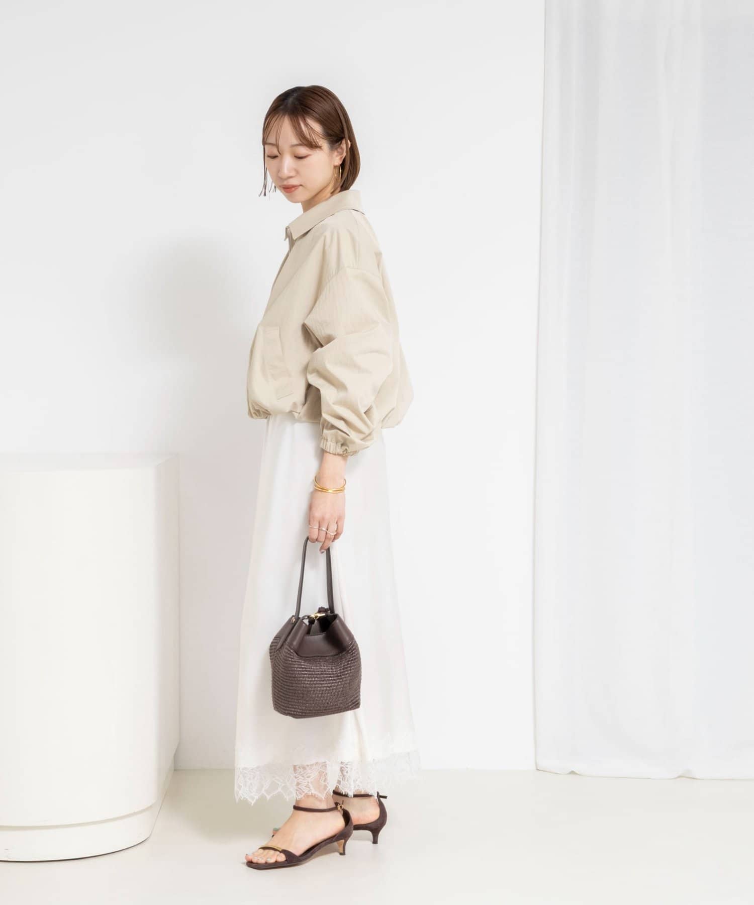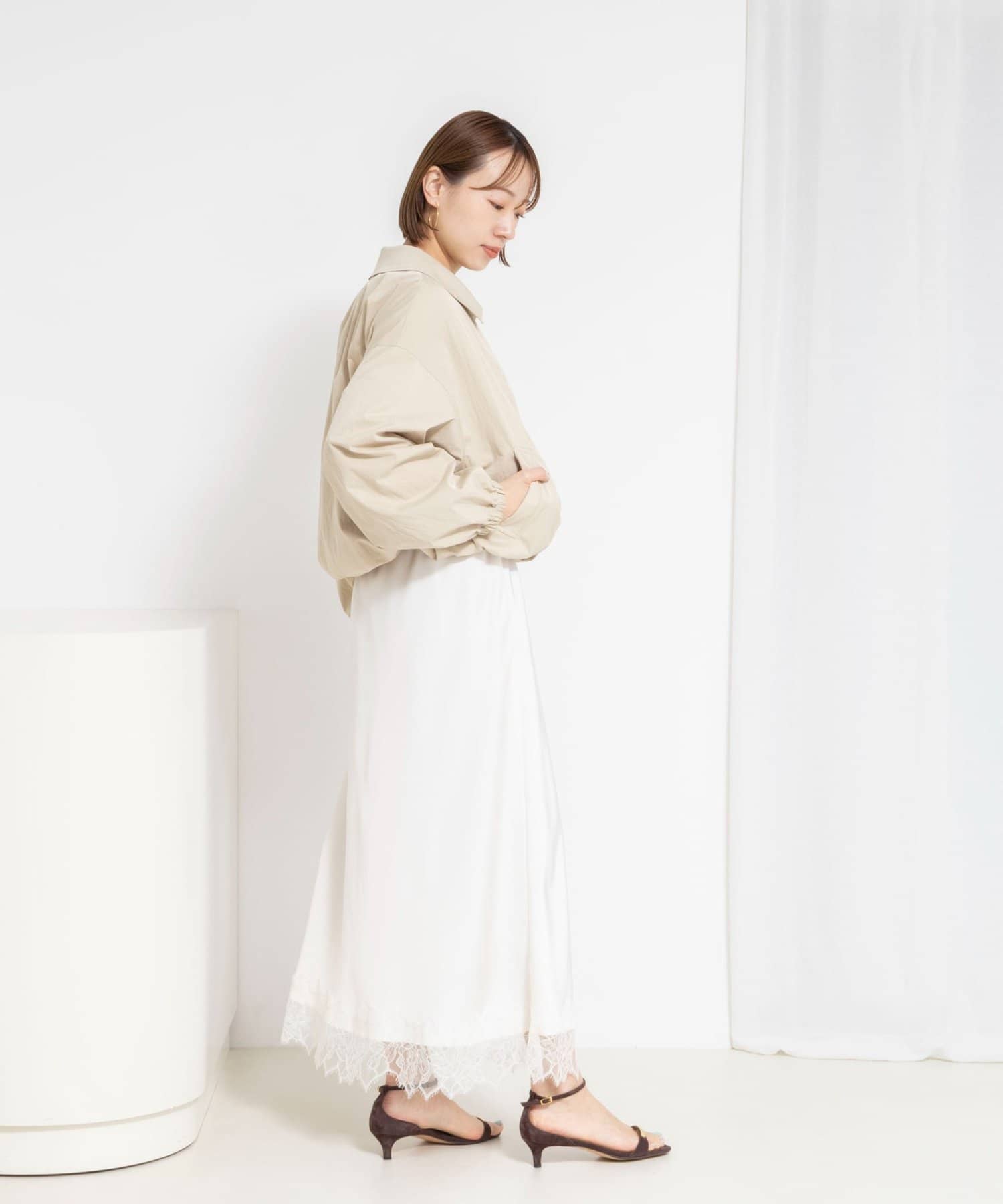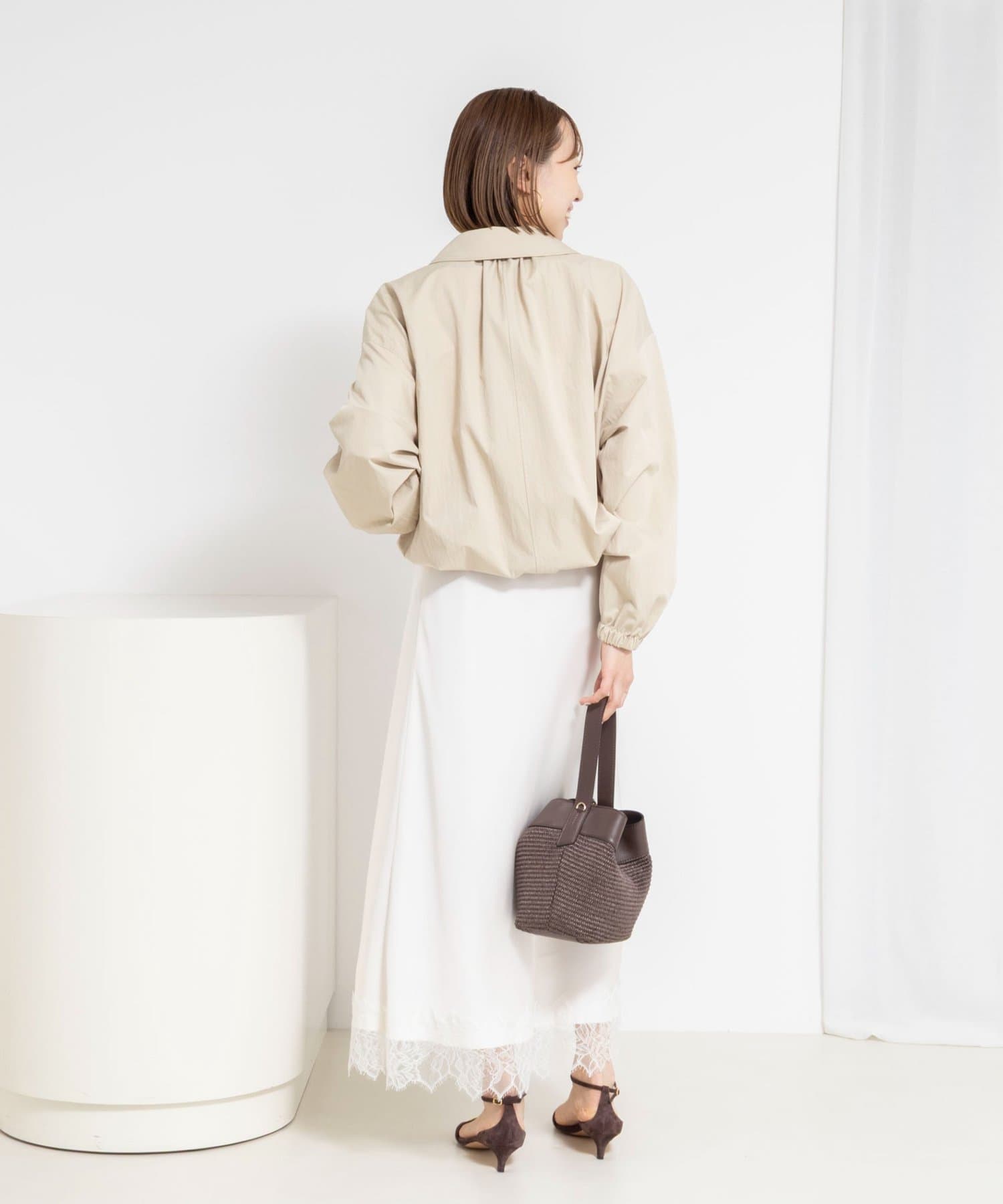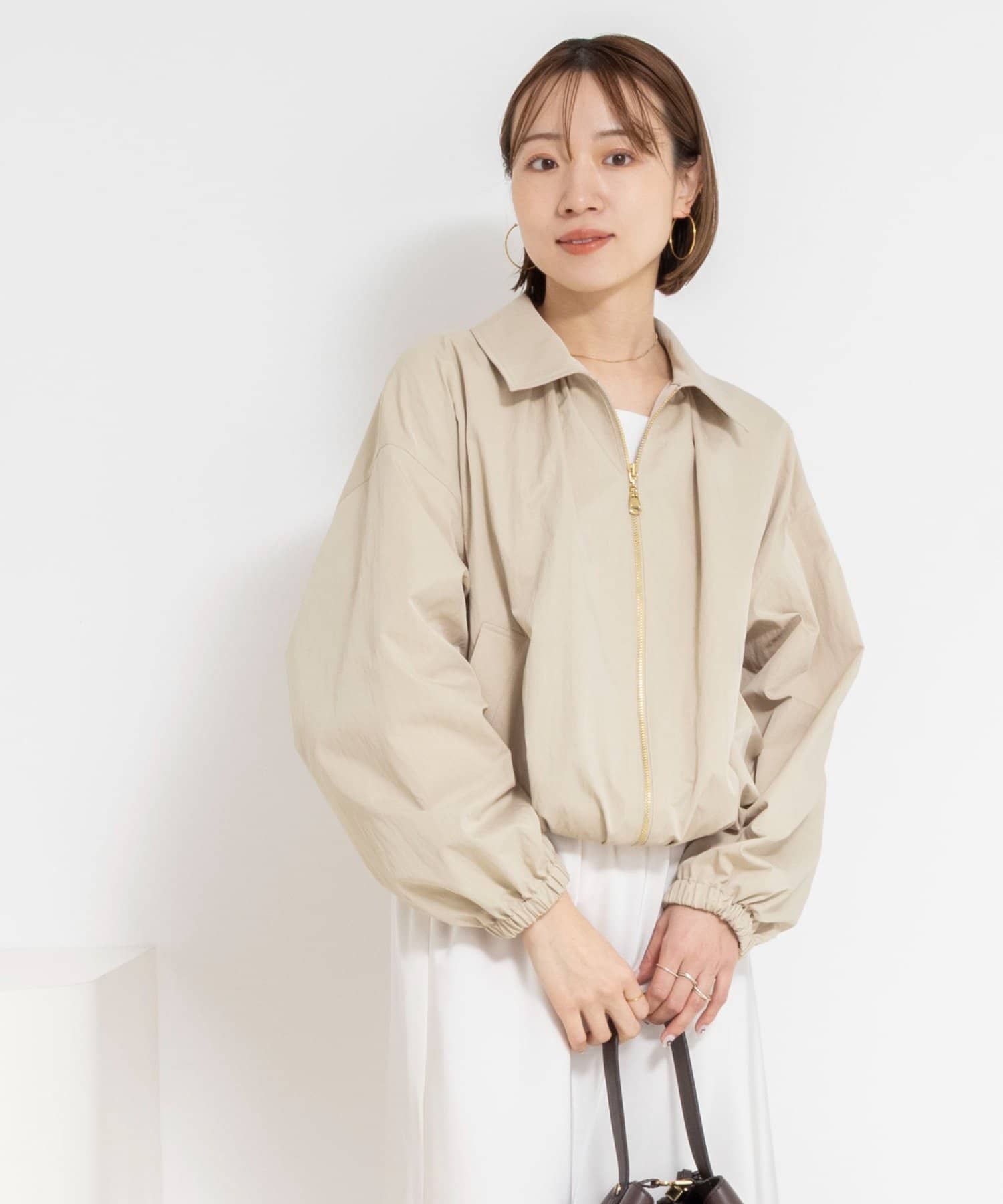 ・ギャザーをたっぷりと入れた丸みのあるシルエットとコンパクトな丈感が新鮮なバランスのライトアウター