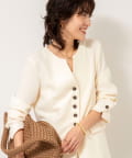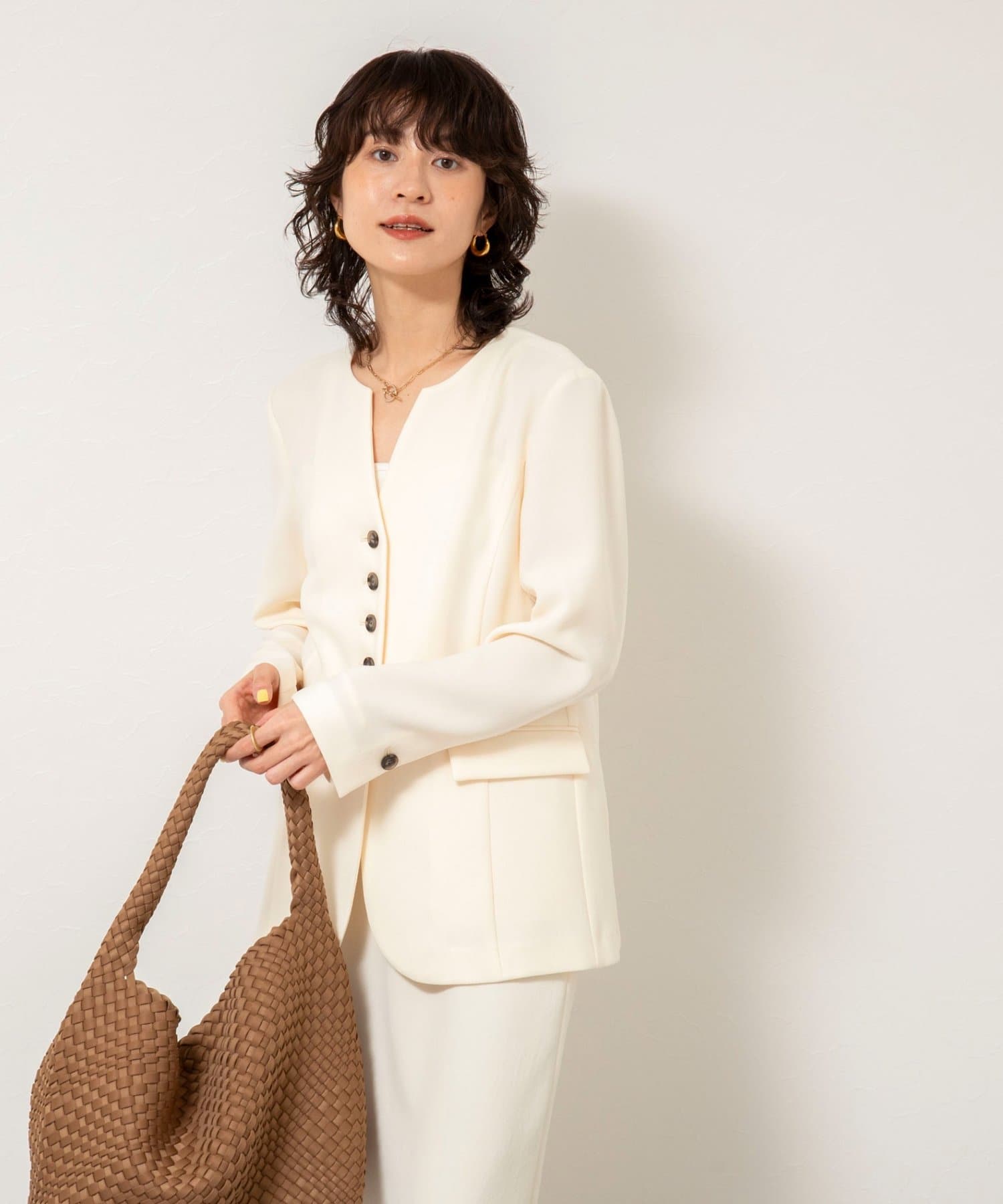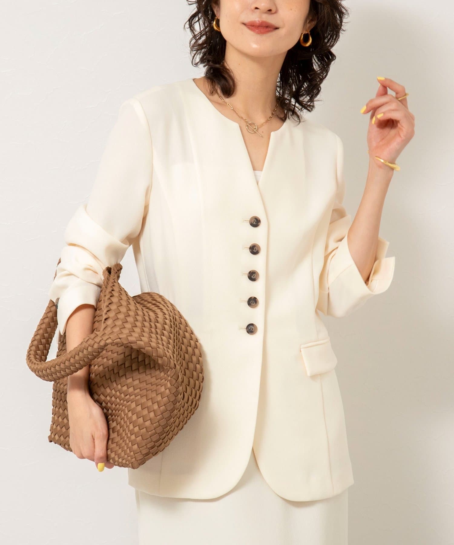 ・ほどよい深さのVネックあきで、釦をすべて閉じても、女性らしいムードですっきりと着用できるジャケット