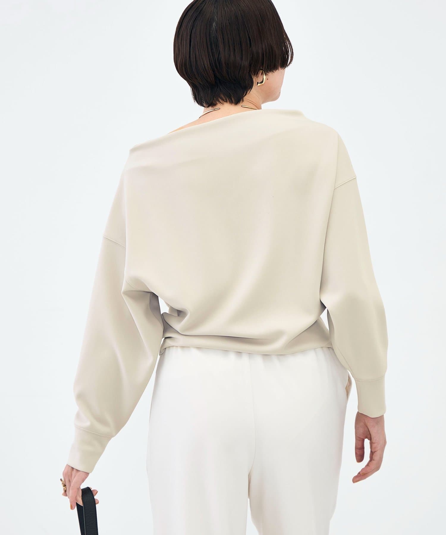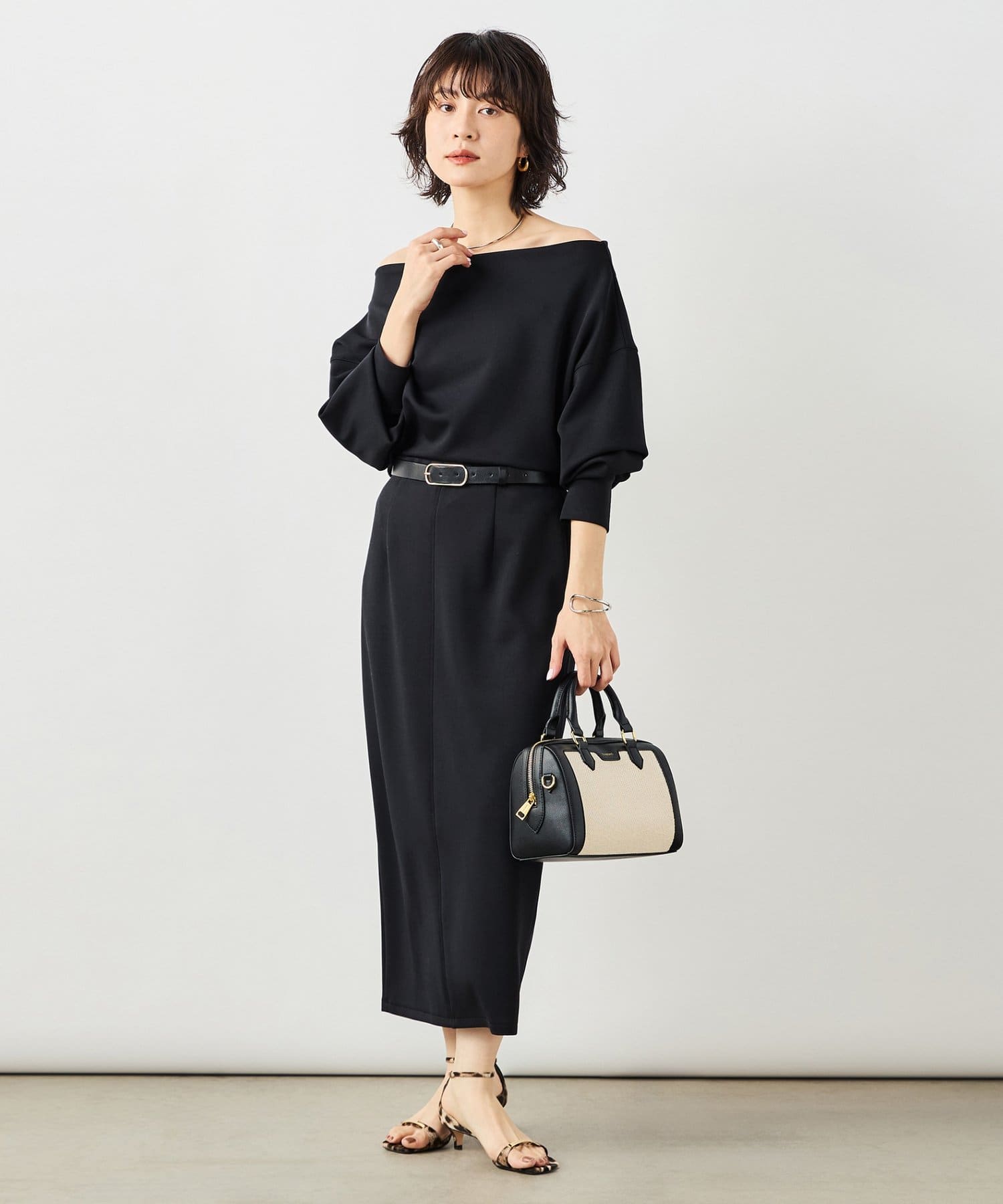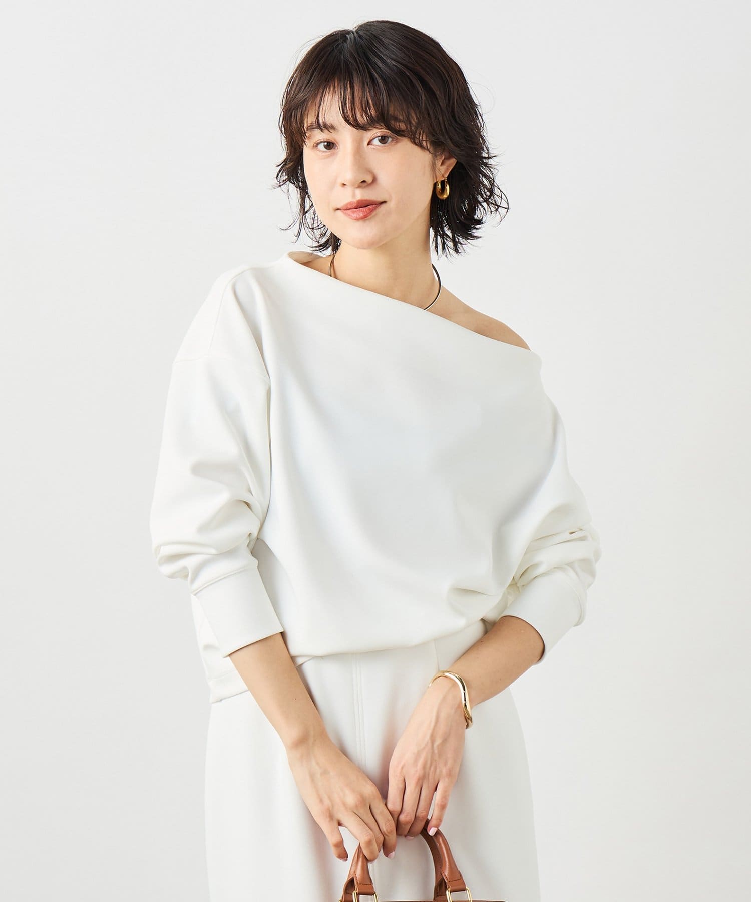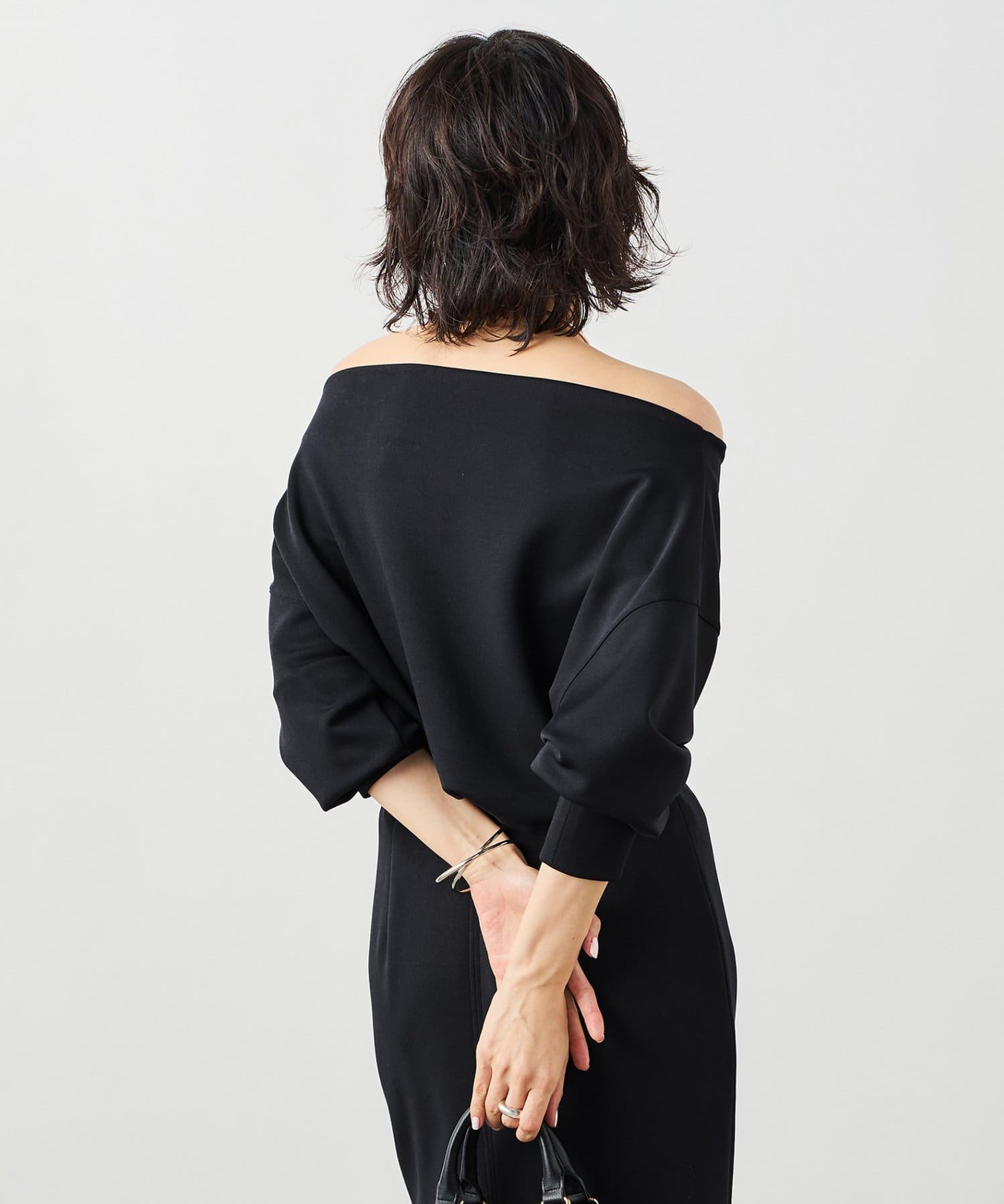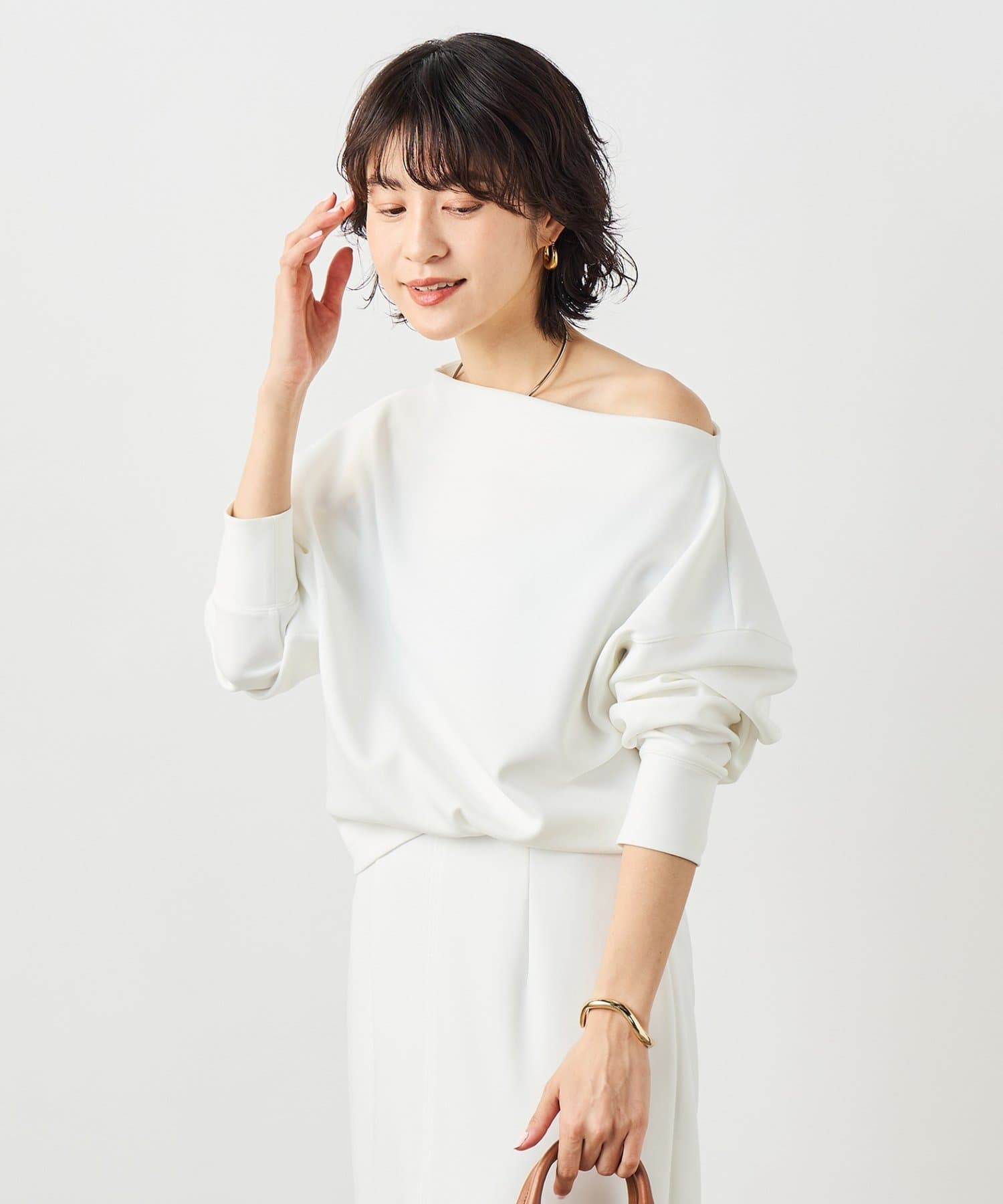 ・オフショルにもなるボートネック、程よくゆとりのあるサイジングで女性らしさのある1着
