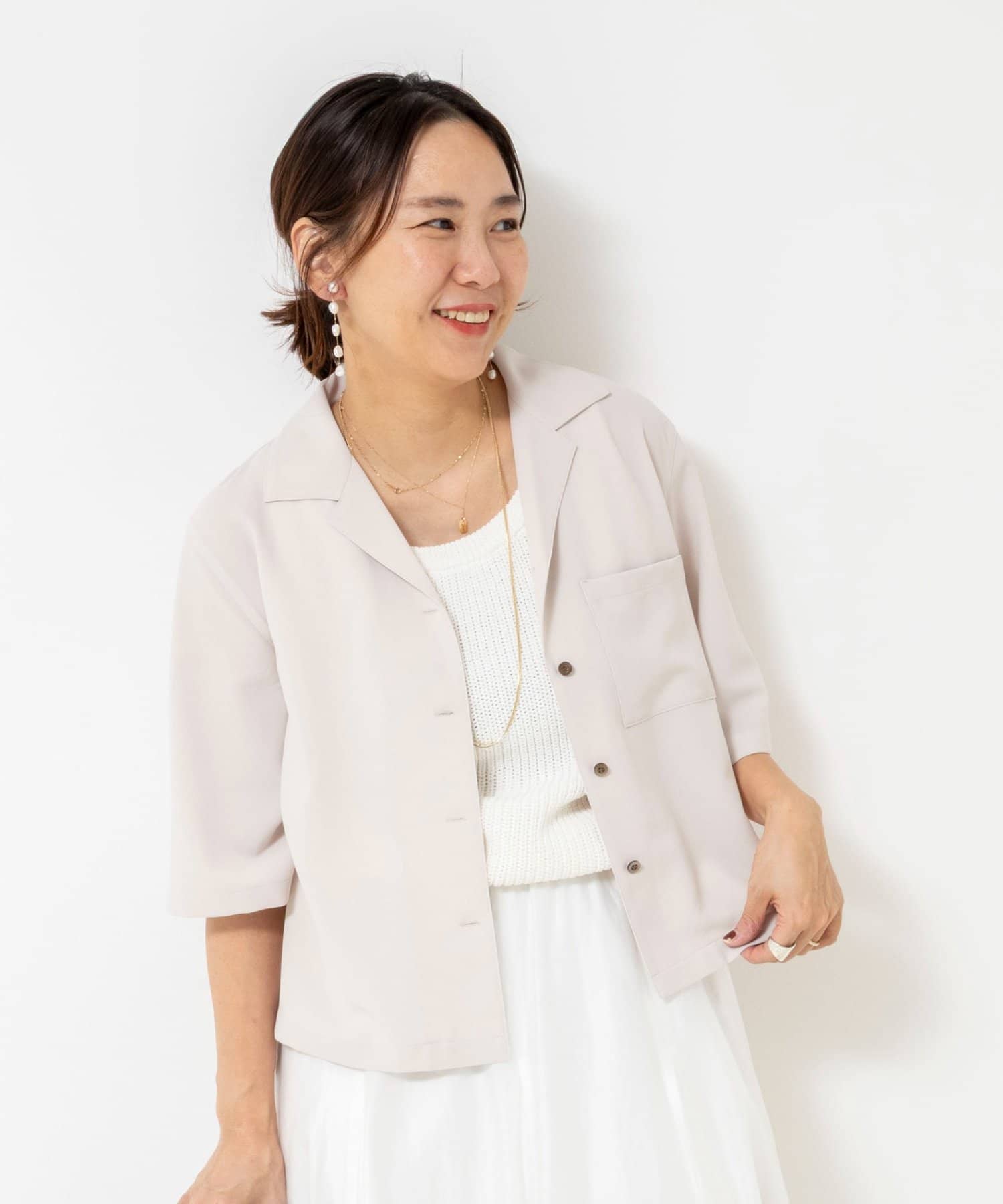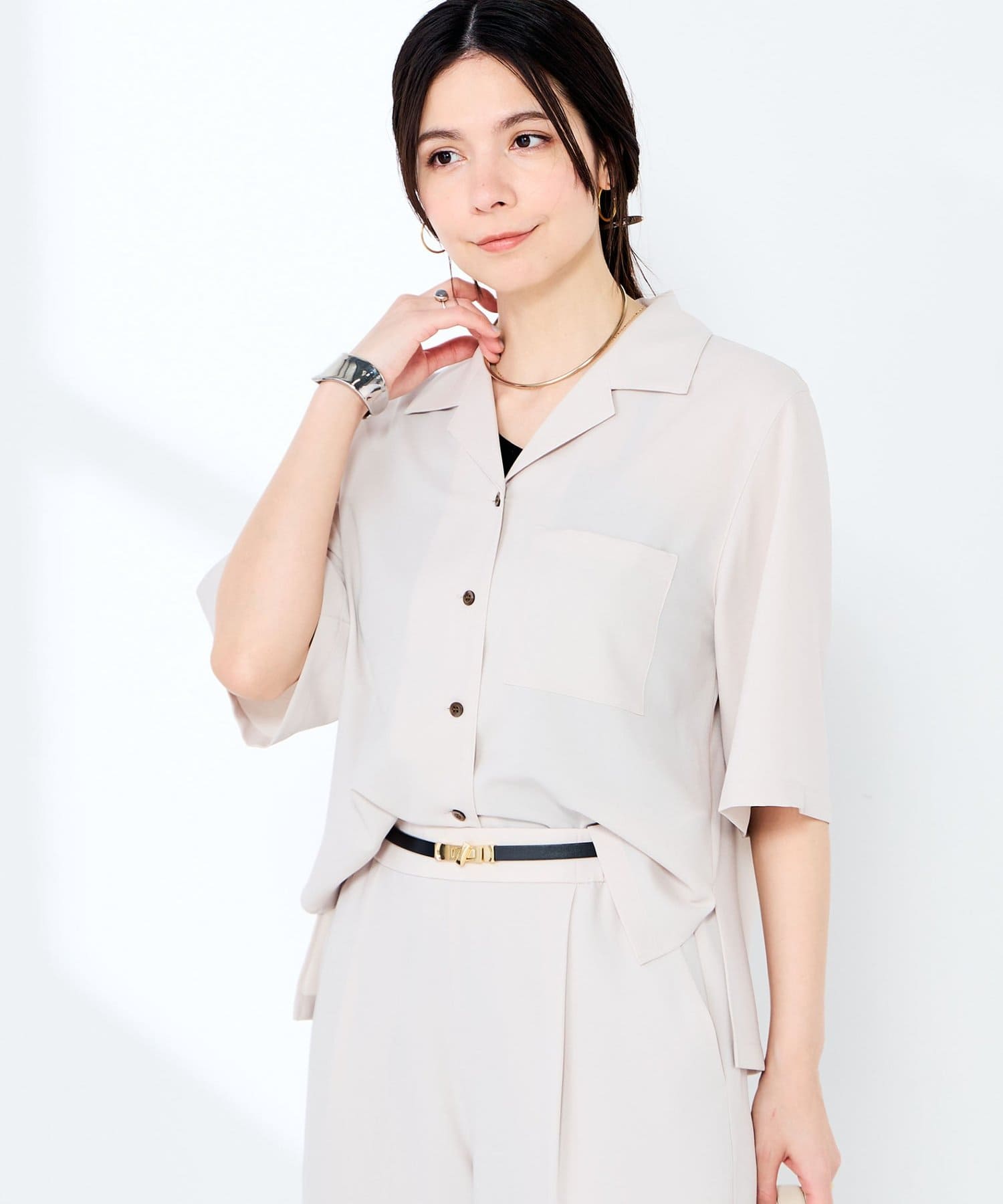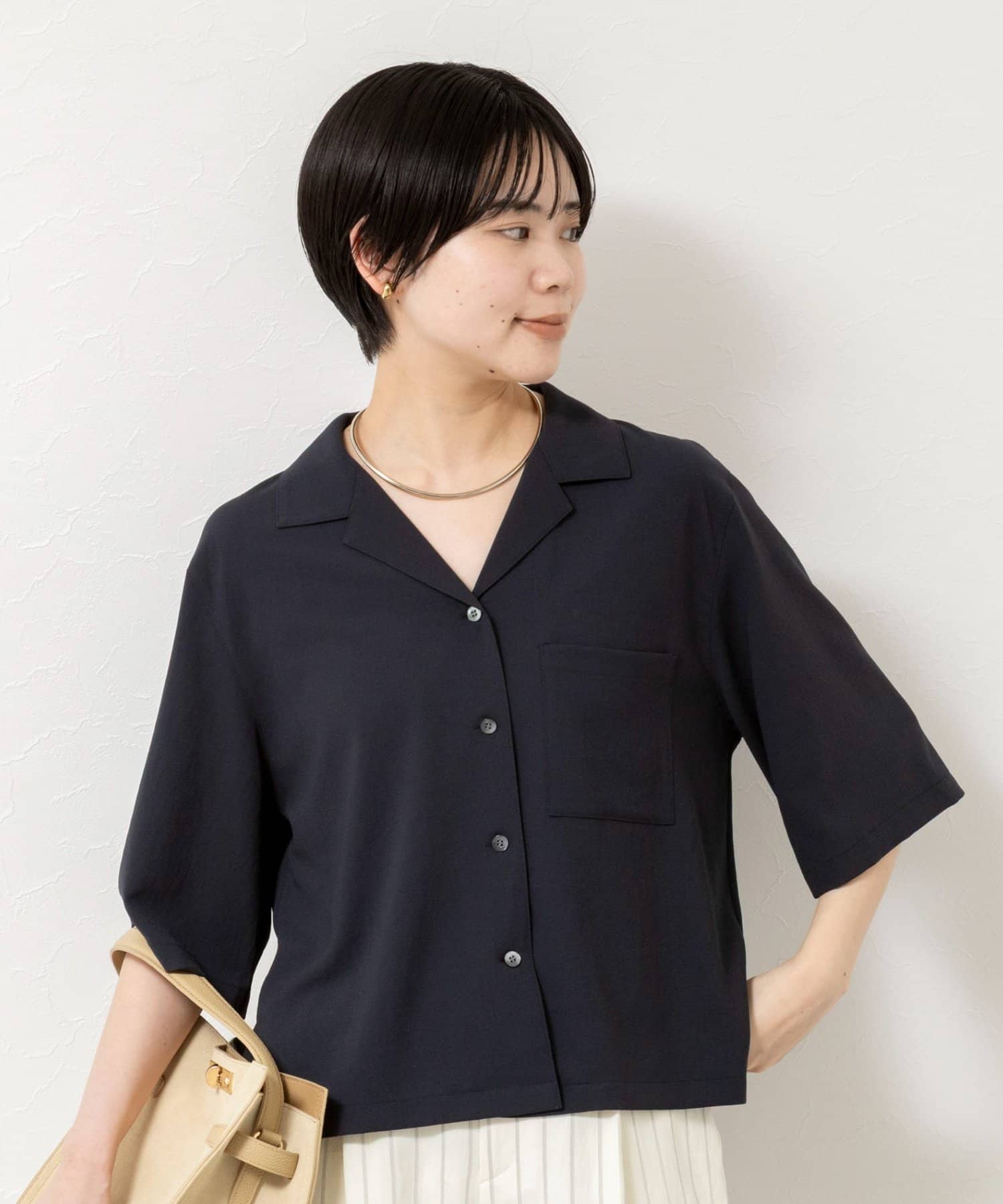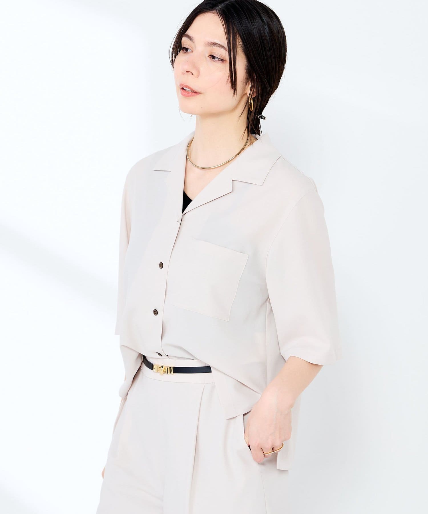 ・オープンカラーのショート丈シャツ
