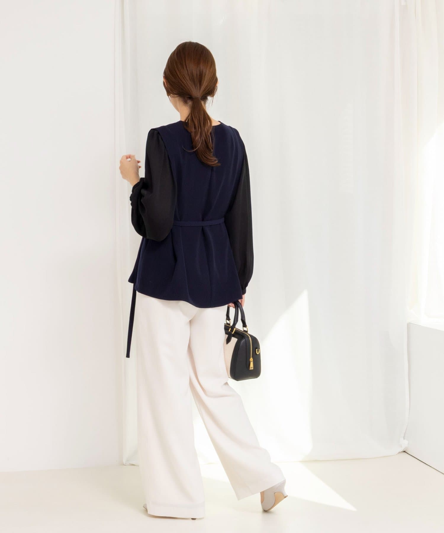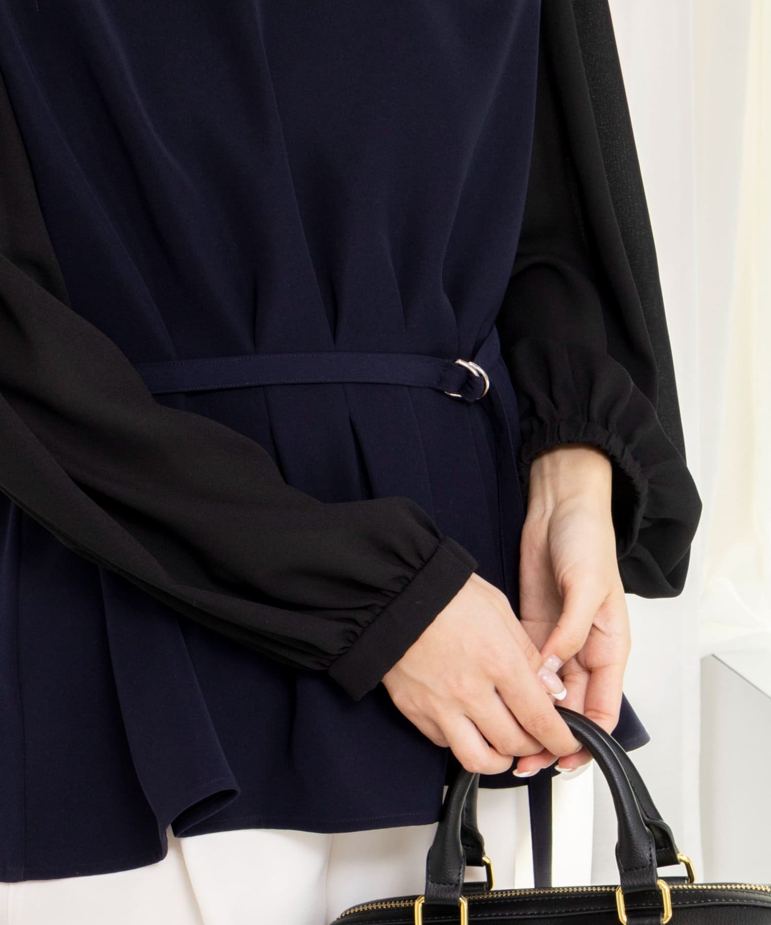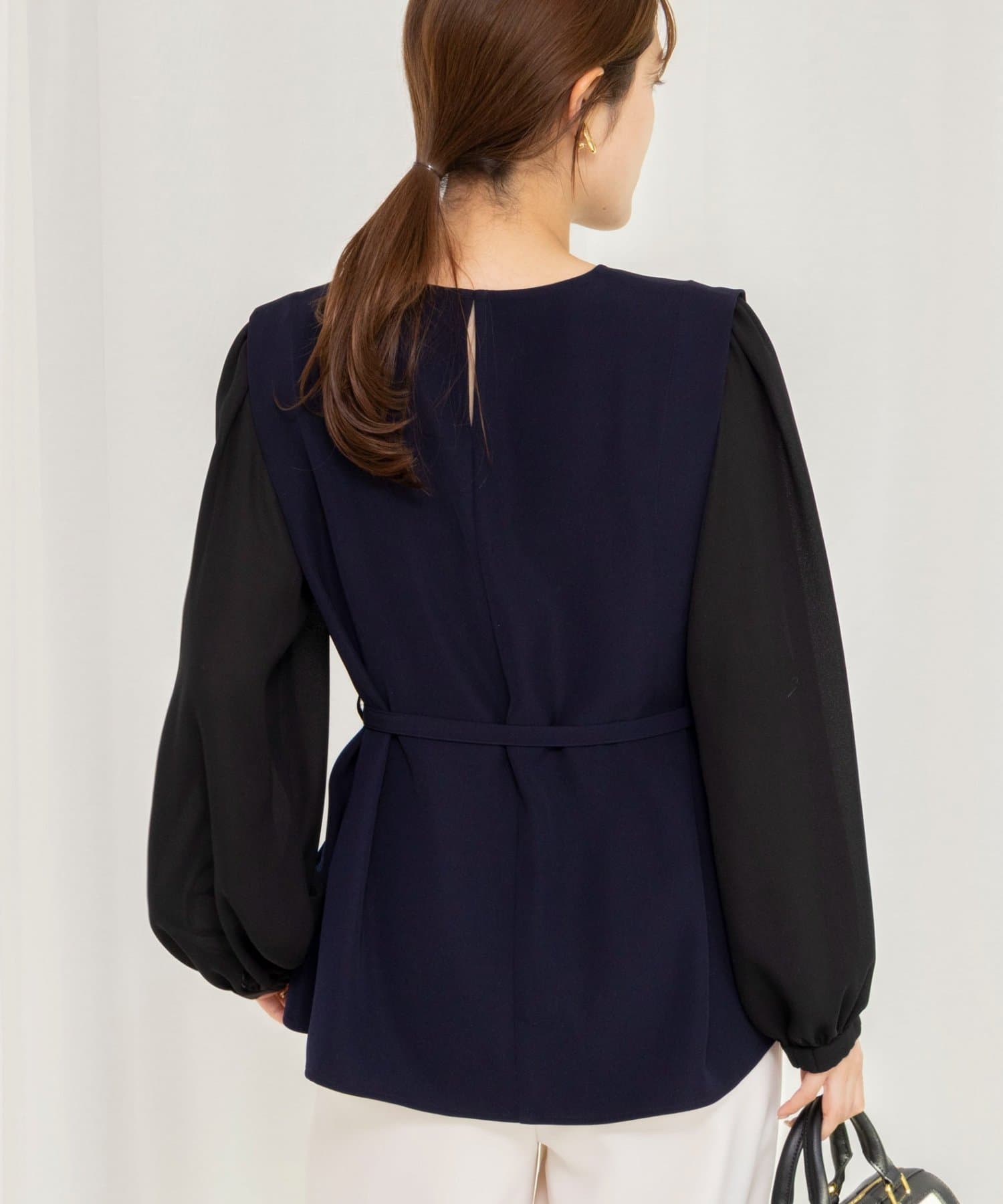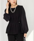 ・衿ぐり、袖口、裾と配色でトリミングし、レイヤードしているようなデザイン性のあるブラウス