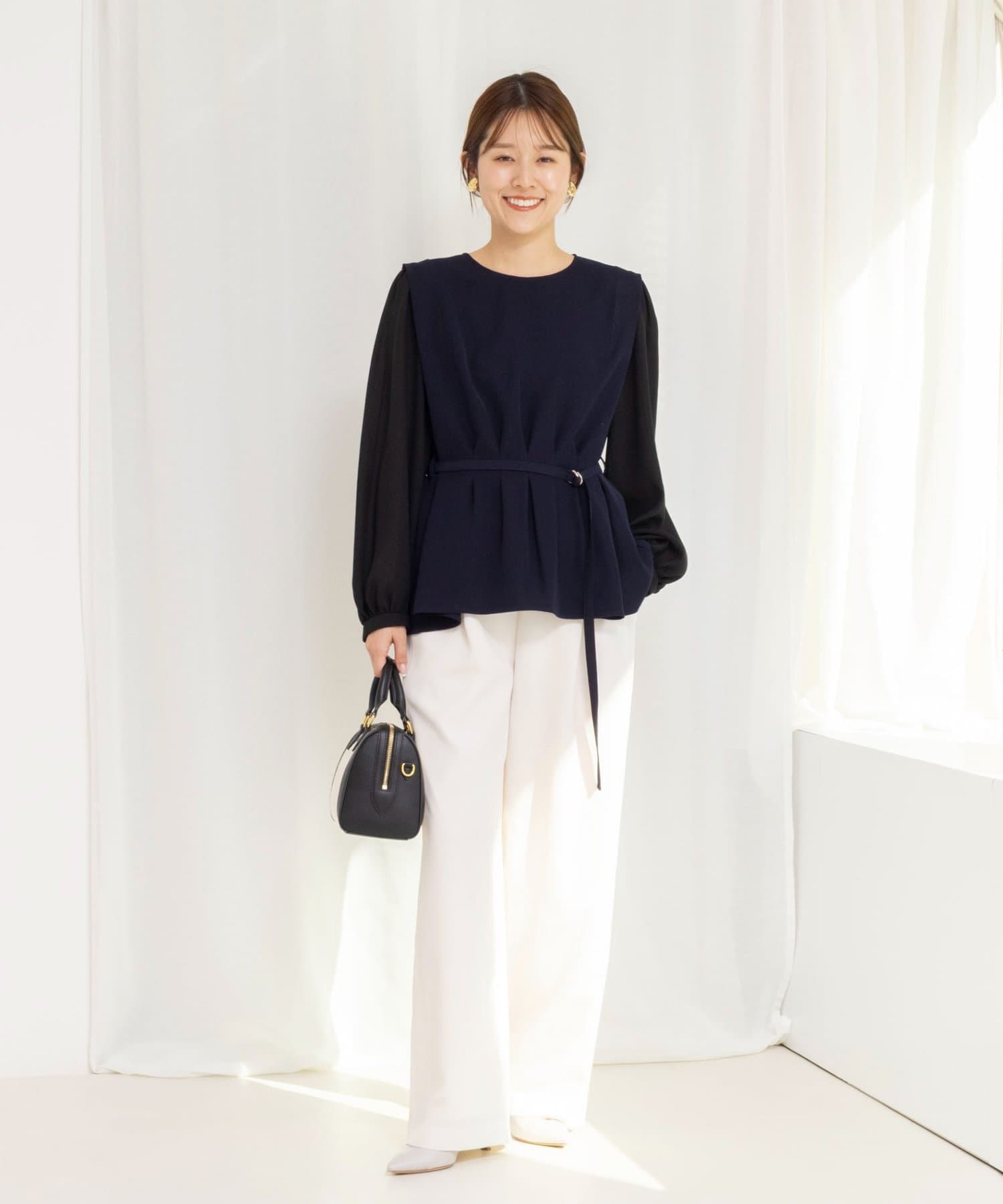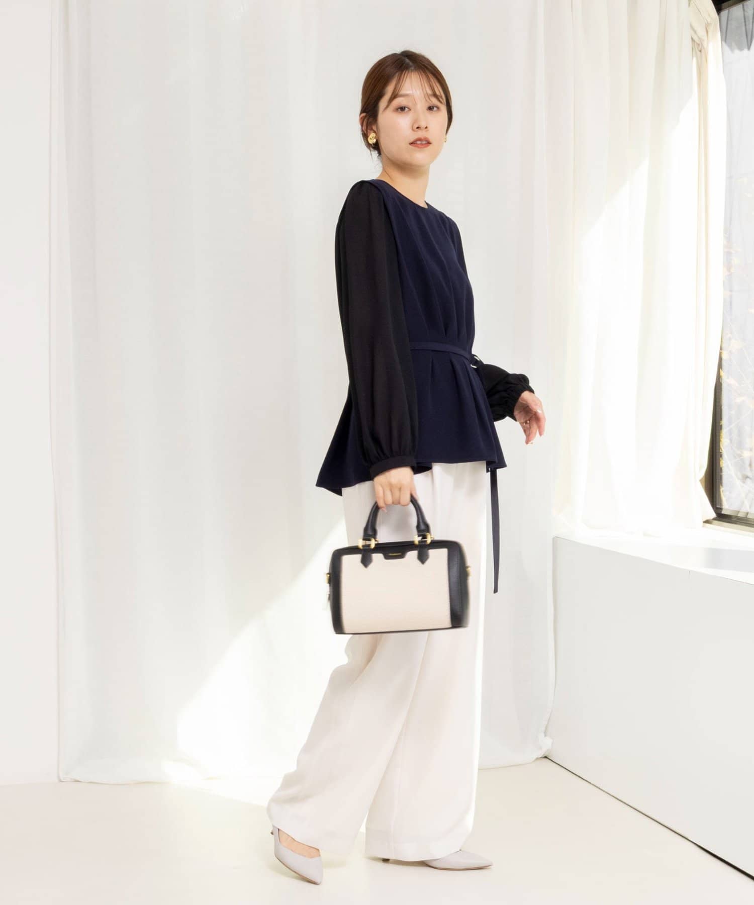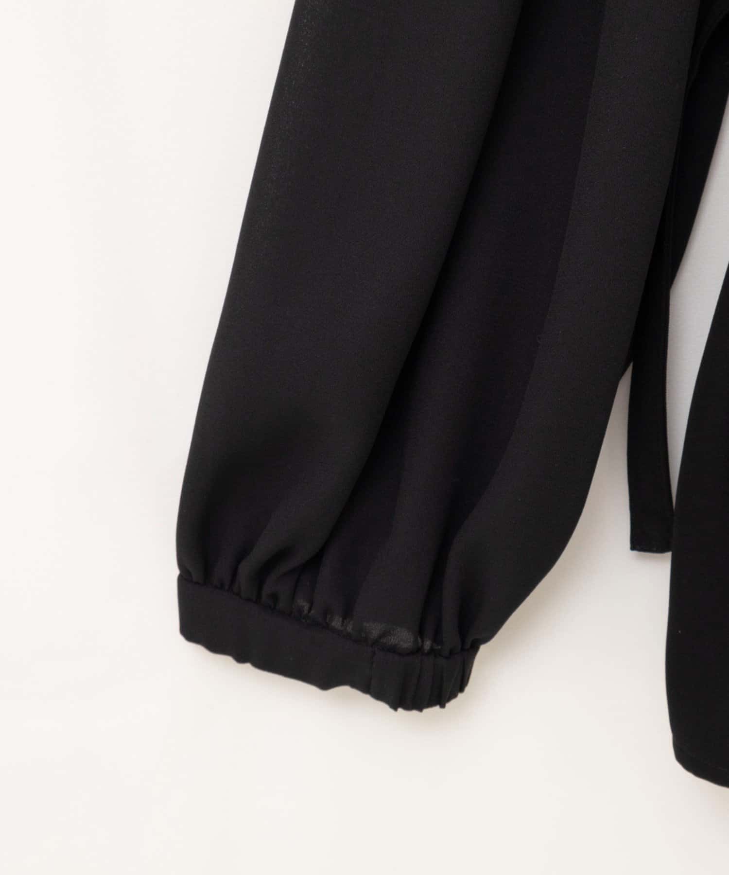 ・衿ぐり、袖口、裾と配色でトリミングし、レイヤードしているようなデザイン性のあるブラウス