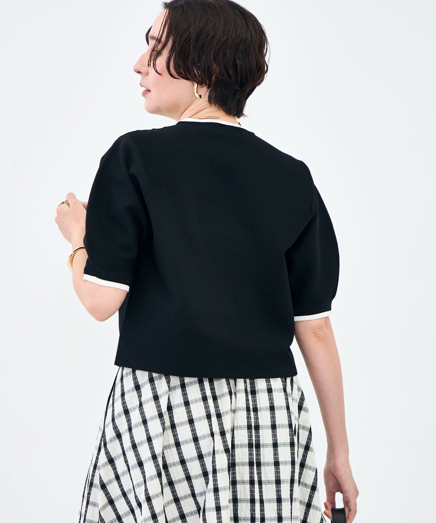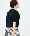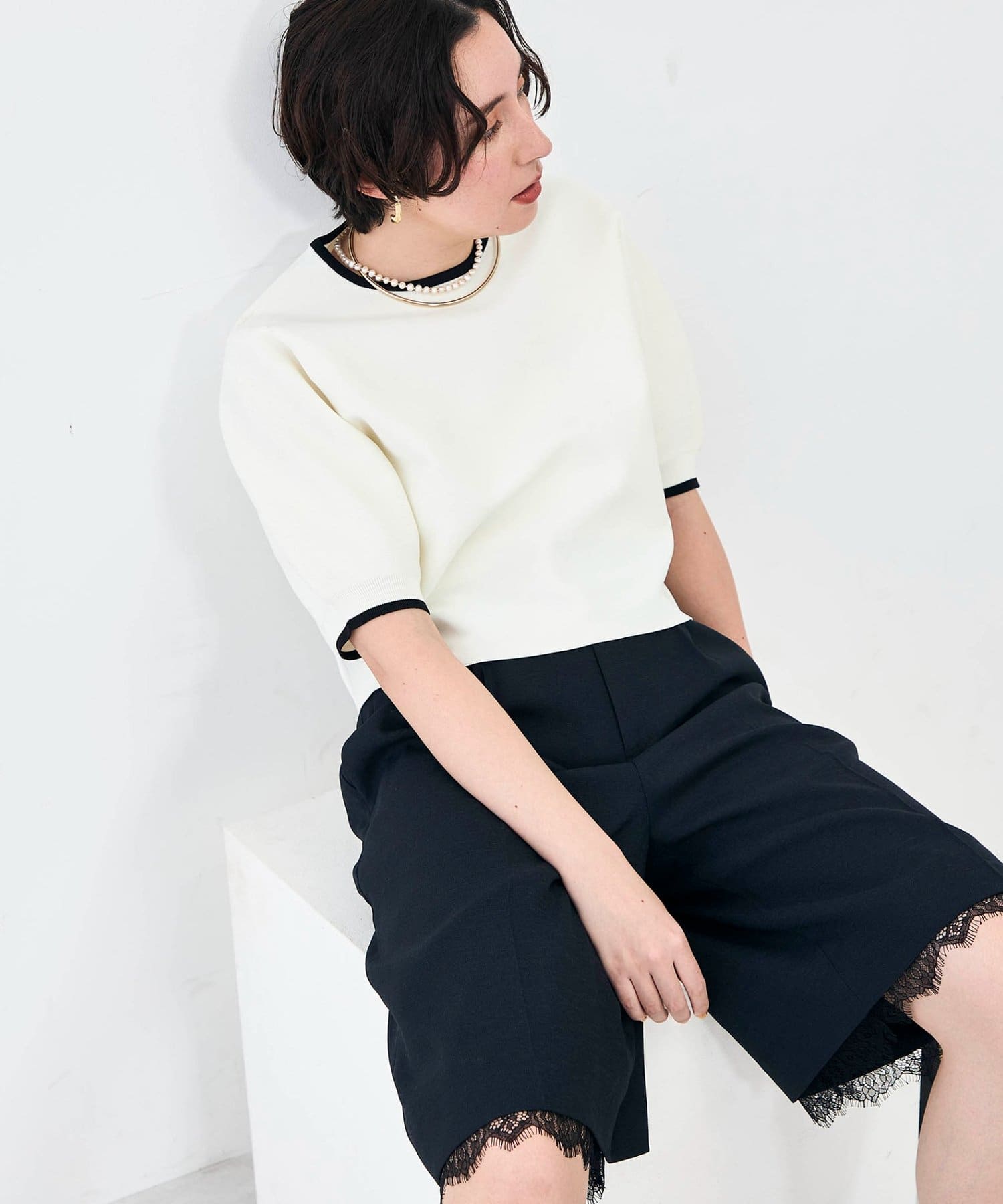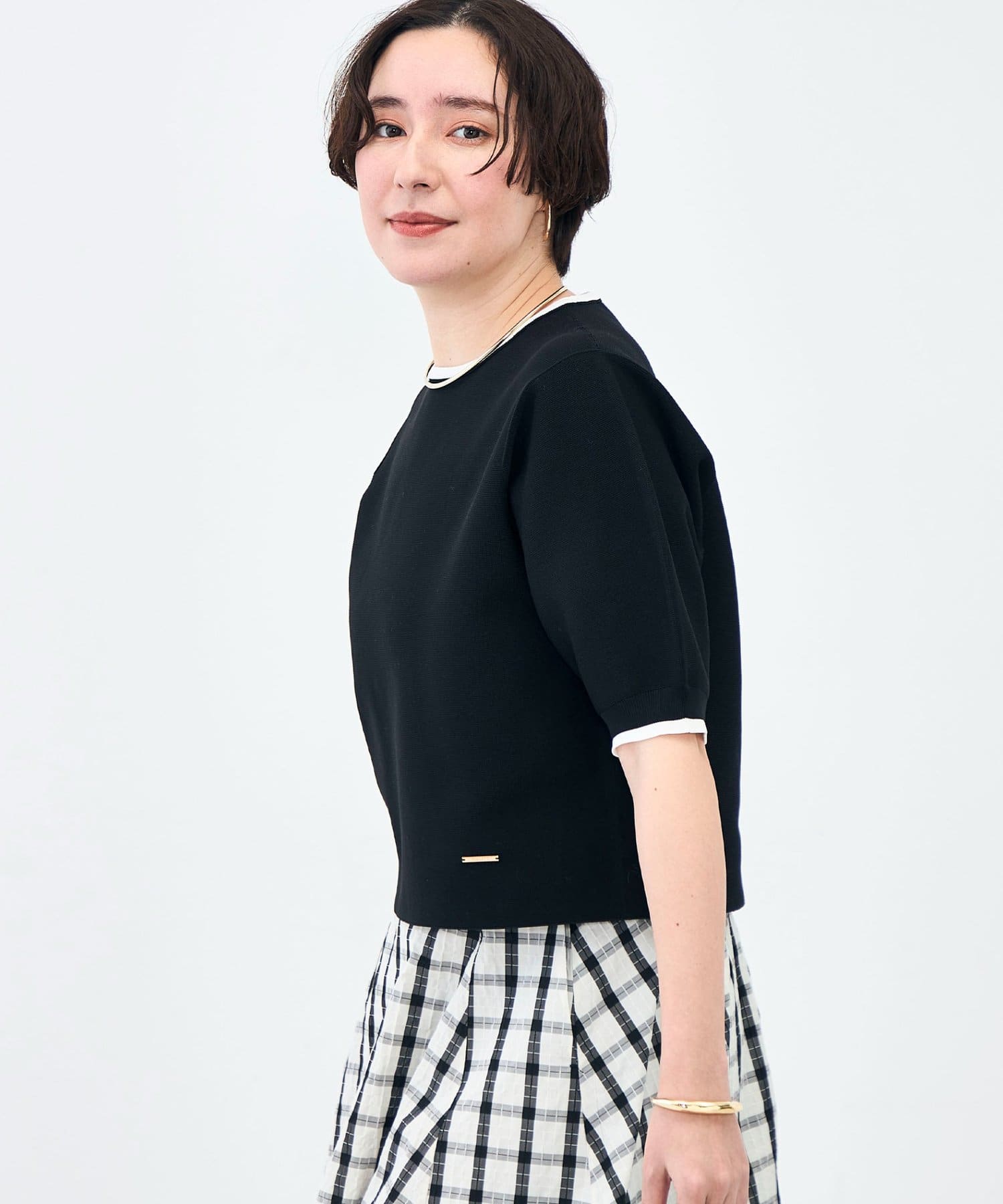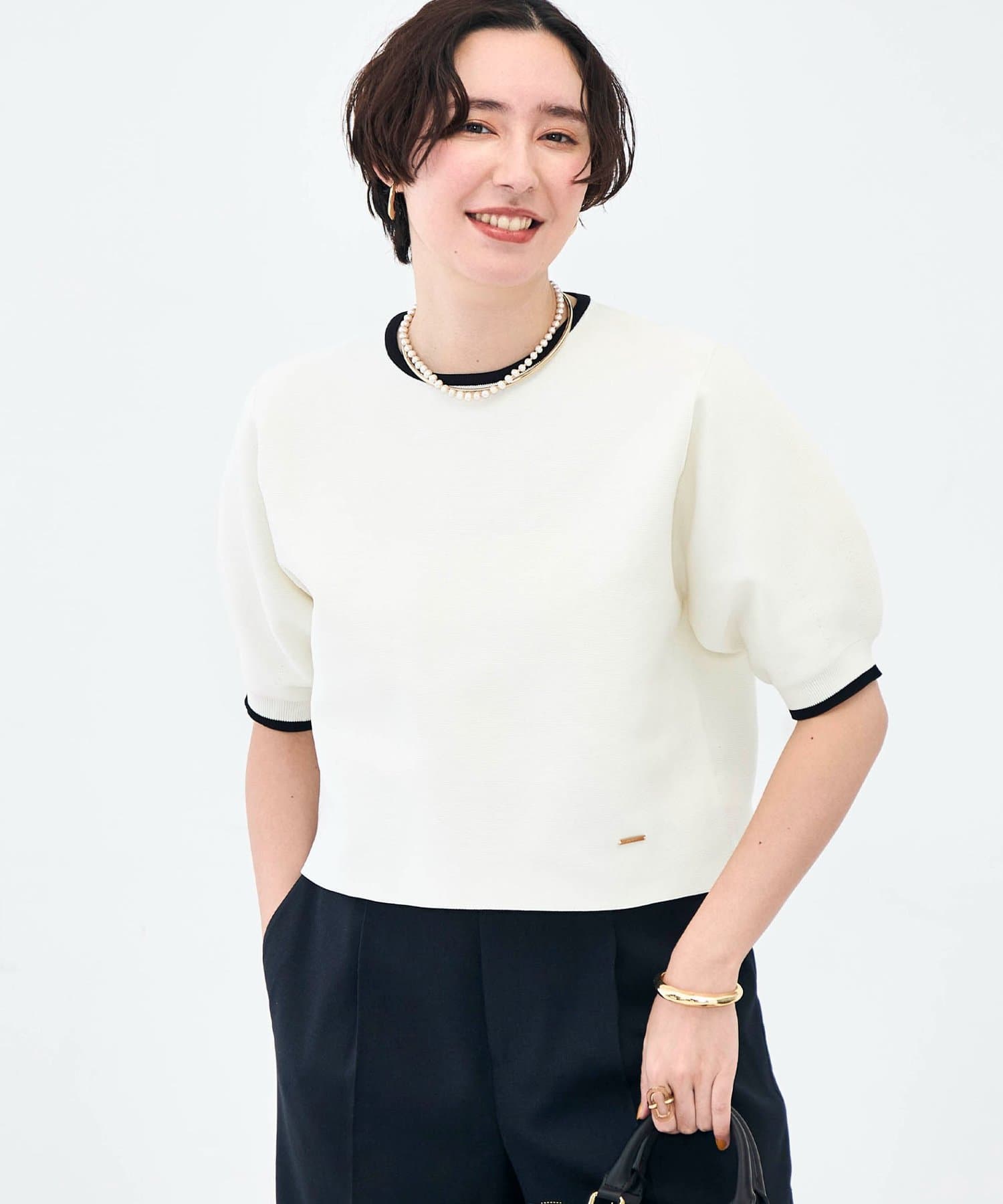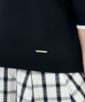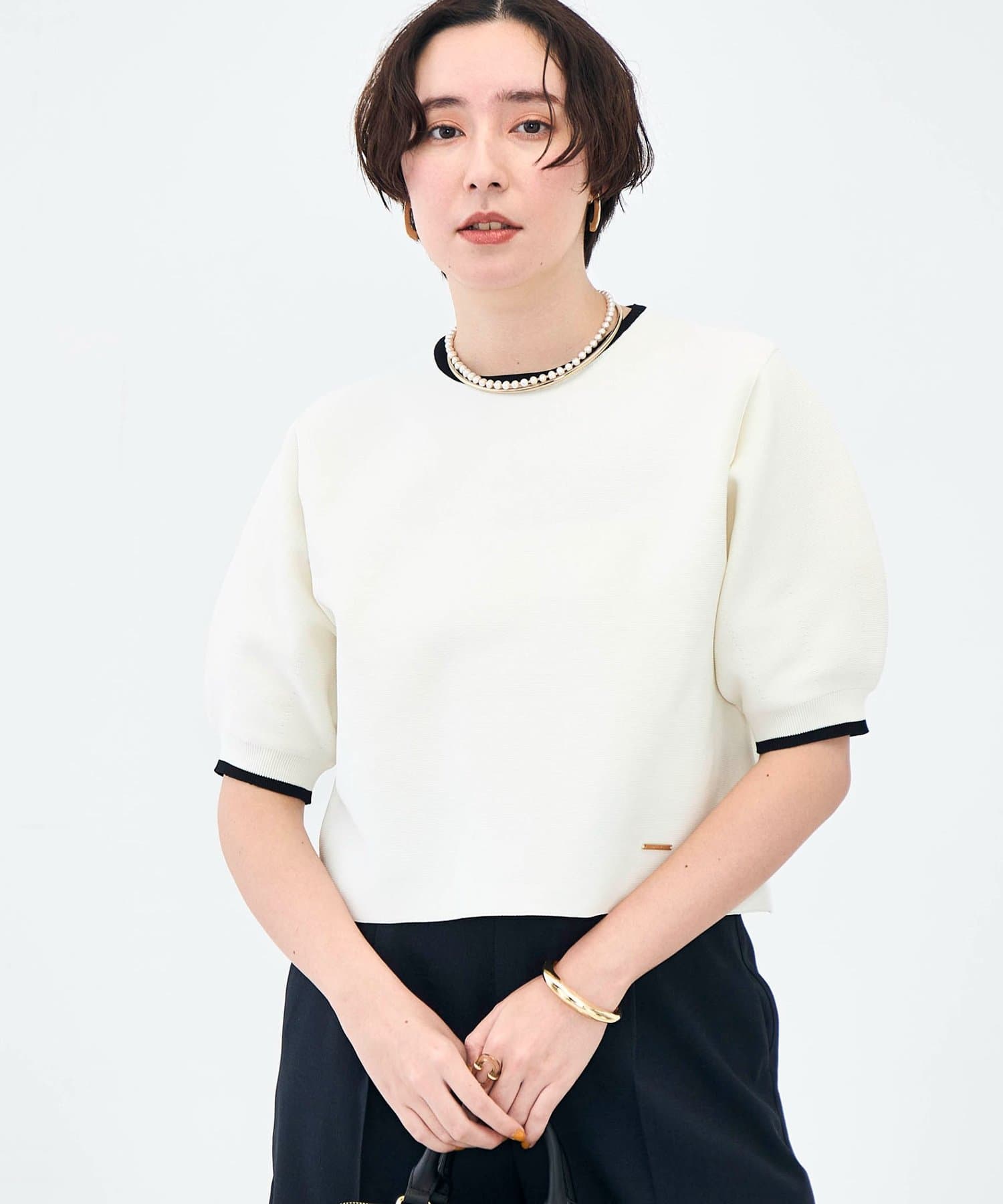 ・襟ぐりと袖口の配色がデザインポイントのニットT