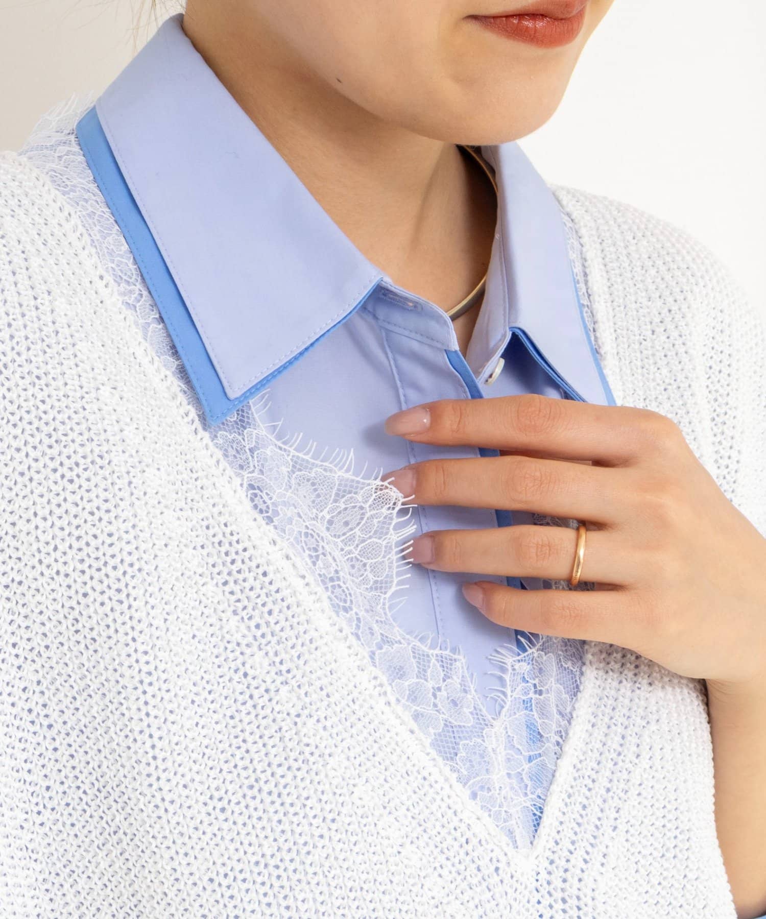 ・襟ぐりにレースをほどこした今年らしい1着