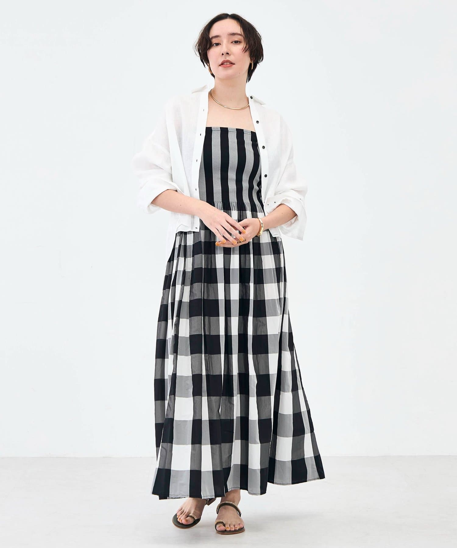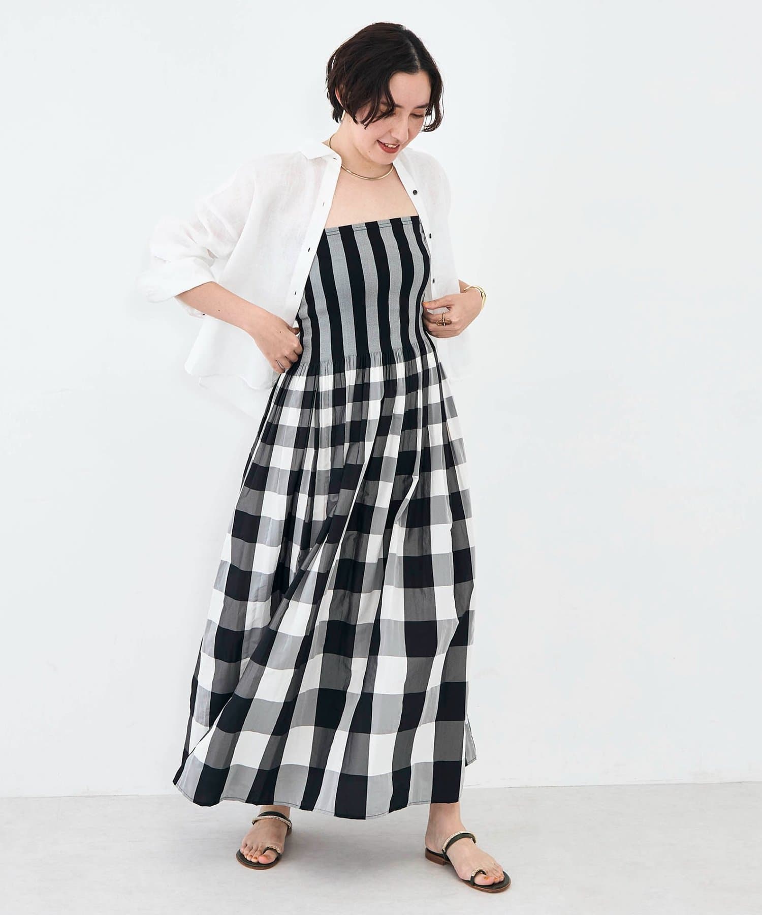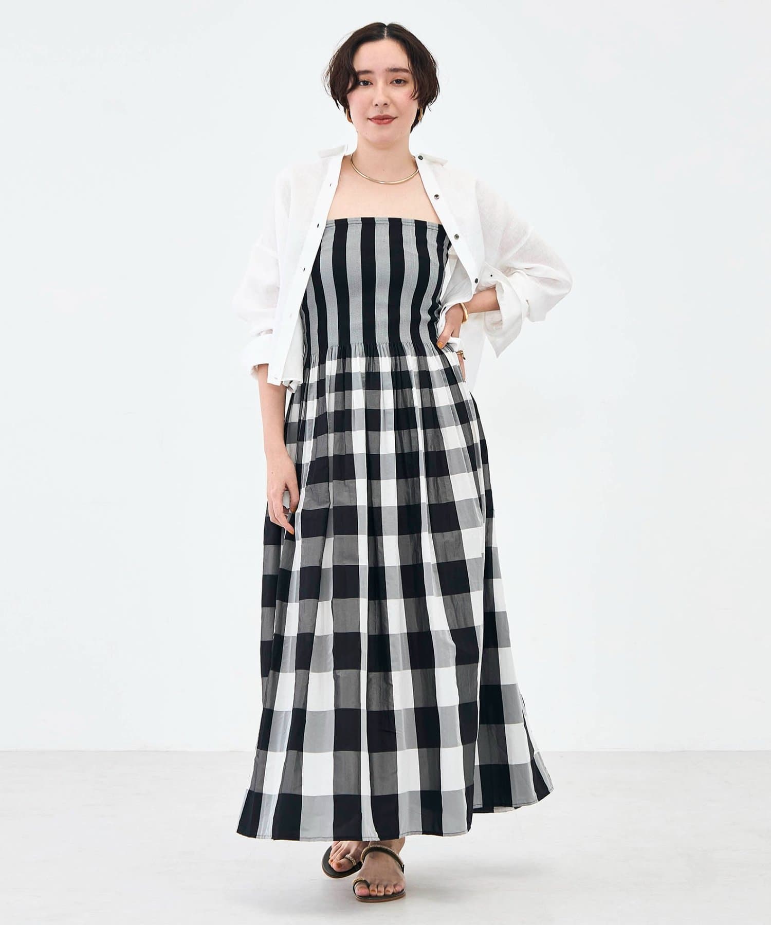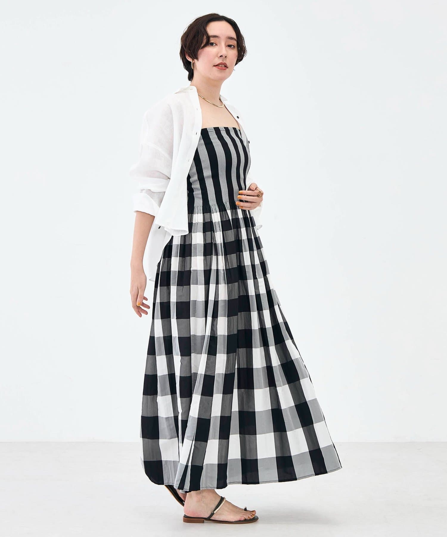 ・モノトーンの大きなチェック柄とベアトップのデザインがシックで大人っぽい印象