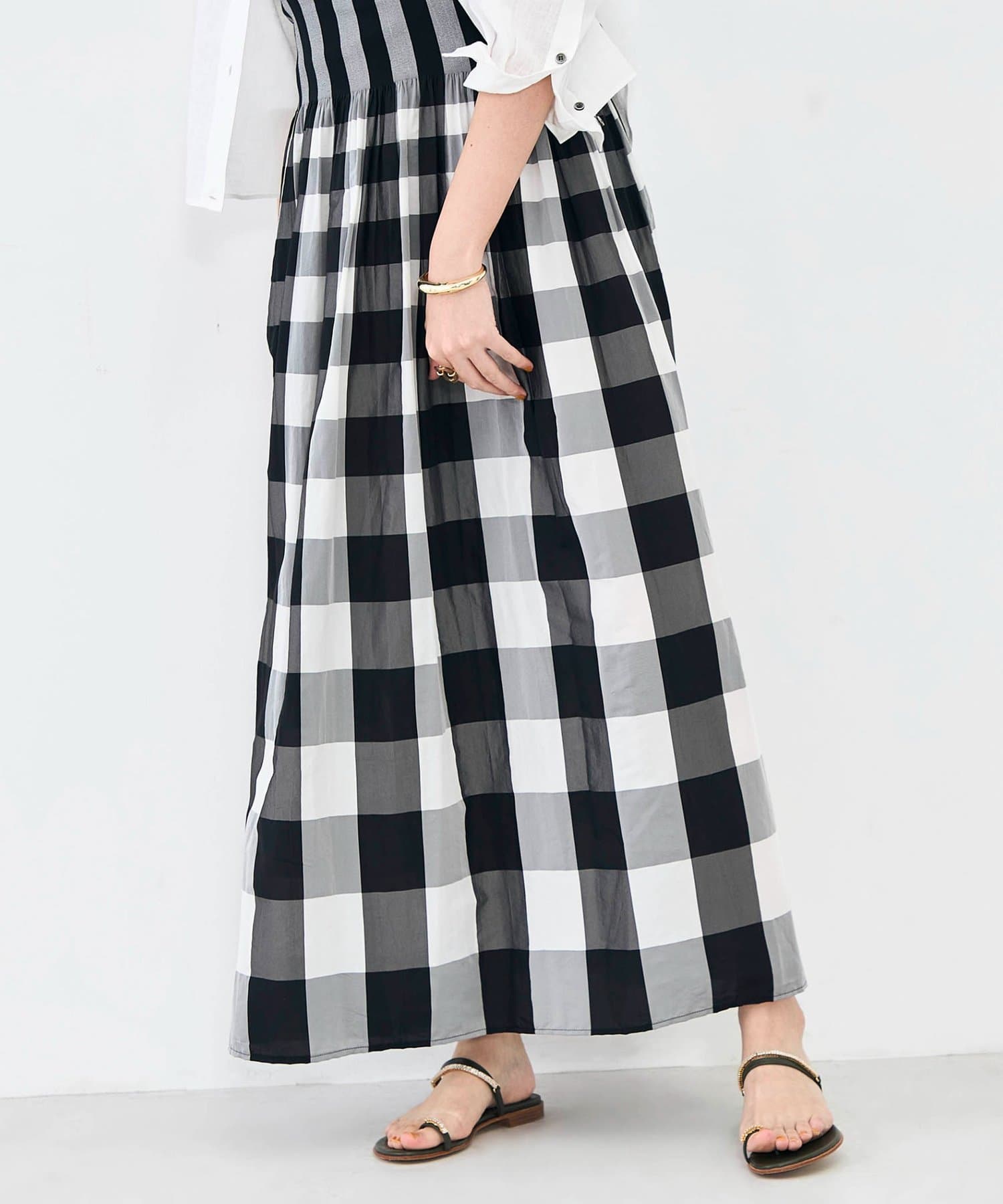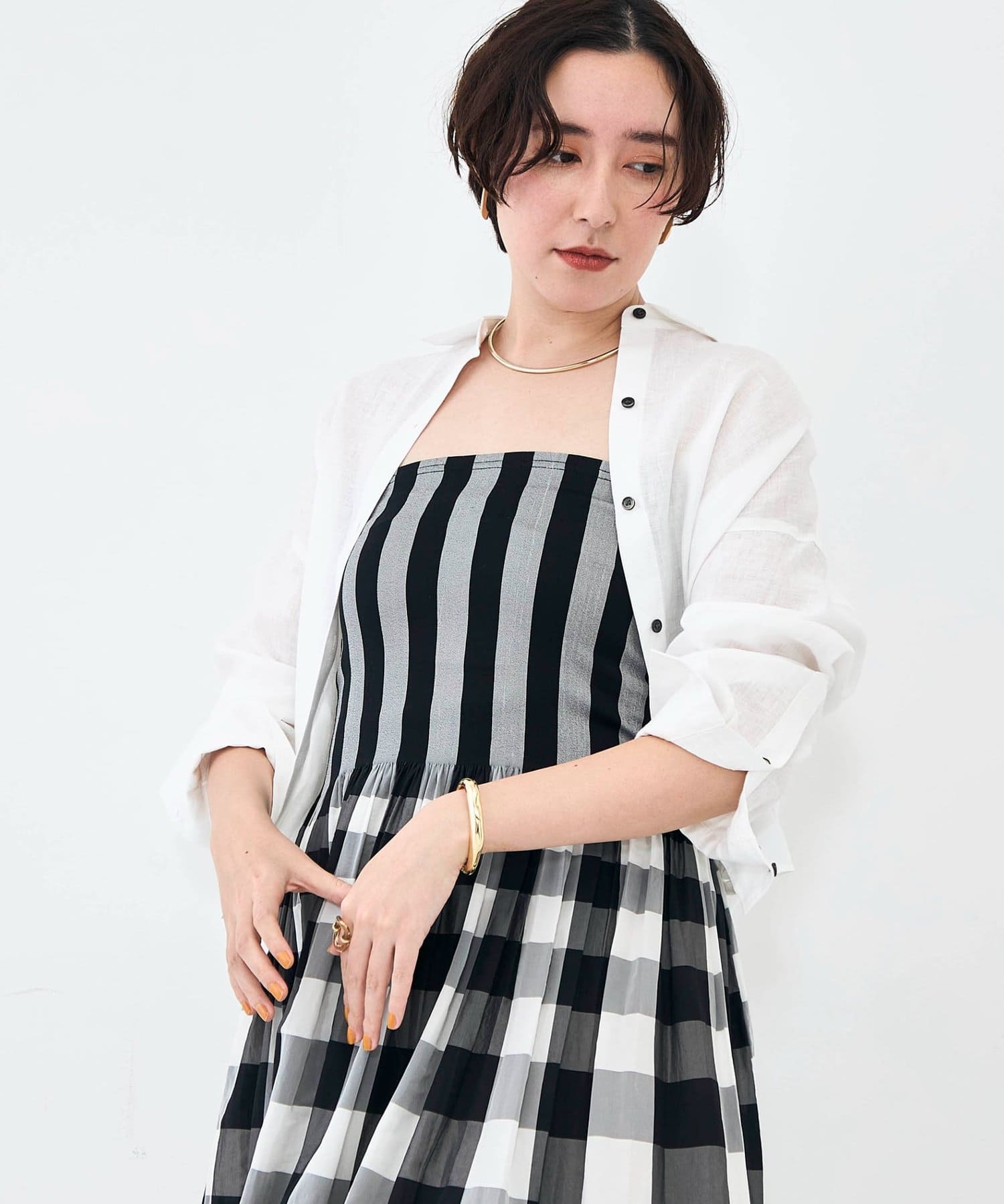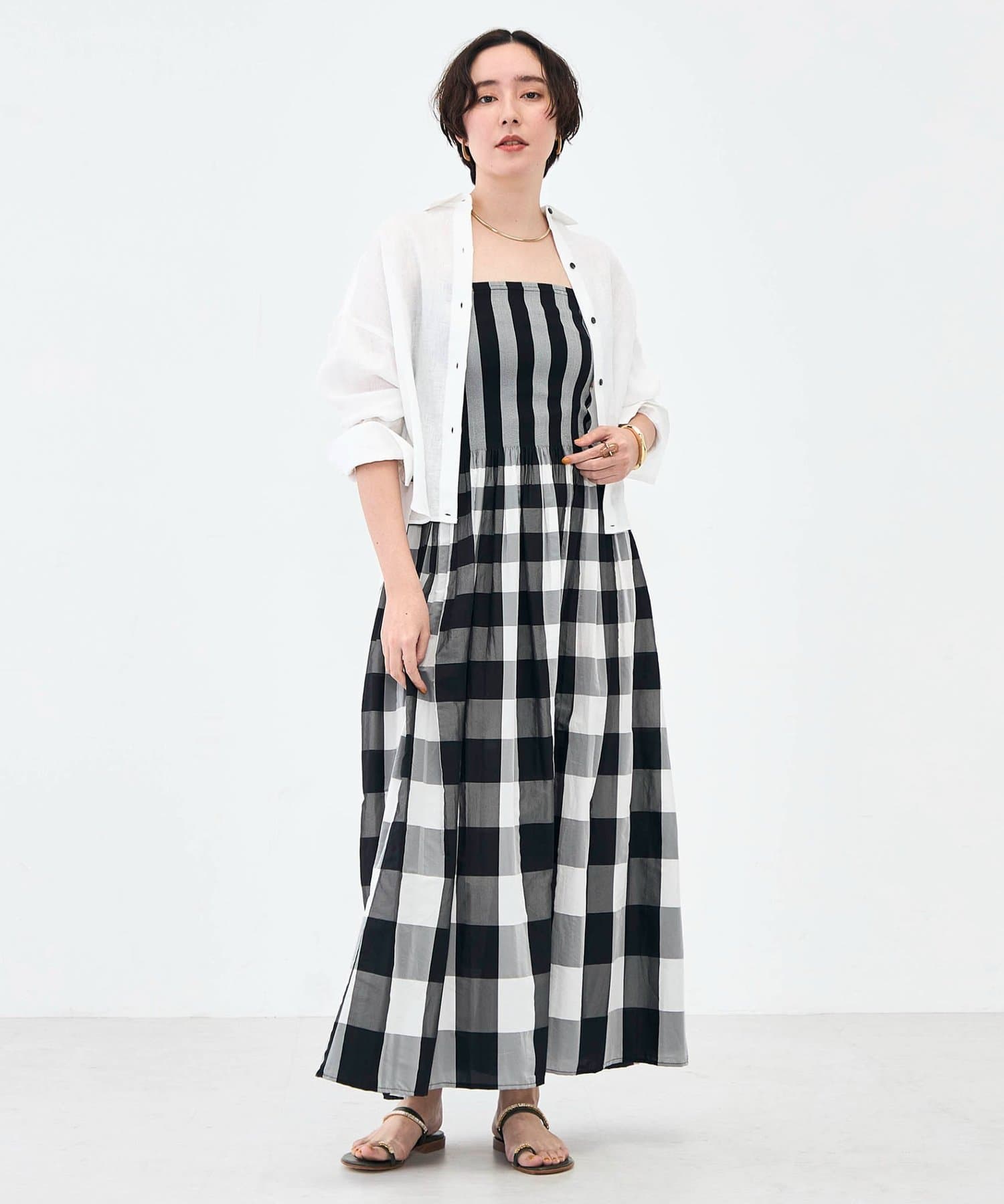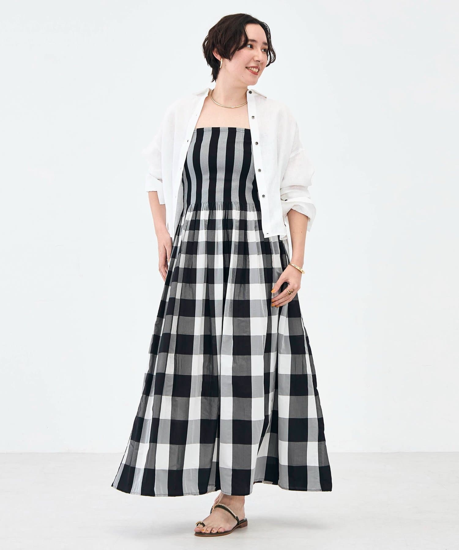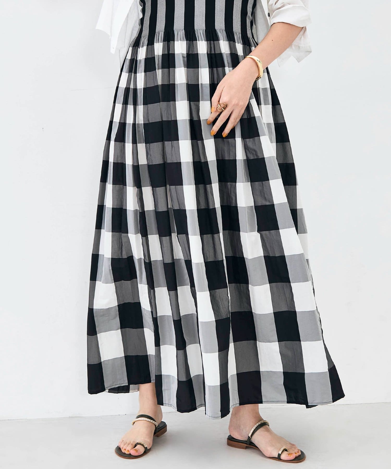 ・モノトーンの大きなチェック柄とベアトップのデザインがシックで大人っぽい印象