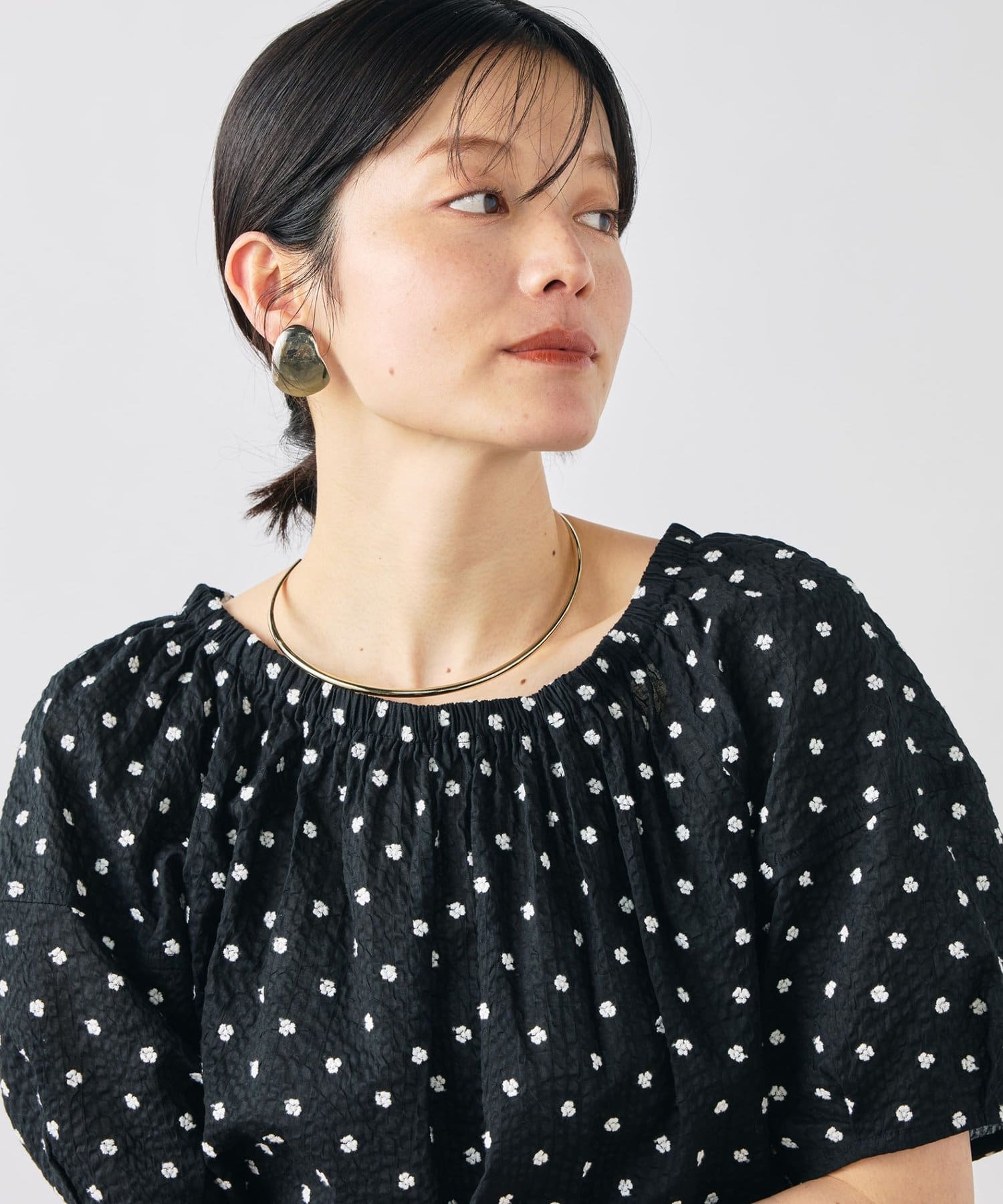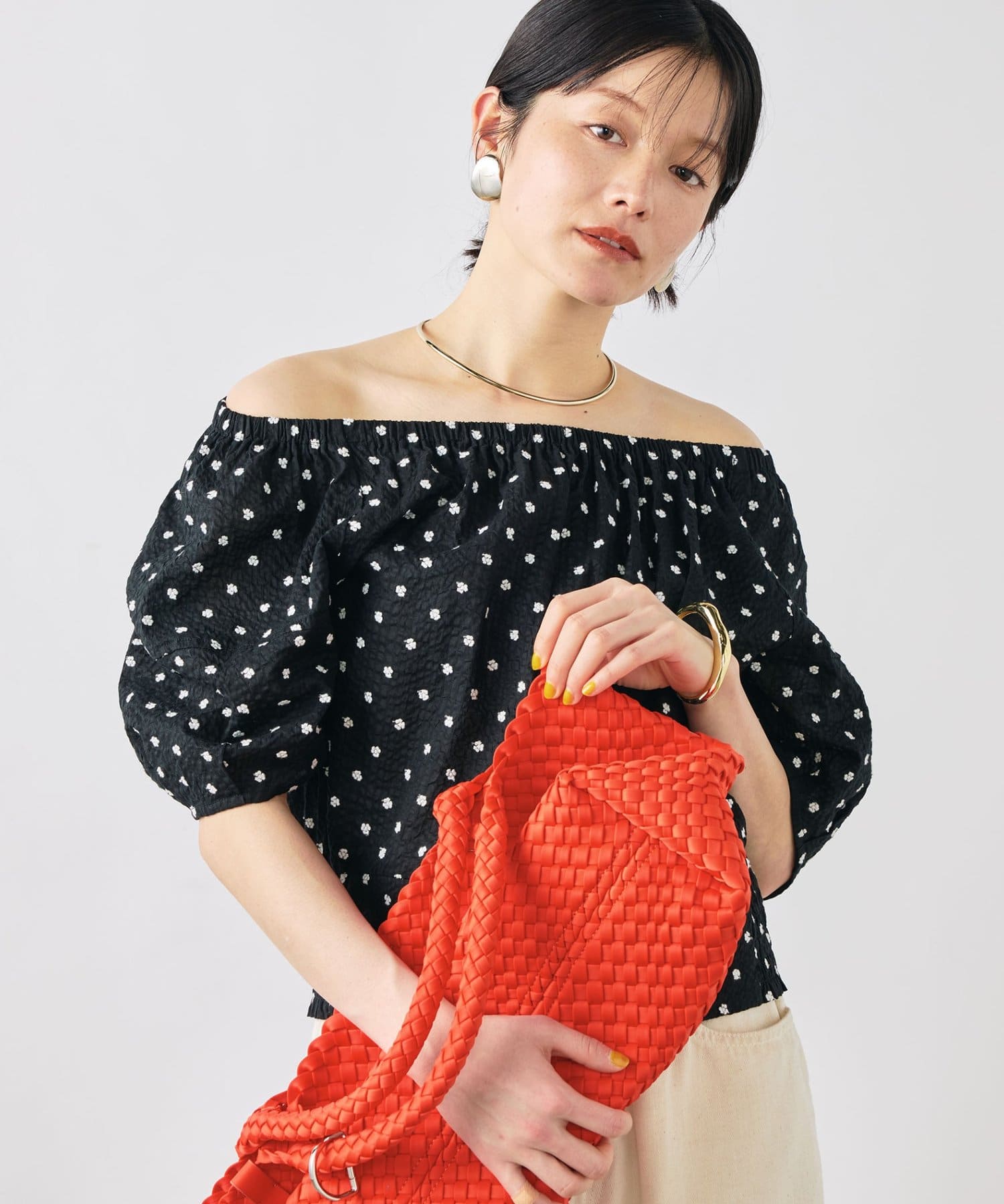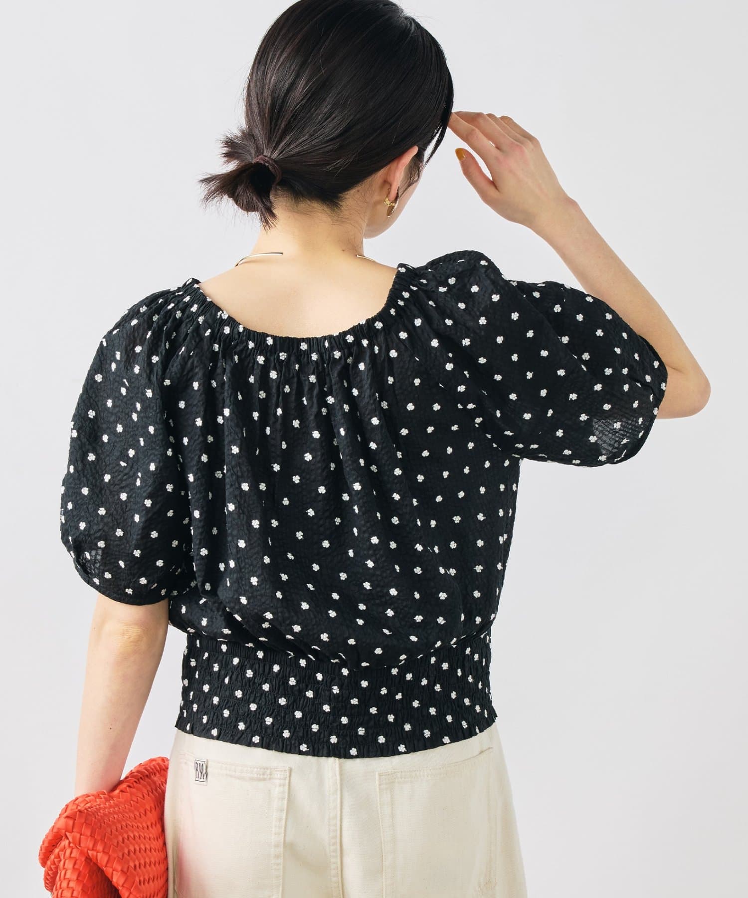 ・首回りはゴムが入っているため、オフショルにしての着用も可能