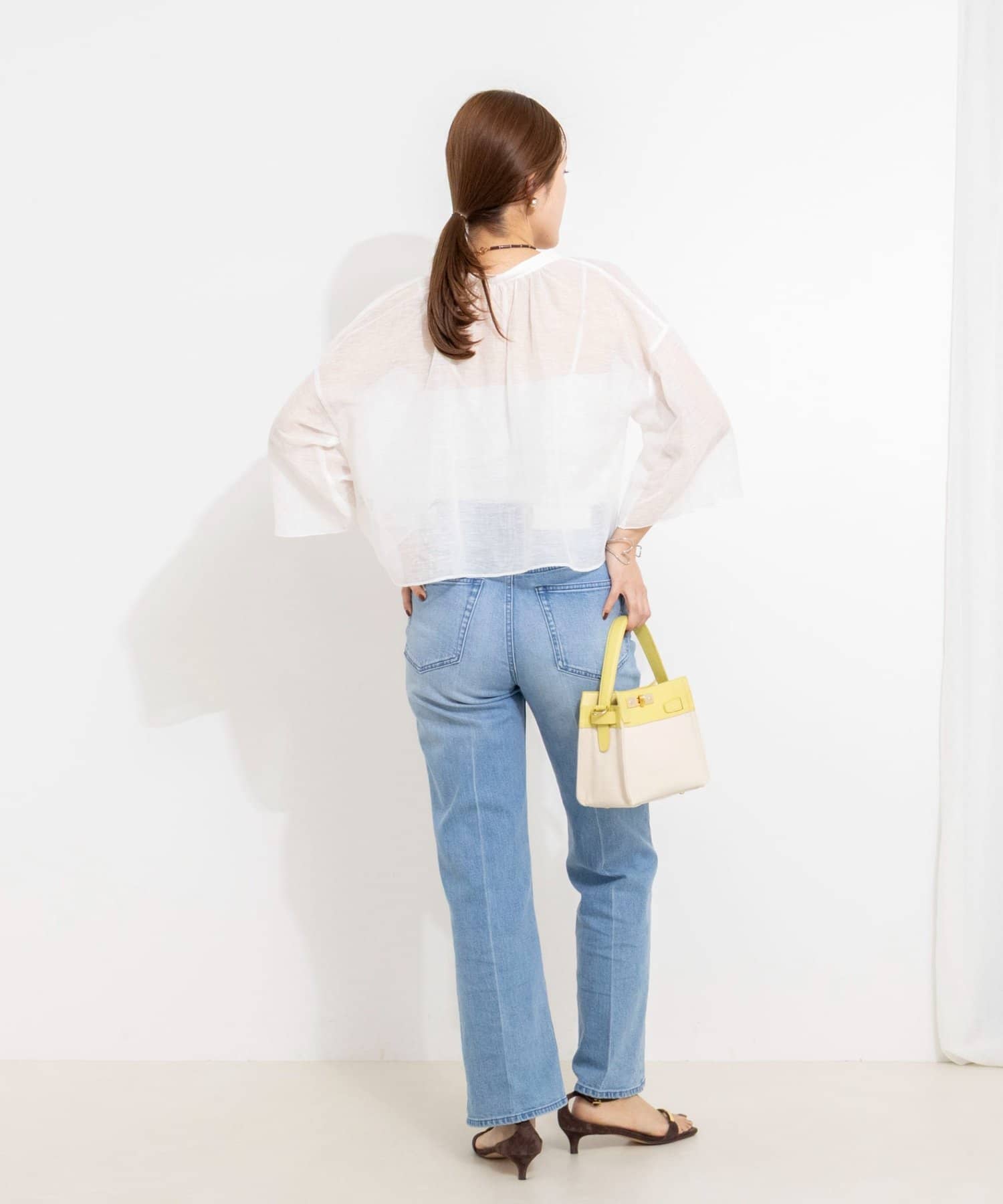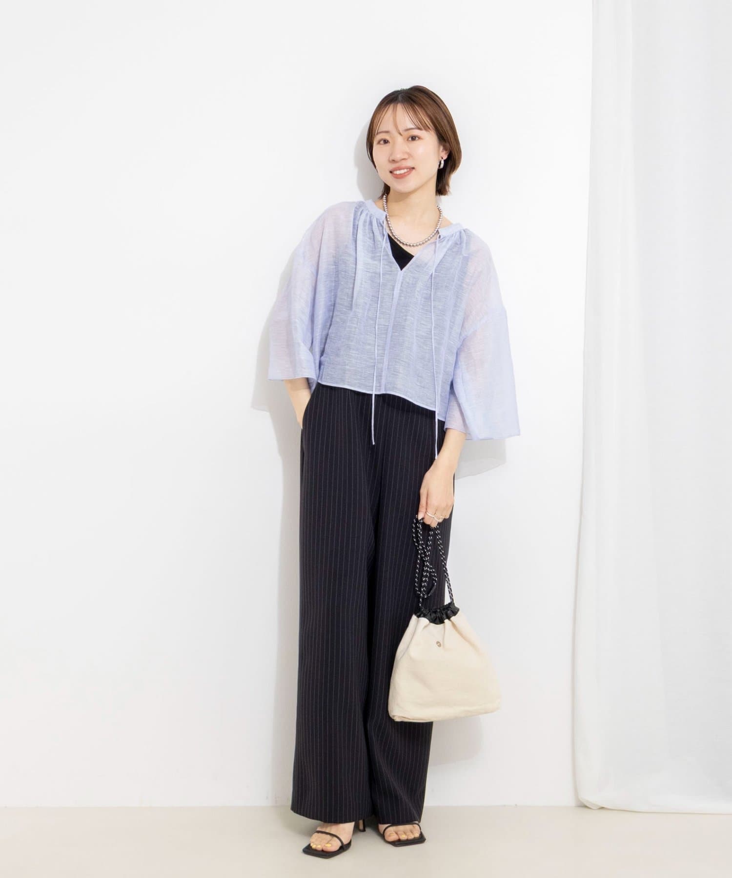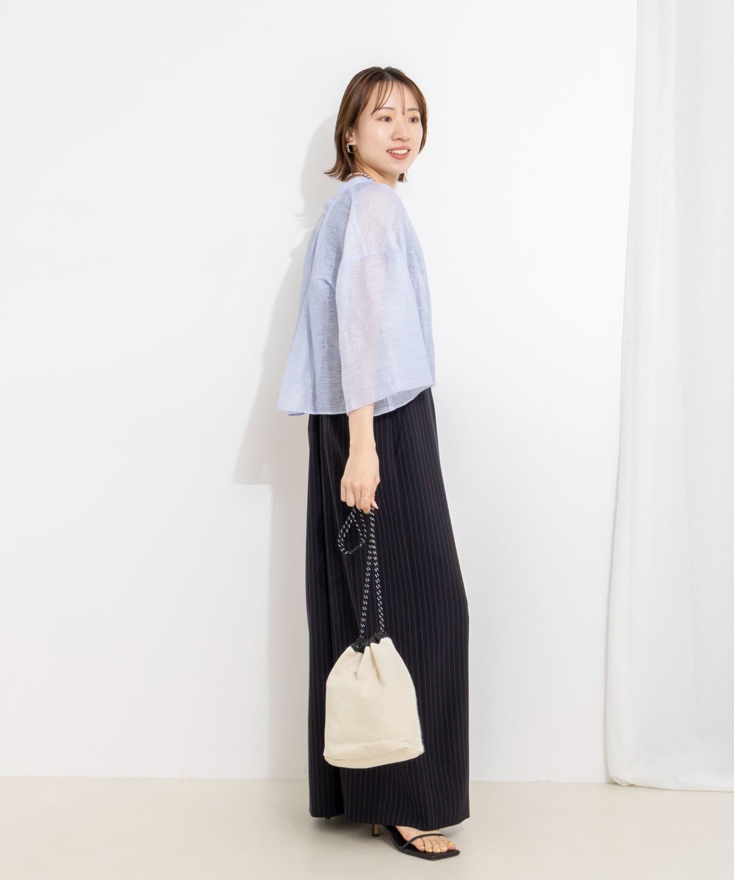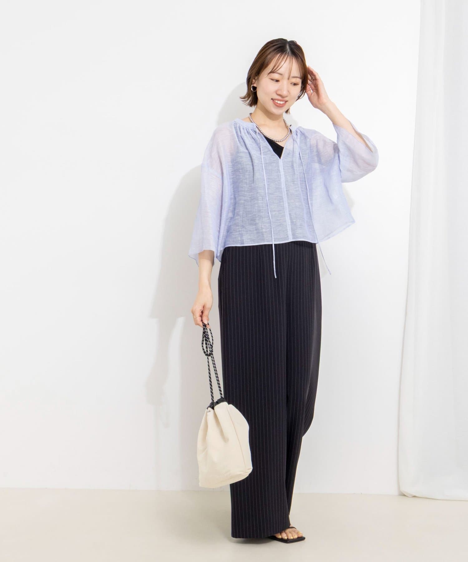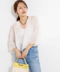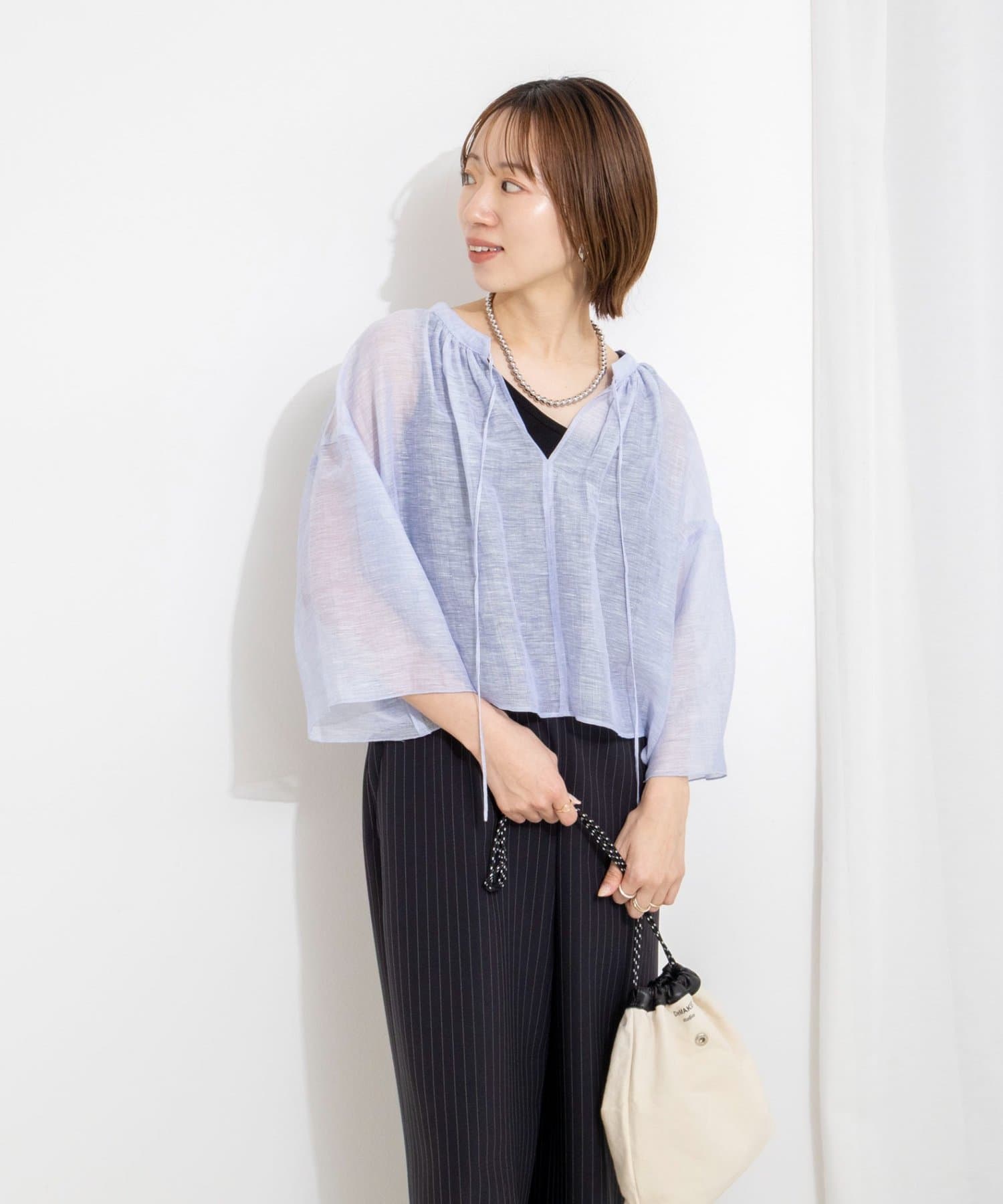 ・リネンポリエステルのシアーカールマイヤー素材を使用したショート丈ブラウス