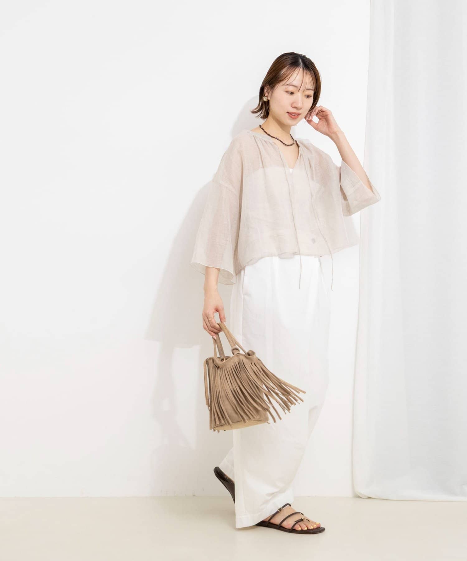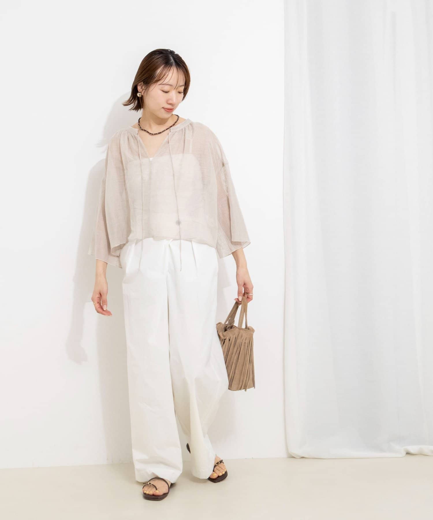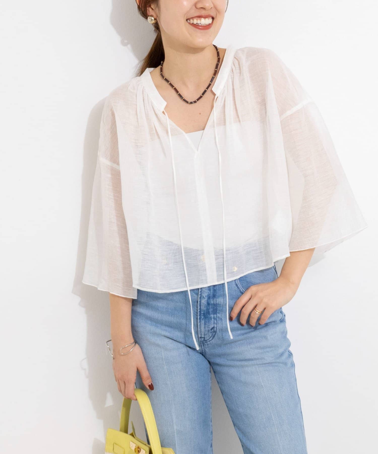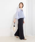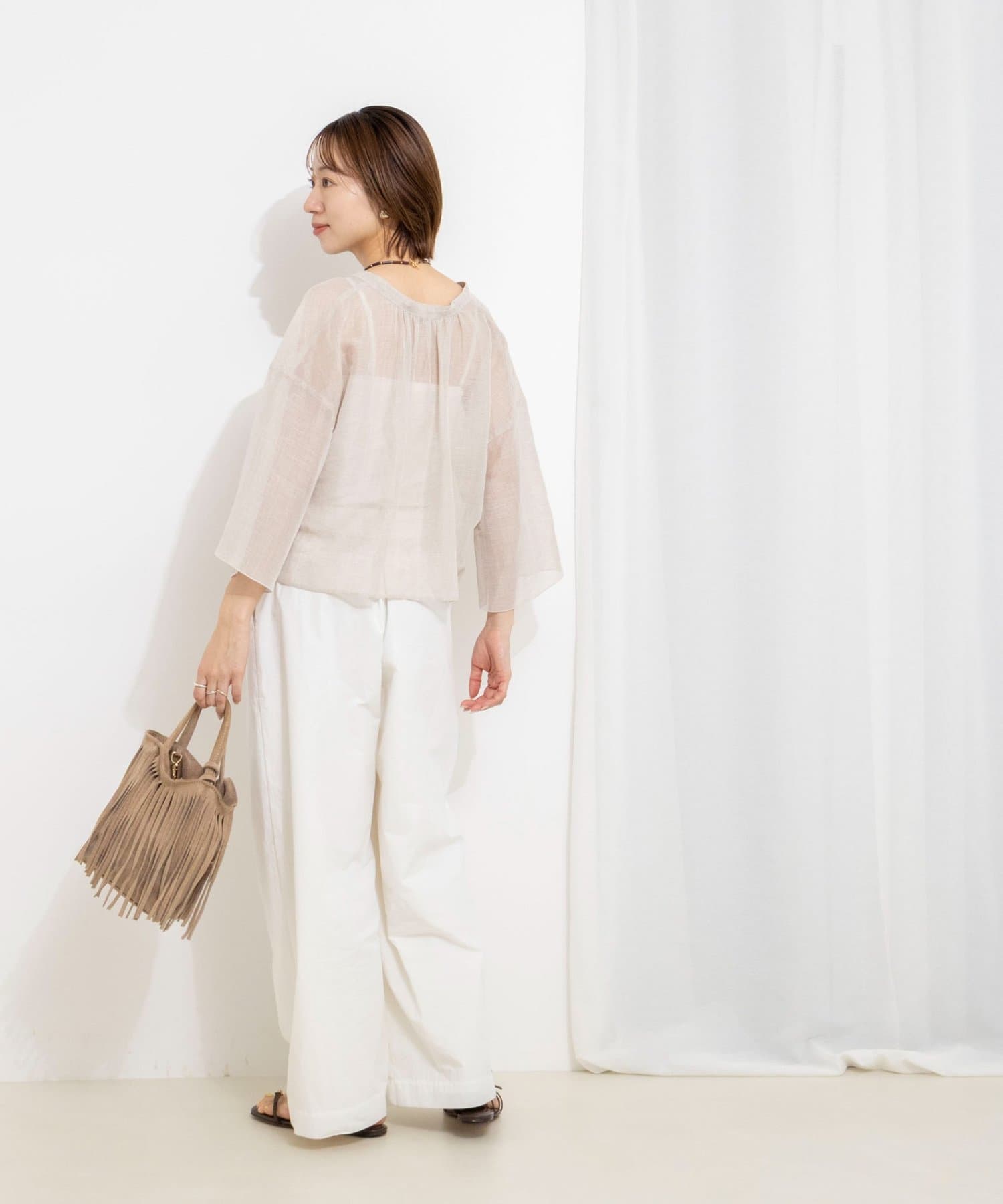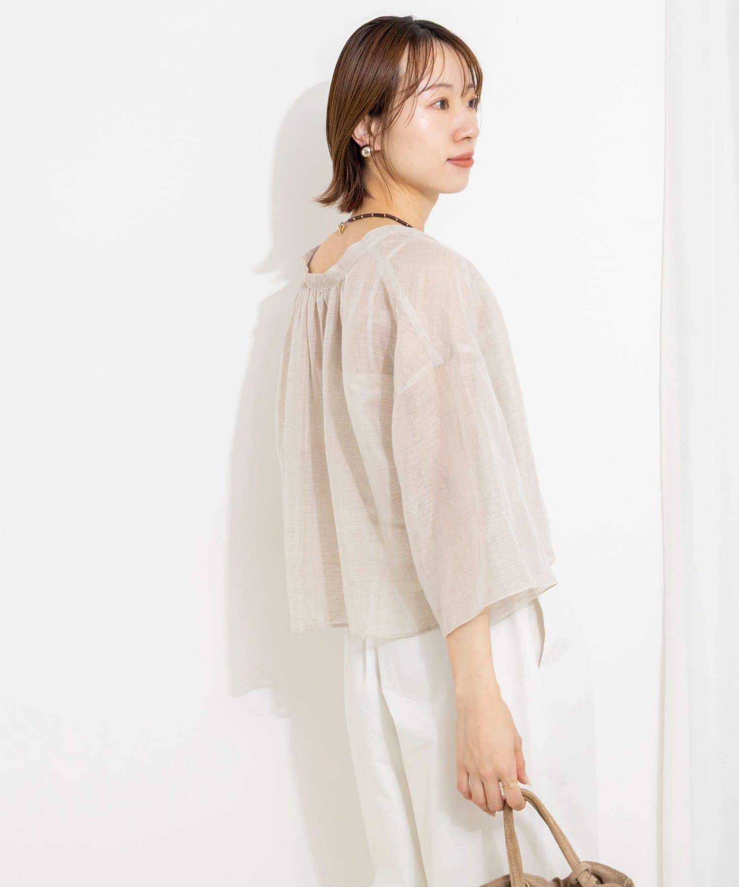 ・襟ぐりに施したギャザーが、素材の透け感と相まって大人っぽく上品な印象に