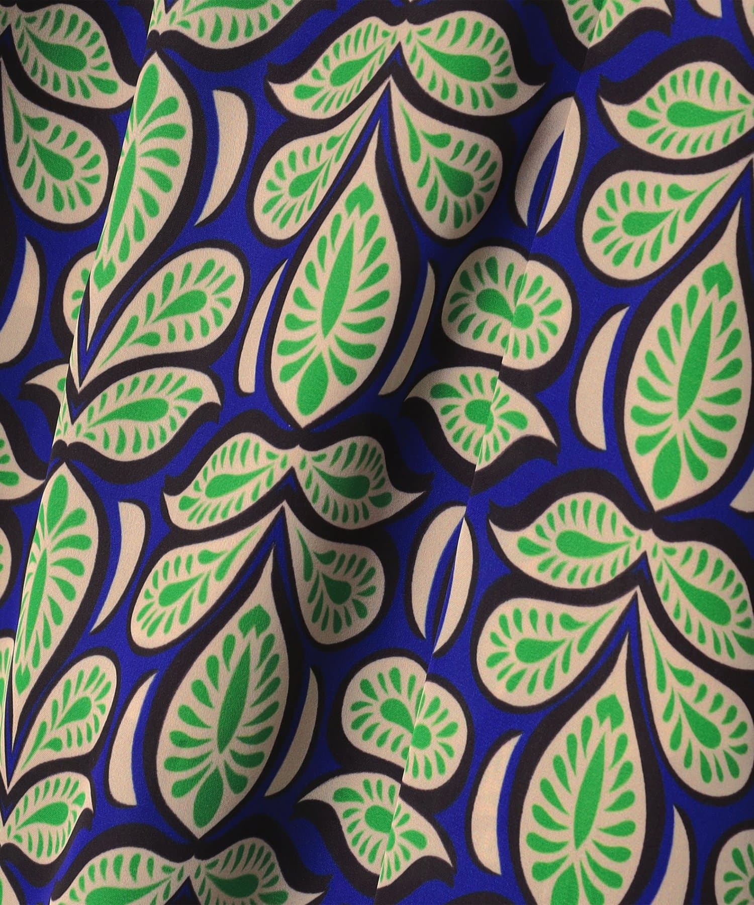 ・バティック調の大胆な柄と、ポリエステルならではのほのかな光沢感が美しい一着