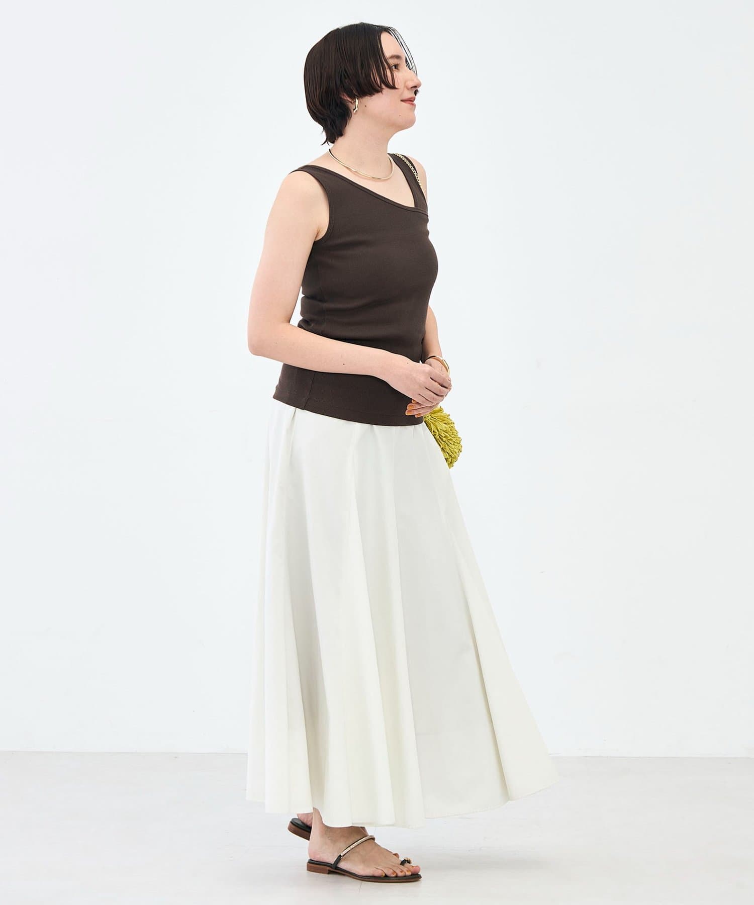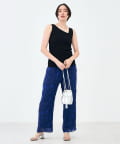 ・アシンメトリーネックは、シャツや羽織りのインナーに合わせるとスタイルに抜け感と新鮮さをプラス
