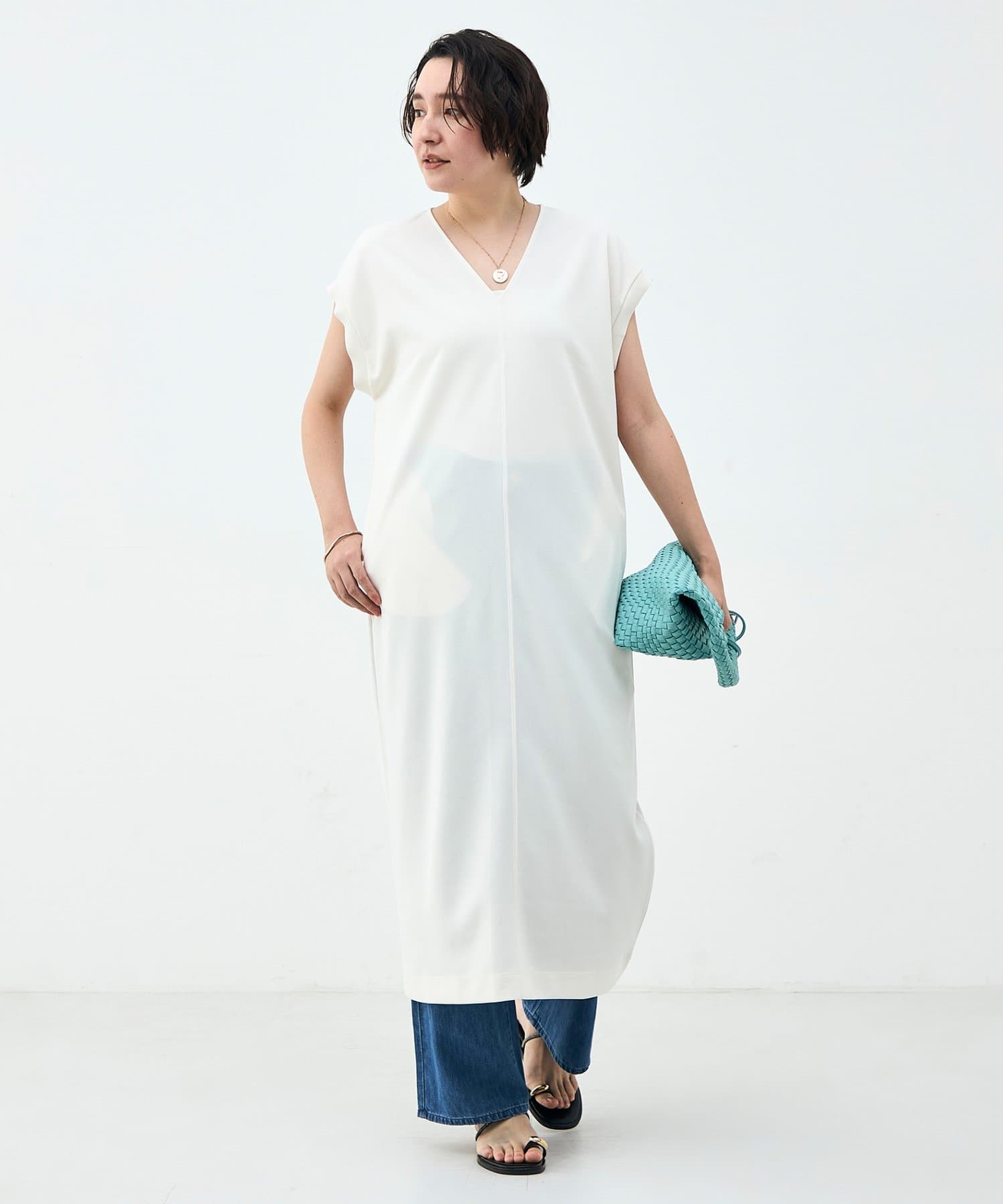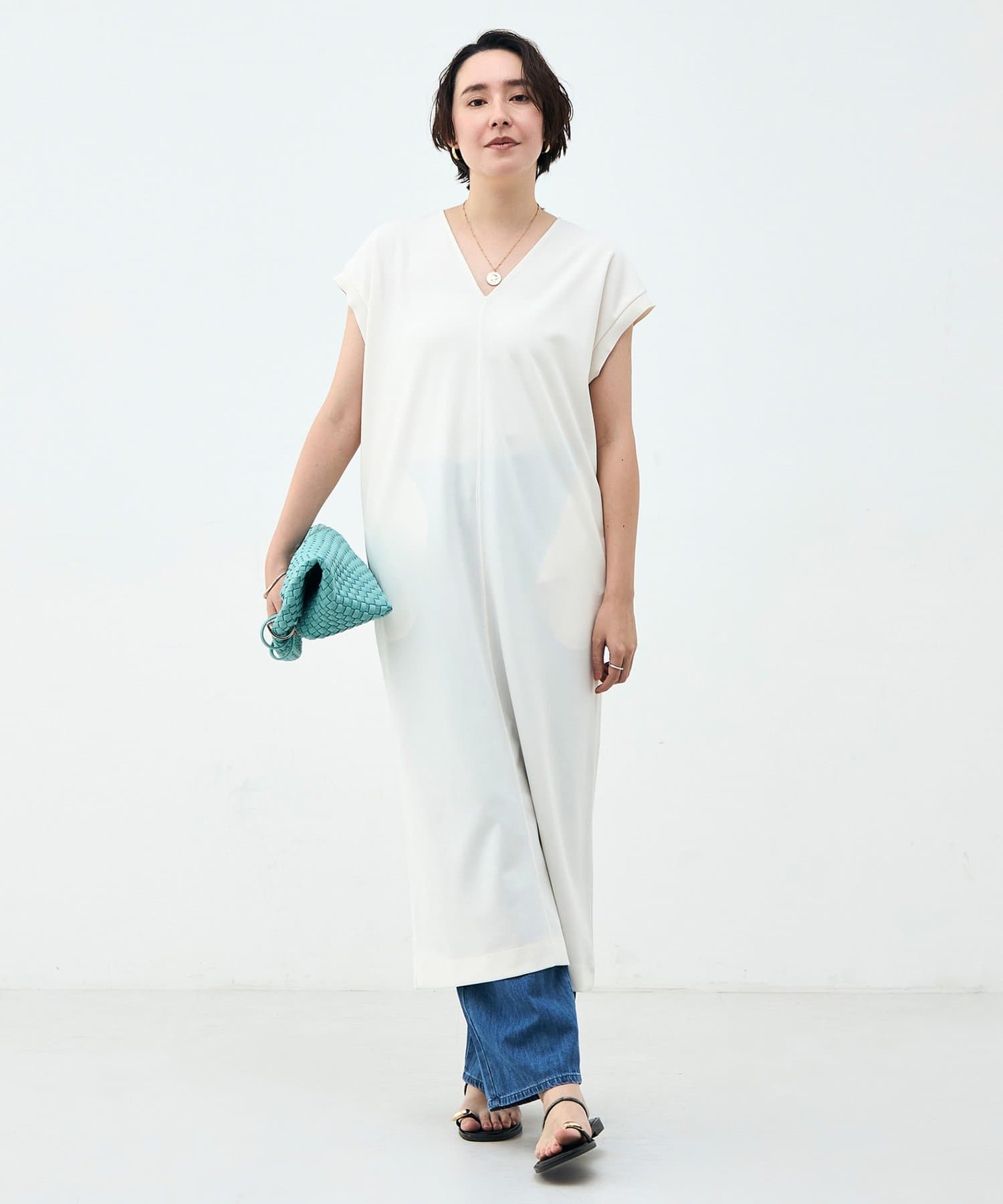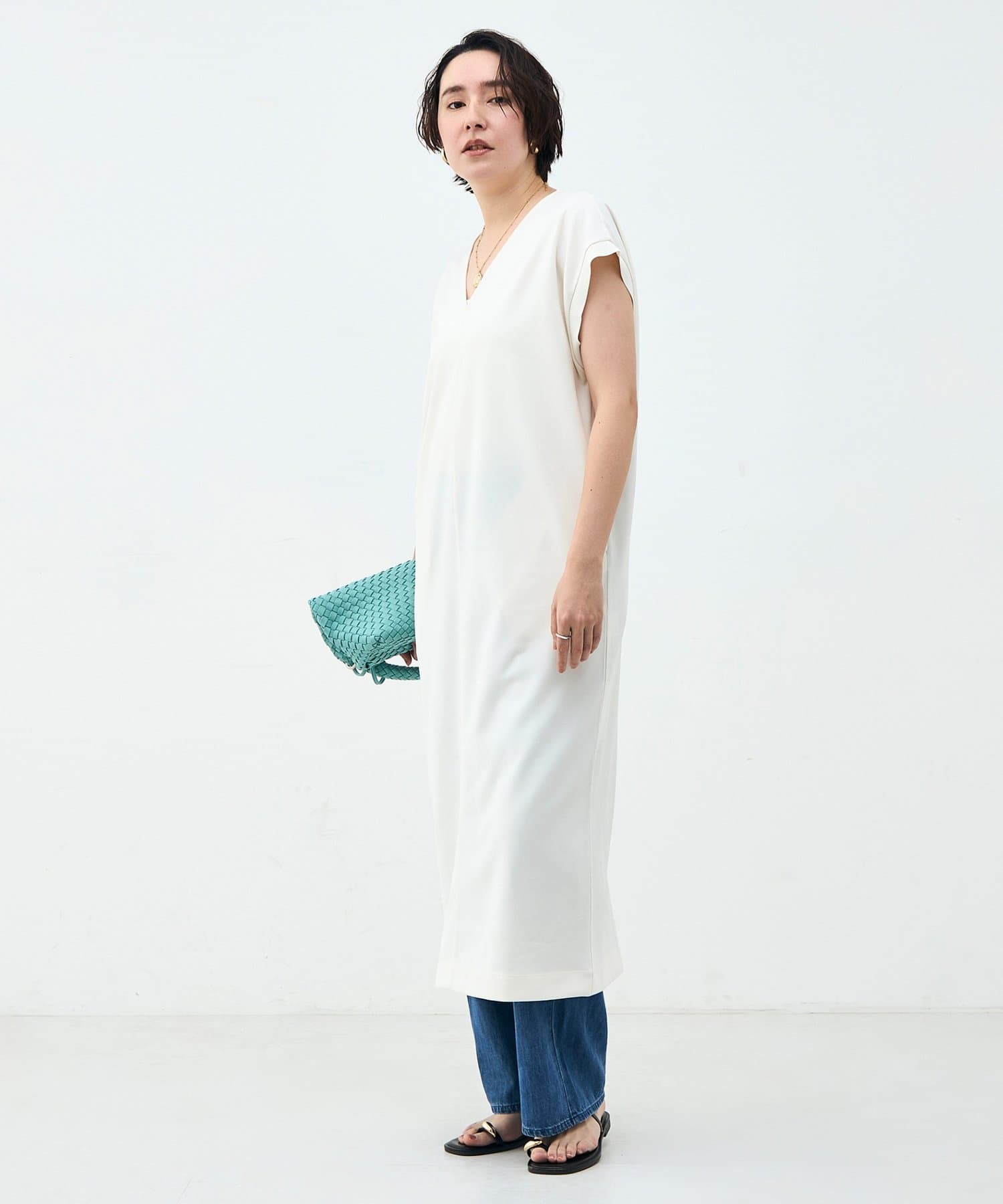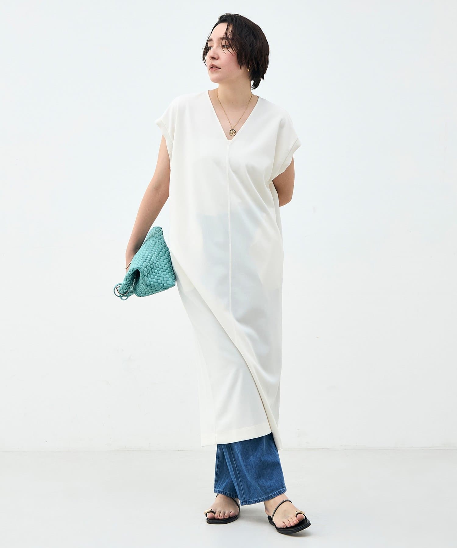 ・デコルテをすっきり見せるVネックデザインで、抜け感のある上品な印象のワンピース