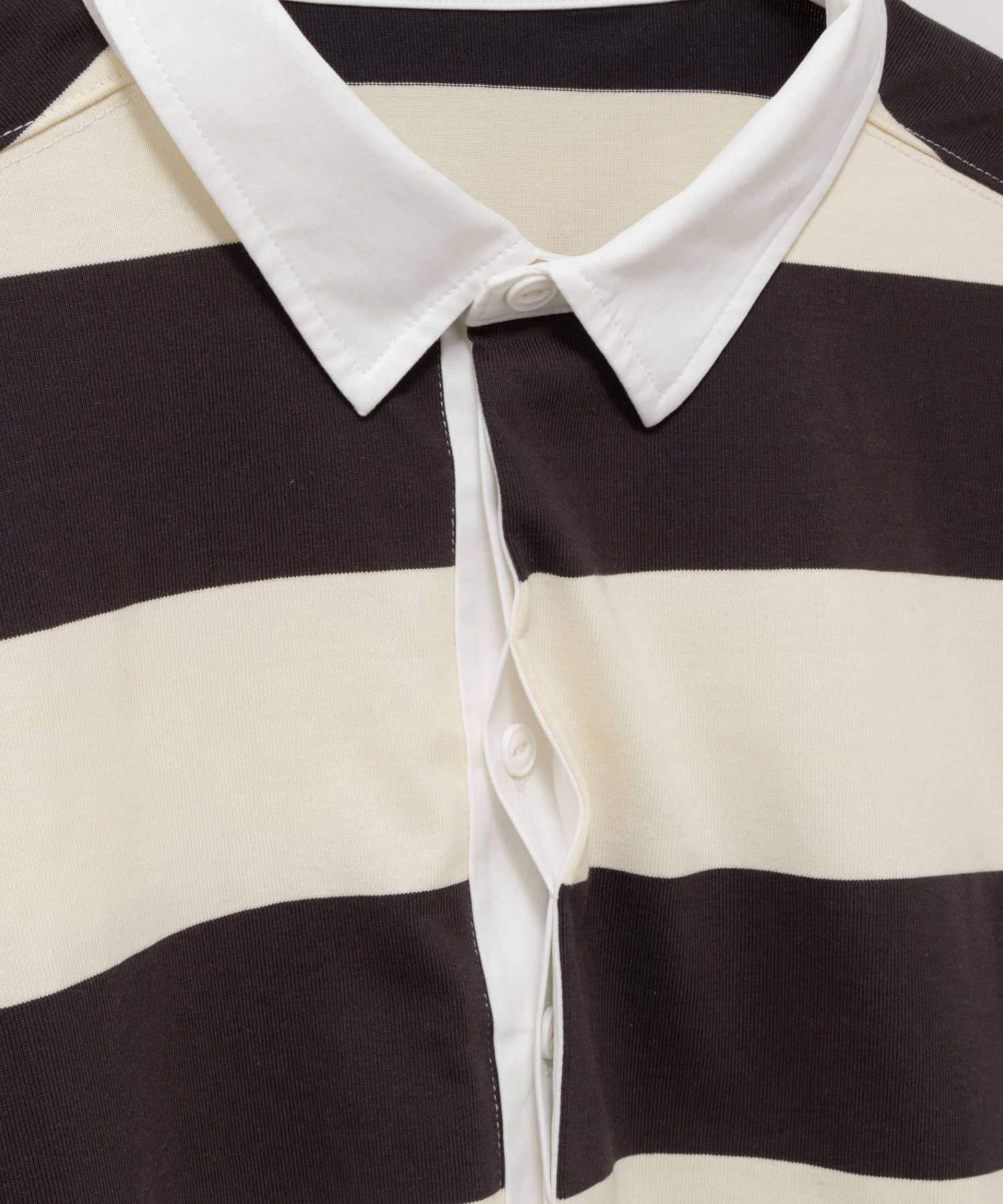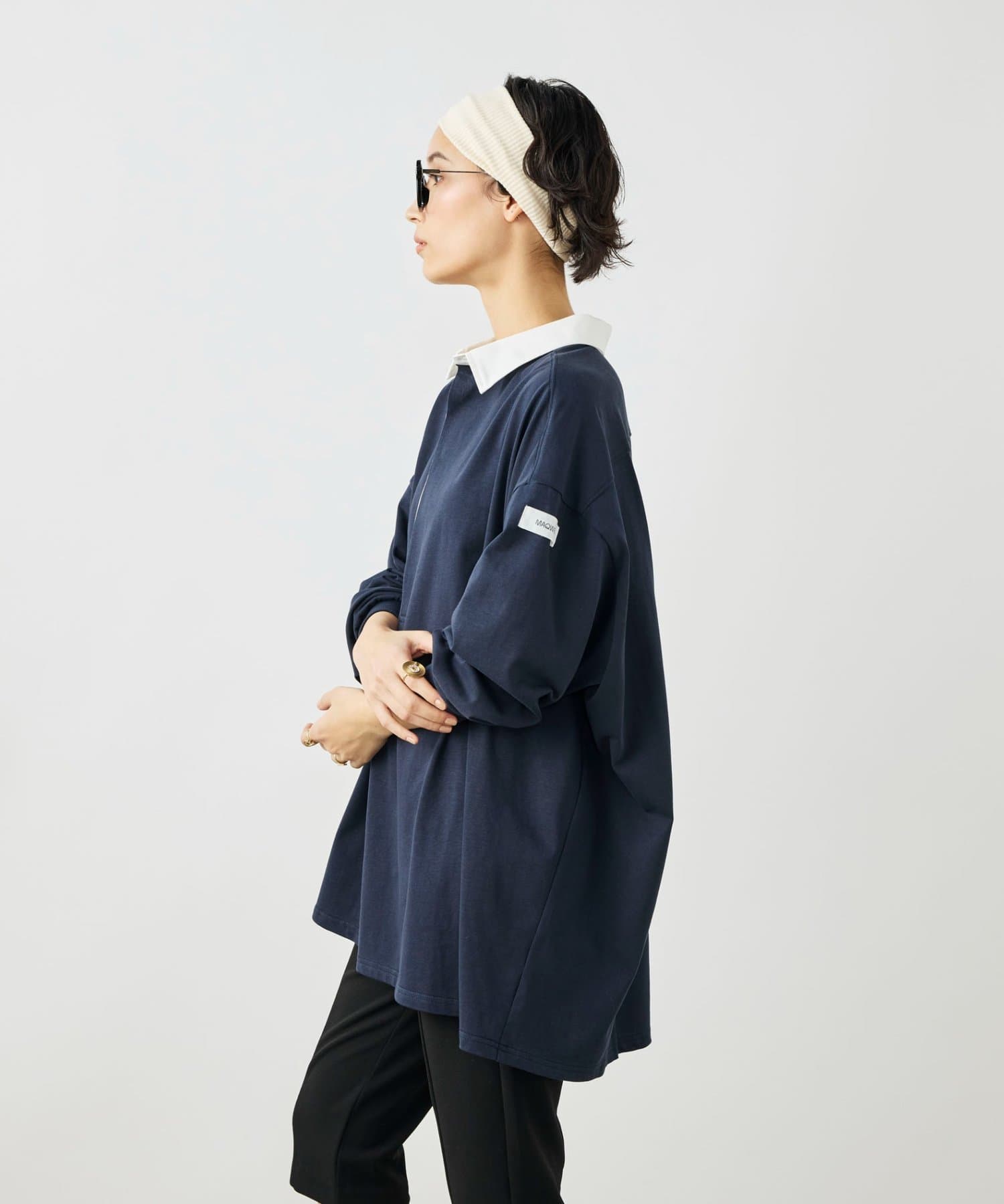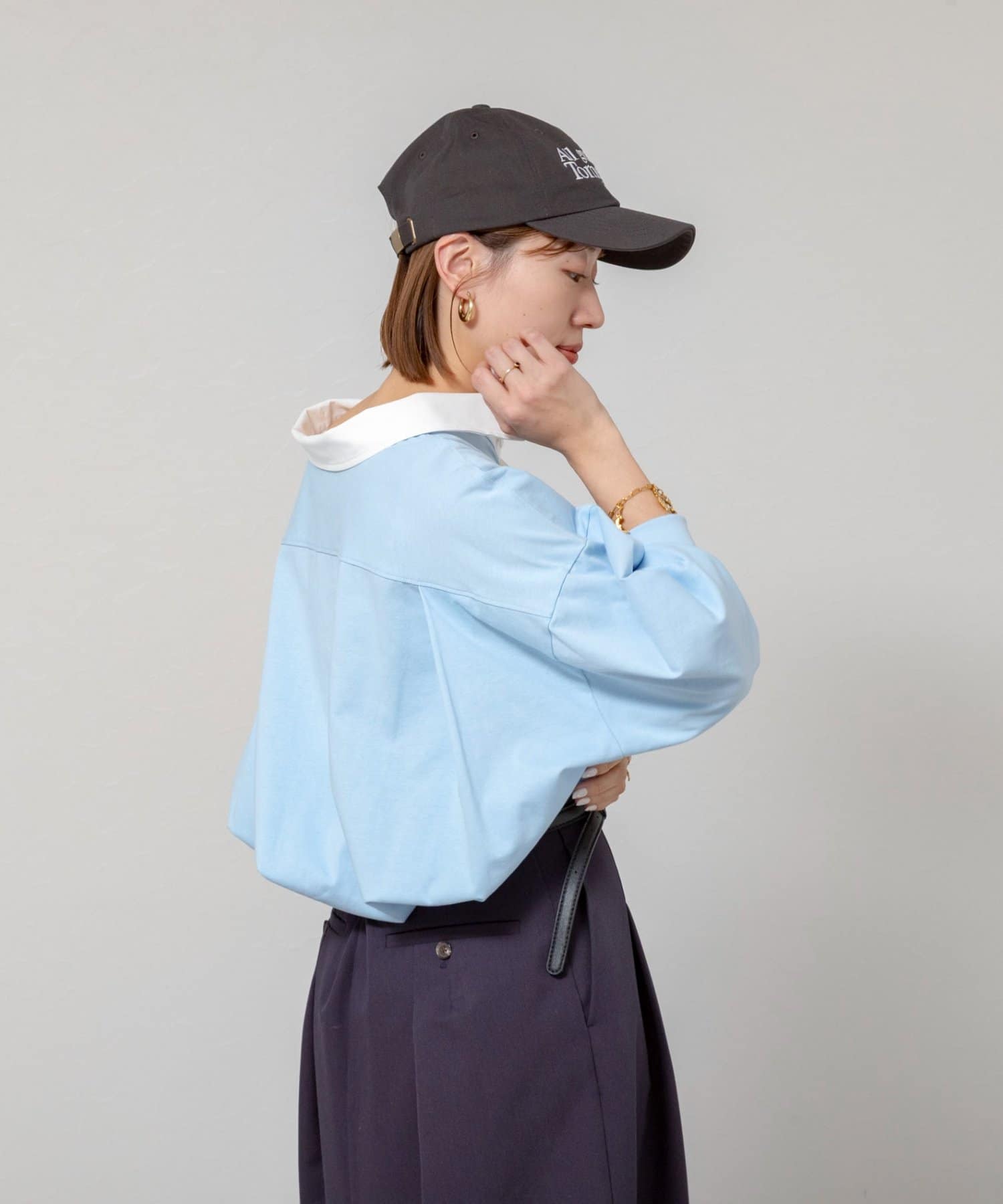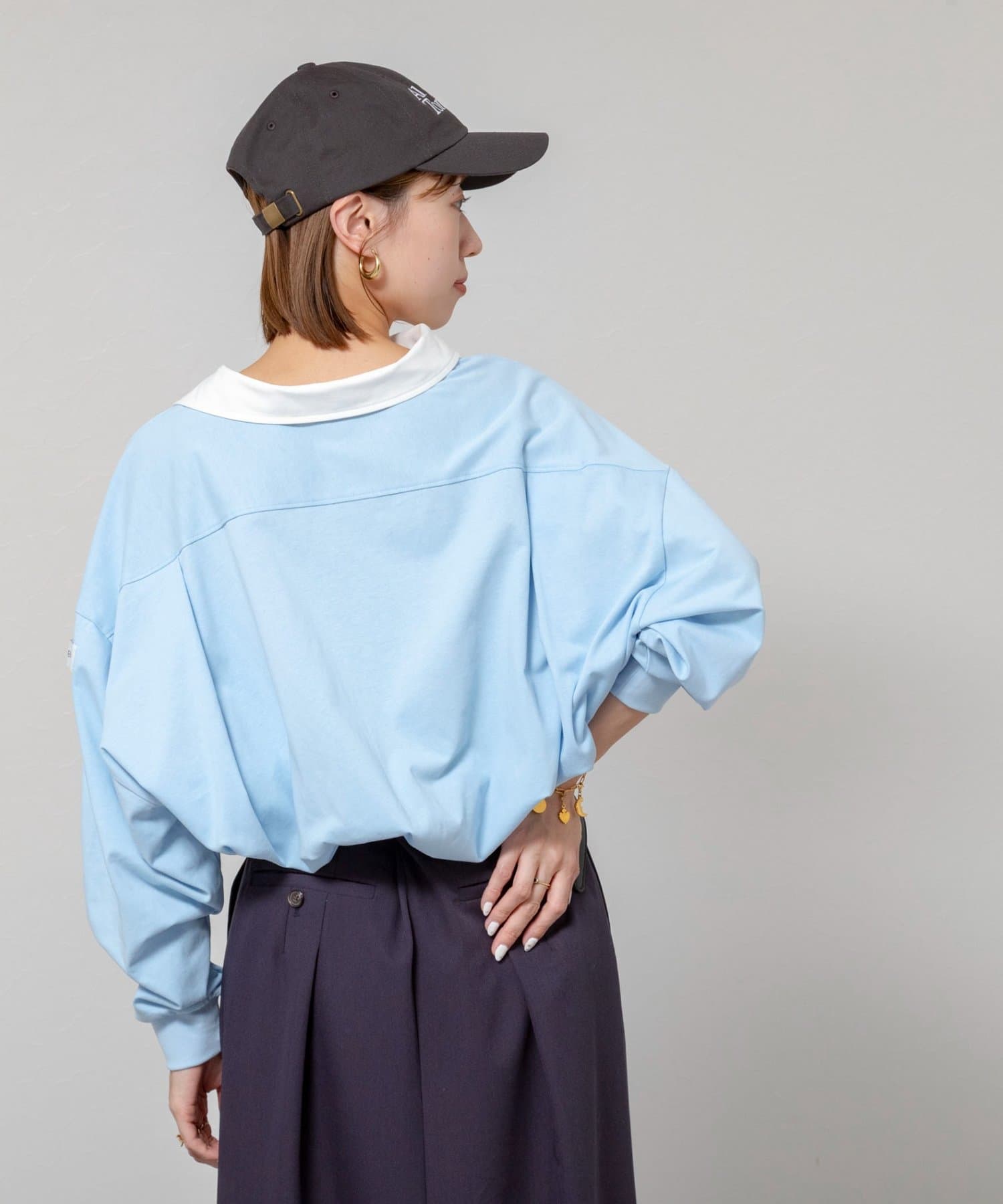 ・襟部分にはシャツ素材を使用し、カジュアルすぎず、きれいめな印象に