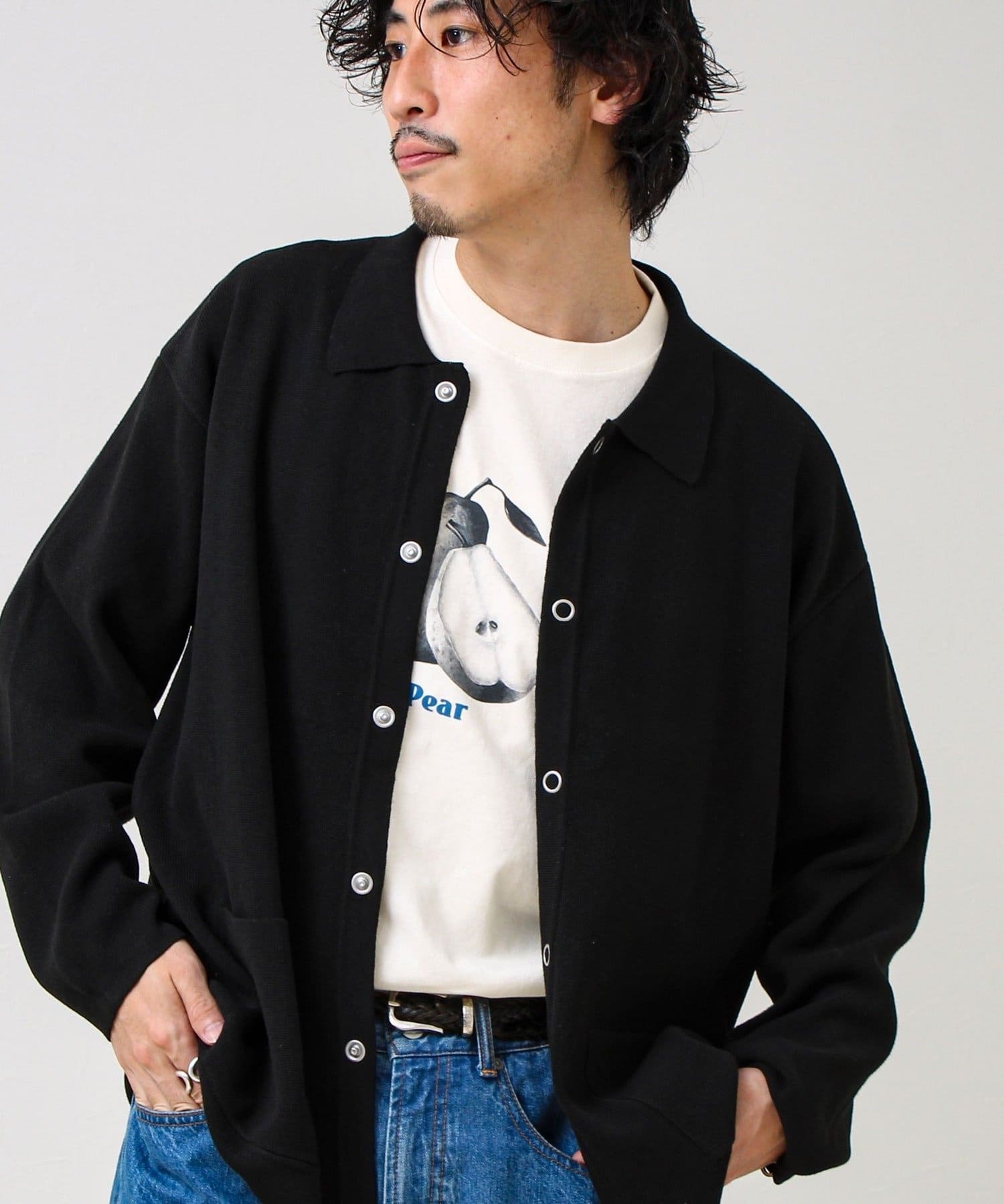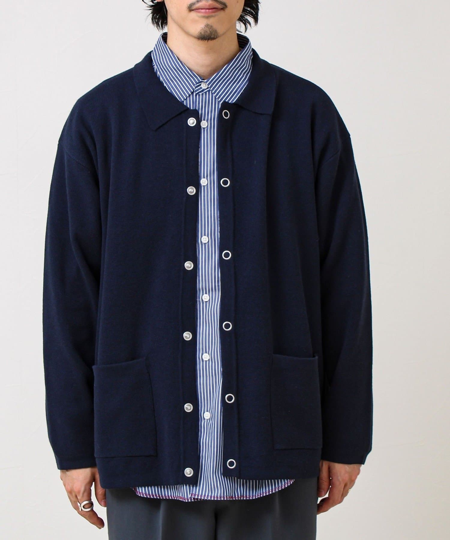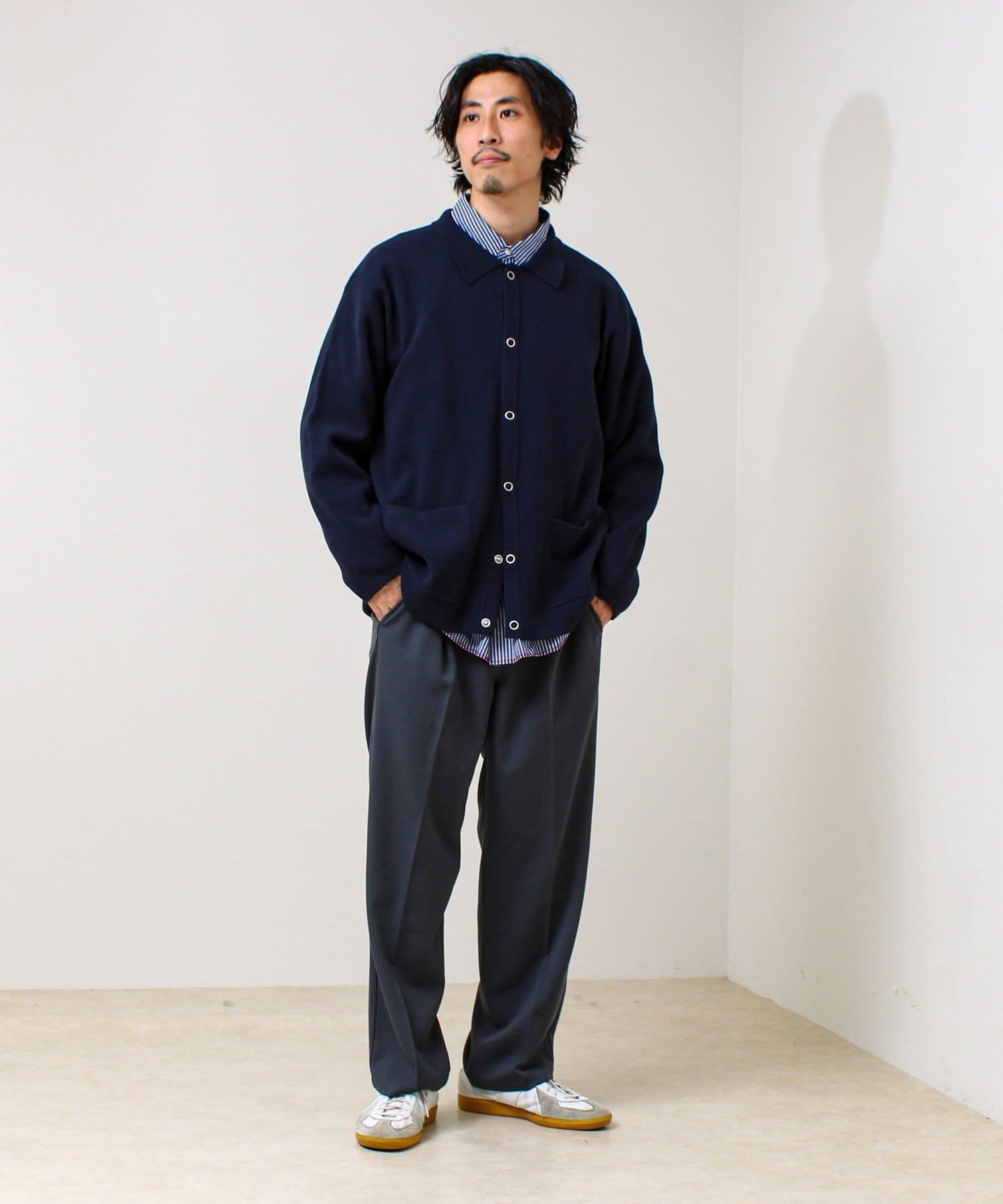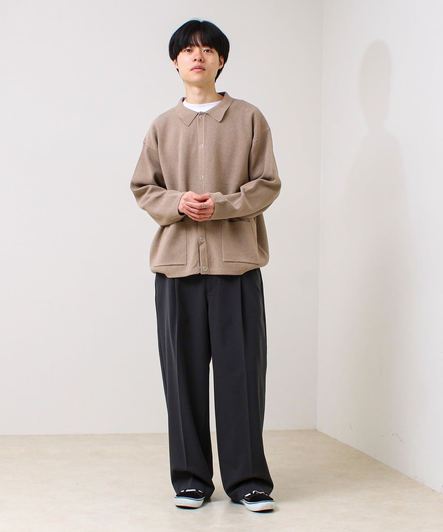・きれいめ寄りで:シャツ+スラックスに合わせて、ニットジャケット感覚で