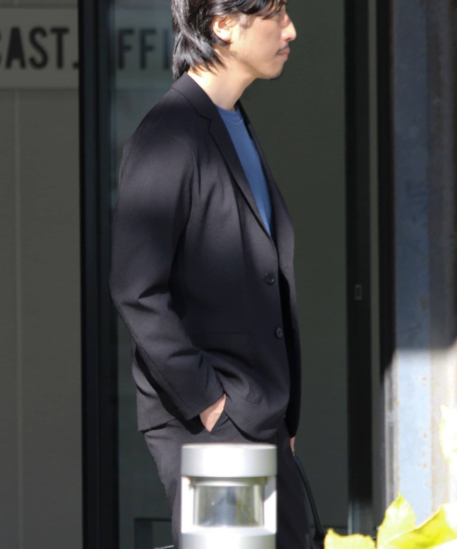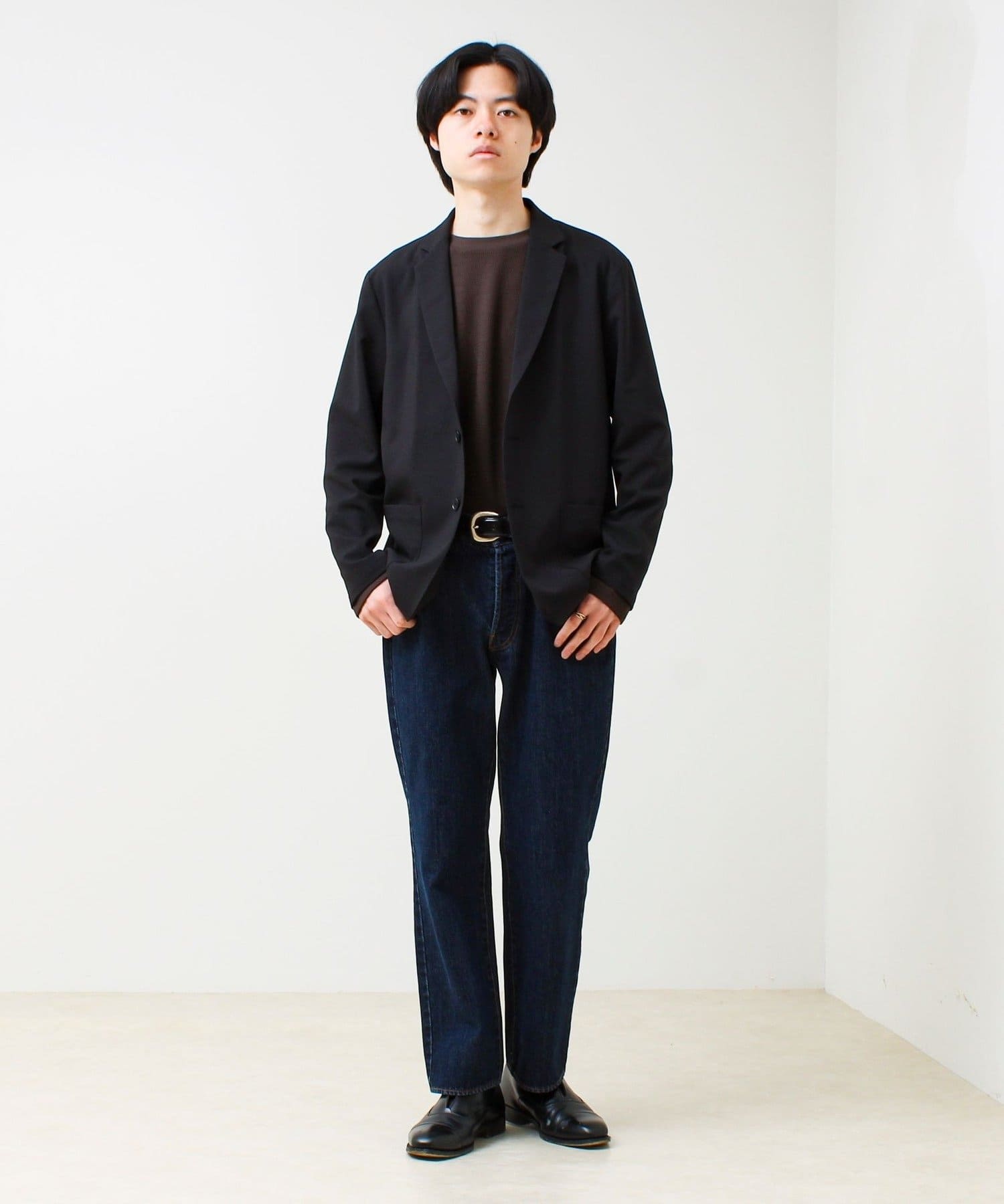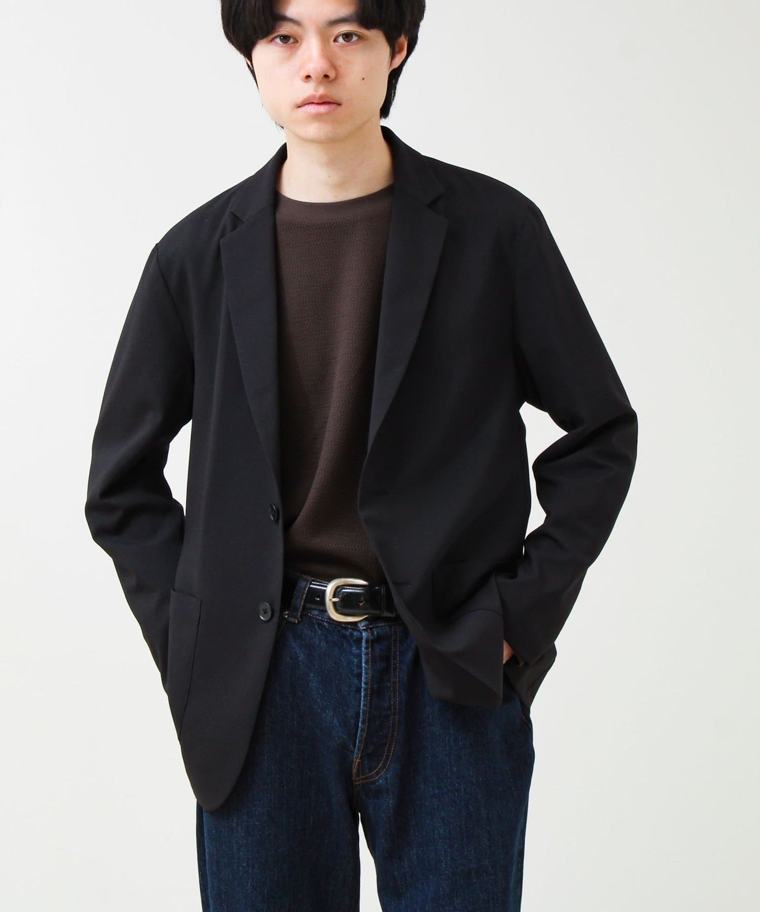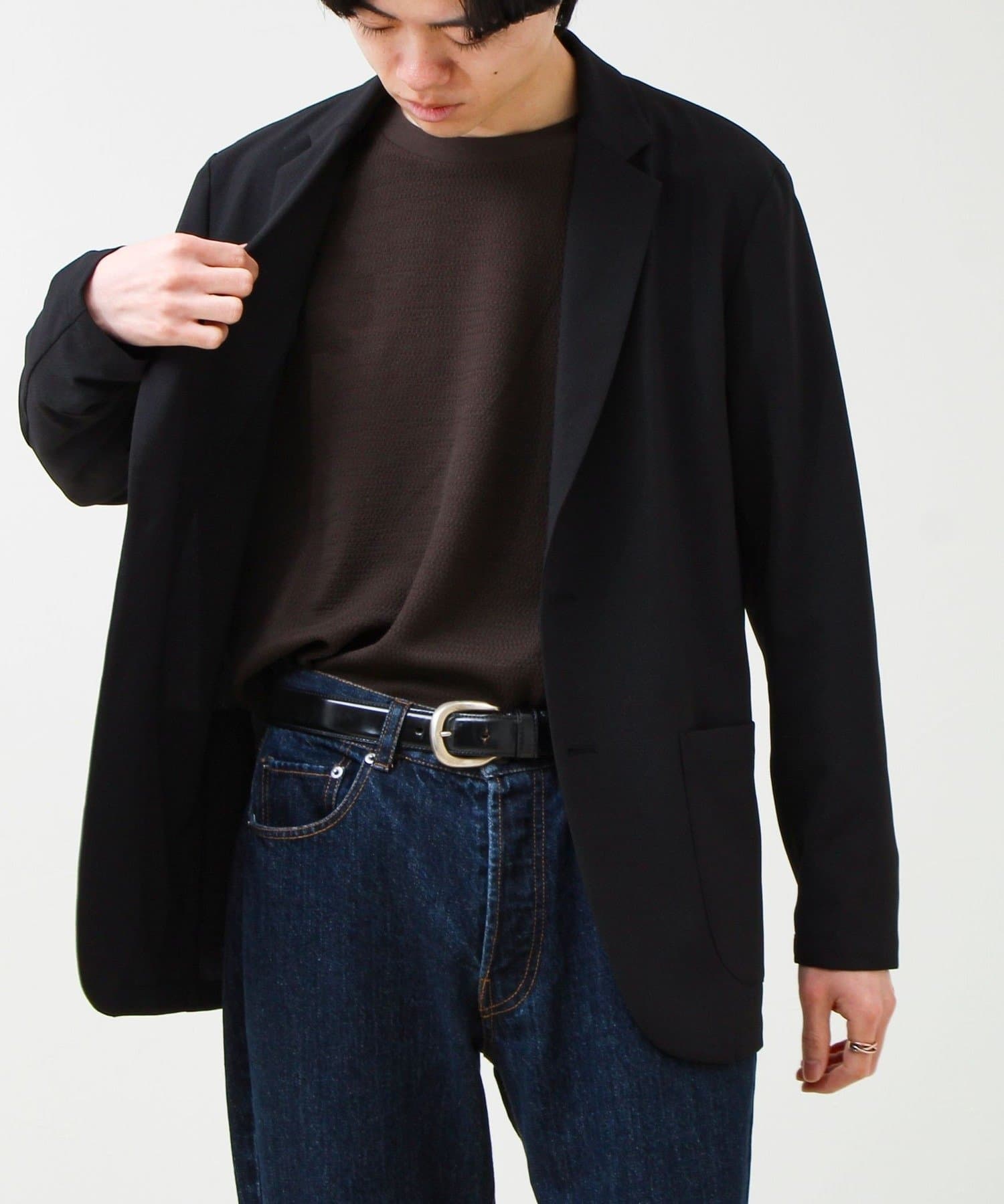 デニム+無地Tにさらっと羽織るだけで一気に“ちゃんとして見える”スタイルに。黒インナー合わせで都会的に。