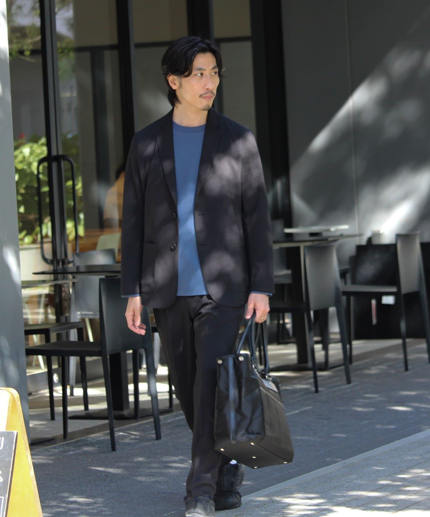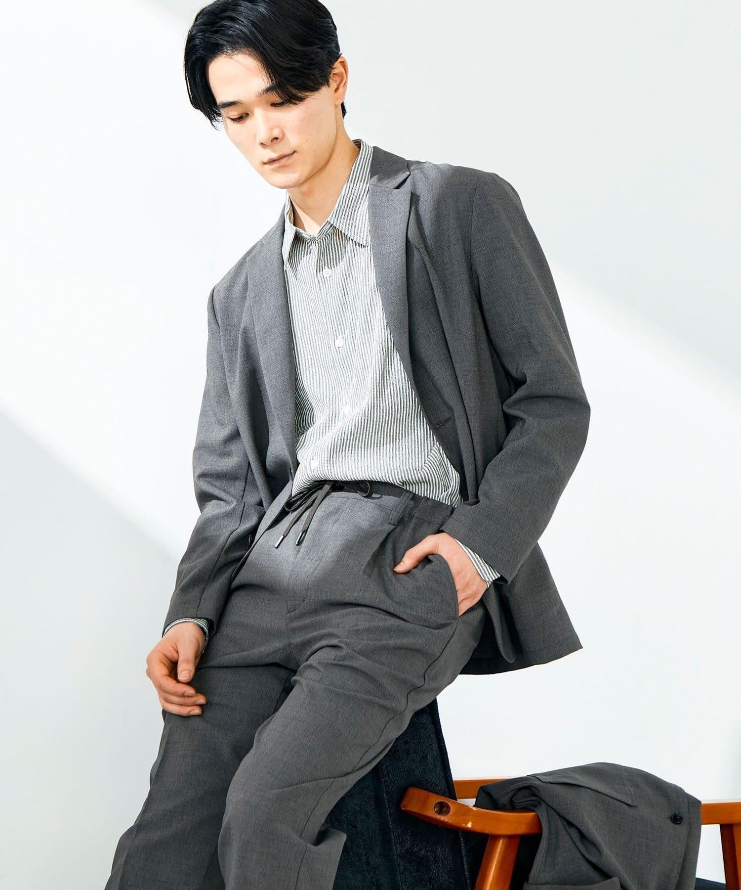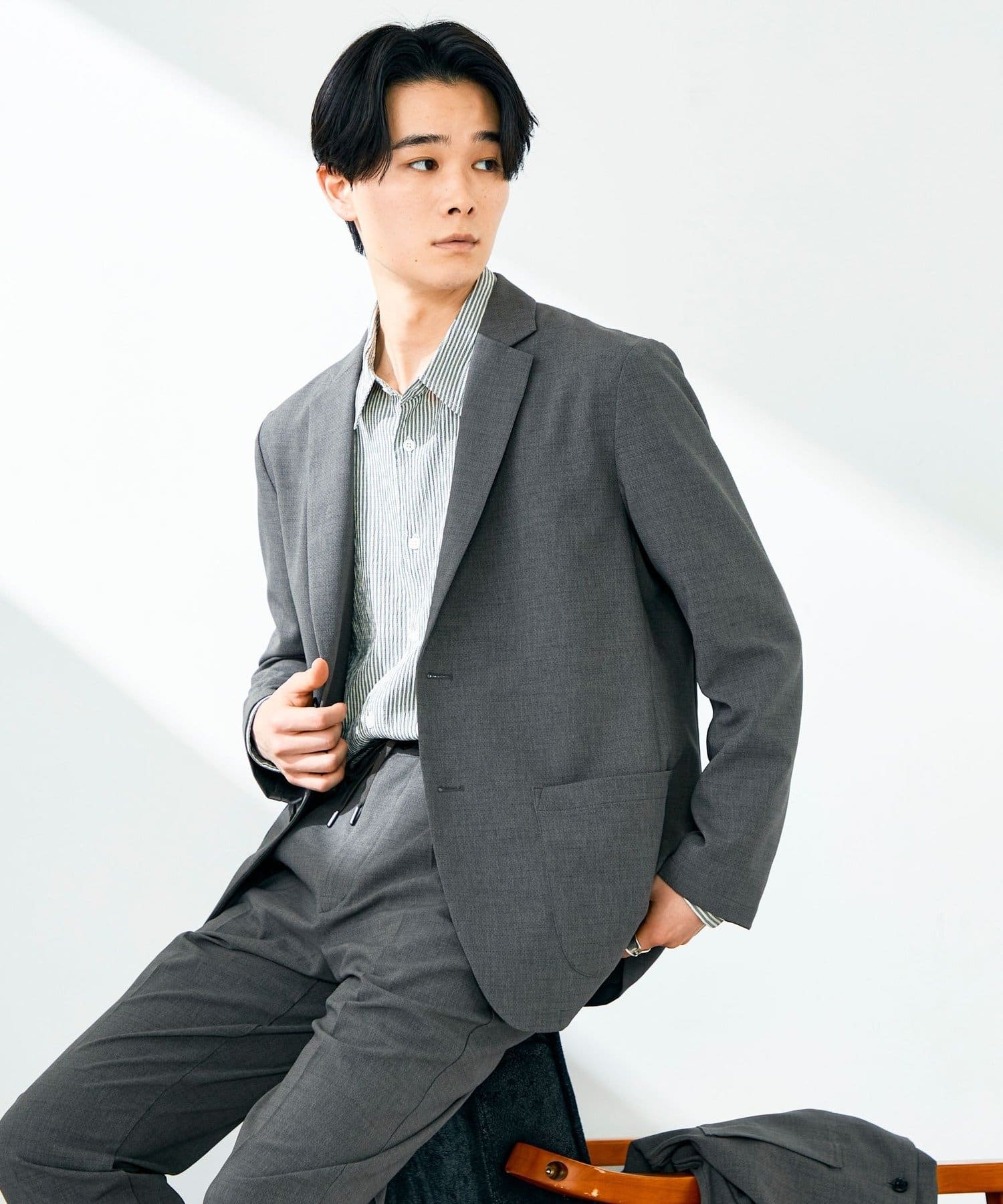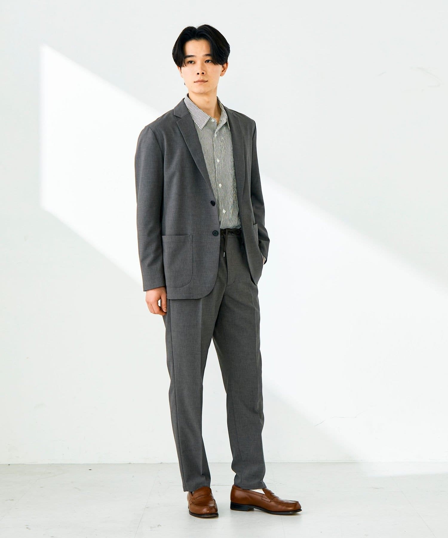 ストライプや無地シャツをインナーにして、足元はレザーシューズ。軽さのある素材感で春夏のジャケットスタイルが重くならない。