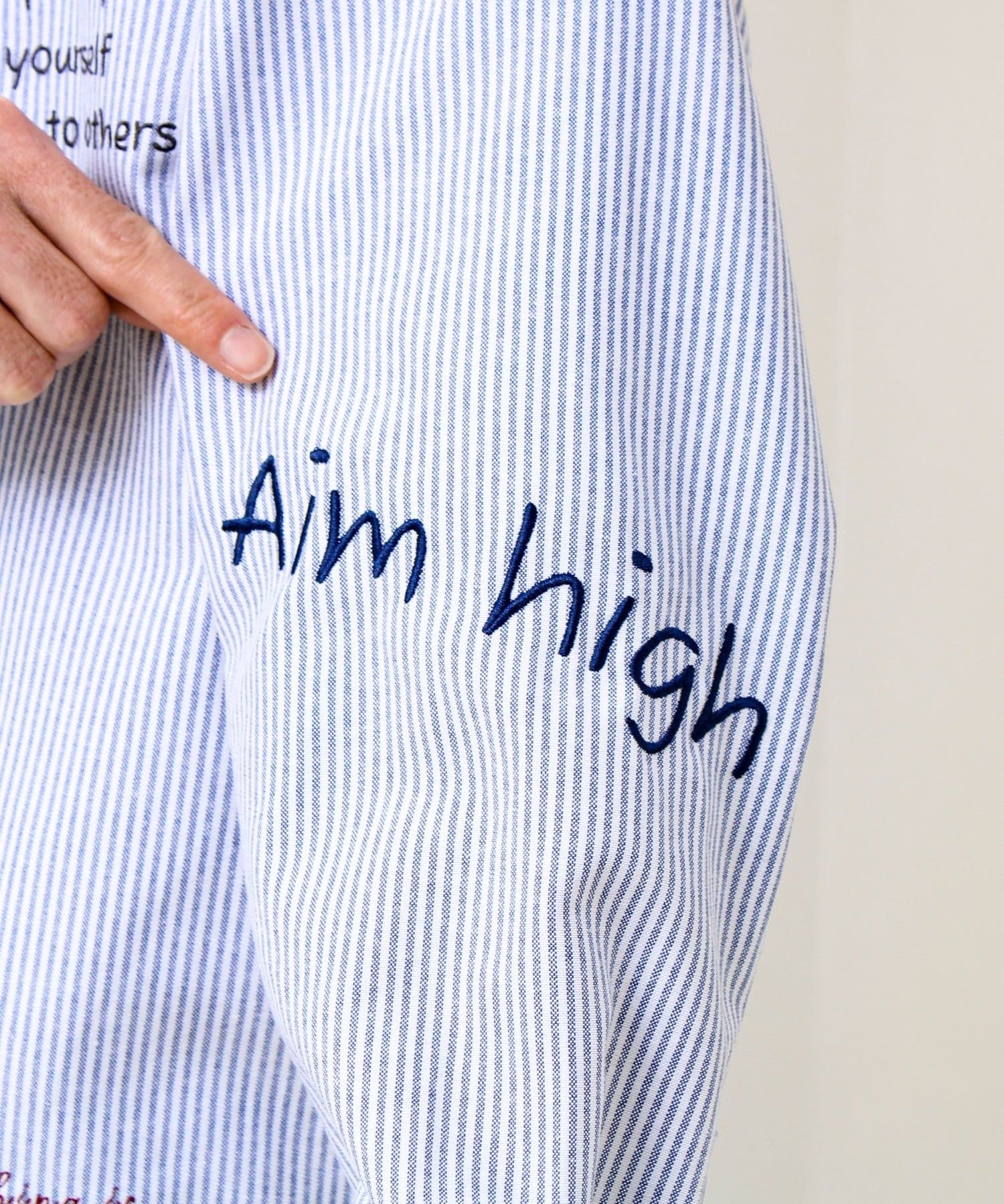・爽やかなオックスフォード生地に、前後左右へバランスよく配置した刺繍メッセージがポイント。