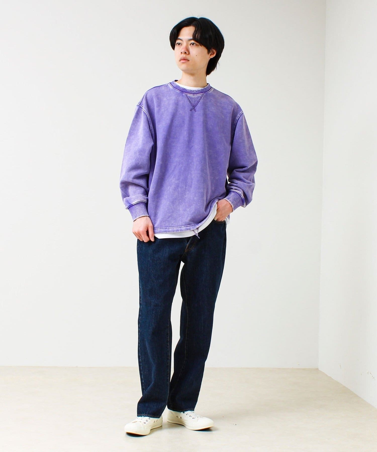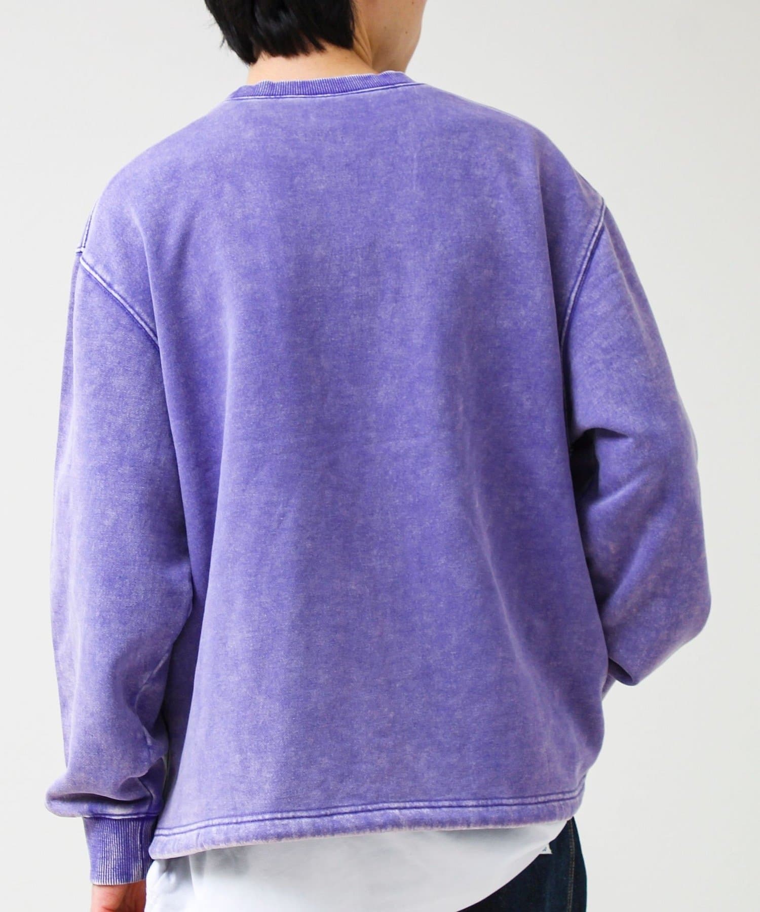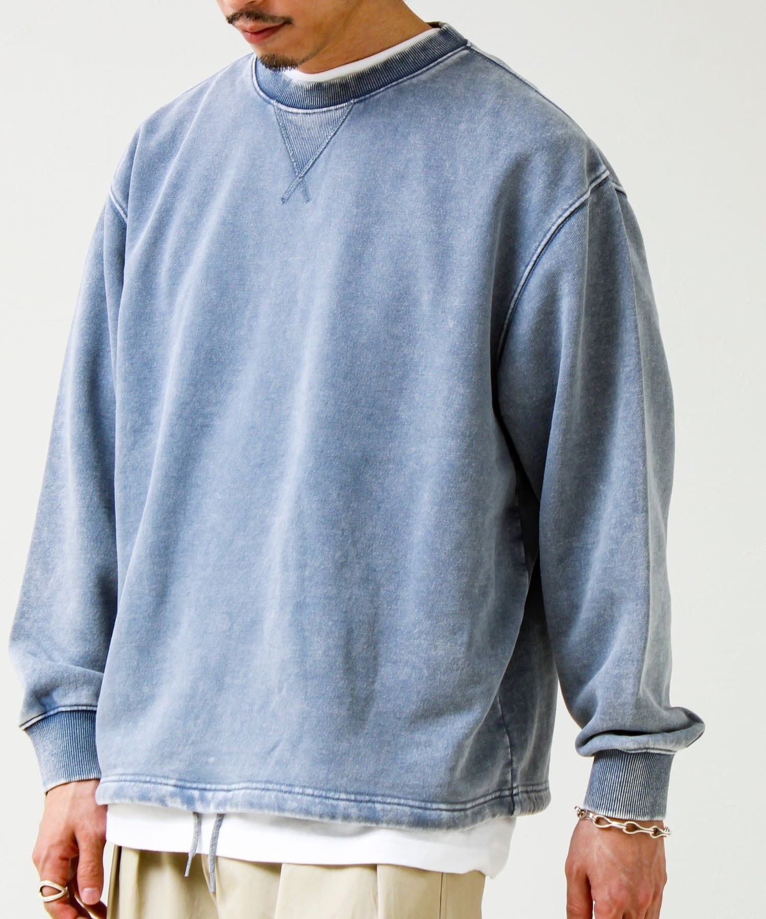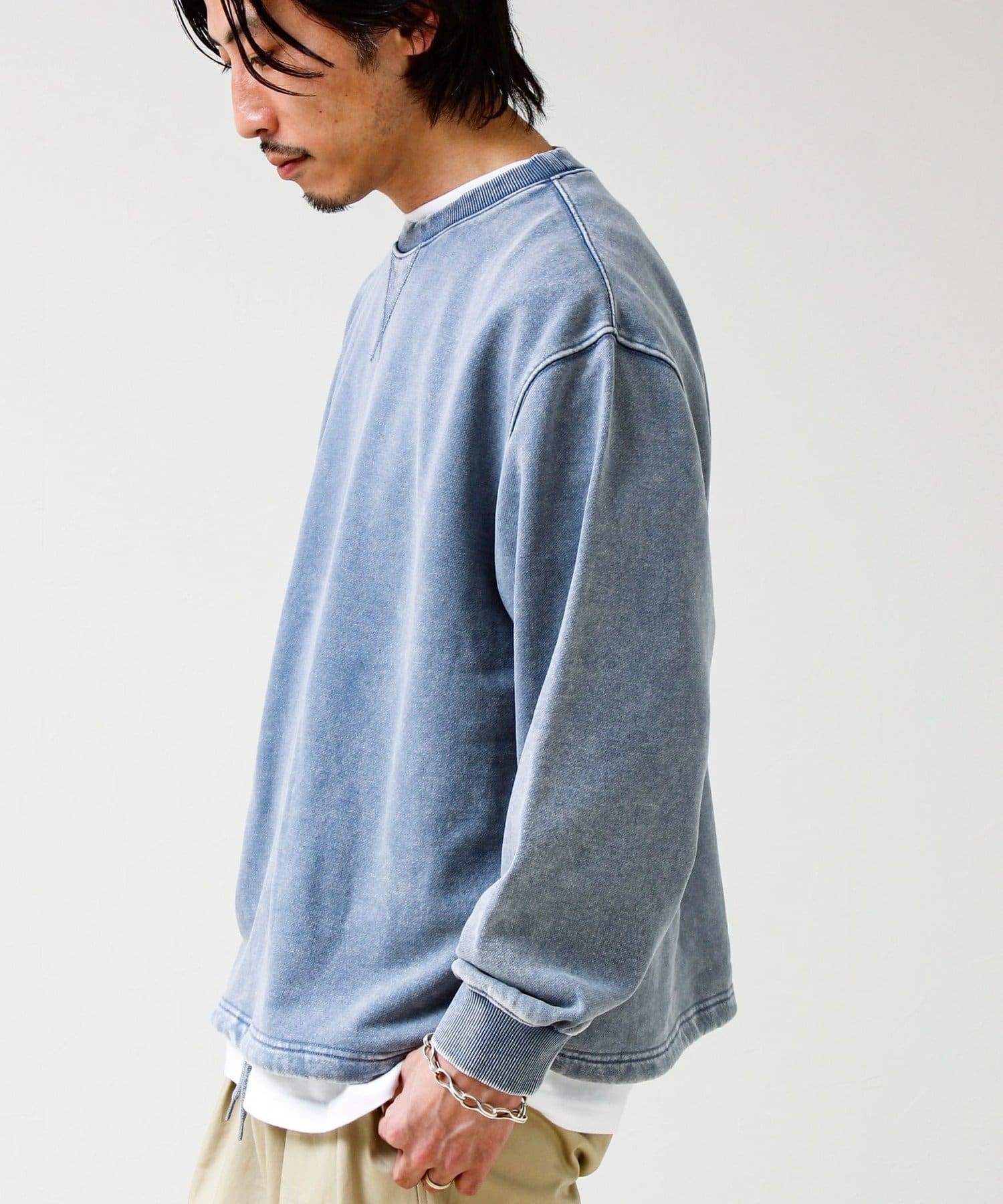 TC裏毛スノーパウダー素材を使用し、表面に粉をふいたようなフェード感のある仕上がり。新品なのに着古したようなヴィンテージライクな表情が魅力です。