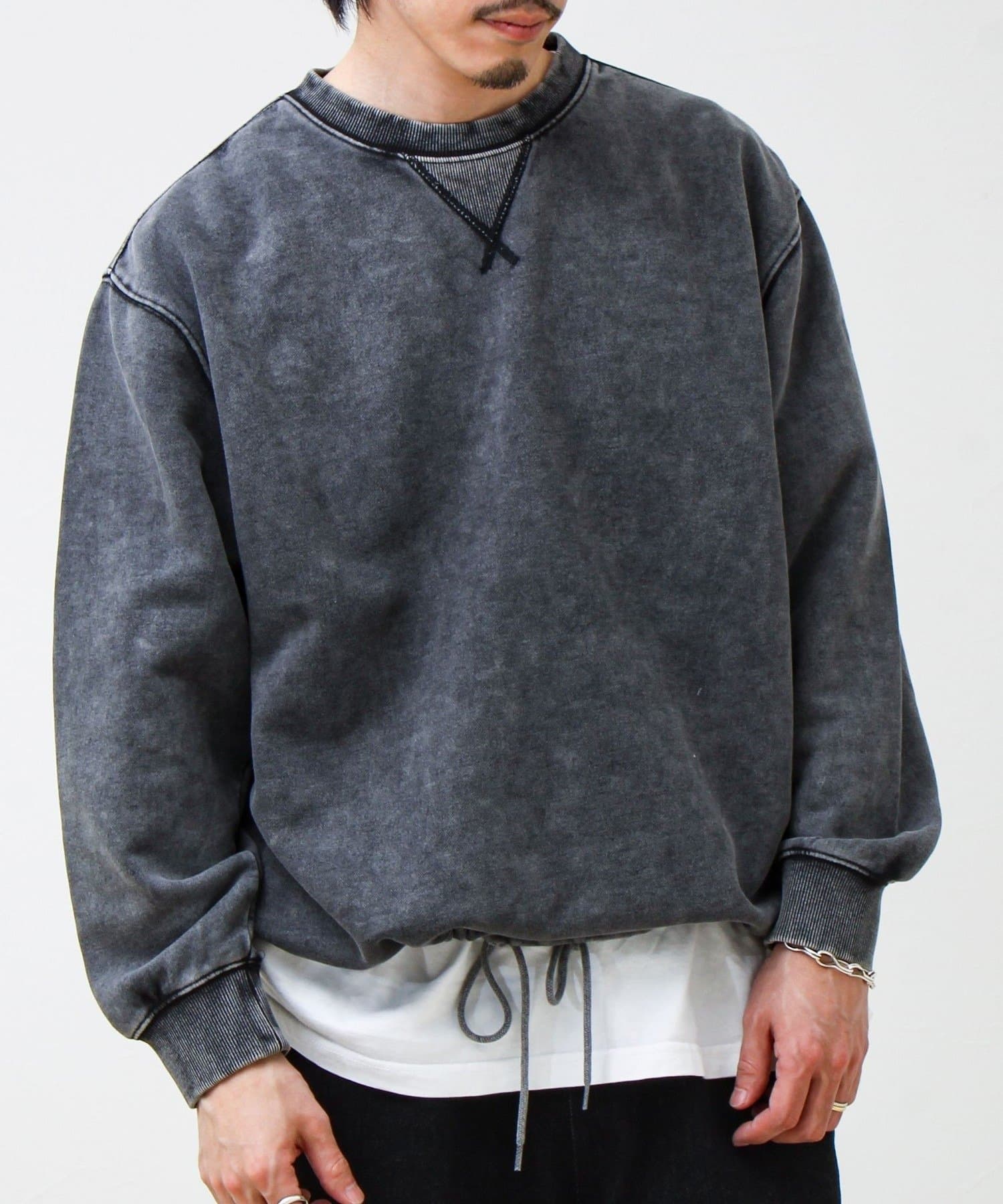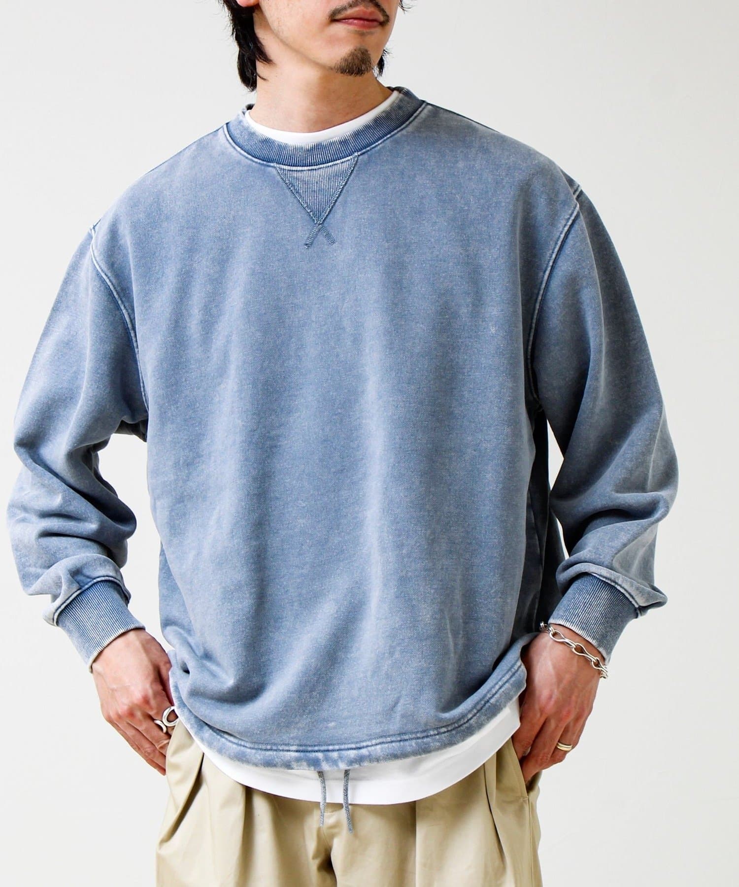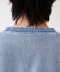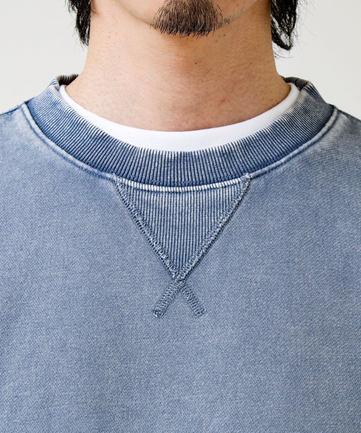 衿元のVガゼット風ディテールや、フェード加工のリブがアクセントに。シンプルながら“ただの無地スウェット”で終わらないデザイン。