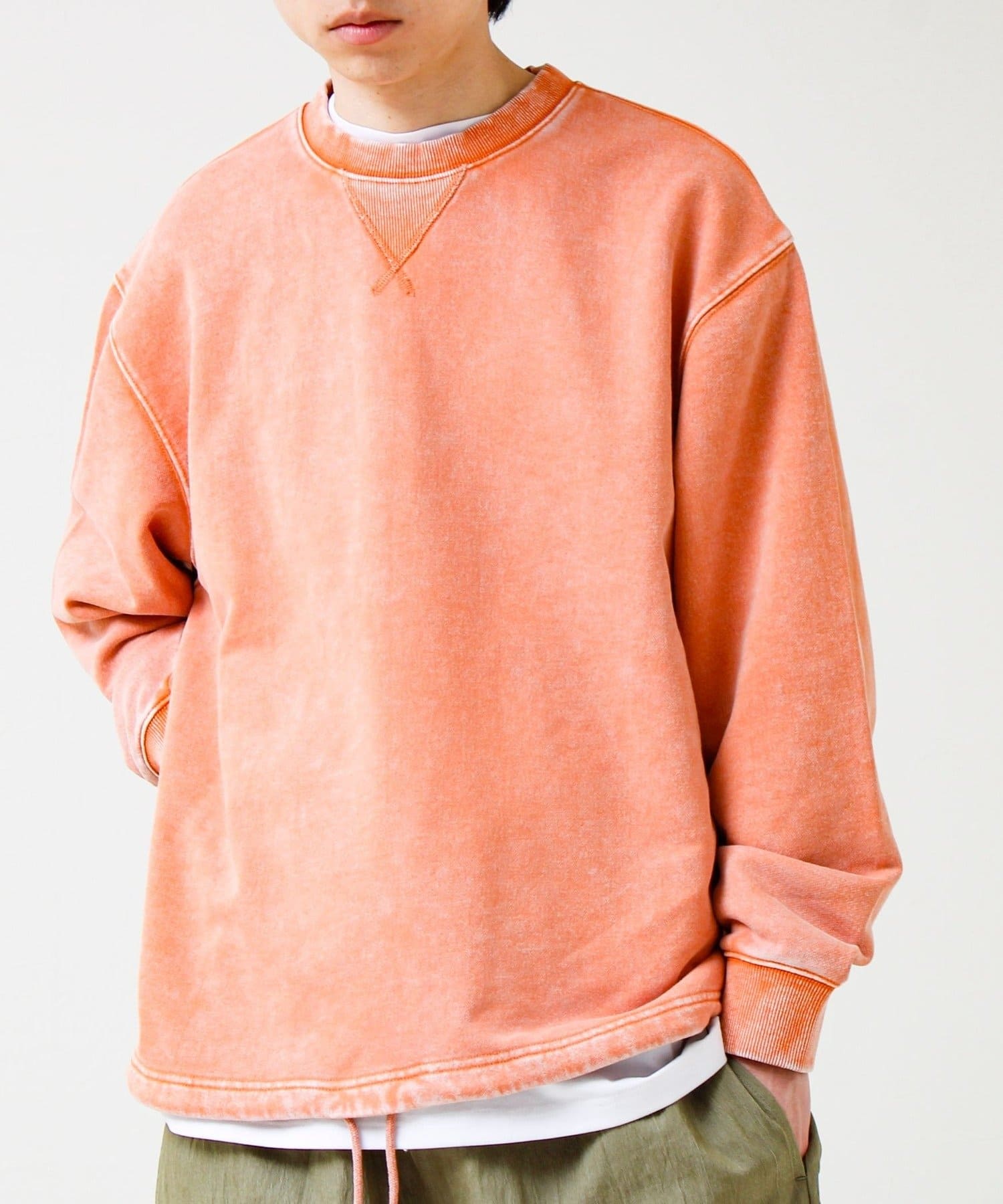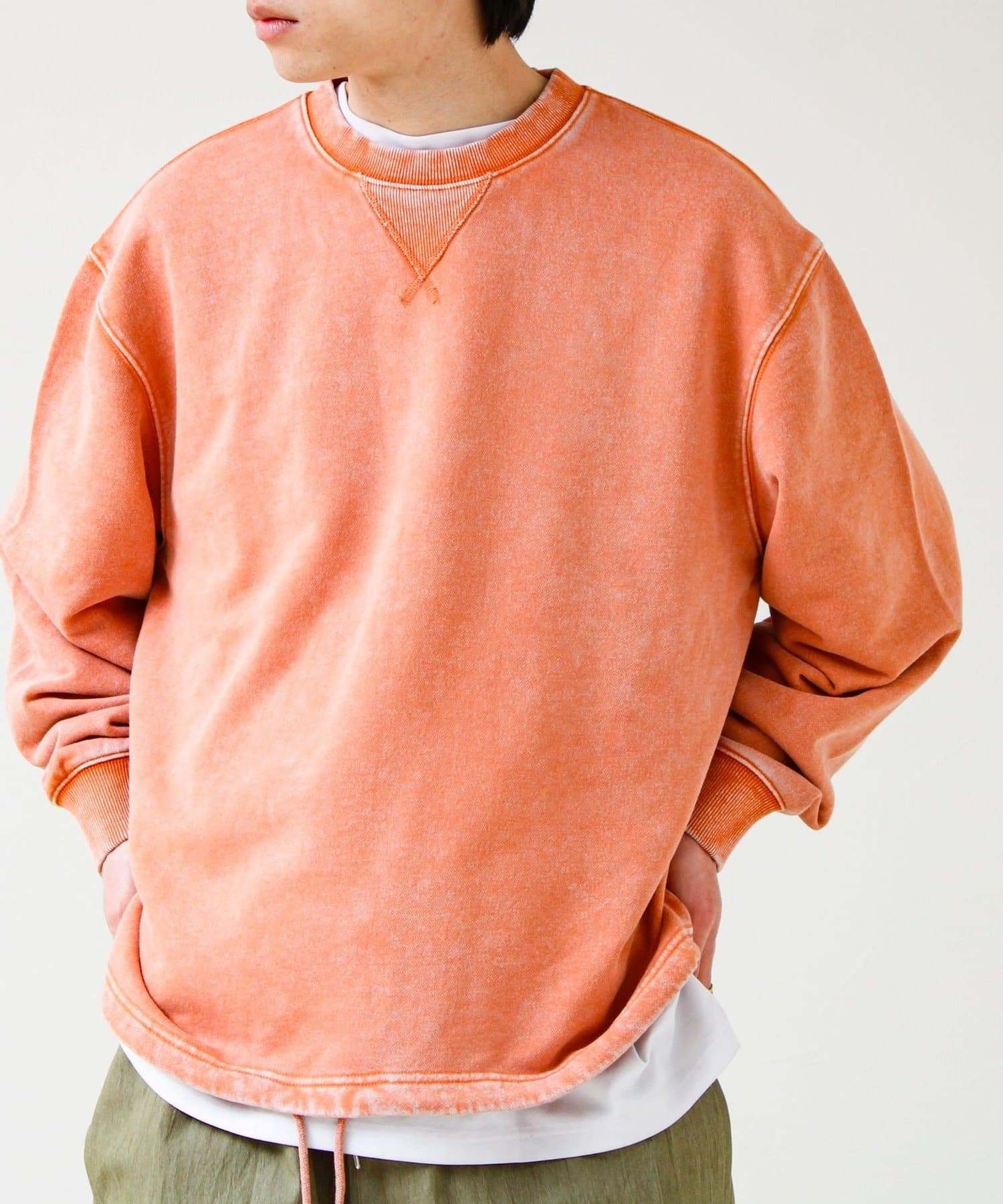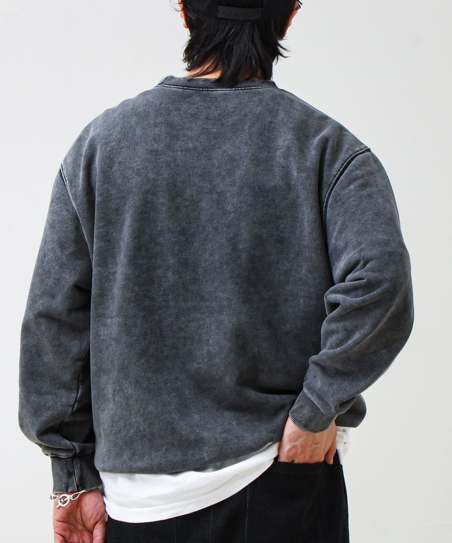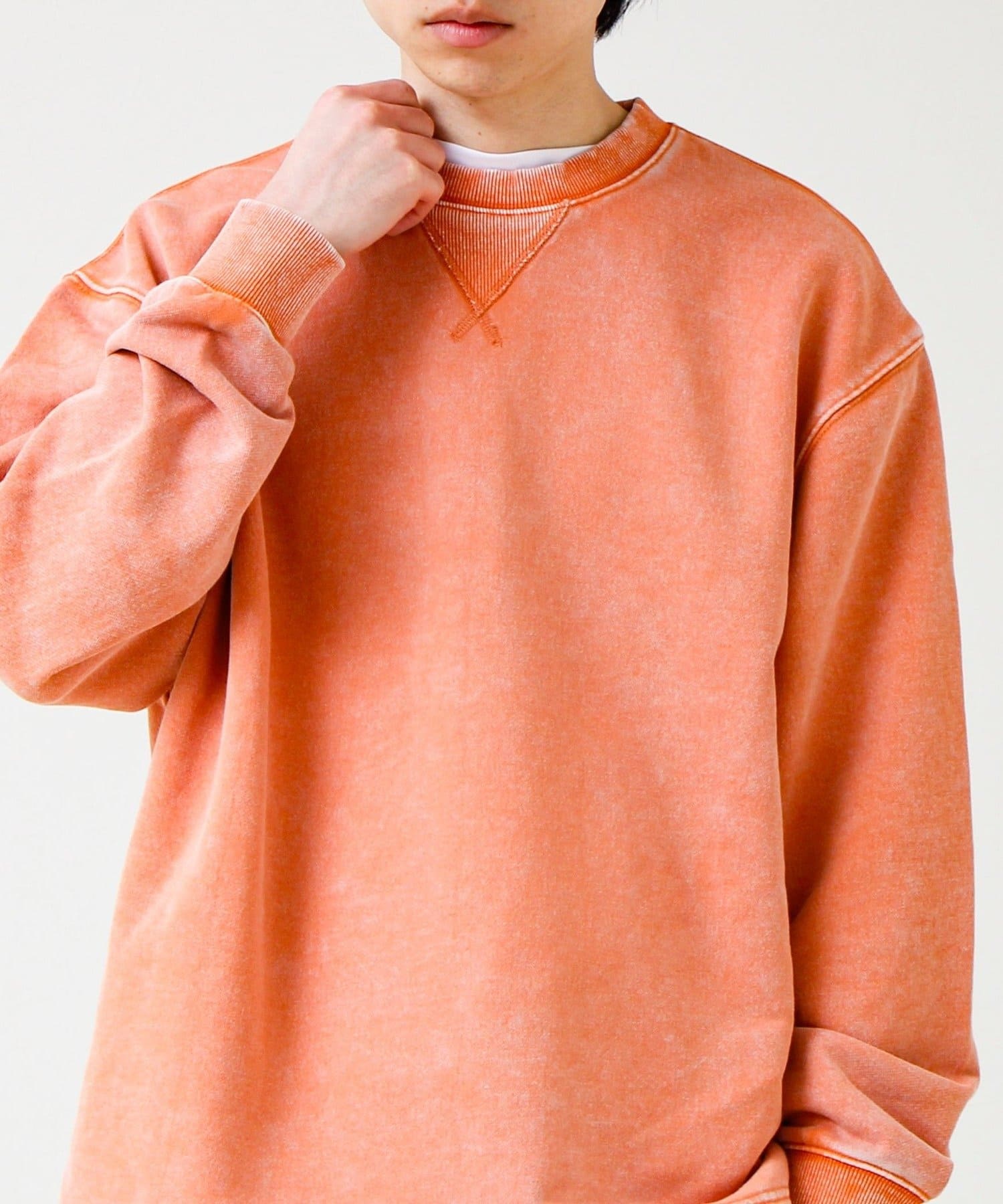 衿元のVガゼット風ディテールや、フェード加工のリブがアクセントに。シンプルながら“ただの無地スウェット”で終わらないデザイン。
