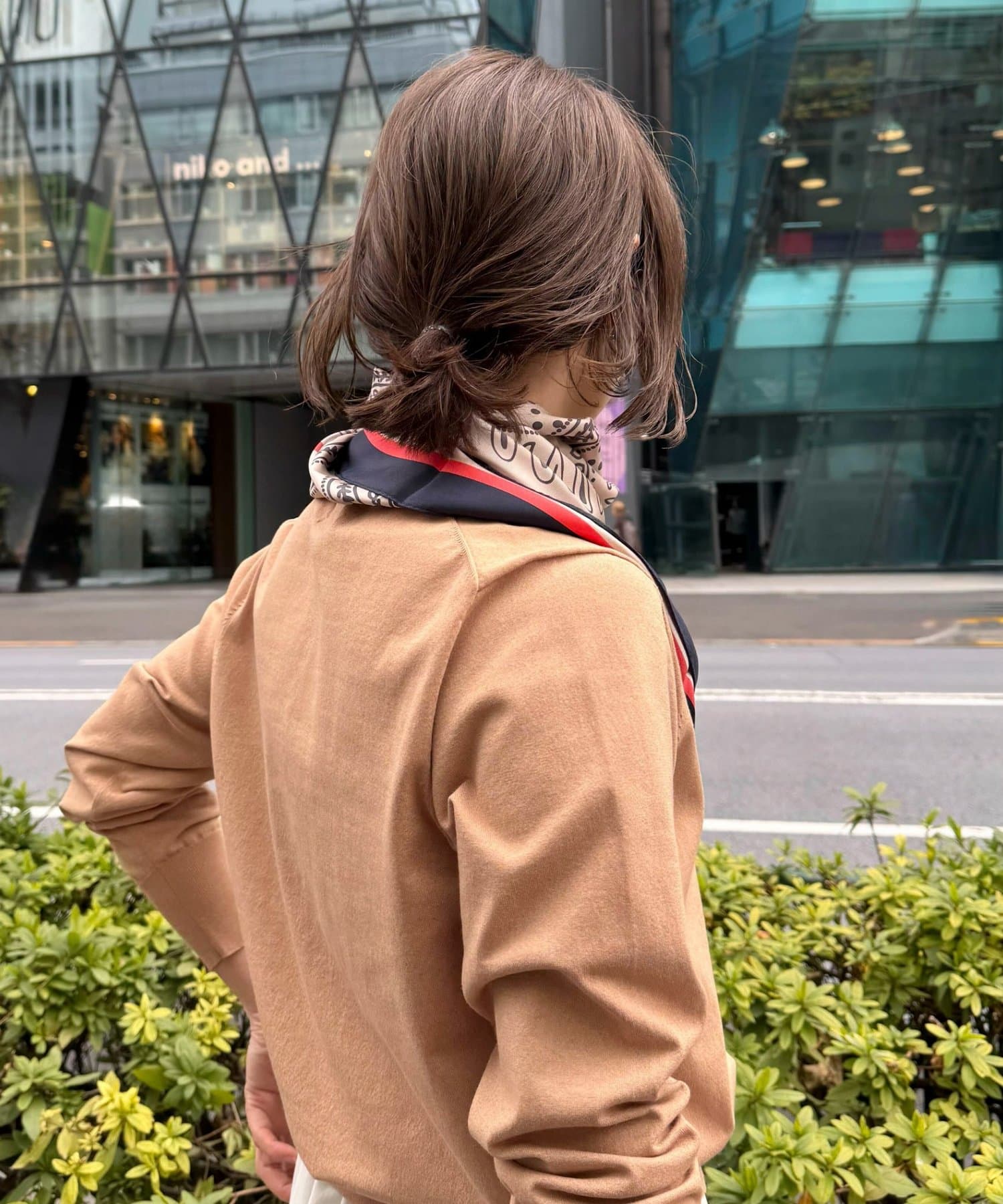 ・首元に巻くのはもちろん、ヘアアレンジや、ビスチェ風に使ったり、バッグの持ち手に結んだり、ウエストに巻いたりベルト風に使ったりなど・・アレンジ次第で様々な表情をお楽しみいただけます。