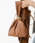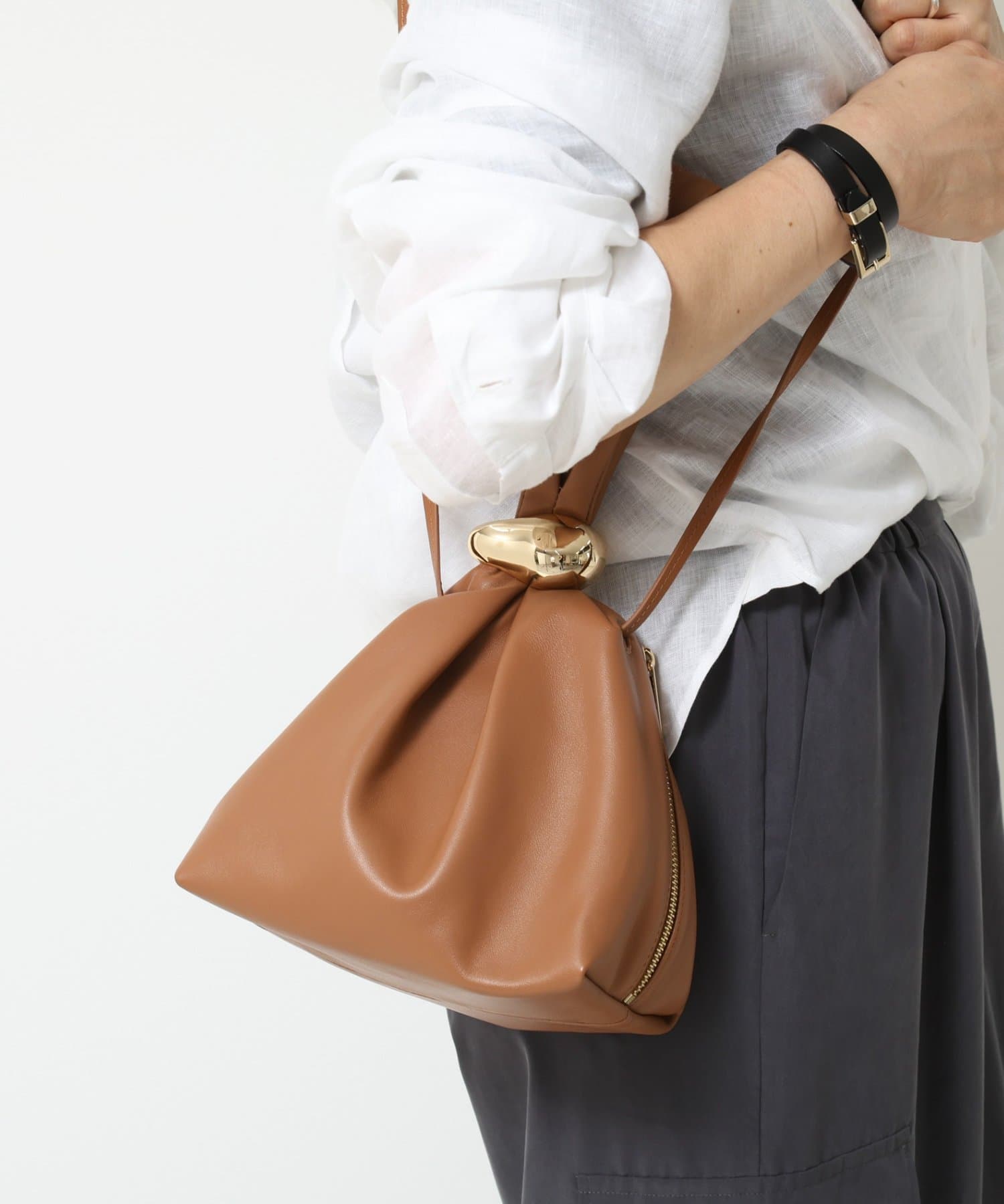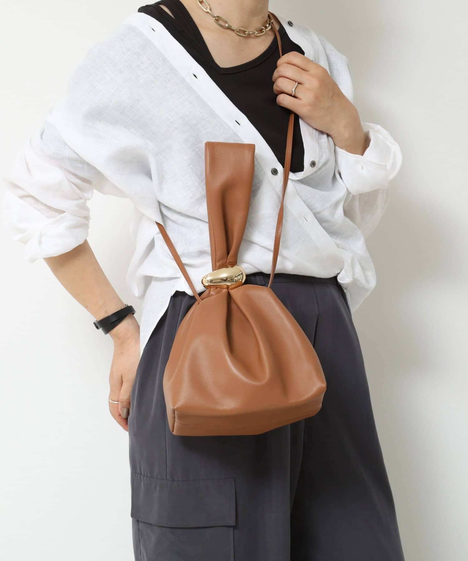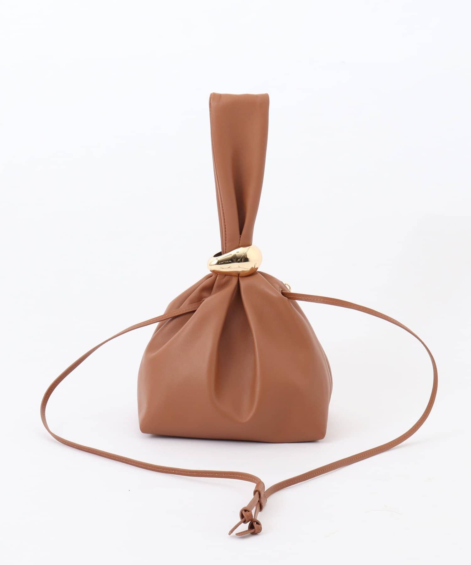 ニュアンスデザインでなんとも可愛い大きな金具モチーフが付いた、巾着風バッグです。