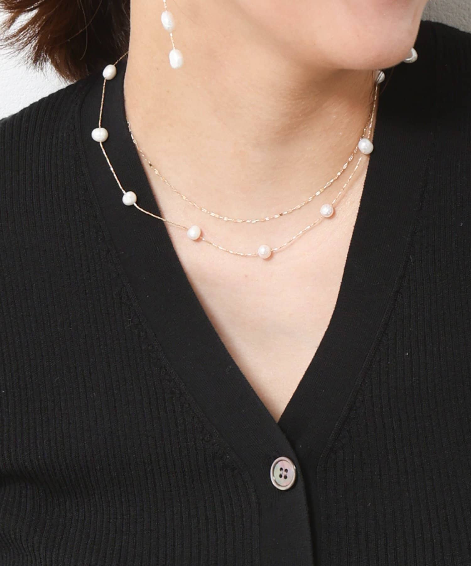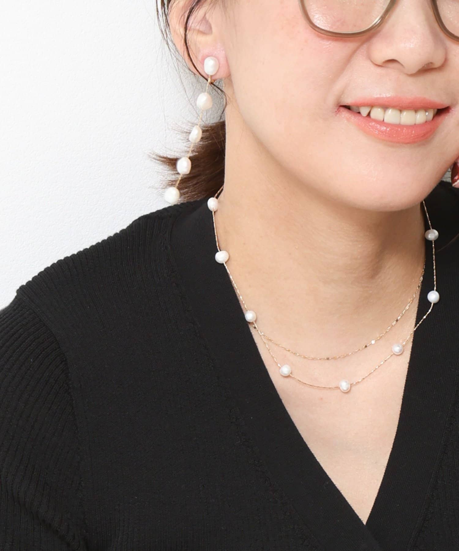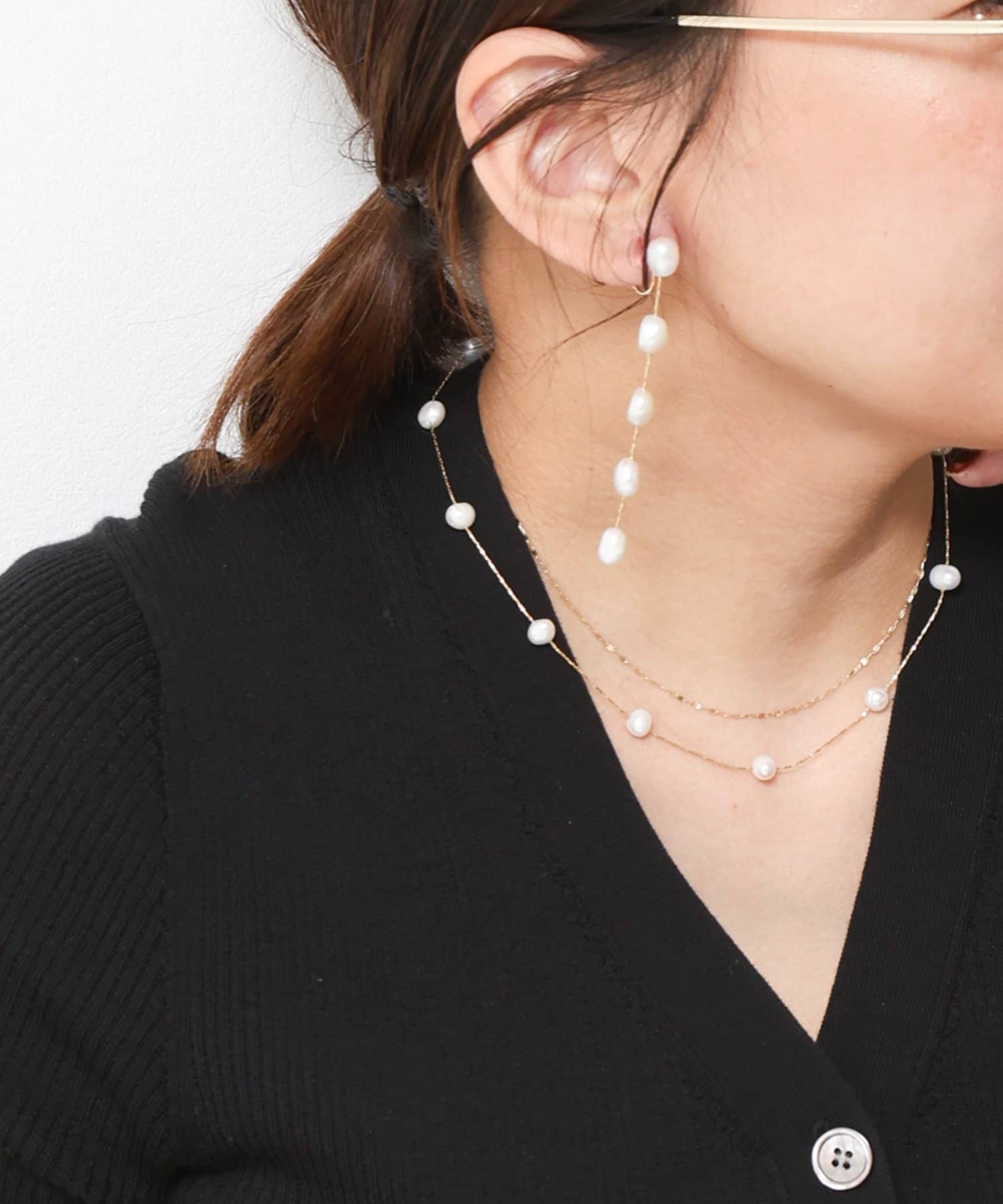 淡水パールのいびつさも、キレイ目になりすぎず幅広いコーデに使えます。