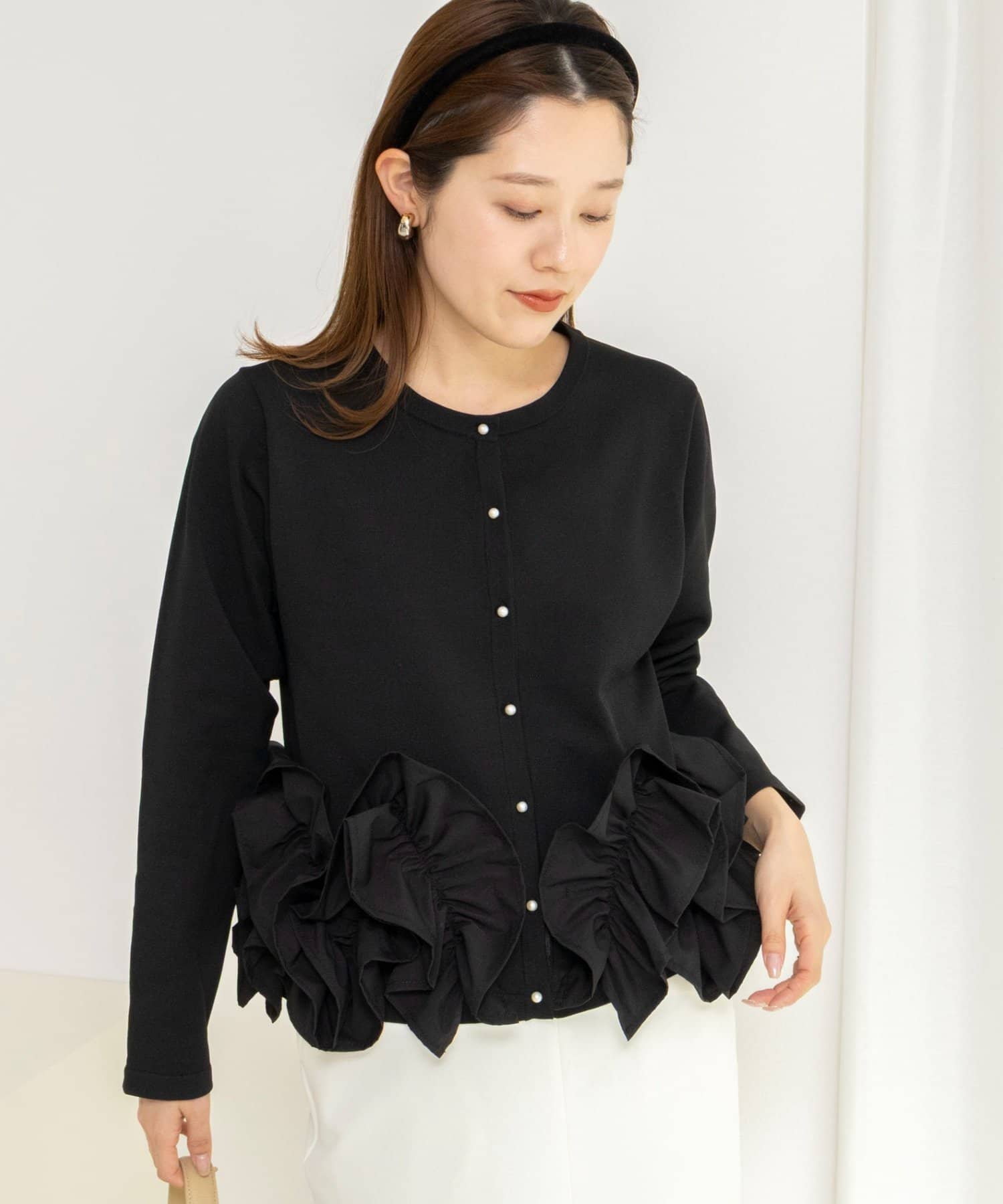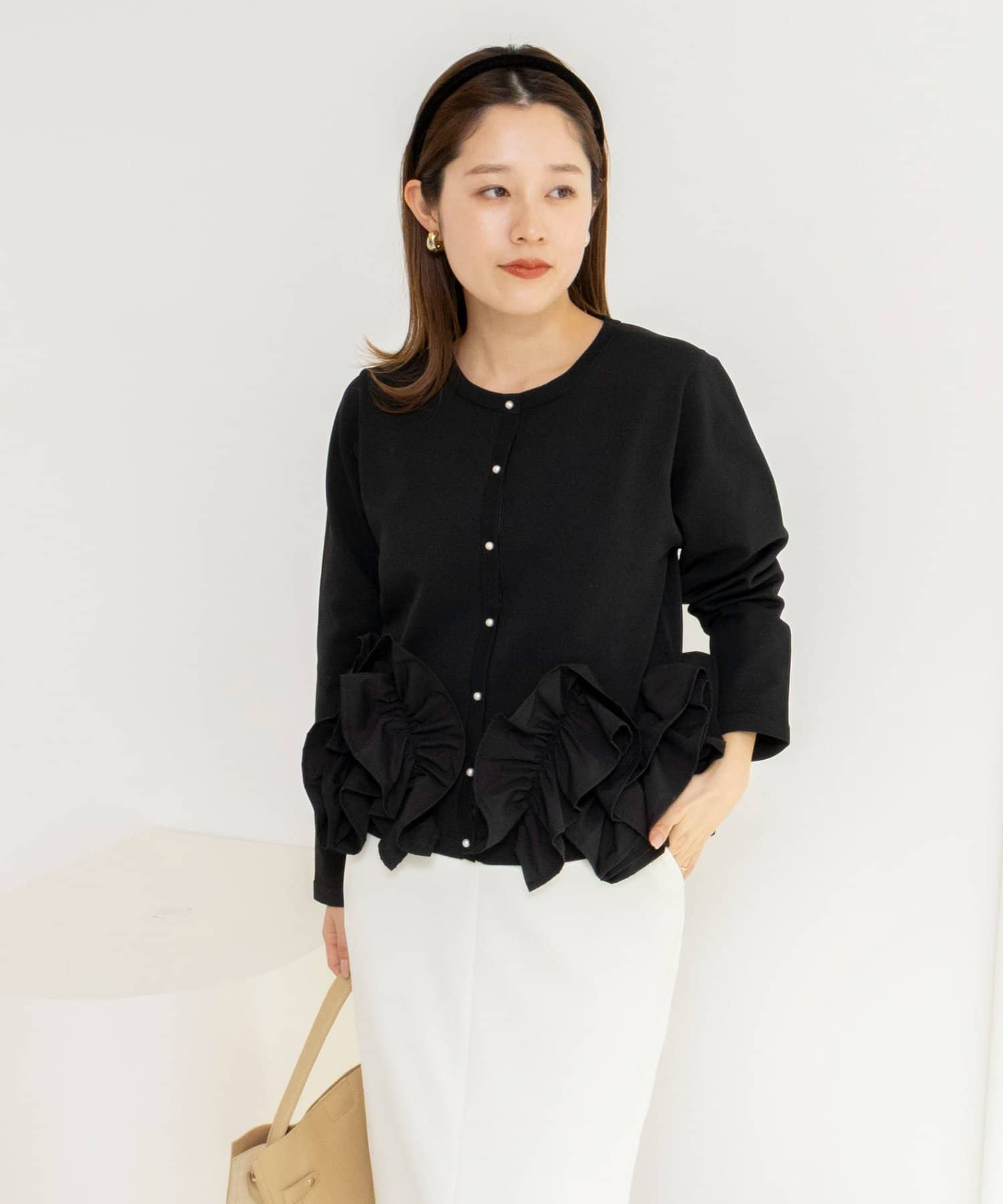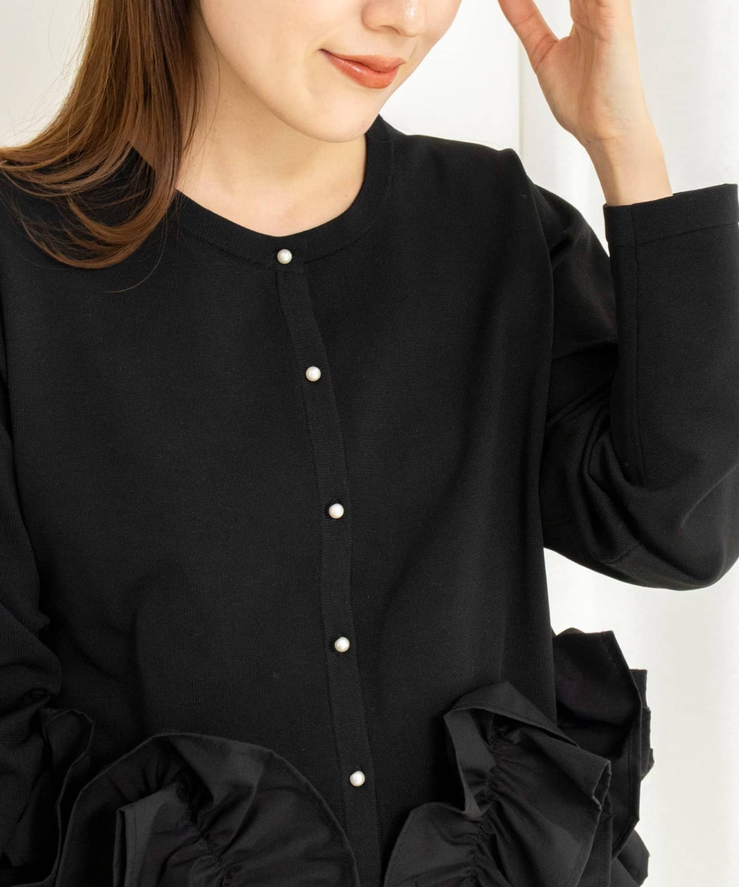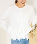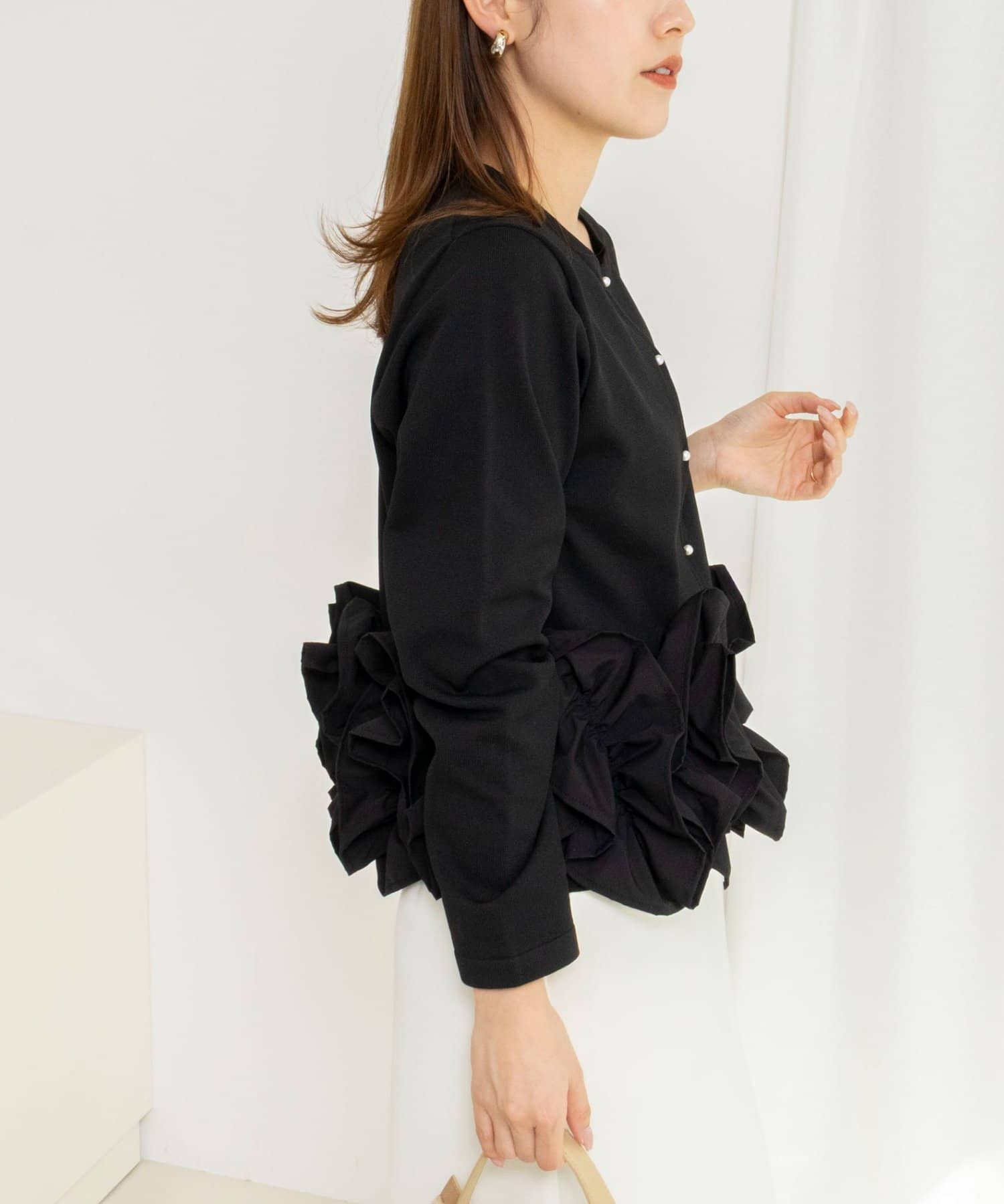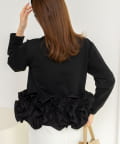 ・裾にあしらった立体的なフリルデザインが、シンプルながら華やかな印象のカーディガン
