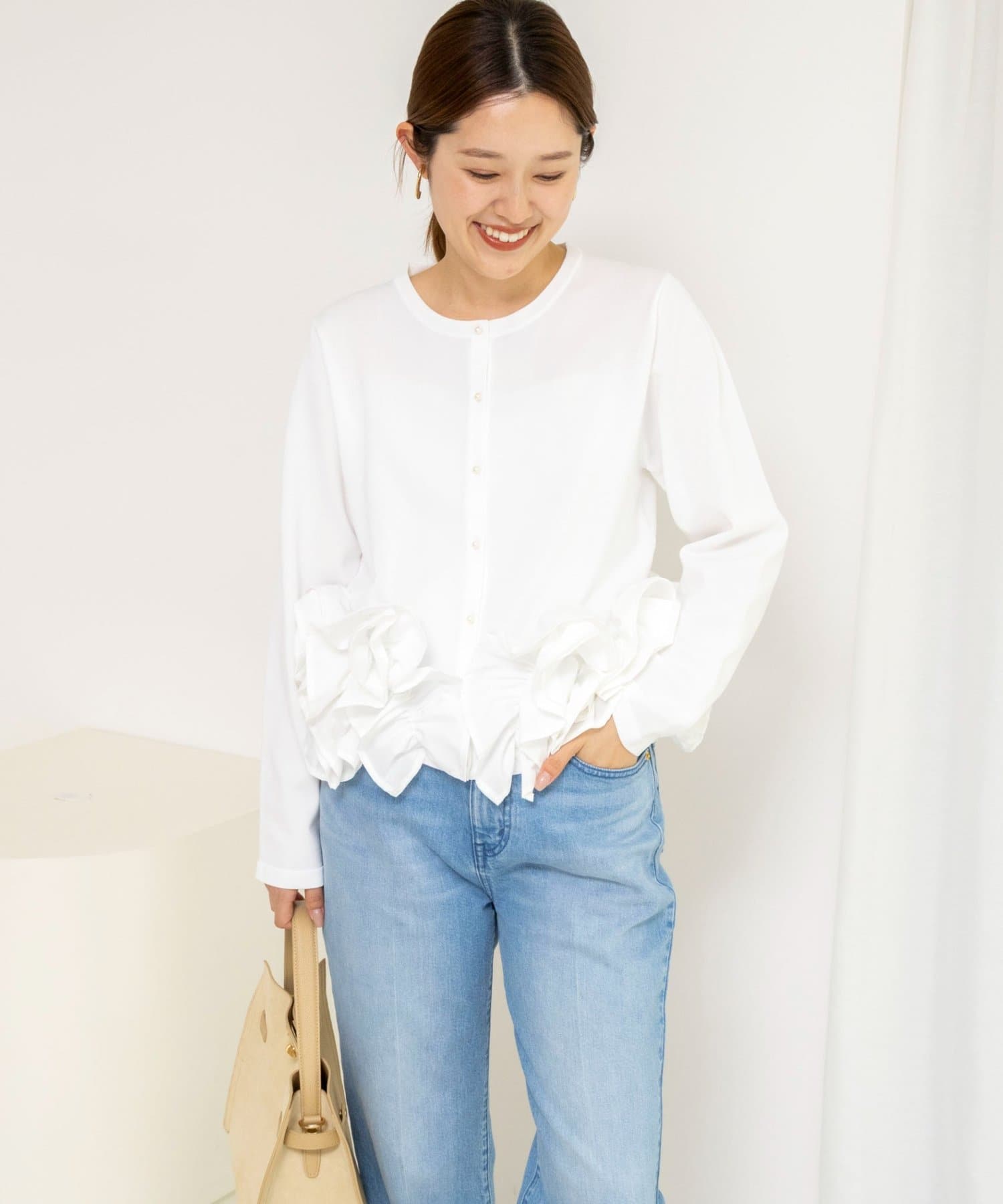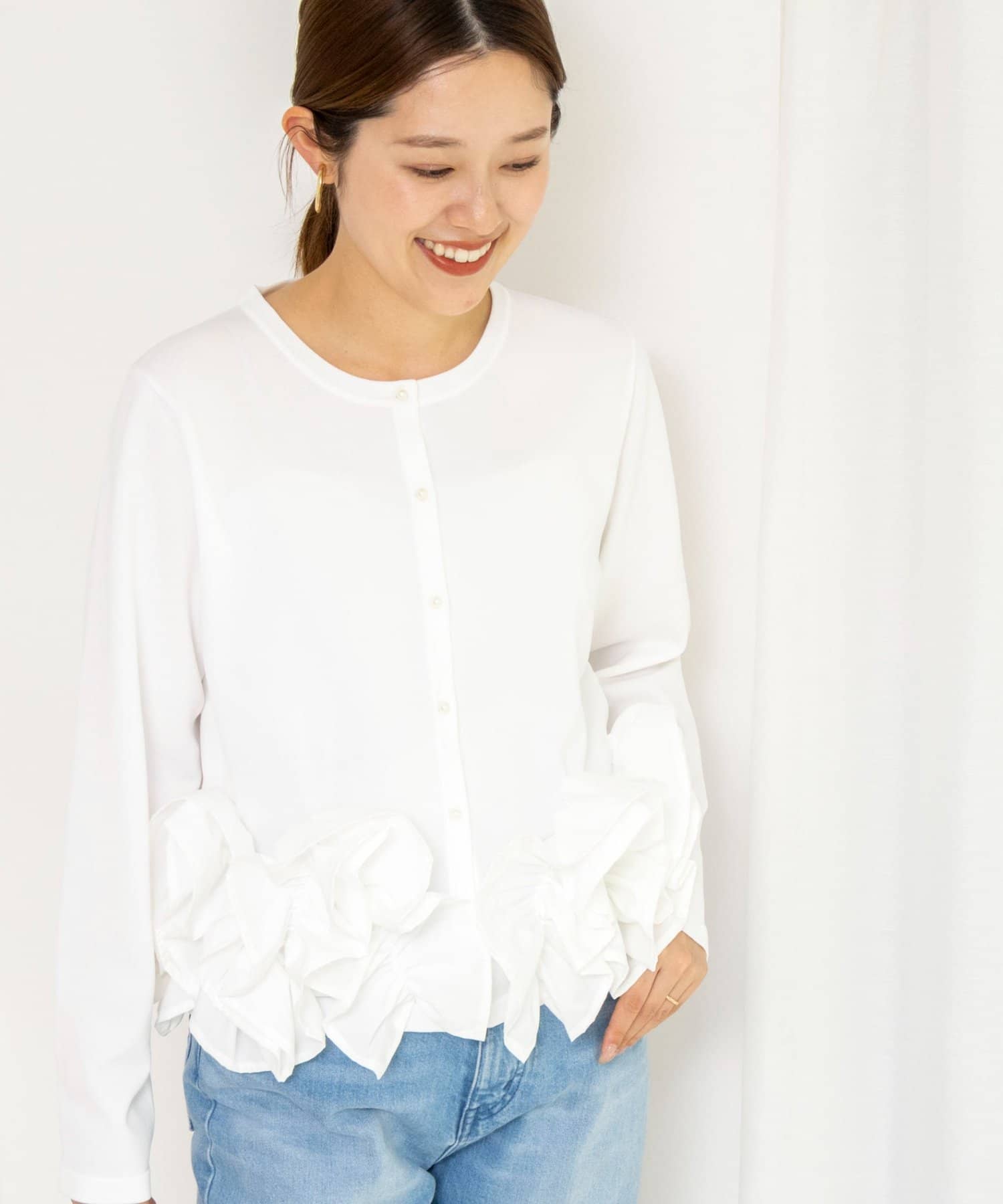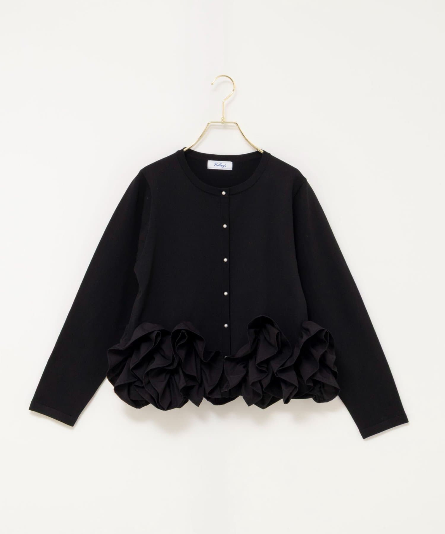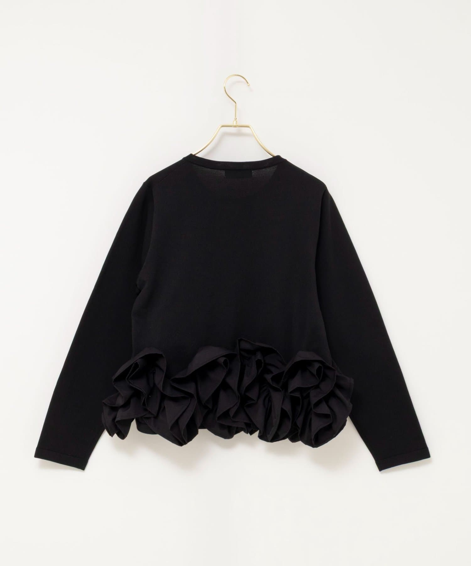 ・裾にあしらった立体的なフリルデザインが、シンプルながら華やかな印象のカーディガン
