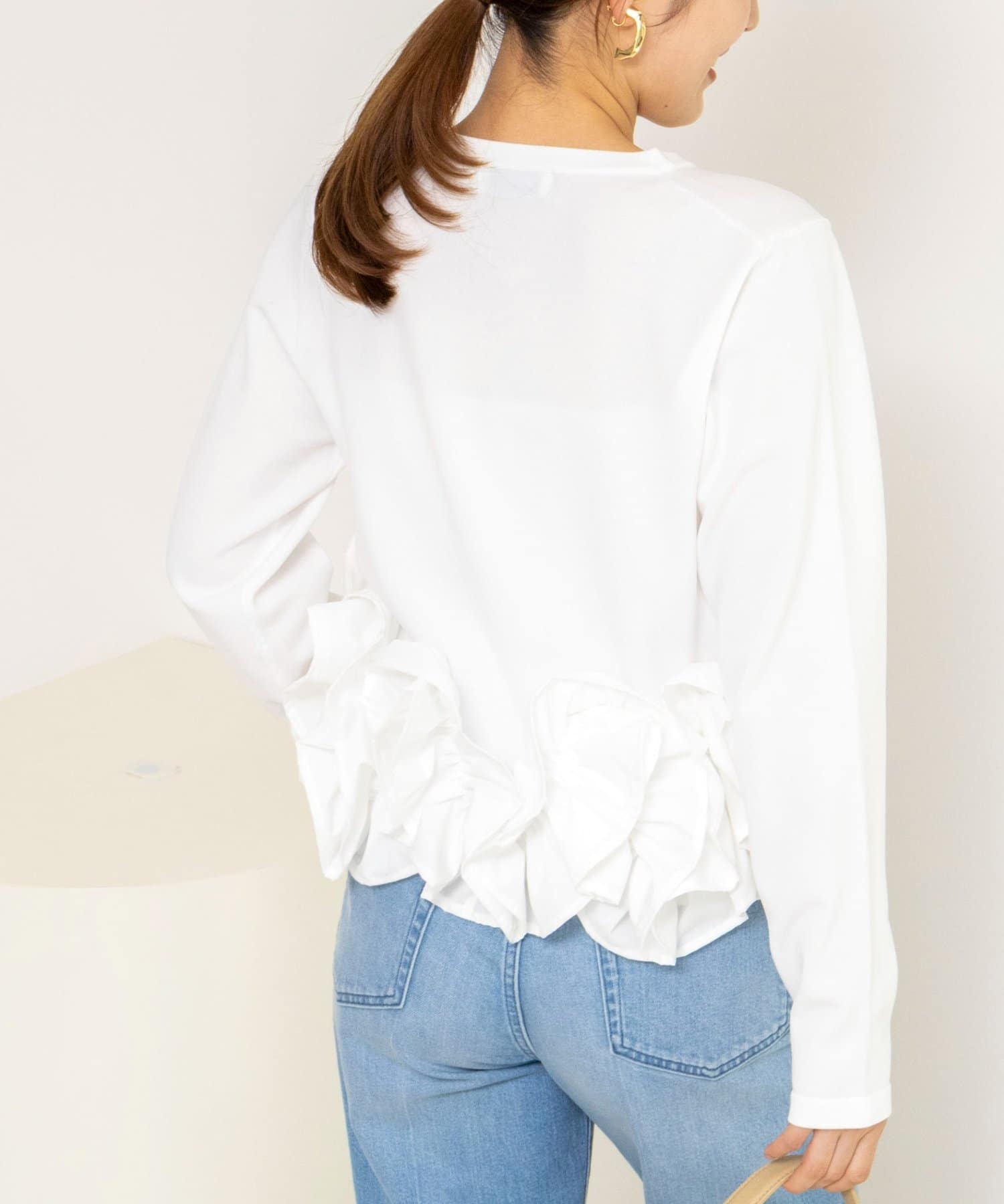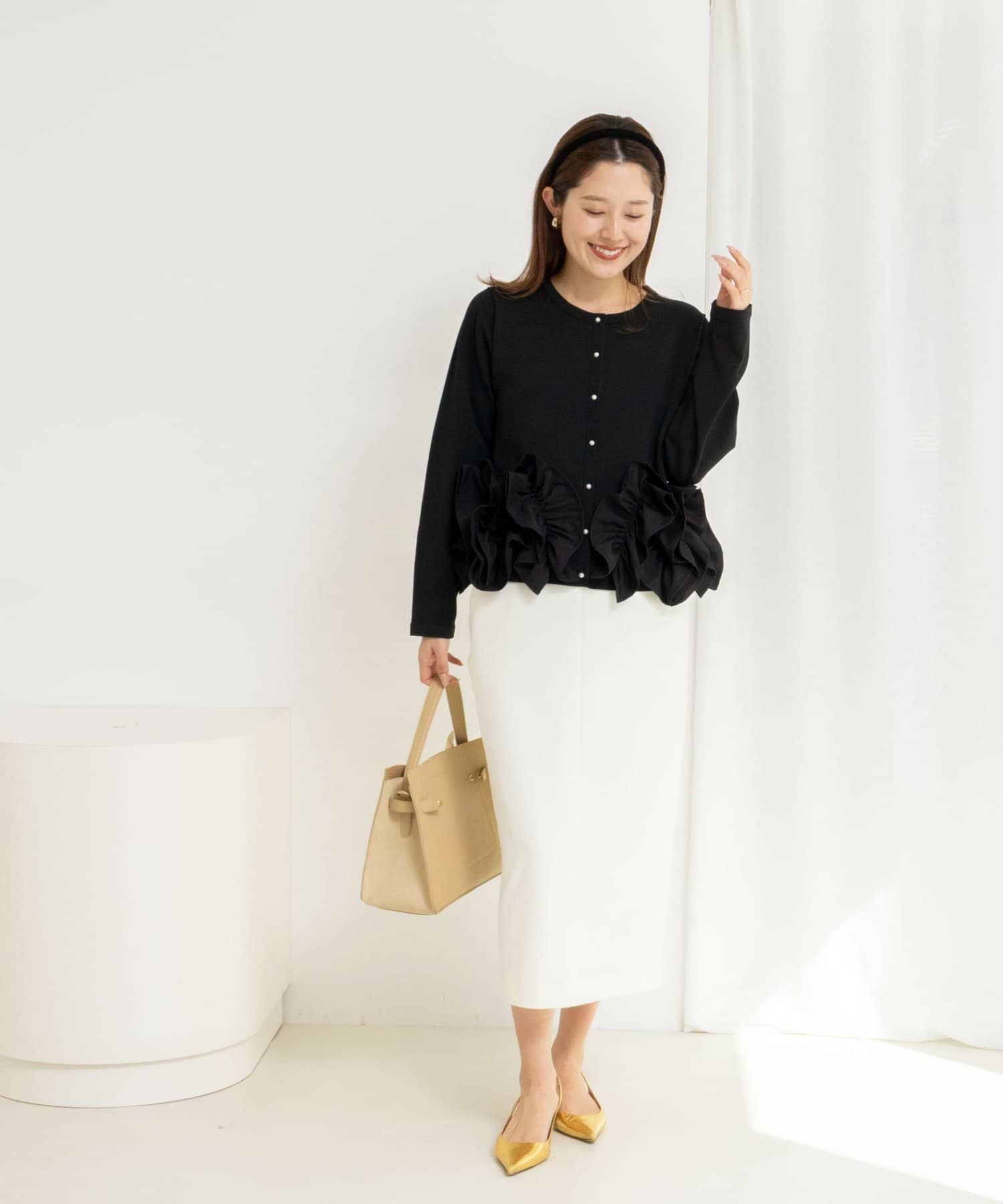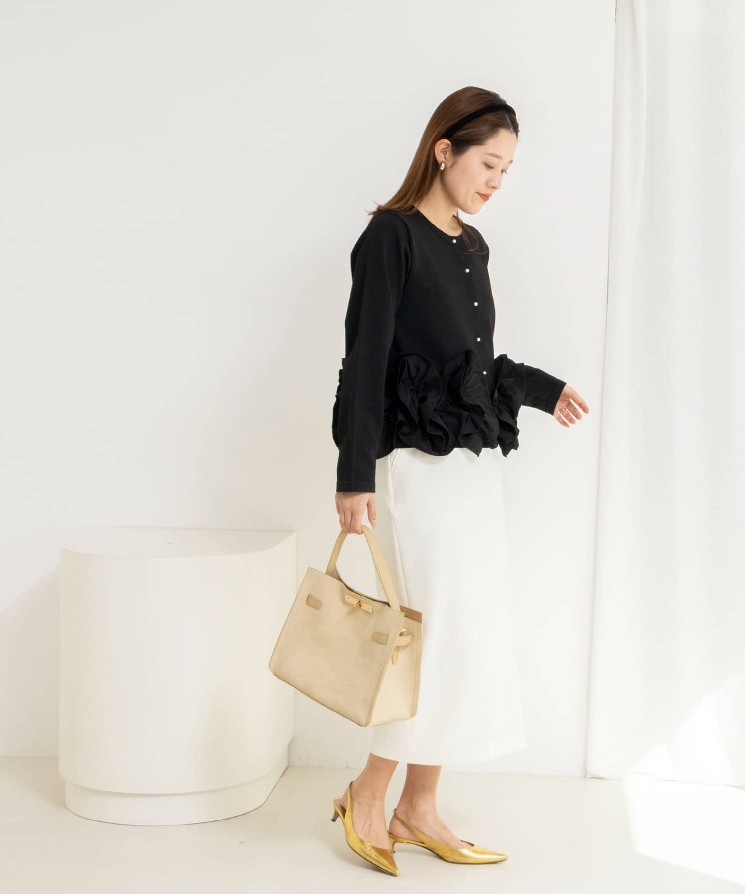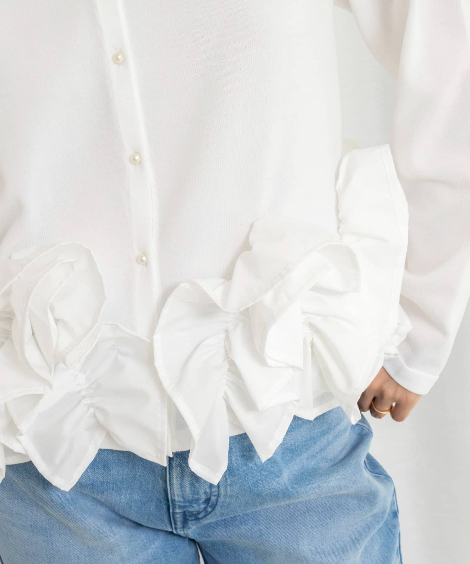・裾にあしらった立体的なフリルデザインが、シンプルながら華やかな印象のカーディガン