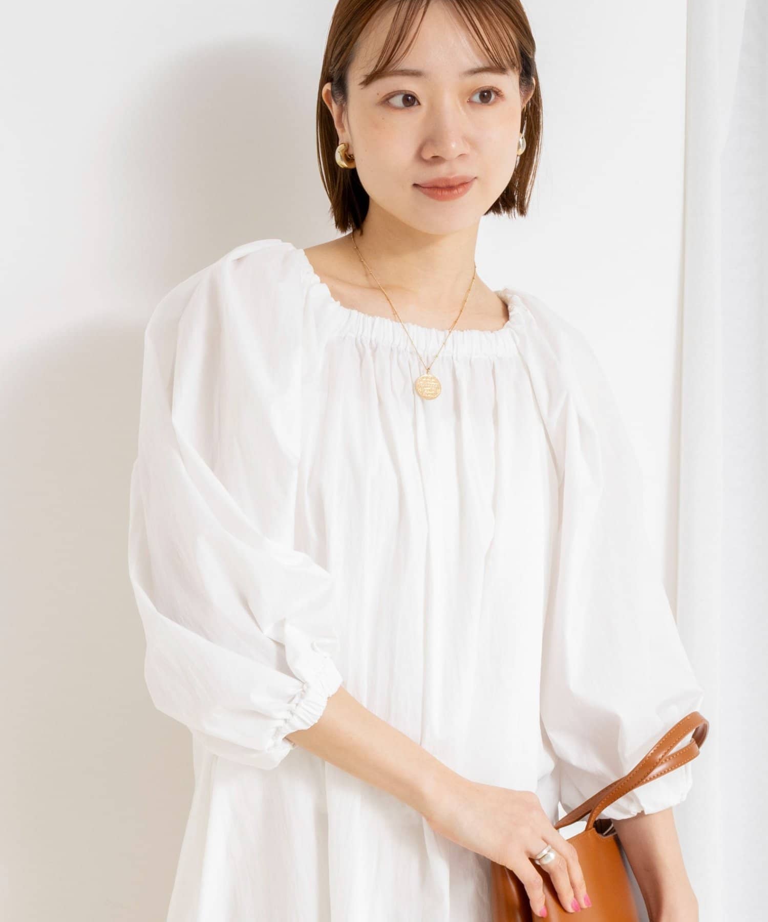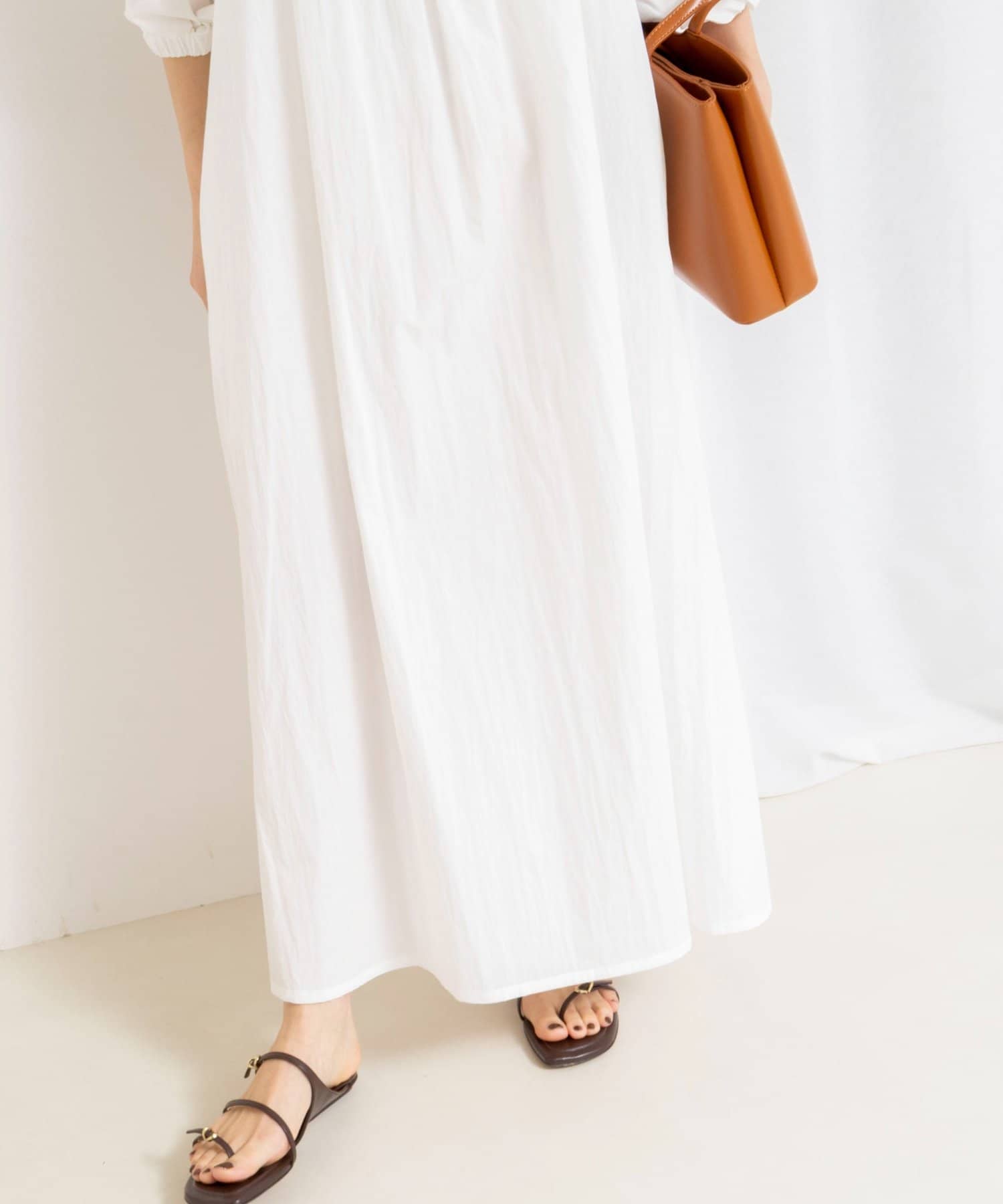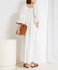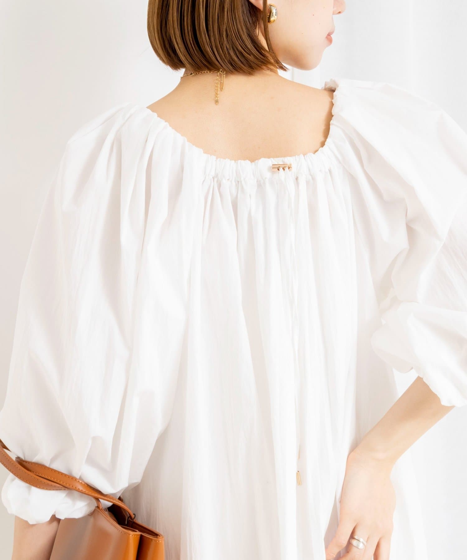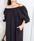 ・ネックラインにゴムを入れたデザインで、程よい抜け感とリラックス感を演出するワンピース
