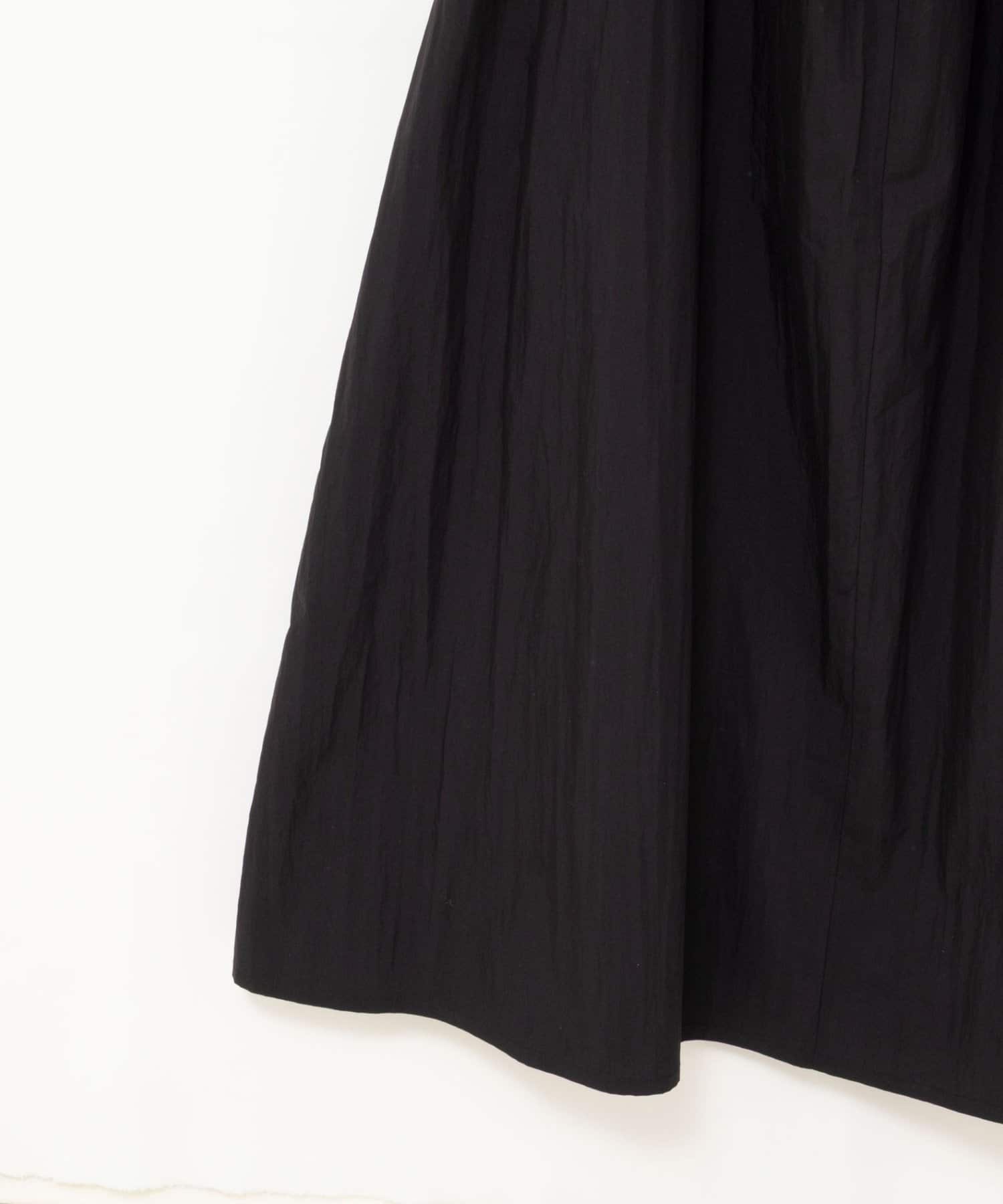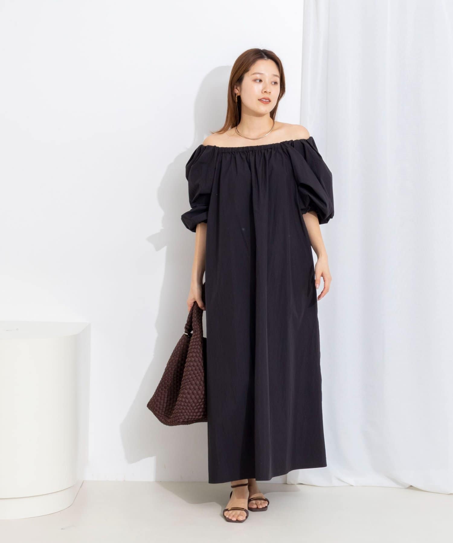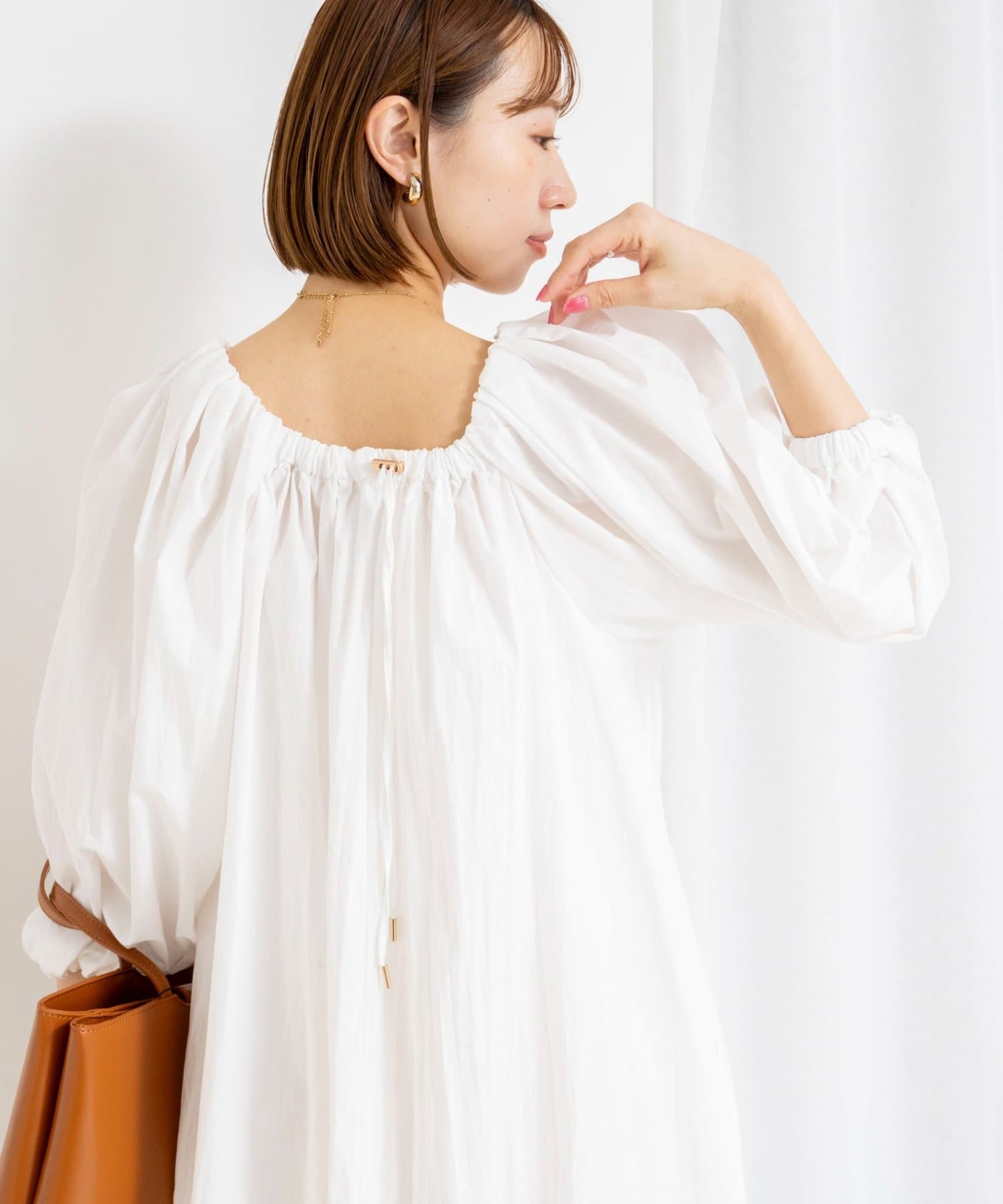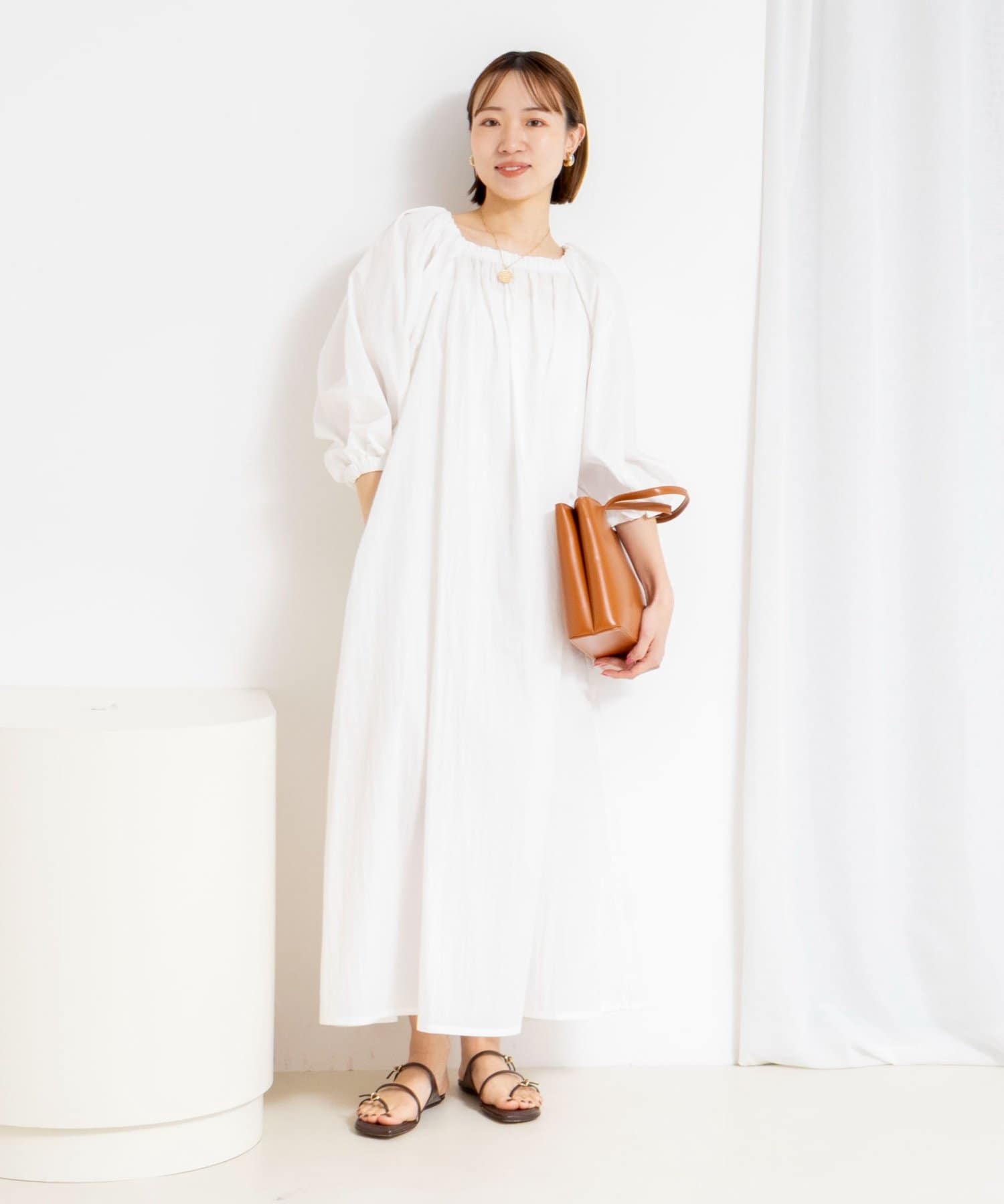 ・ネックラインにゴムを入れたデザインで、程よい抜け感とリラックス感を演出するワンピース