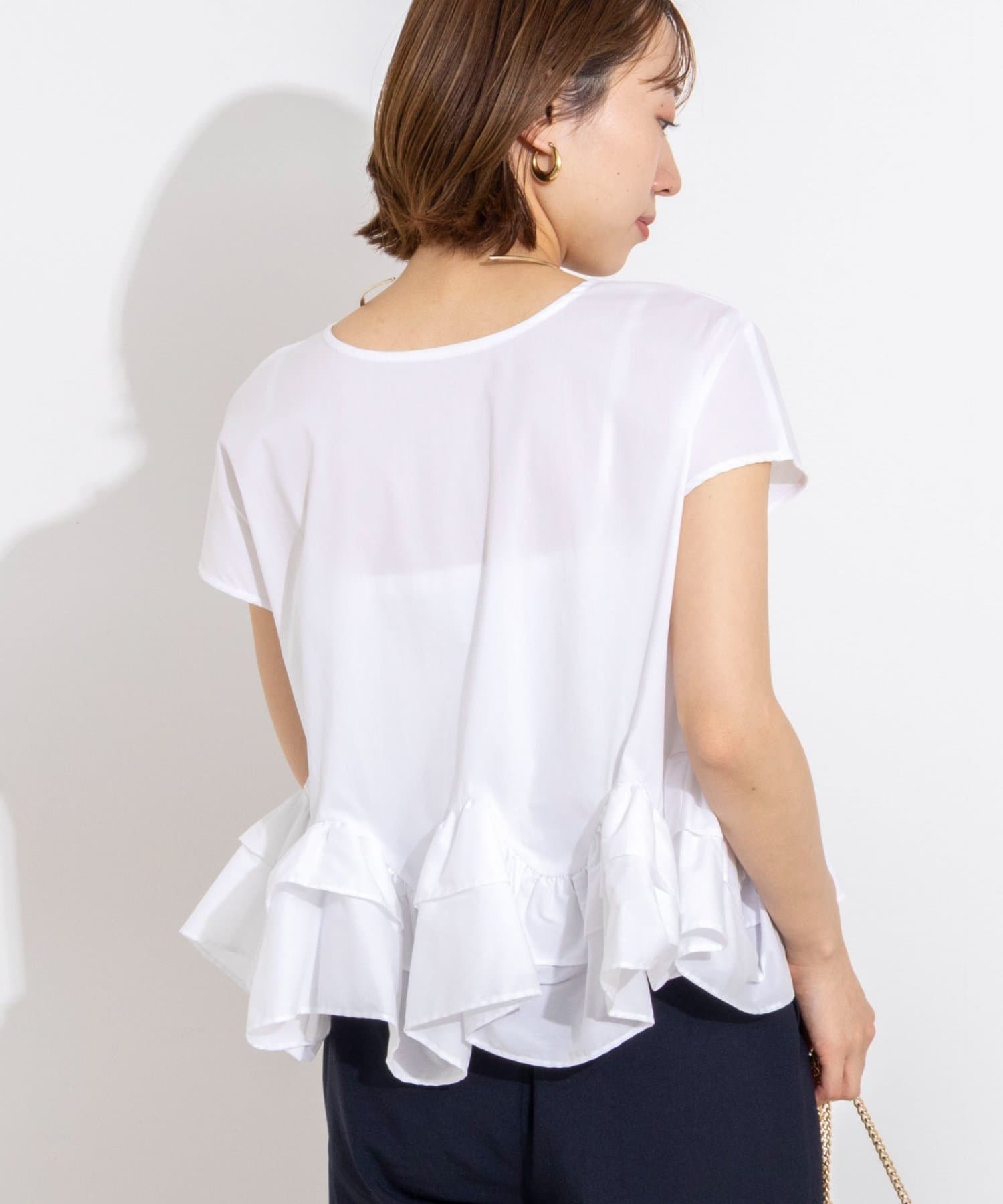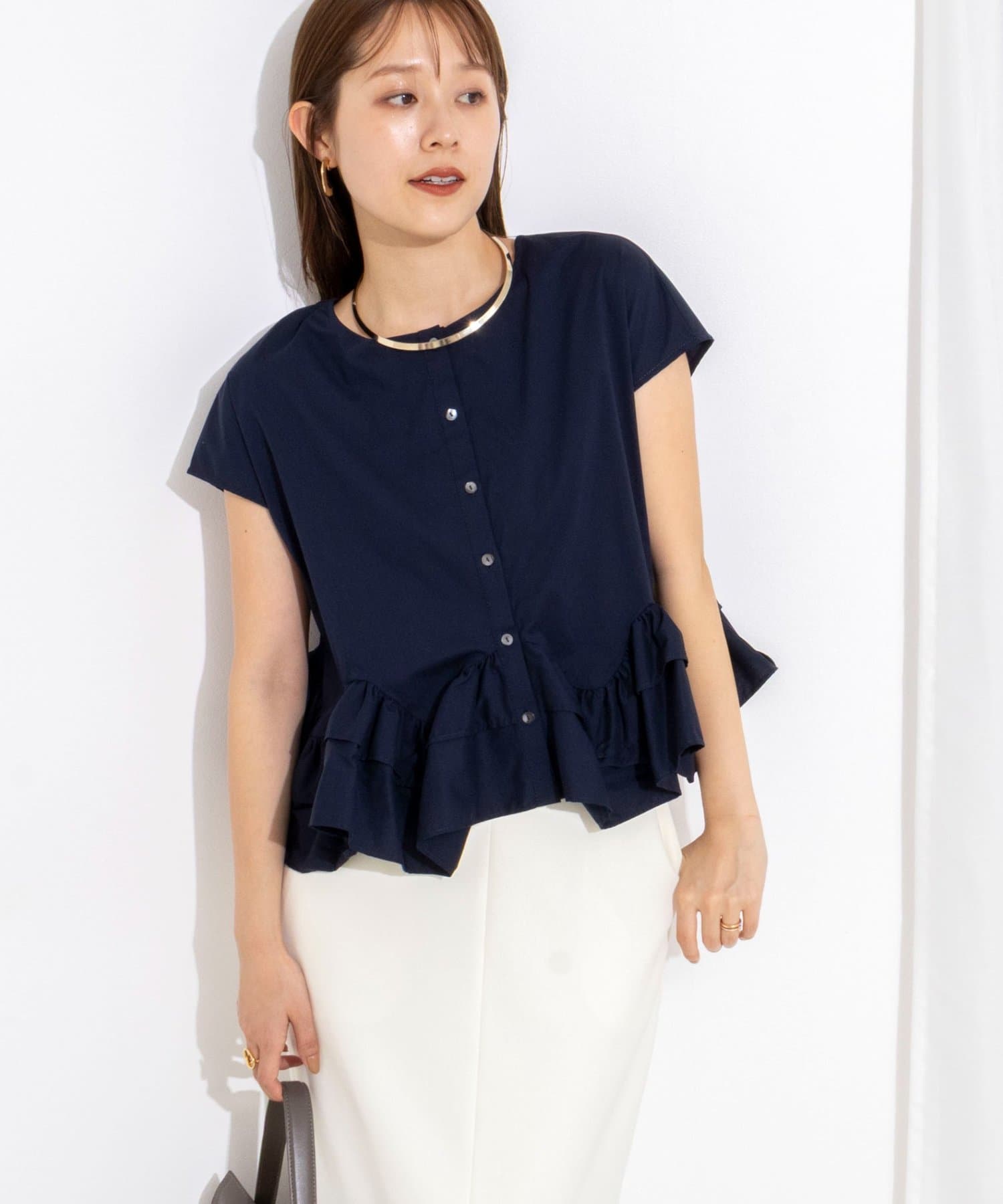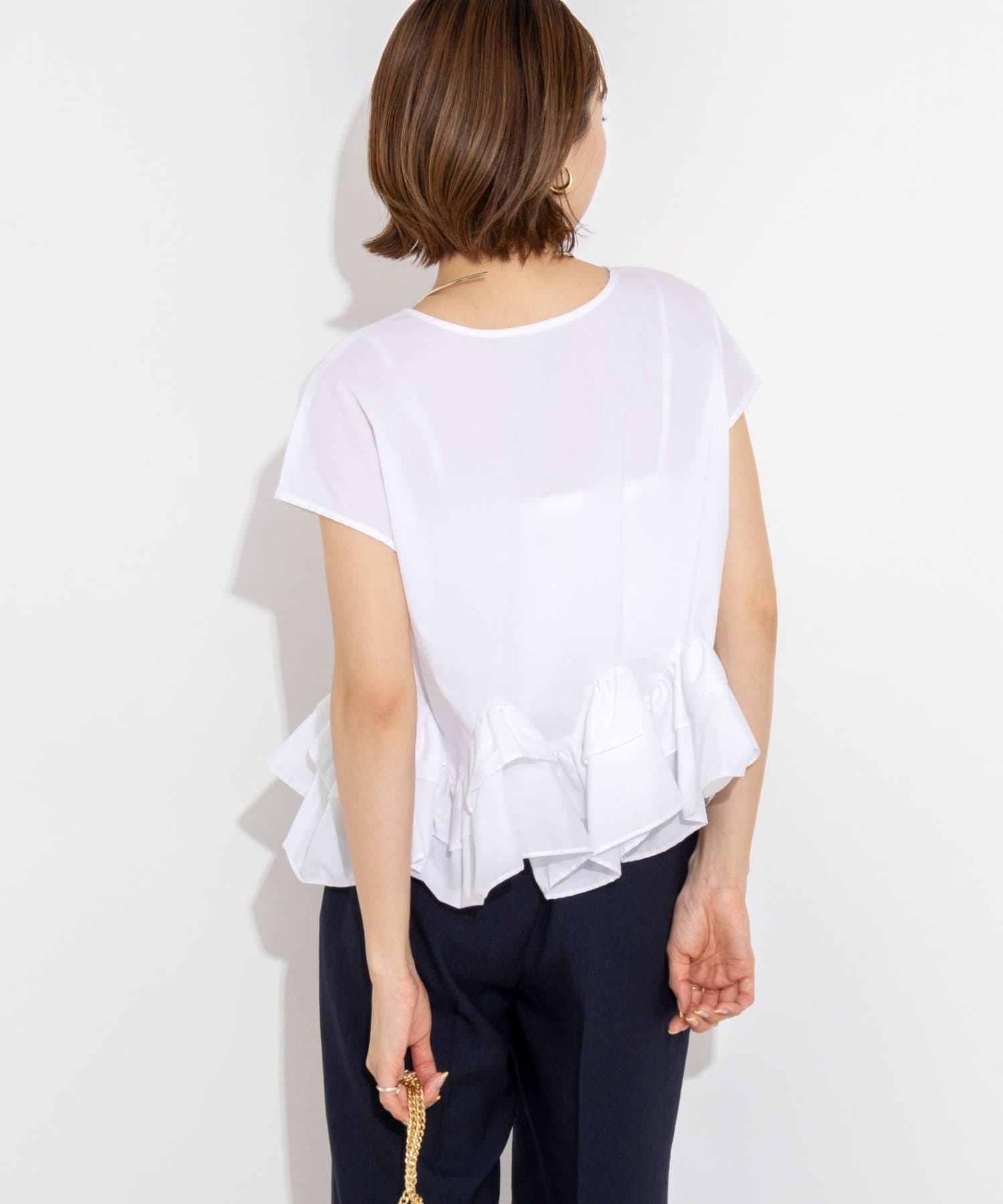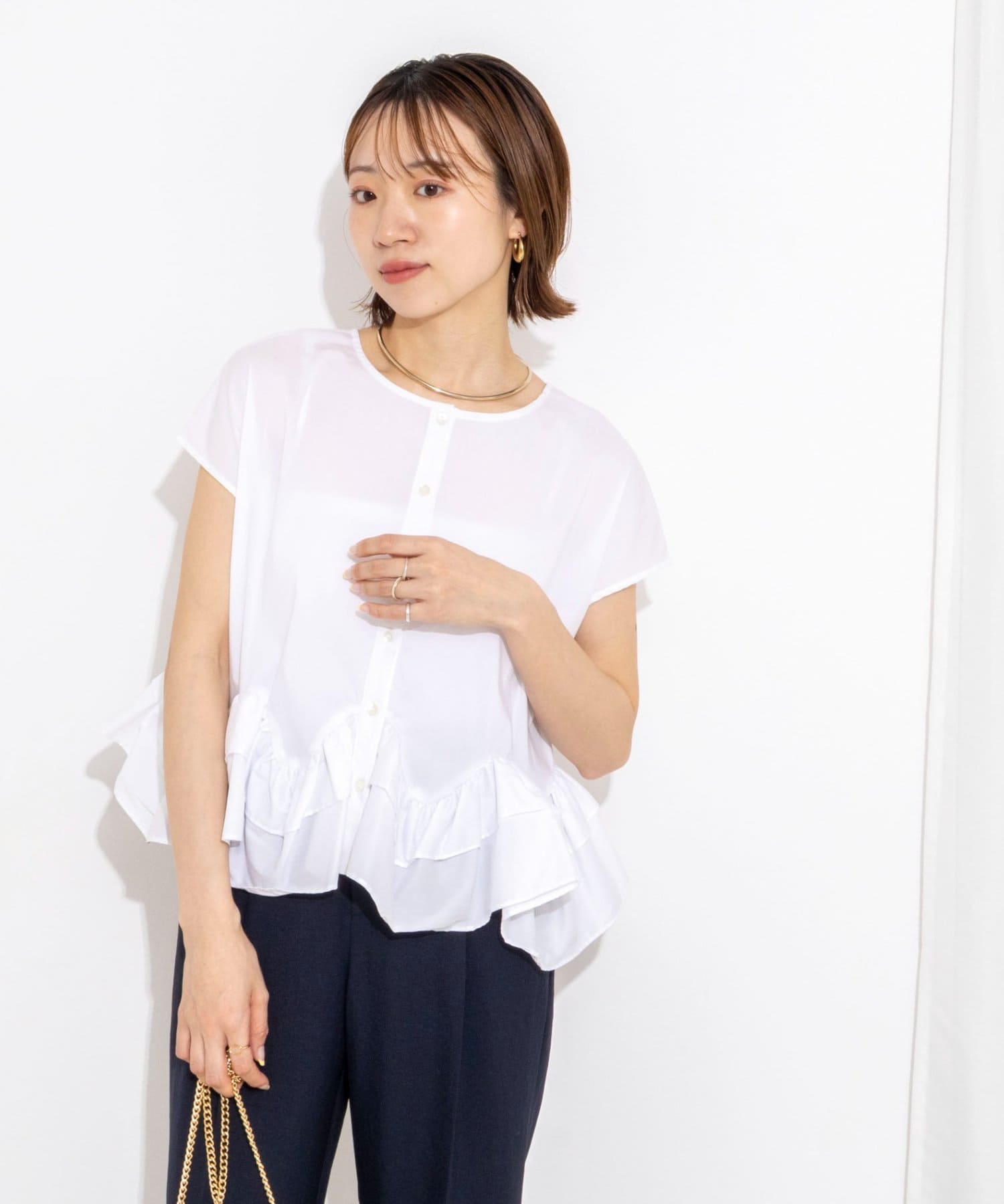 ・ウエスト切替のフリルデザインで、1枚で華やかなスタイルアップが叶うブラウス