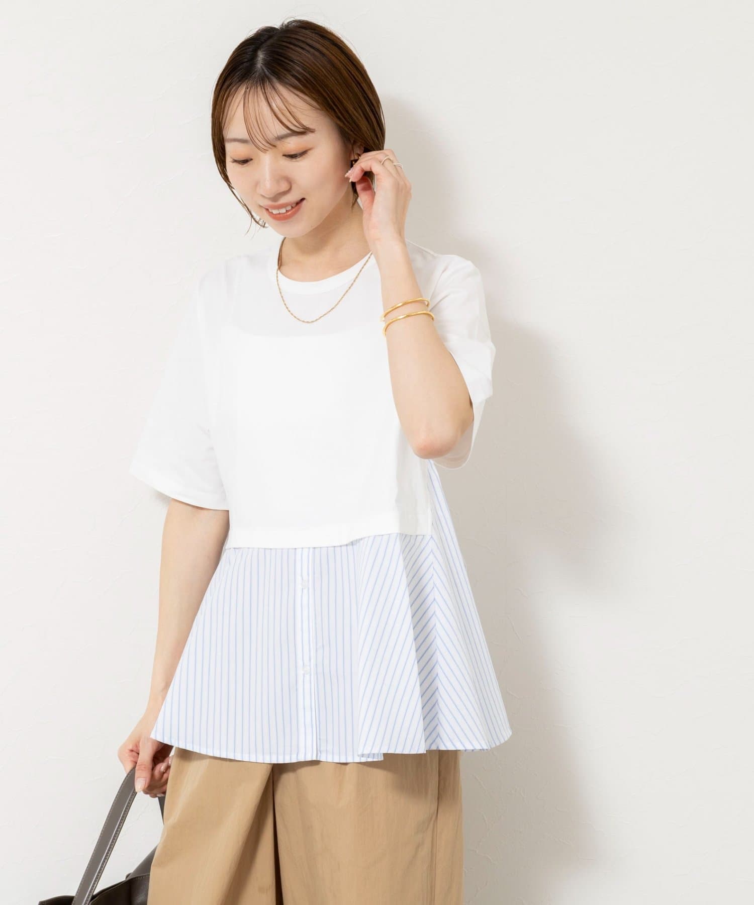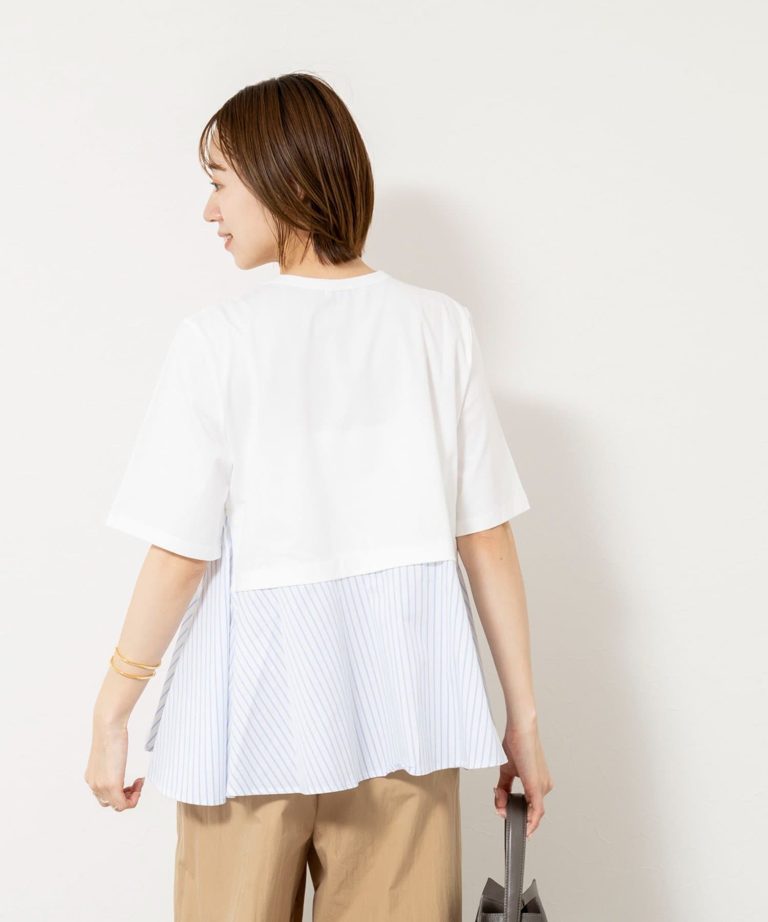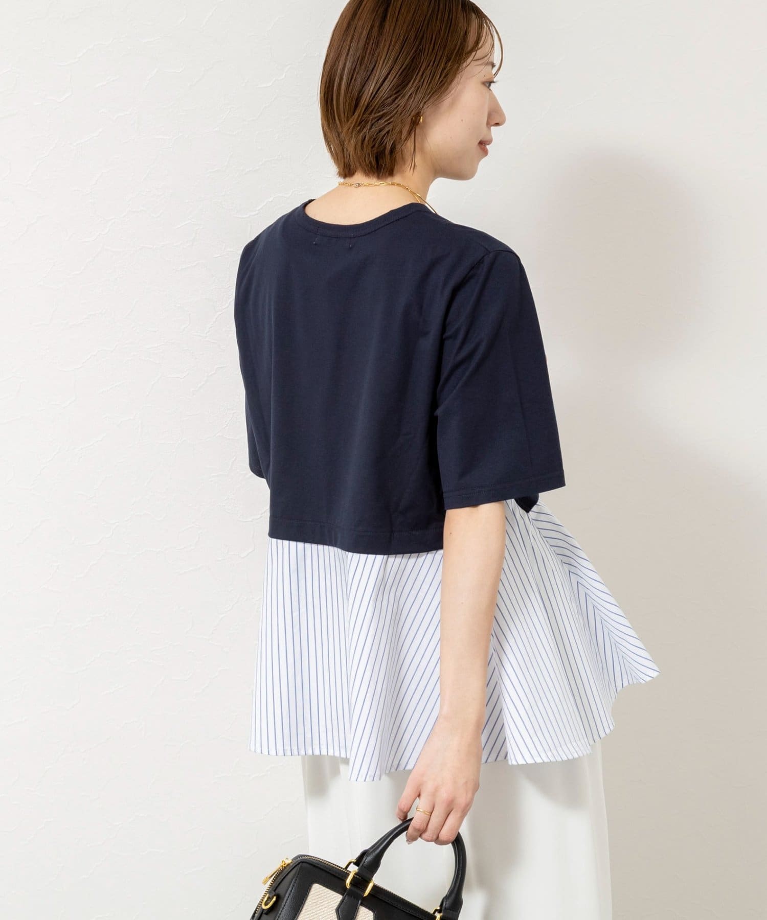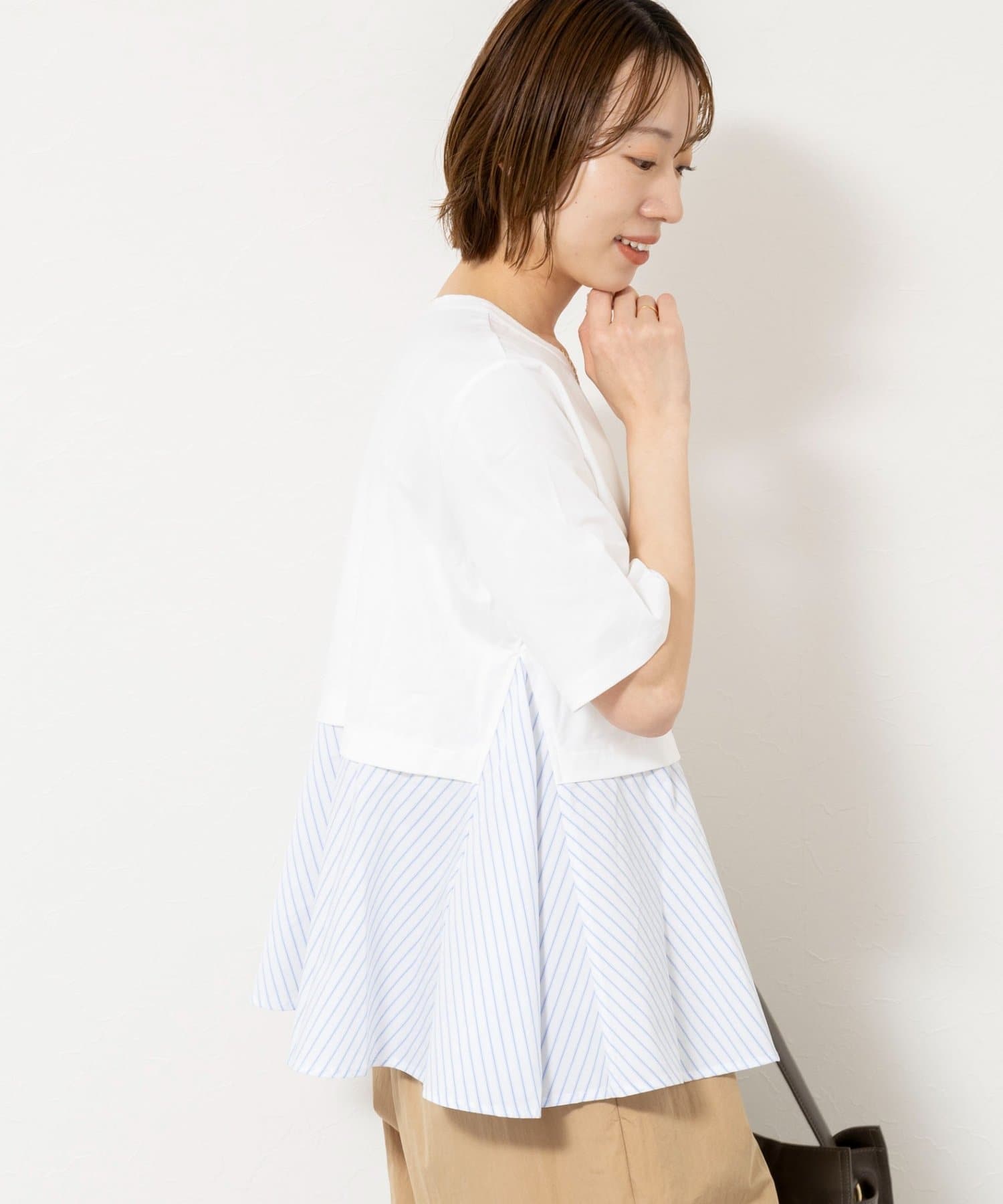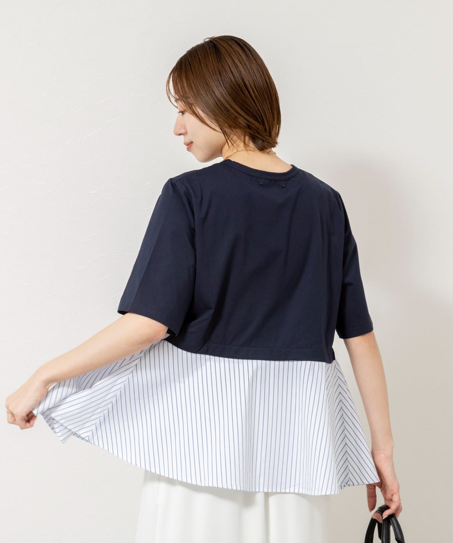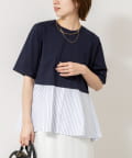 ・裾のストライプ布帛がシャツ見えしてきちんと感をプラス