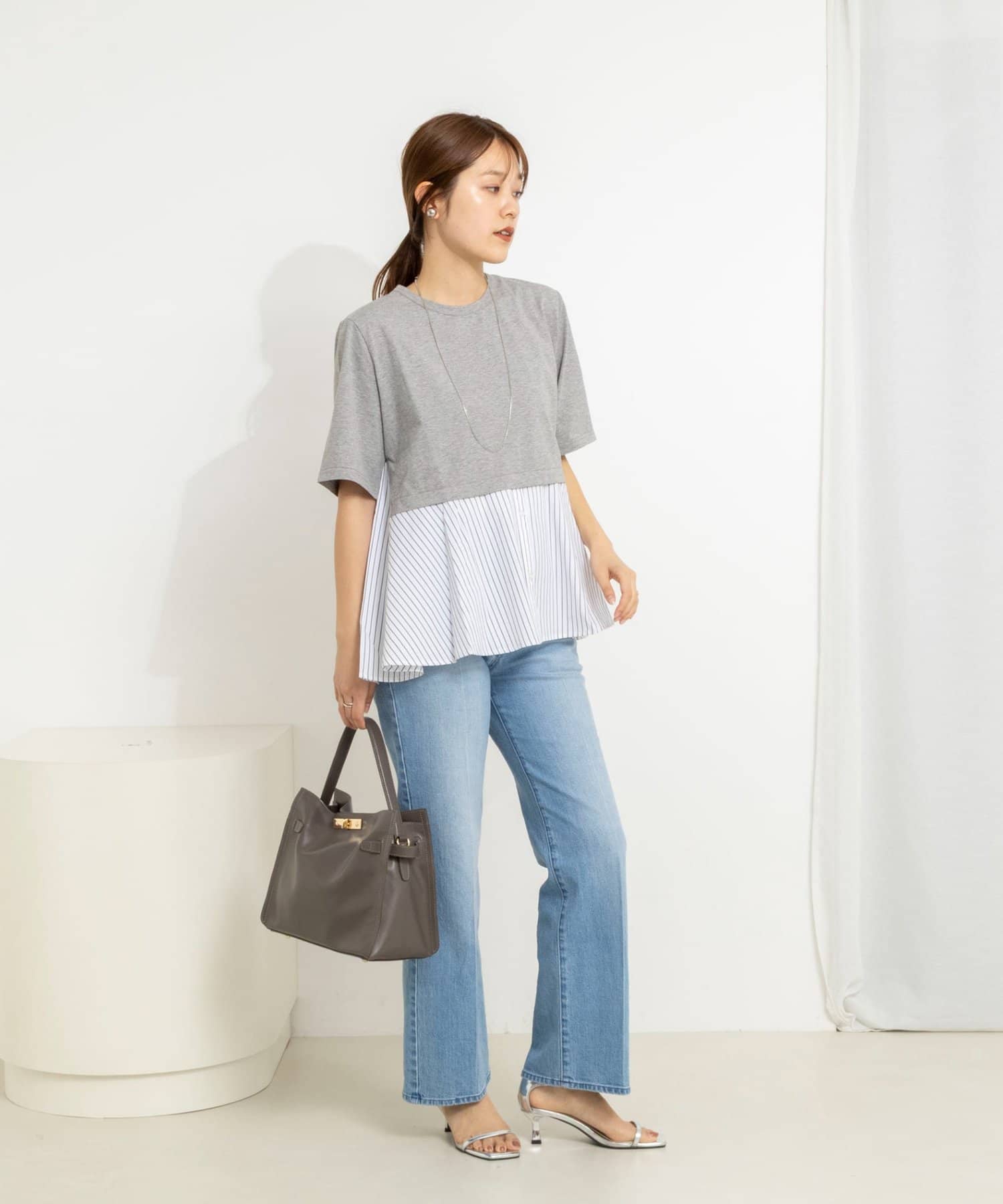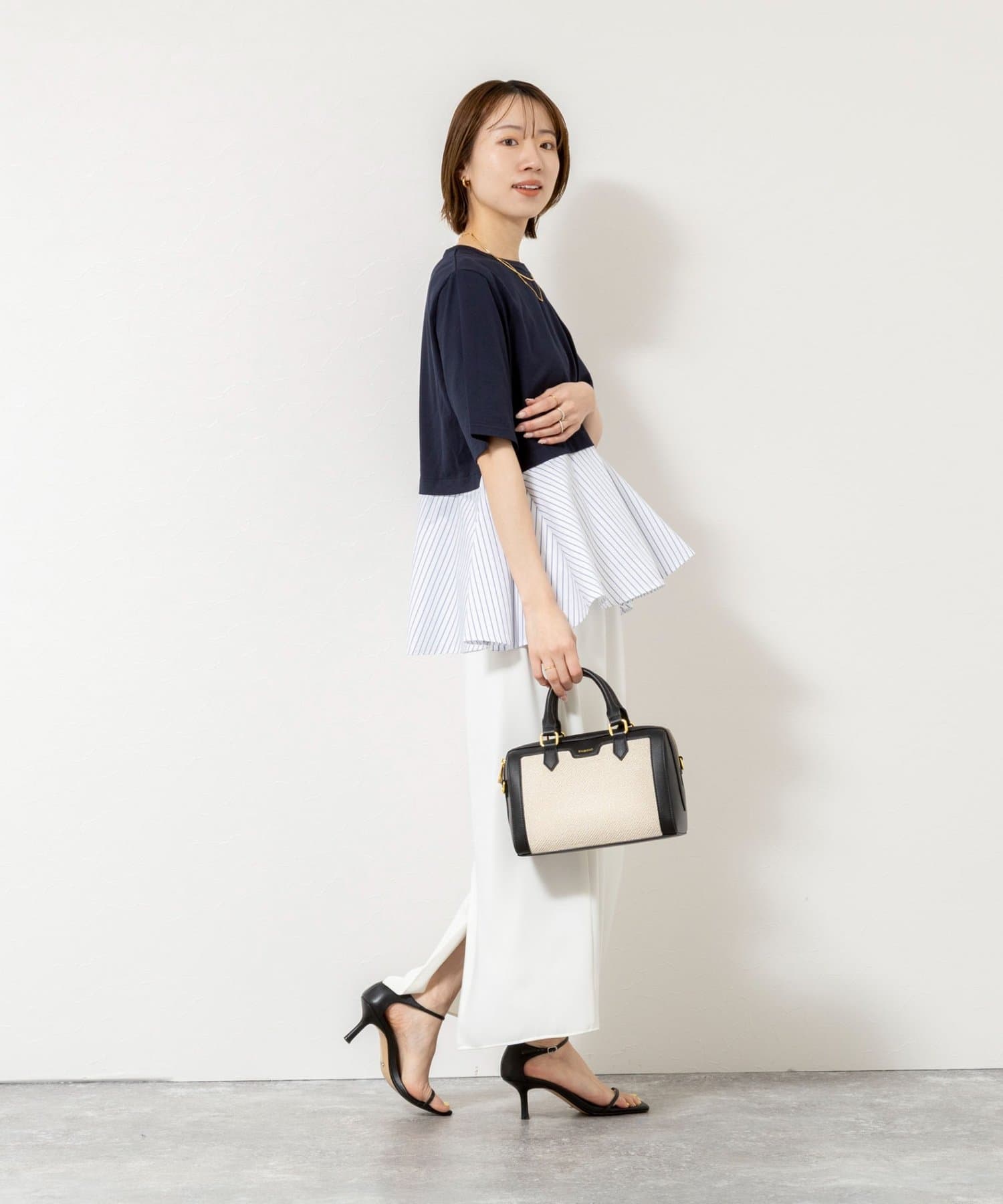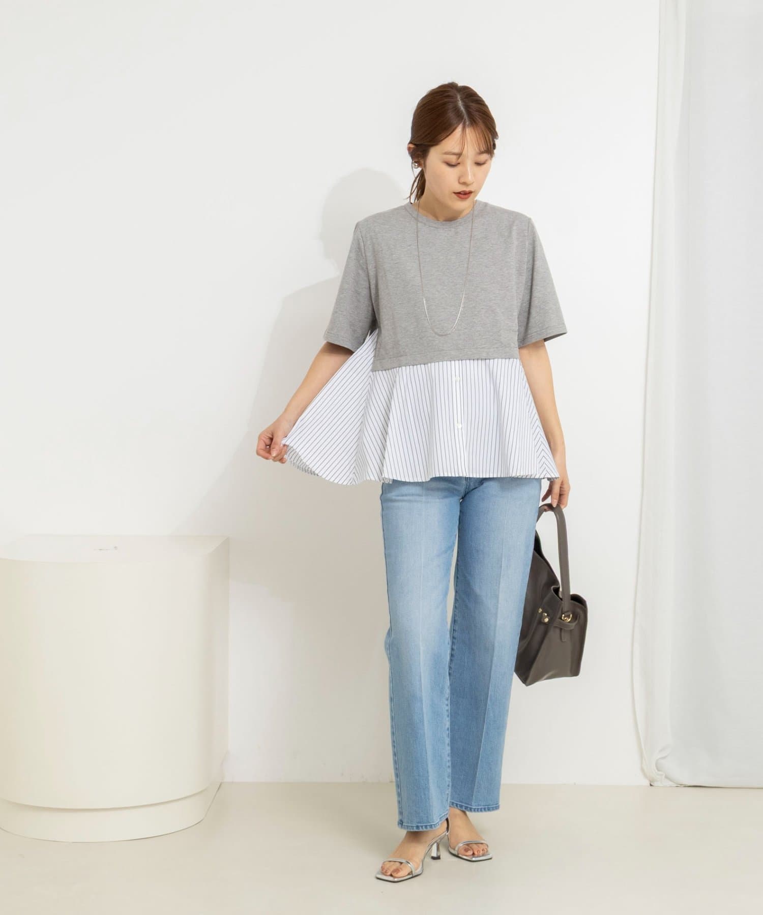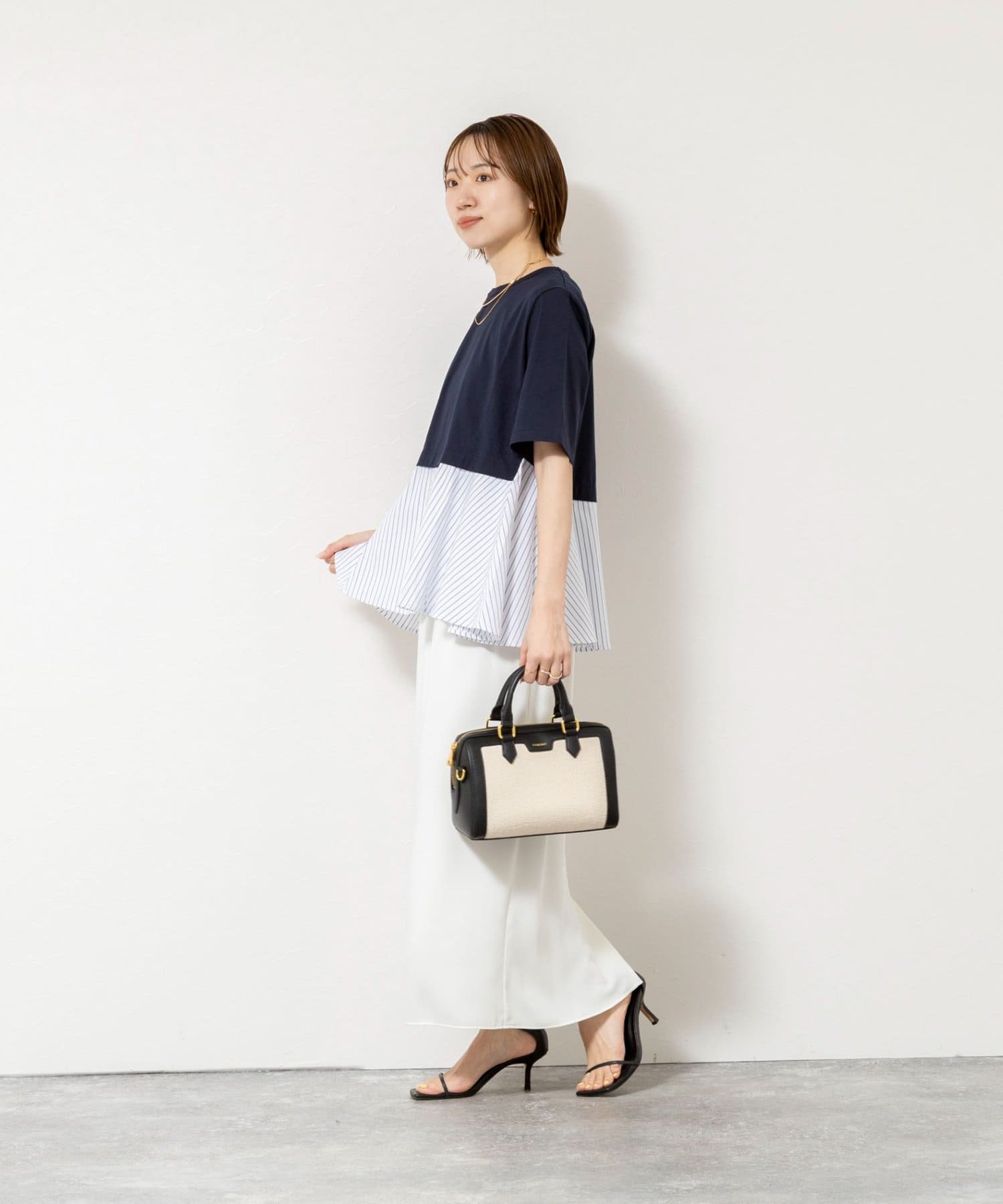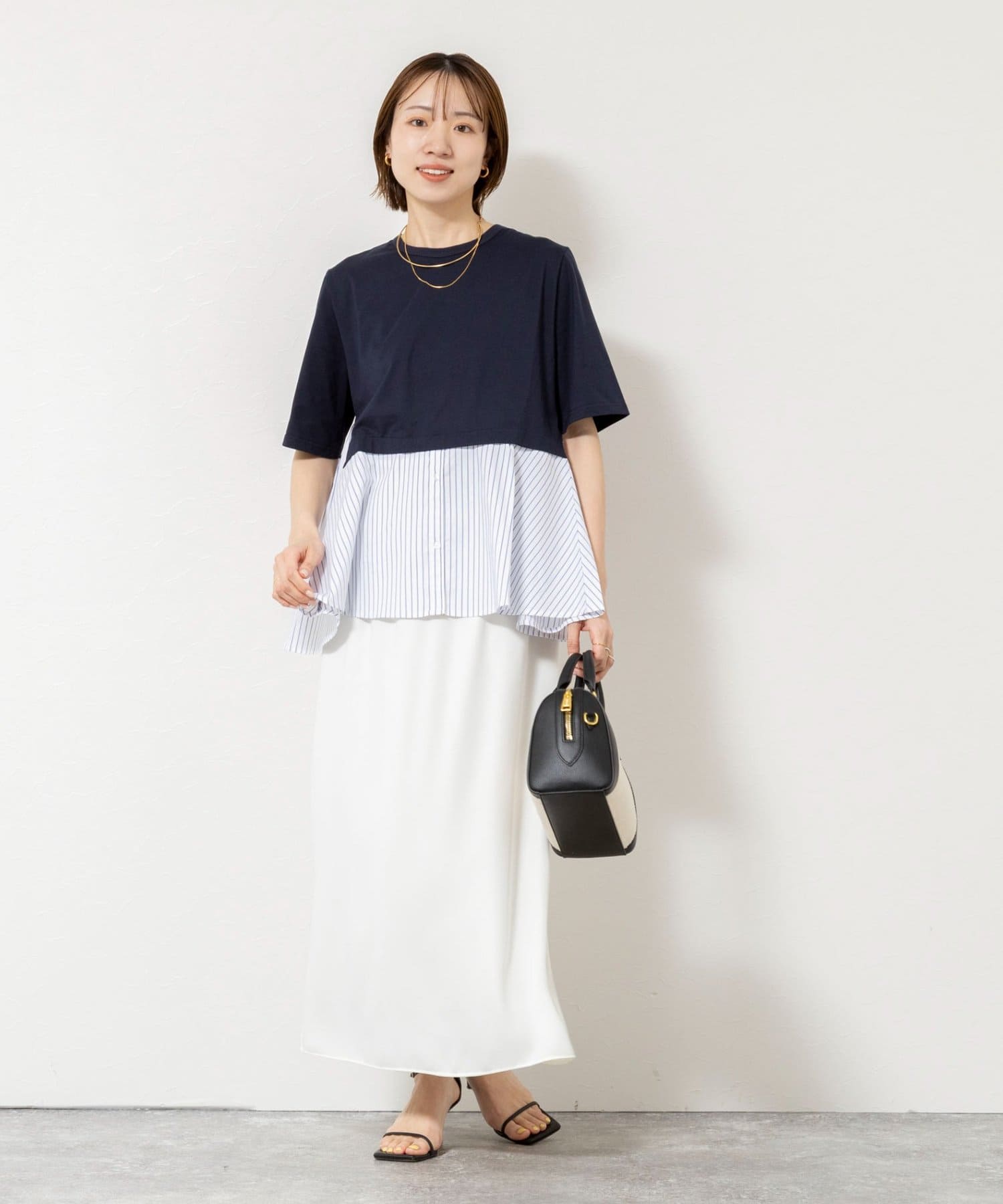 ・裾のストライプ布帛がシャツ見えしてきちんと感をプラス