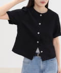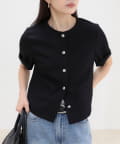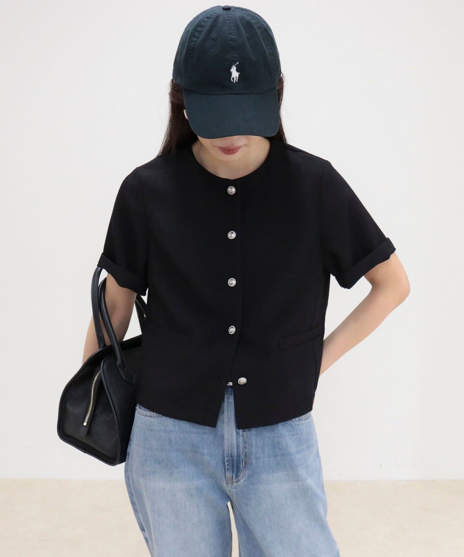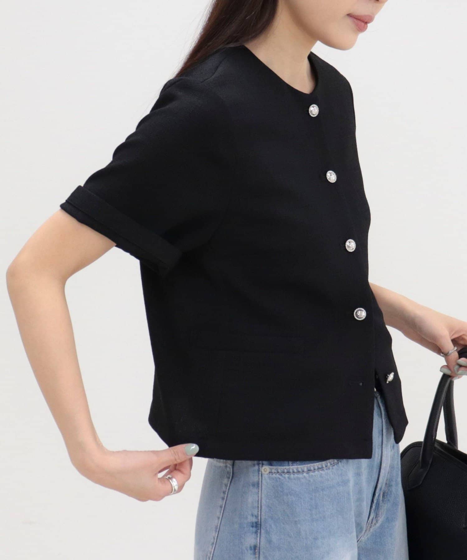 ・すっきりとしたノーカラーデザインで上品な印象に仕上げたハーフスリーブジャケット