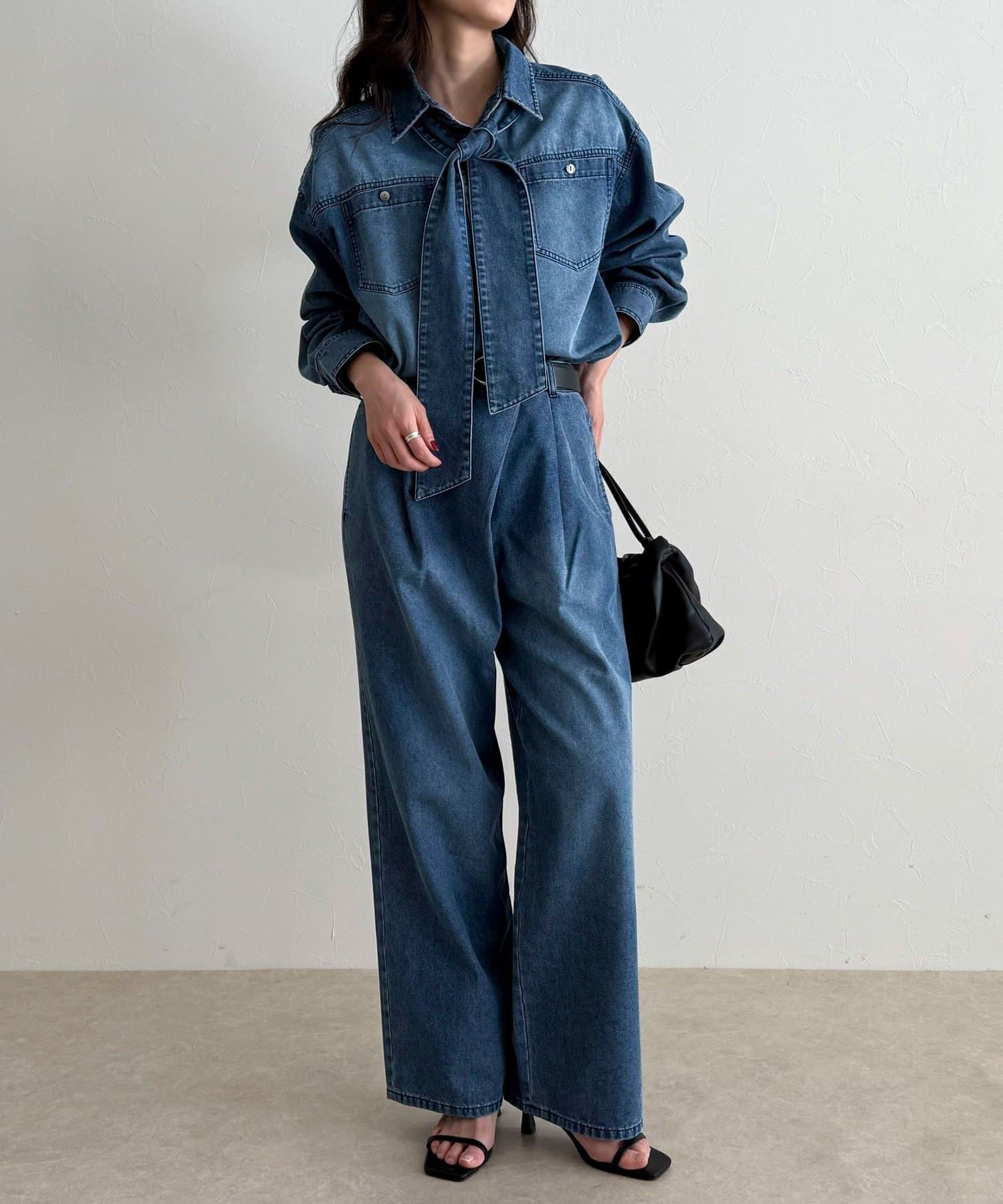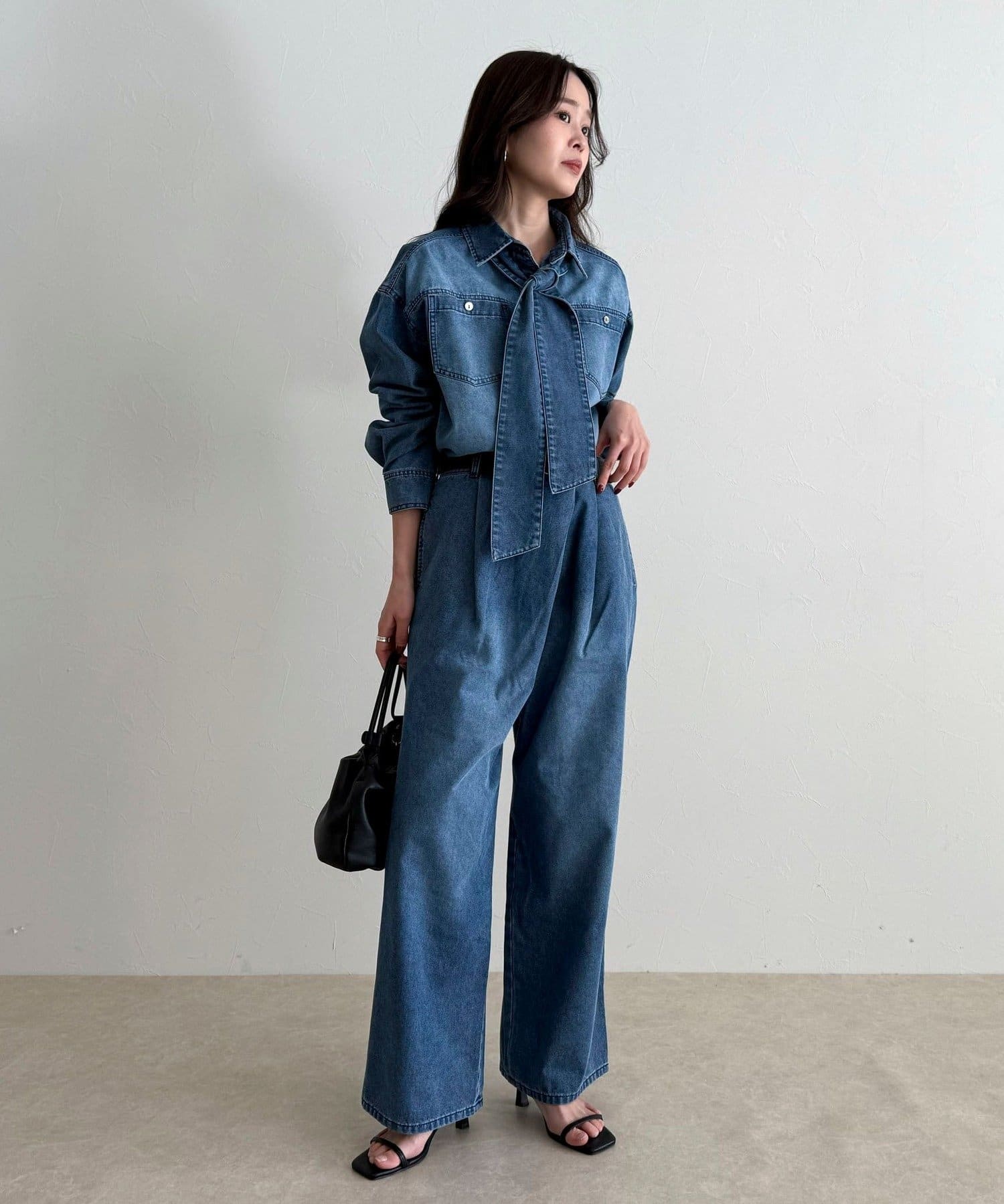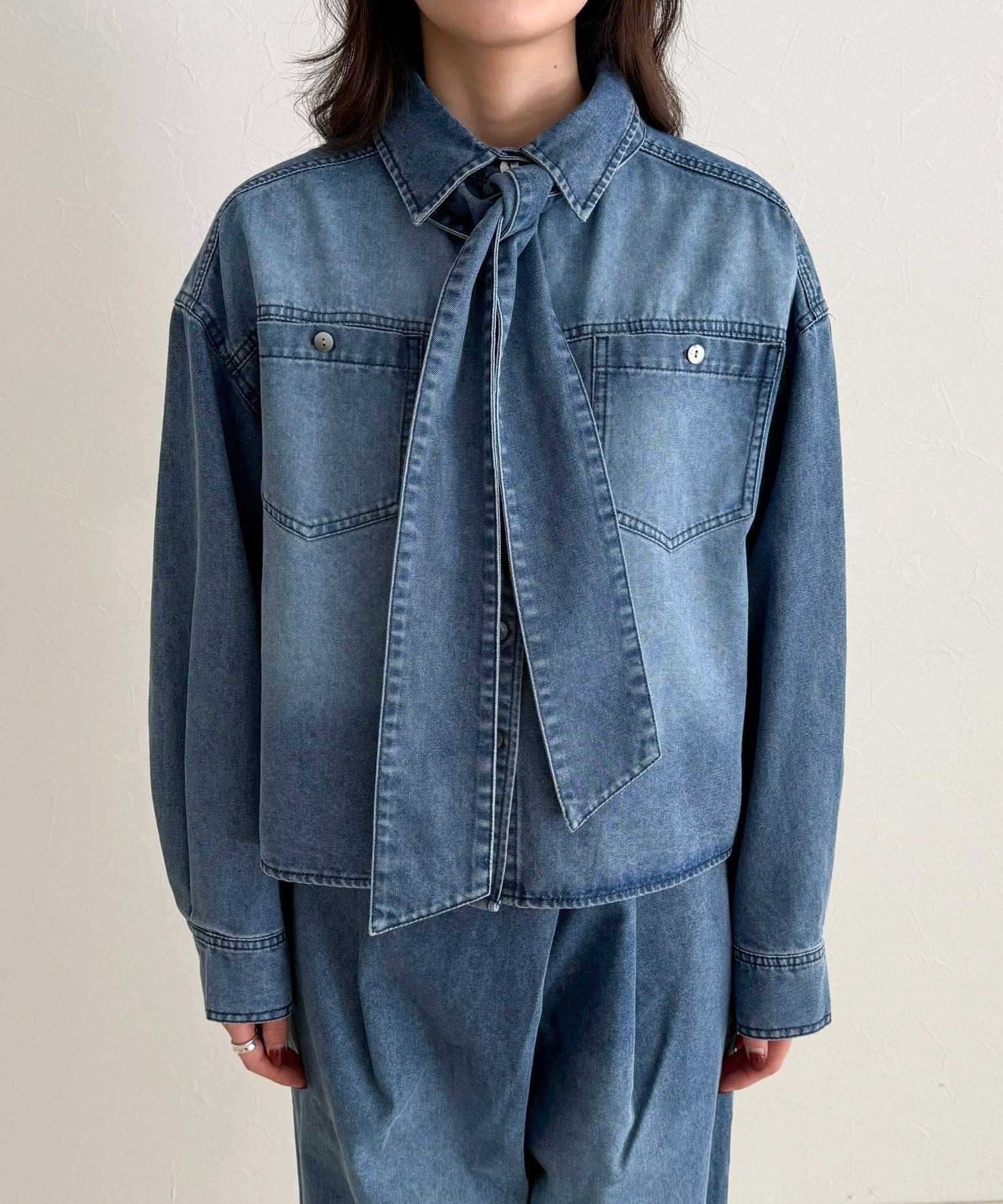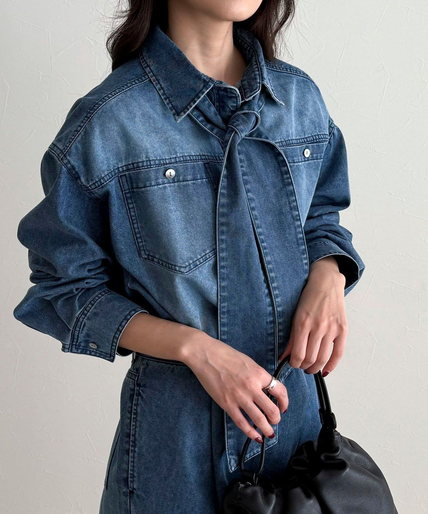 ・カジュアルなデニム素材に女性らしいボウタイデザインを掛け合わせた主役級シャツ