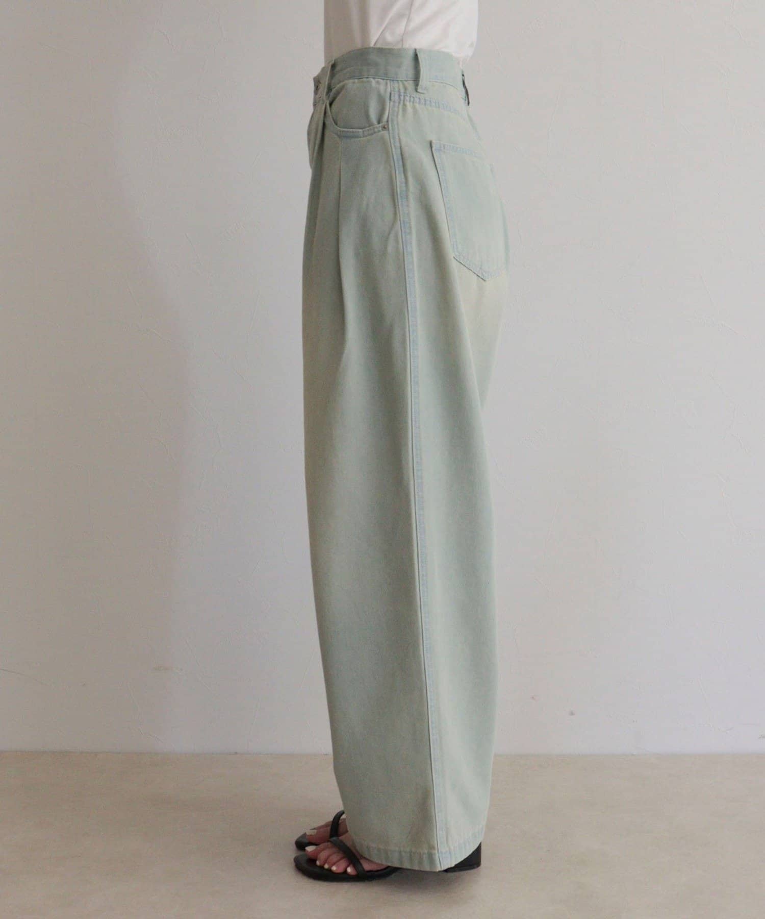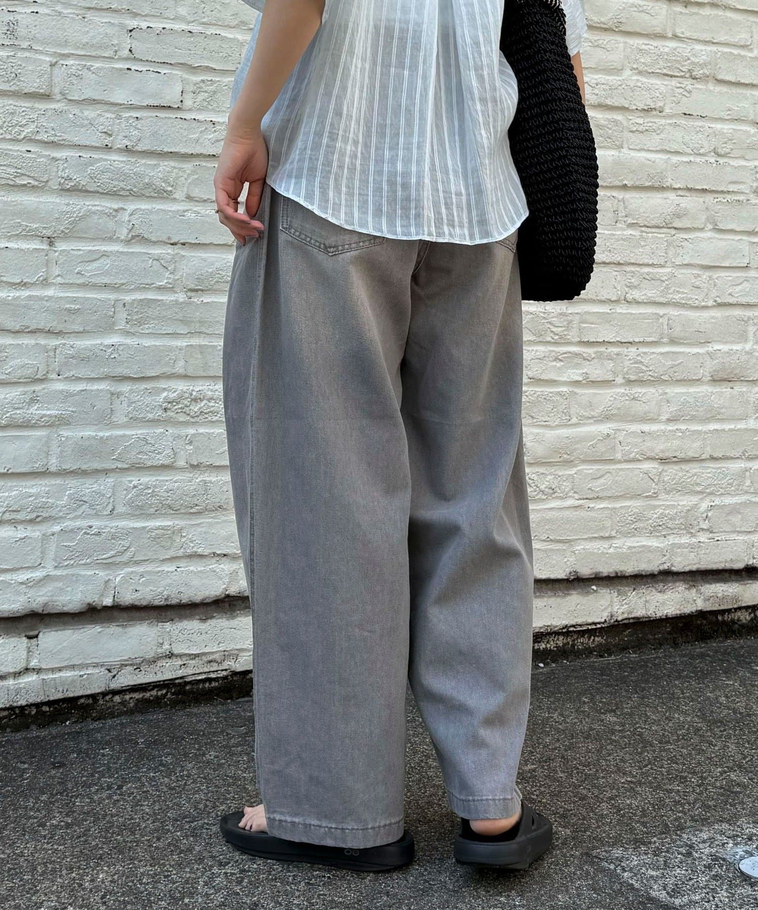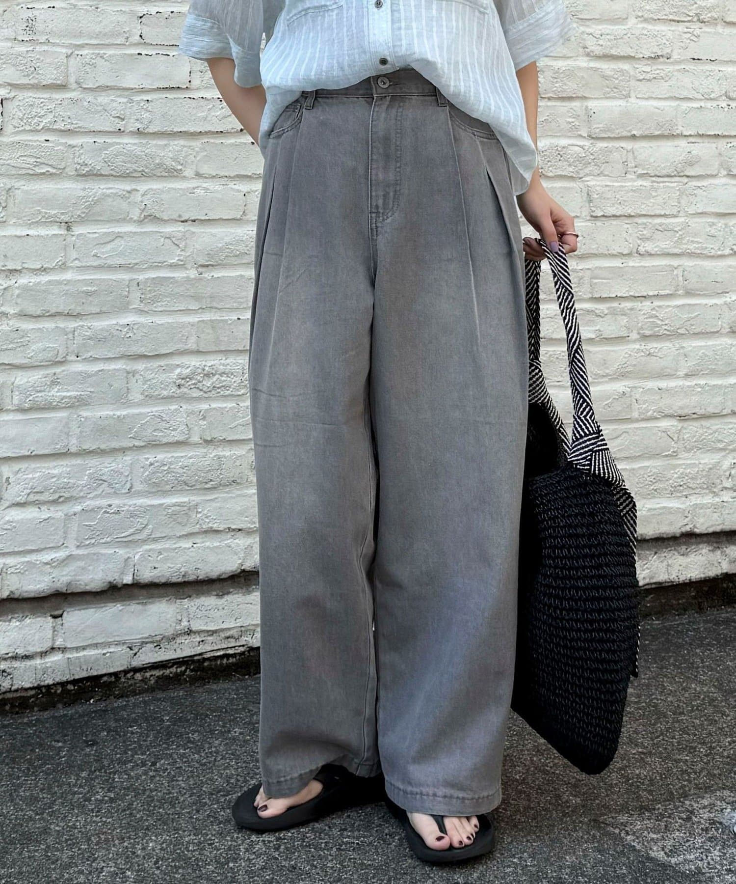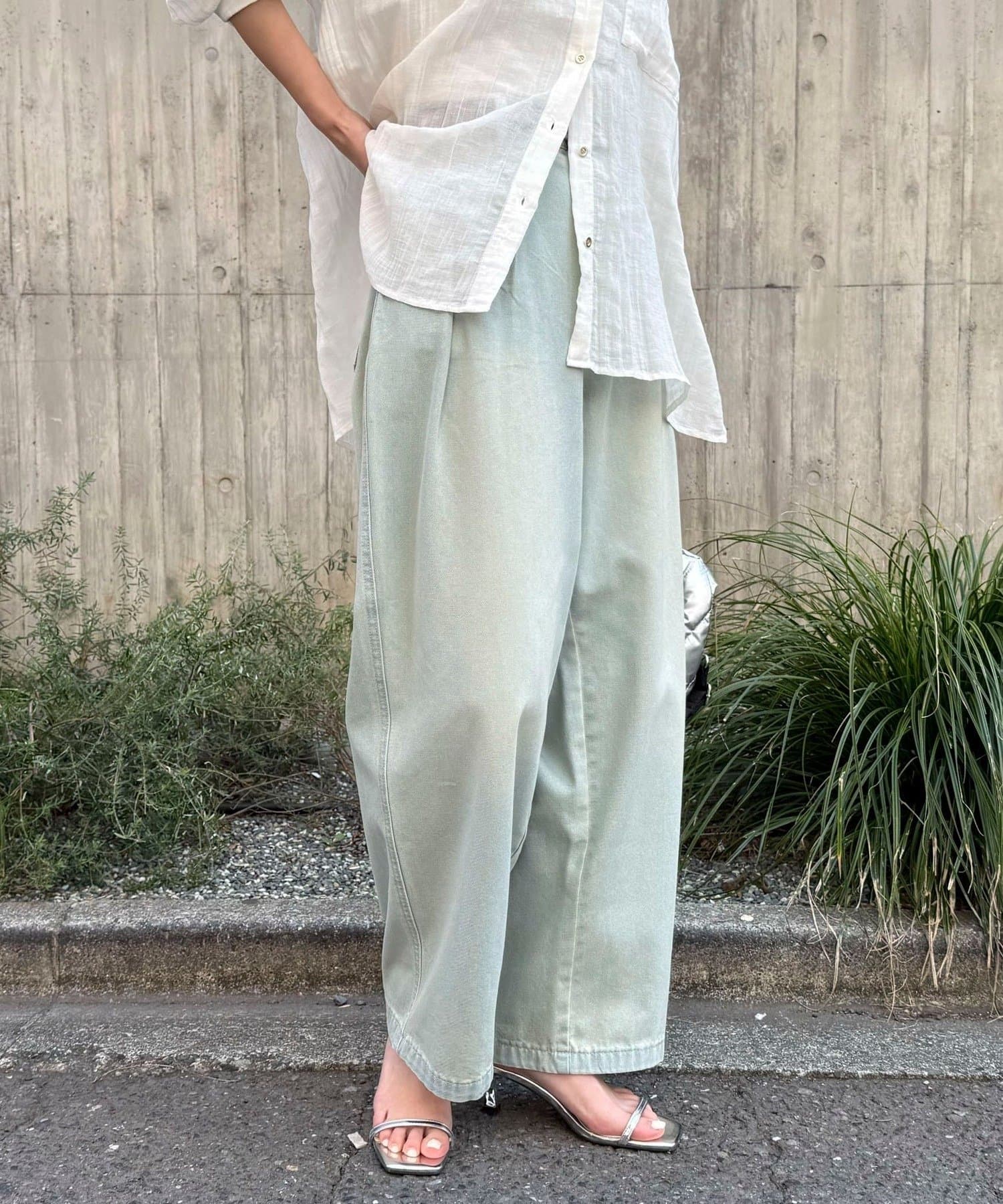 軽いデニム素材で、見た目よりも楽な履き心地でした。フロントのタックで程よくゆとりがありつつ、広がりすぎないシルエットですっきり見えします。カジュアルすぎず、大人っぽく着られるのも◎。Tシャツはもちろん、きれいめトップスとも合わせやすかったです!ヒール合わせだとすっきりとした印象で着用できます。