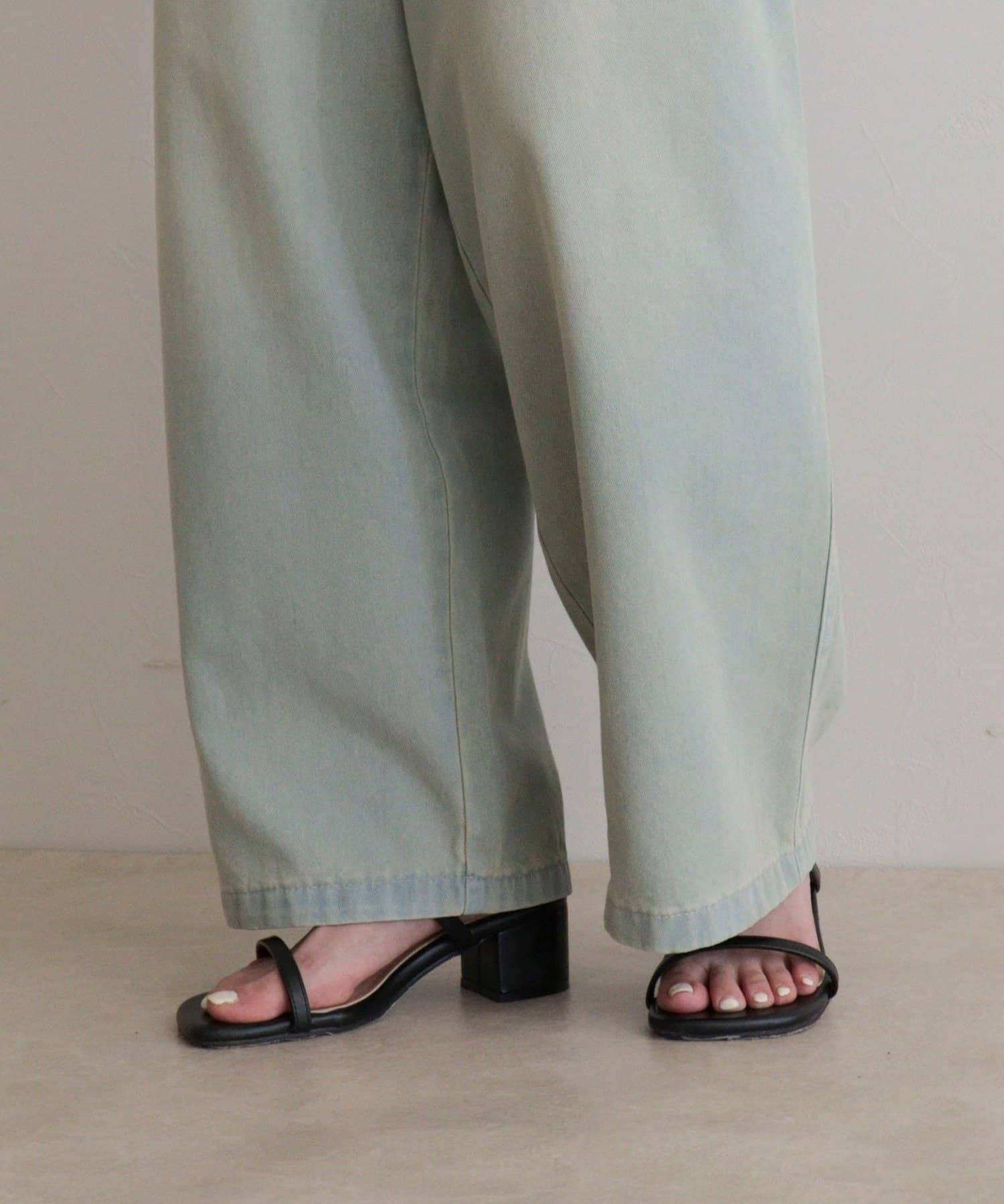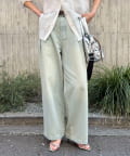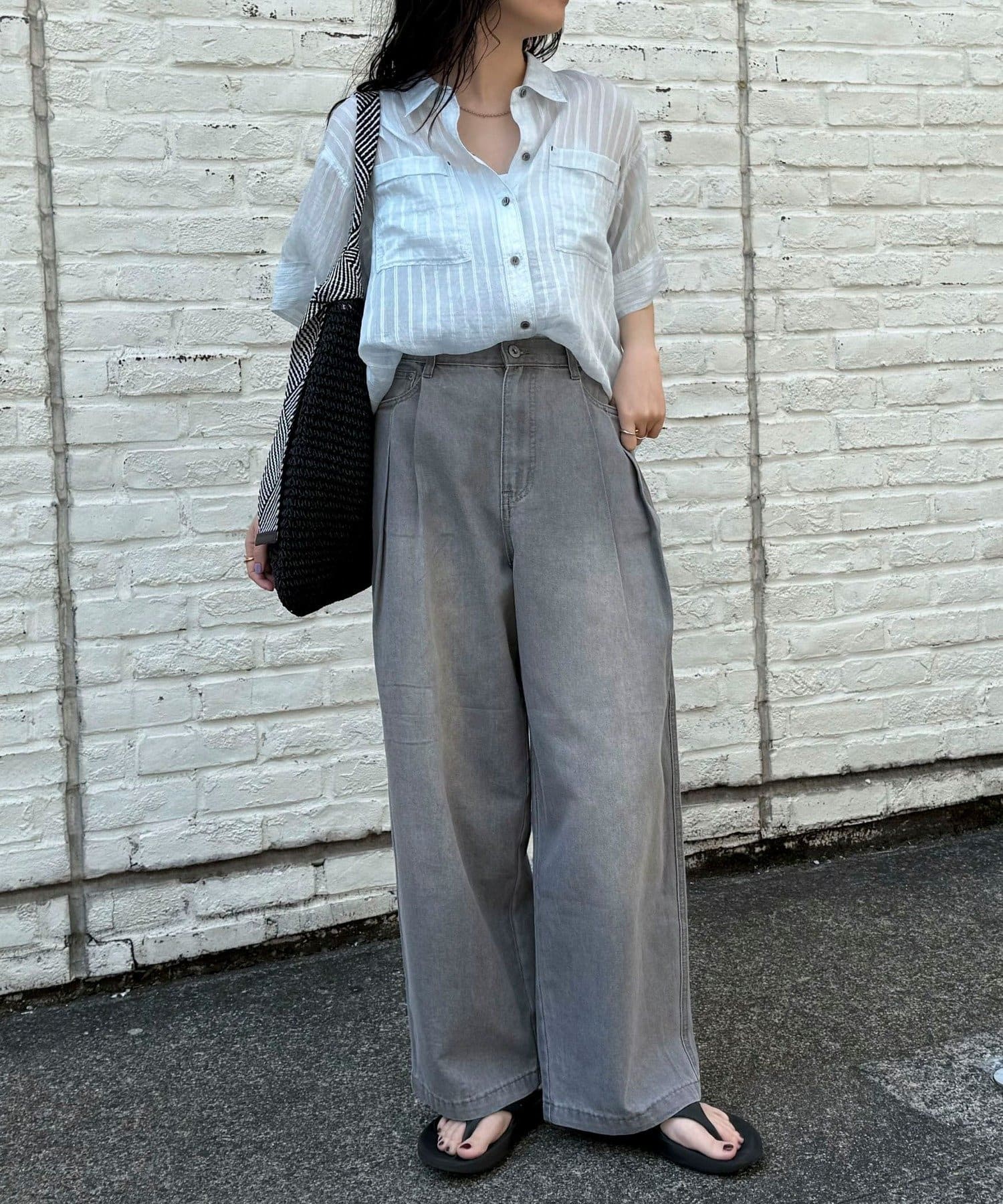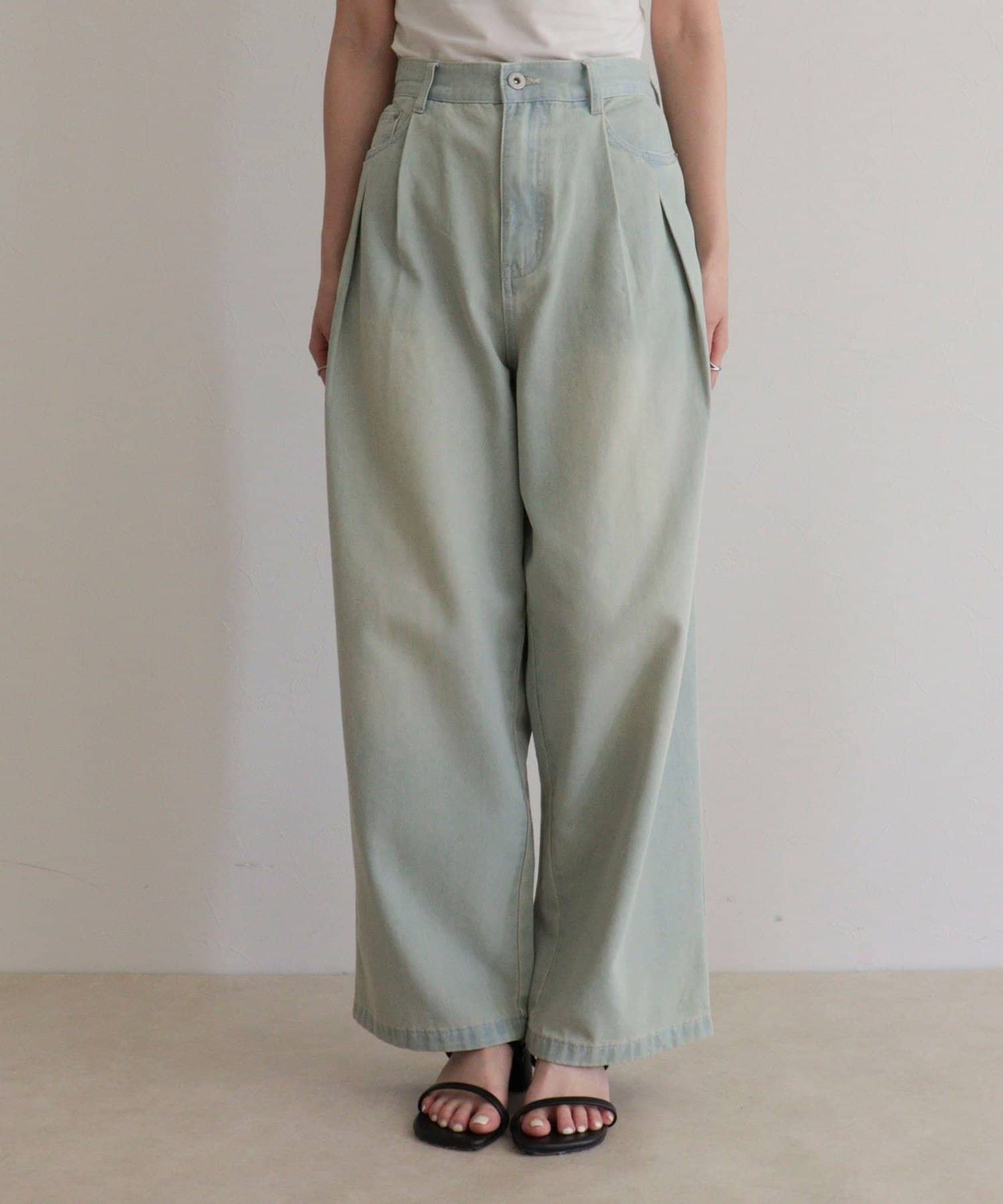 軽いデニム素材で、見た目よりも楽な履き心地でした。フロントのタックで程よくゆとりがありつつ、広がりすぎないシルエットですっきり見えします。カジュアルすぎず、大人っぽく着られるのも◎。Tシャツはもちろん、きれいめトップスとも合わせやすかったです!ヒール合わせだとすっきりとした印象で着用できます。
