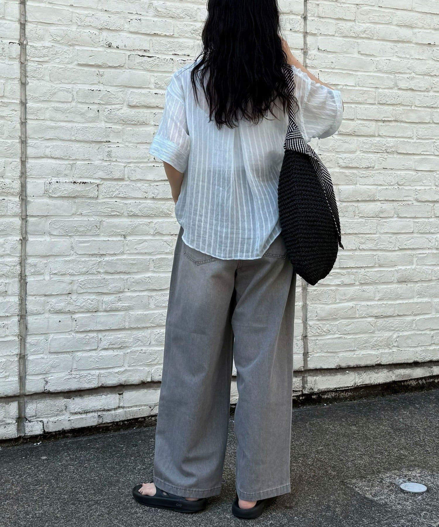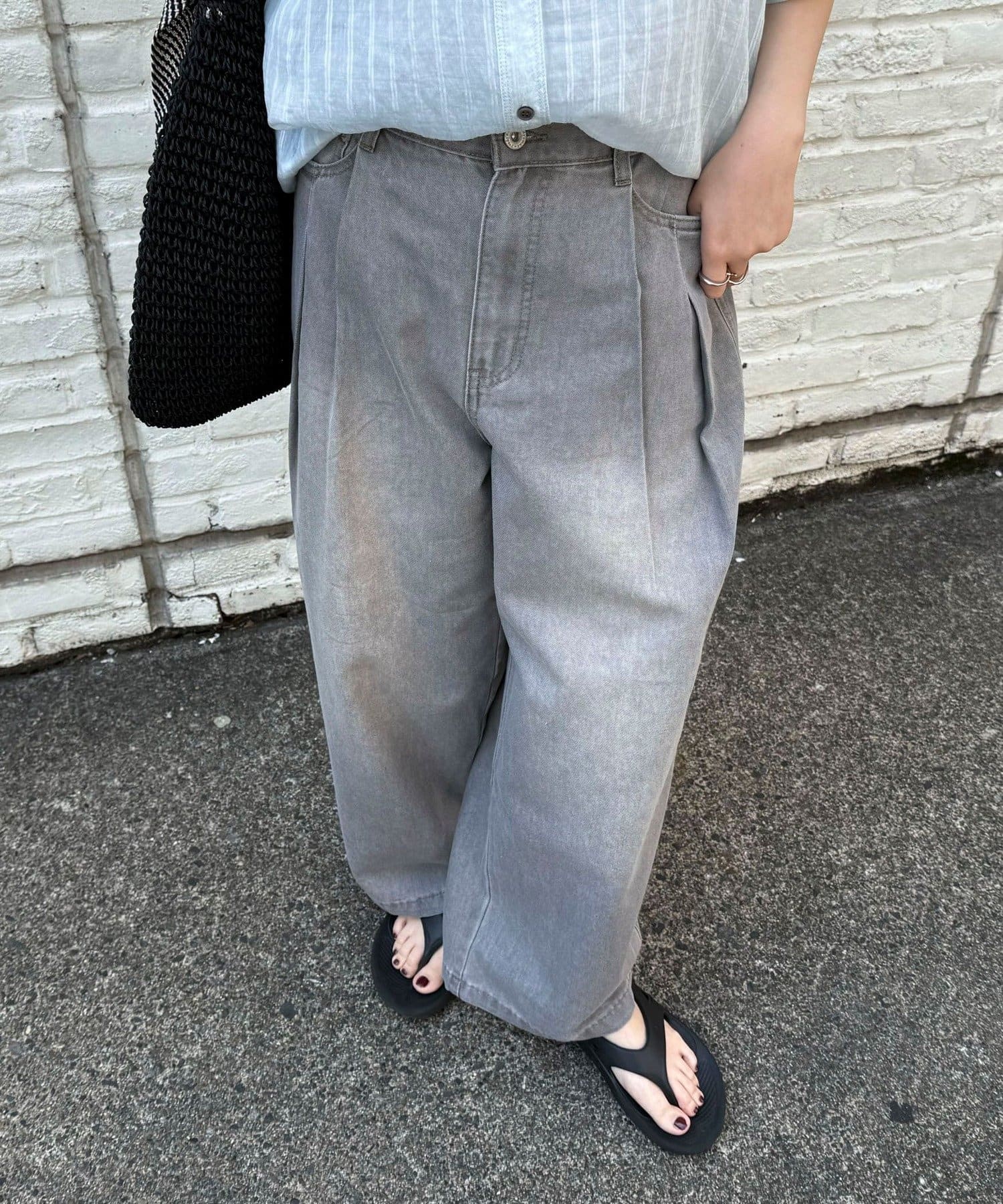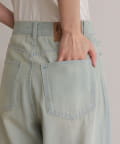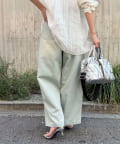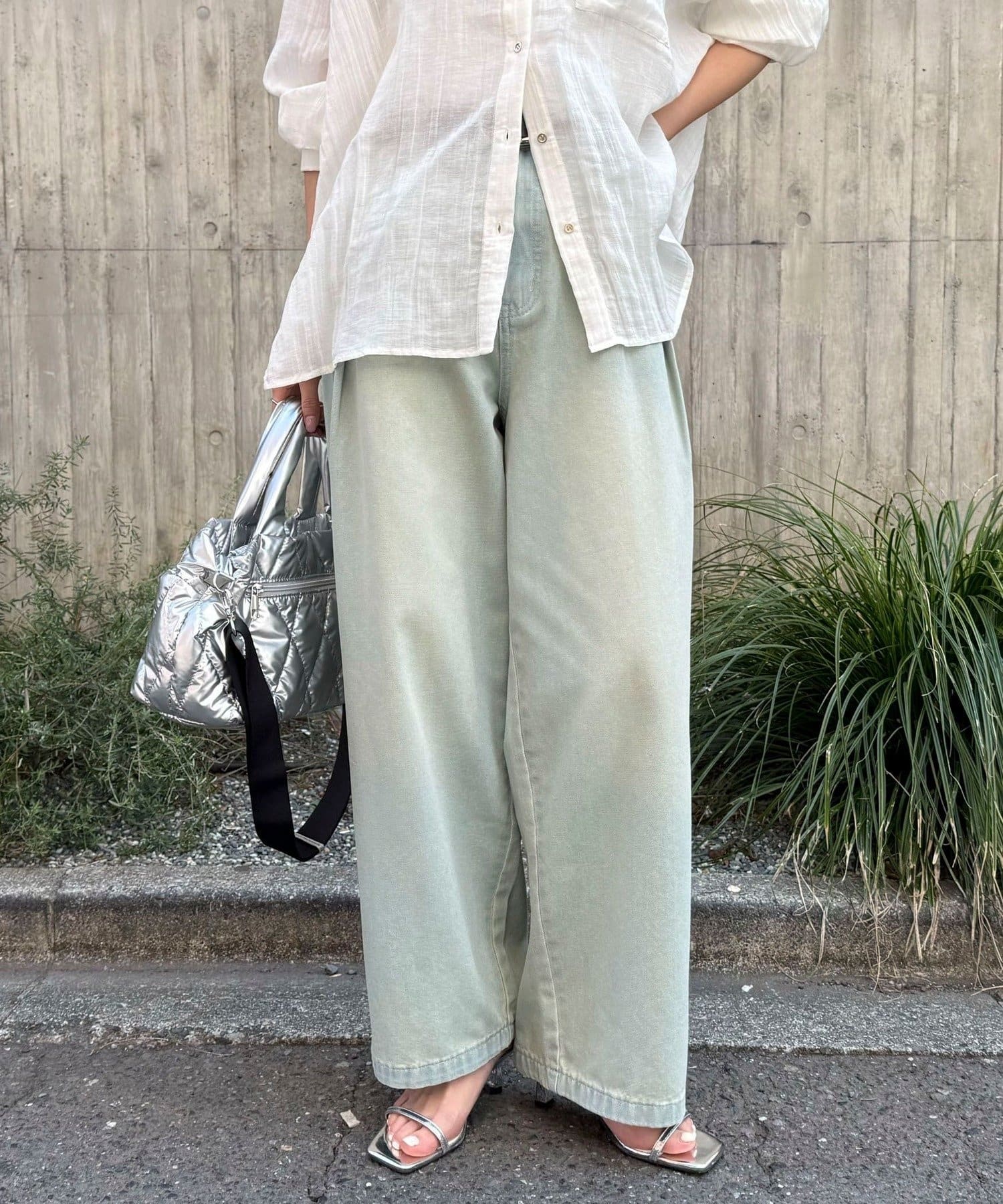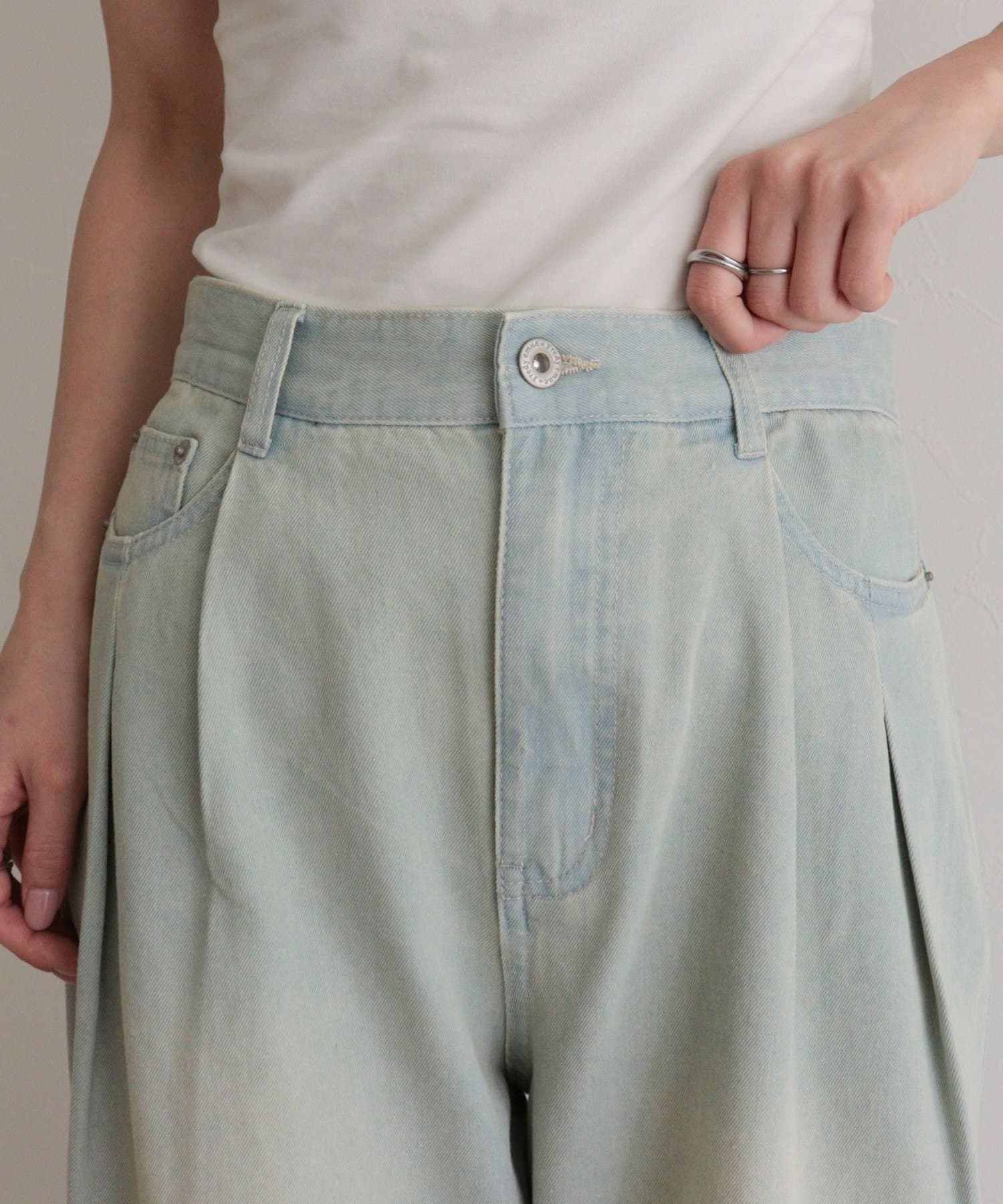 軽いデニム素材で、見た目よりも楽な履き心地でした。フロントのタックで程よくゆとりがありつつ、広がりすぎないシルエットですっきり見えします。カジュアルすぎず、大人っぽく着られるのも◎。Tシャツはもちろん、きれいめトップスとも合わせやすかったです!ヒール合わせだとすっきりとした印象で着用できます。