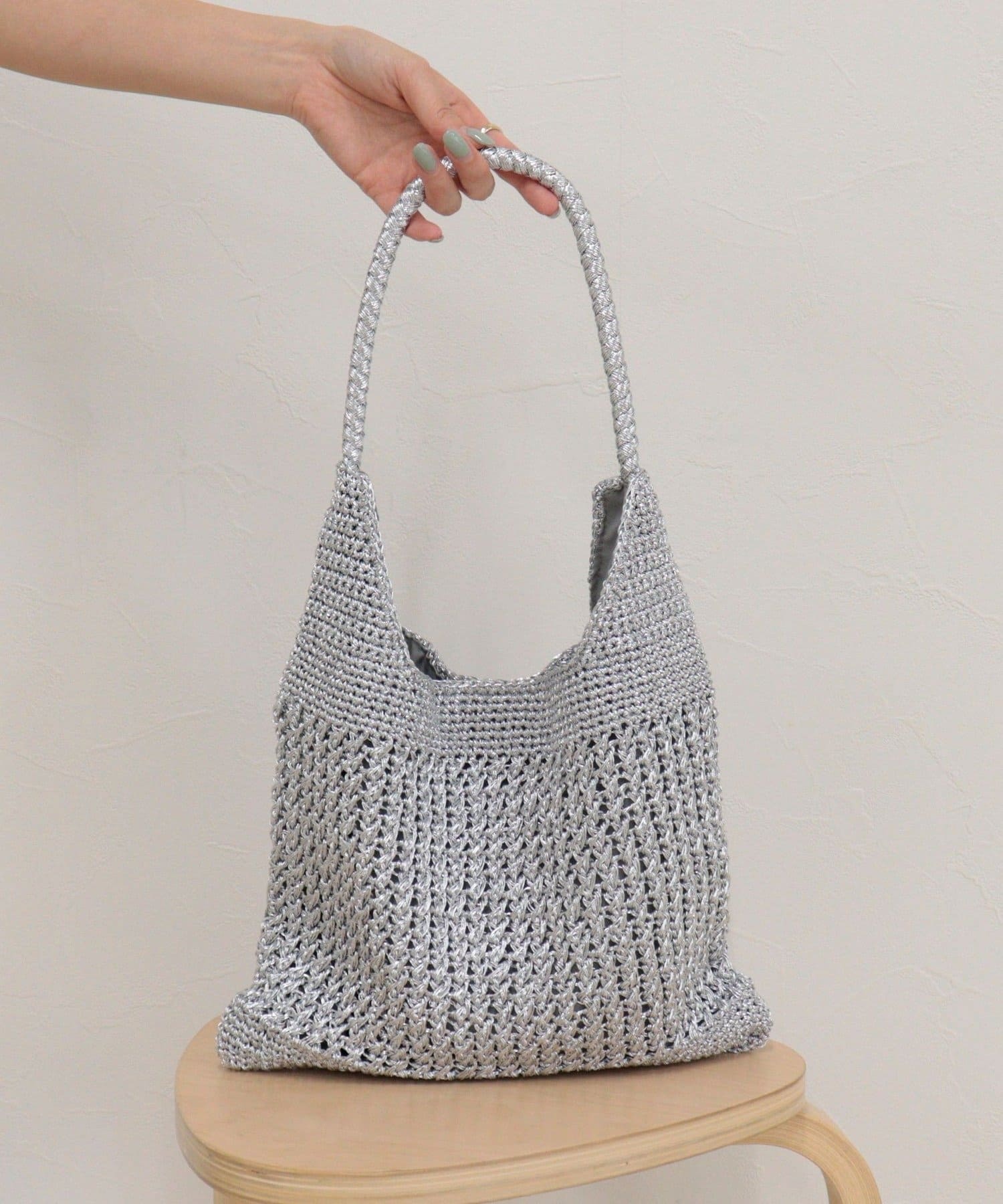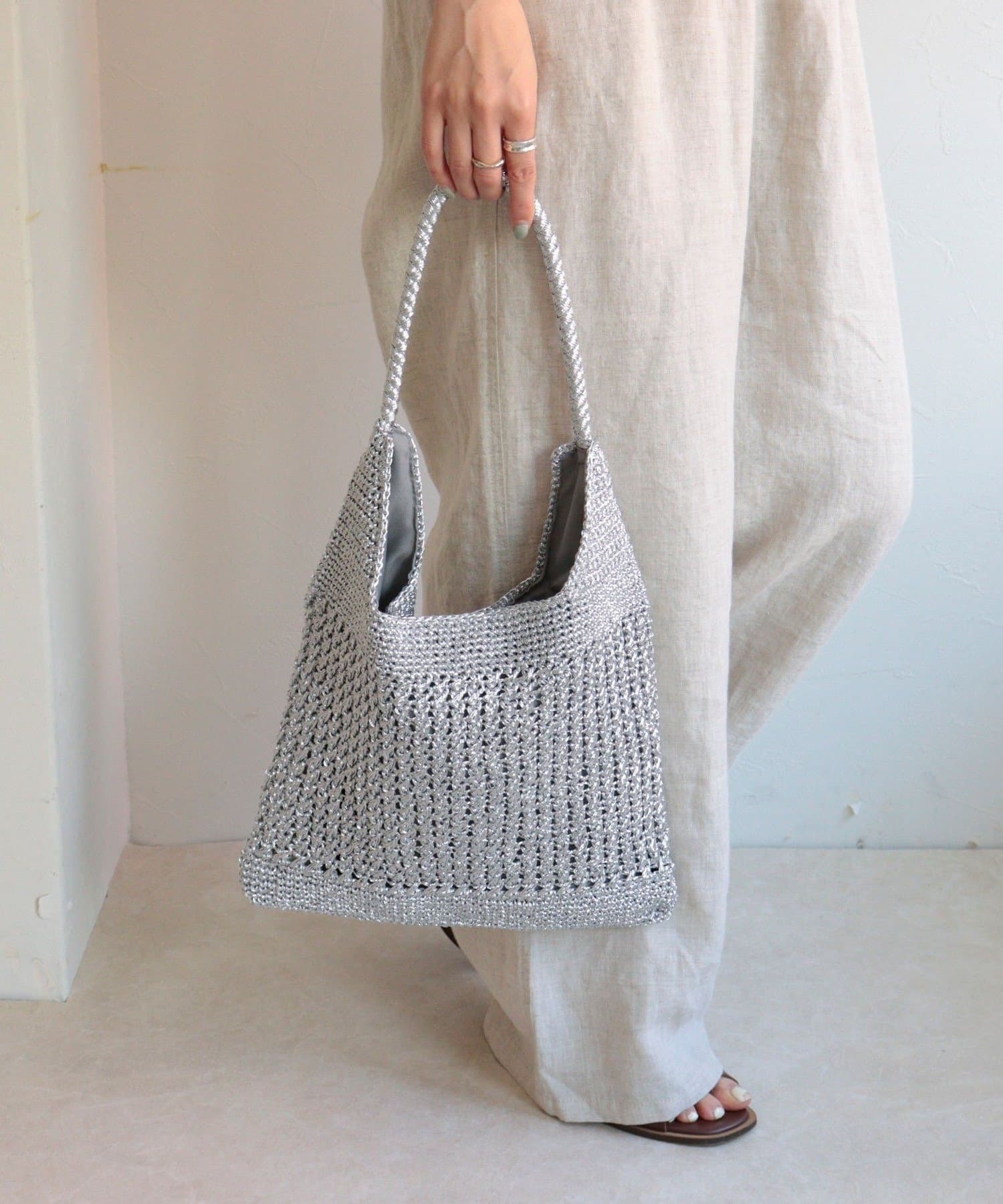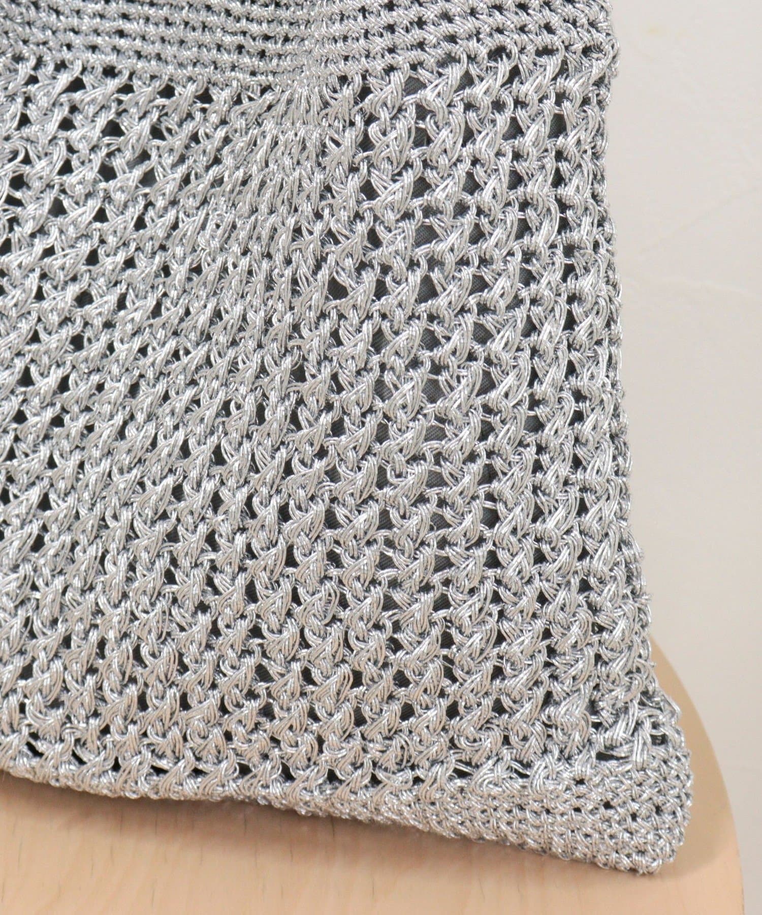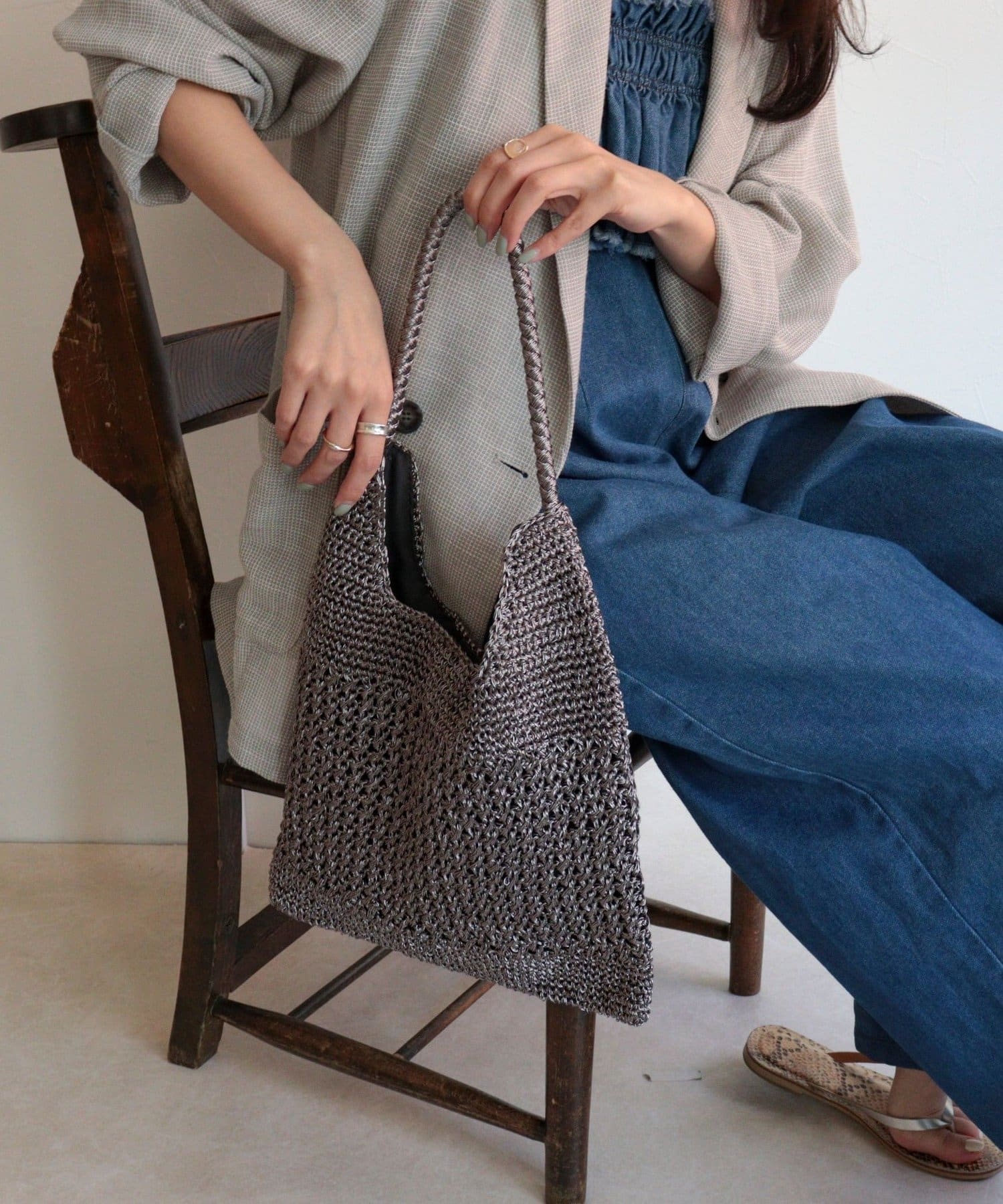 ・メタリックコードを編み込んだ、シンプルながら存在感のある柄編みバッグ