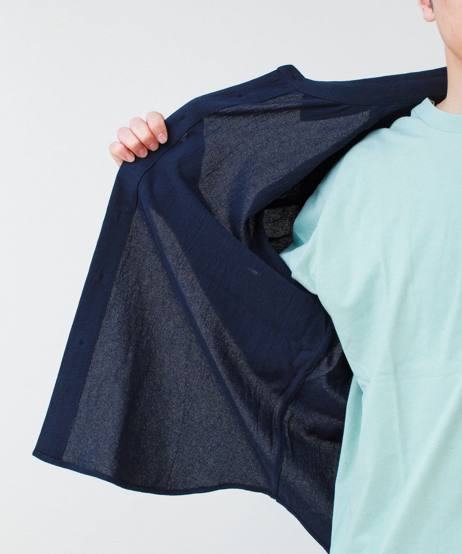 インナーにカラーTを入れて、軽い羽織りとして着るのがおすすめ。