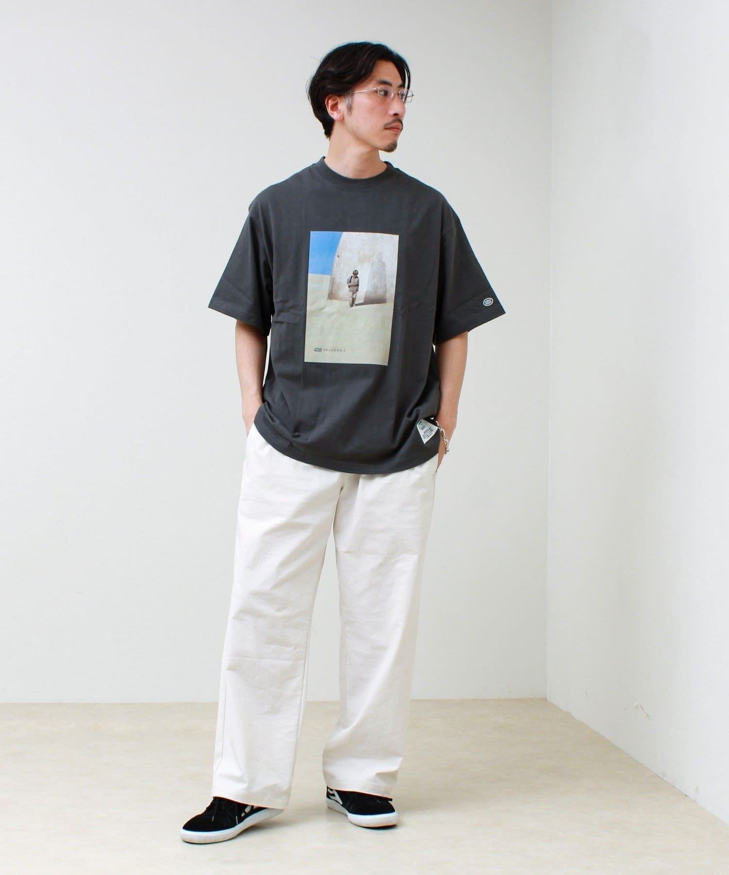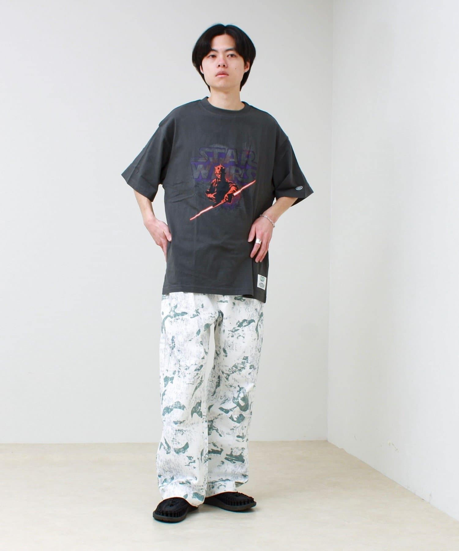 ワイドデニムやカーゴパンツと合わせて、グラフィックを主役にしたスタイル。