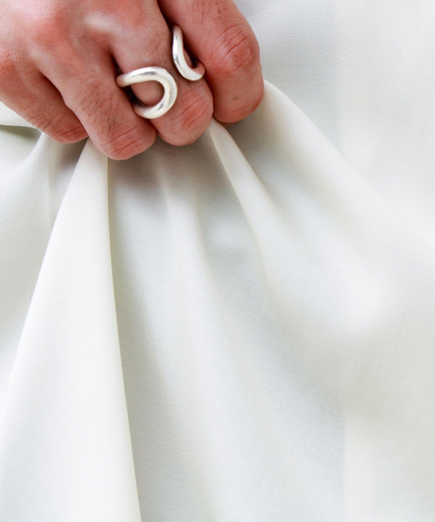 ポリエステル×レーヨンの混紡素材で、しなやかな落ち感と程よい光沢感を演出。カジュアルながら品のある印象に。