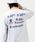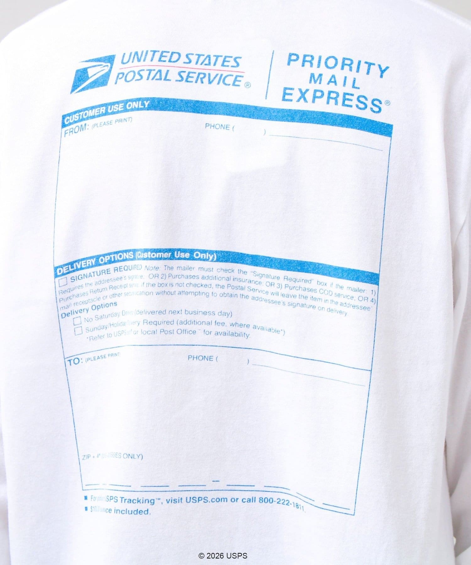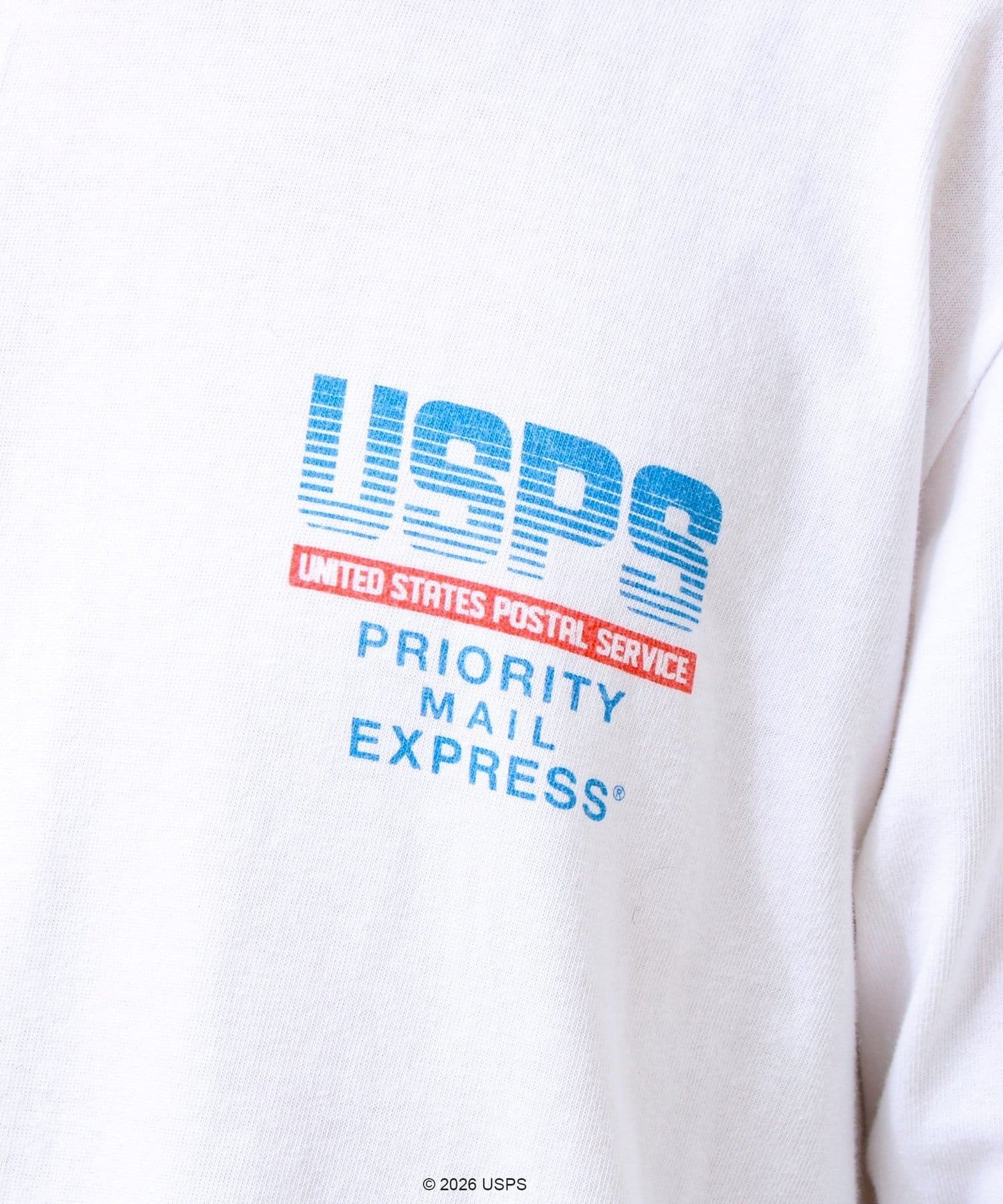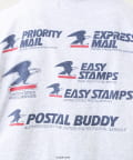アメリカの郵便サービスを担うUSPSのロゴやラベルデザインを大胆に落とし込んだ1枚。フロントはワンポイント、バックは大きなプリントで後ろ姿まで抜かりないデザイン。